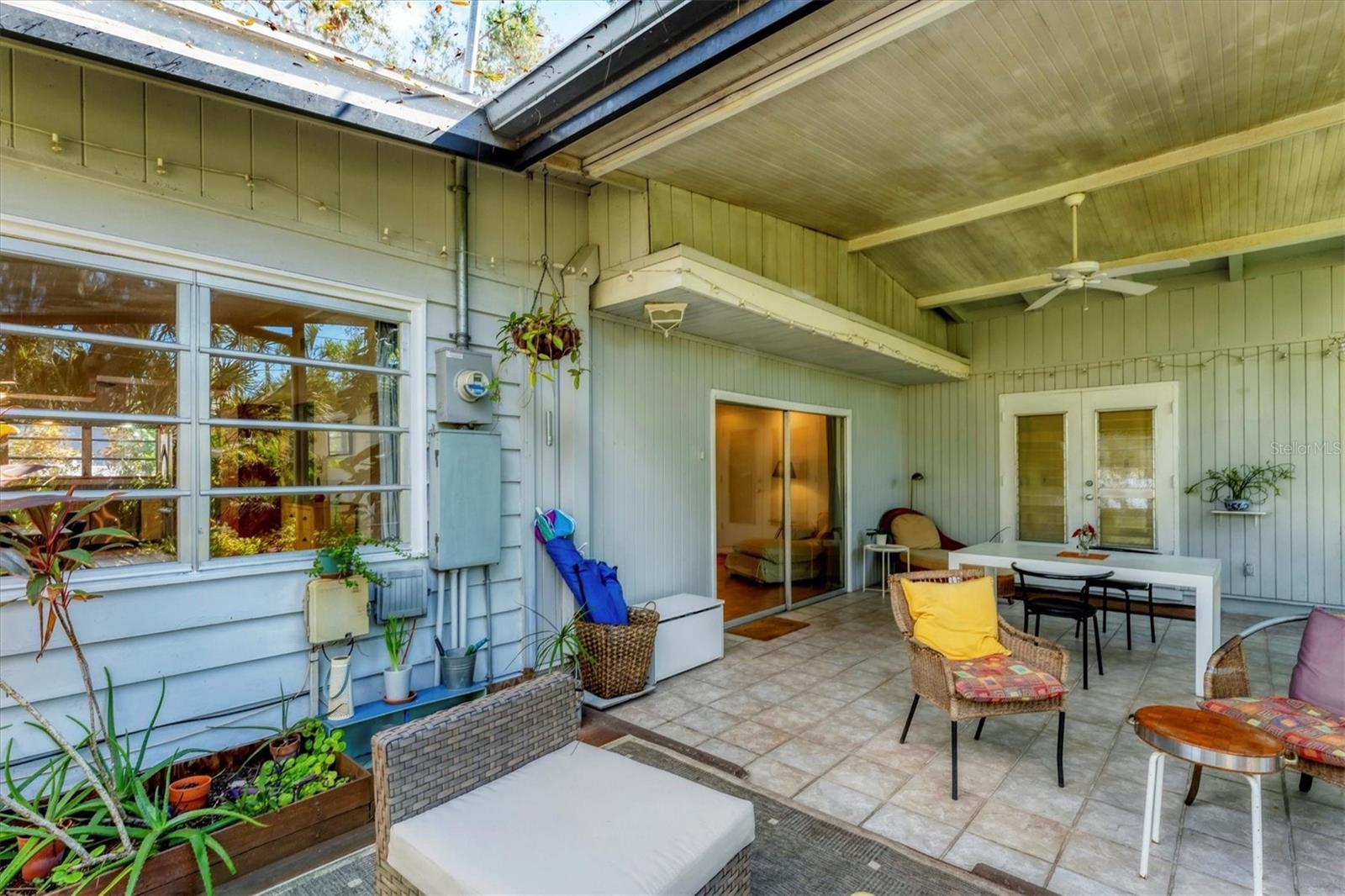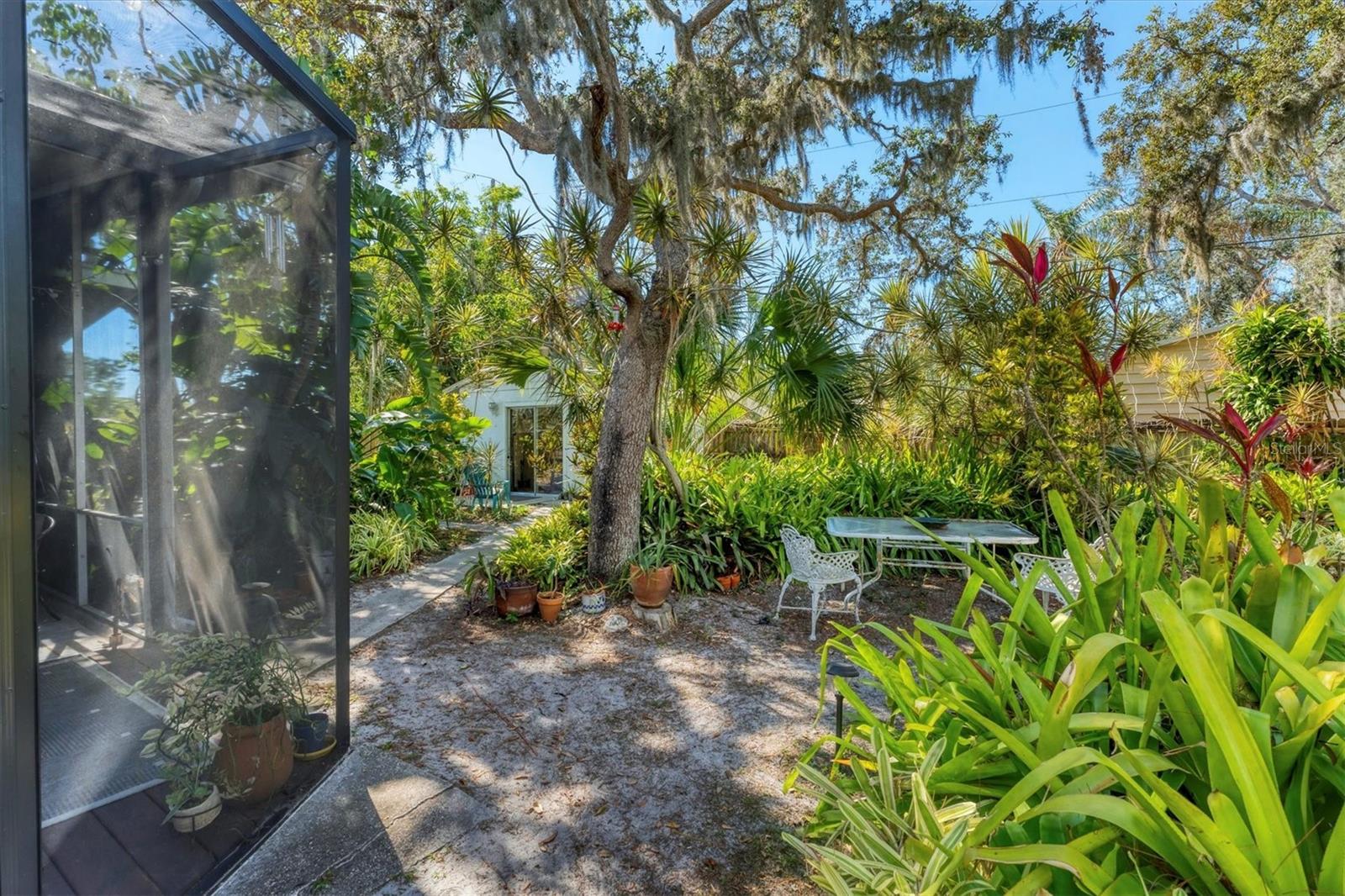 Mid-Century Modern Atomic Ranch Main Home with Cathedral Ceilings and income generating "Casetta" AirBnB, Guest House in the back yard, or could be Mother-In-Law/adult child independent accommodation. The main house is a 3-bedroom, 2-bath plus huge bonus room located in one of Sarasota’s top school districts, this spacious home offers a flexible open layout with long sight lines, The open-concept kitchen with breakfast bar provide ample storage, counter space, and opens up to the large dining room. a walk-in pantry/laundry room adds to the convenience. The large bonus room has a door to the outside ideal as a home office, home gym, art studio, or playroom. Set on a private, tropical paradise this property is a nature lover’s dream the large windows and huge lanai make you feel like you are living in the garden featuring mature oak trees, meandering pathways, and a lush, Florida-friendly botanical garden reminiscent of Selby Gardens. Enjoy low-maintenance, drought-resistant landscaping in both the front and backyard. The remodeled master bath offers a touch of luxury, while the mod, mid-century living room with built-in shelves exudes character and charm. Location? Unbeatable. Just minutes from Siesta Key’s world-famous beaches and downtown Sarasota’s vibrant dining, theater, arts, and music scene. You're only 3 minutes from Trader Joe’s, Aldi, Publix, Walt’s Fish Market, and Bonefish Grill. With a roof installed in 2014, Heat Pump HVAC w/ UV Light in 2017, Washer/Dryer in 2022, Water Heater 2025, Garbage Disposal in 2024, (insurance saving) 3rd Nail Roof Tie-Downs installed in 2023, Water Softener in 2020, Range/Oven in 2023 and hidden terrazzo floors waiting to be uncovered, this home is an absolute one-of-a-kind gem. Make it yours today—and let the guest house help pay your mortgage!
