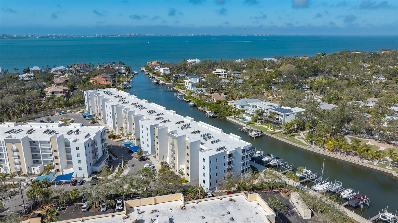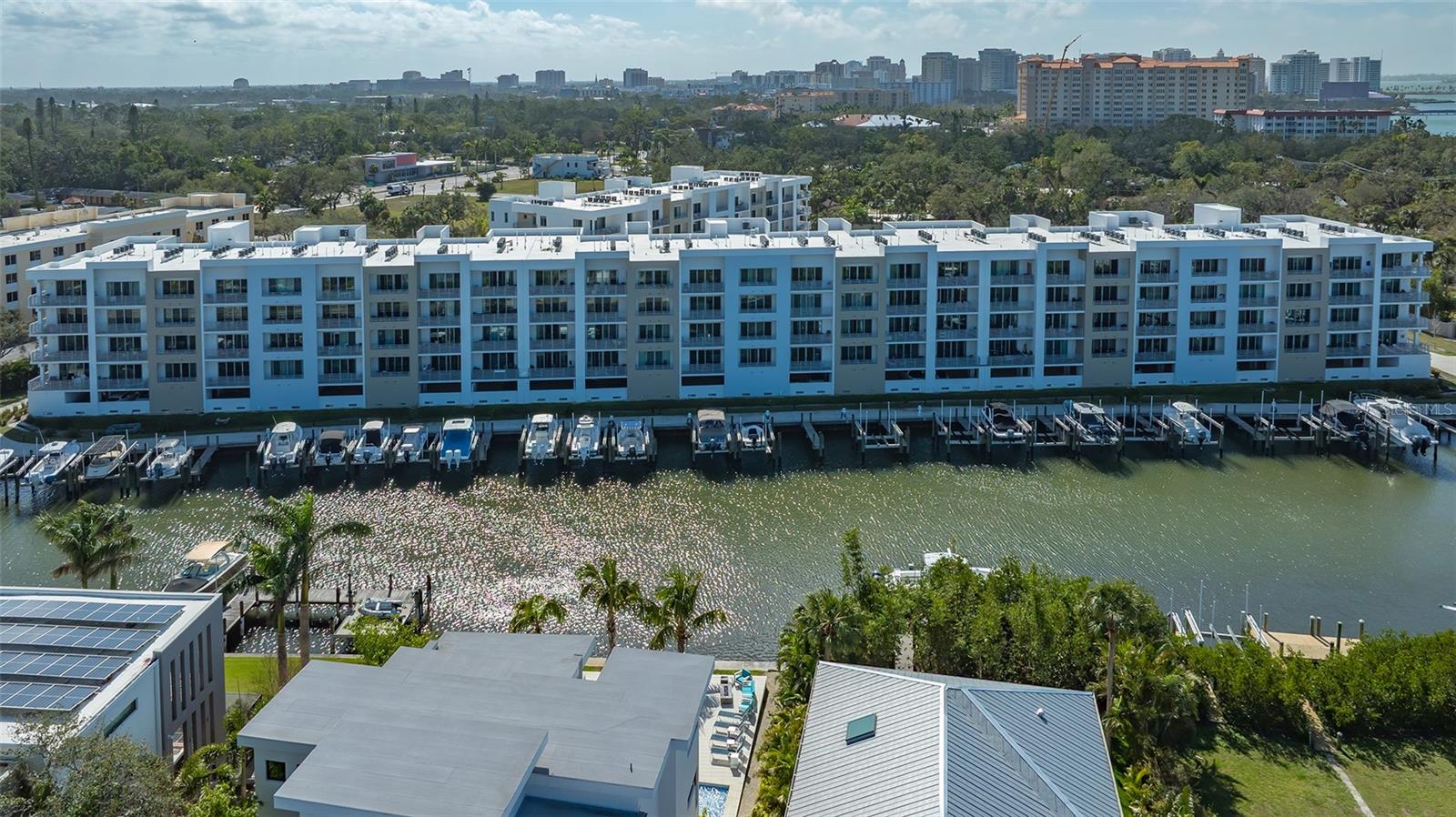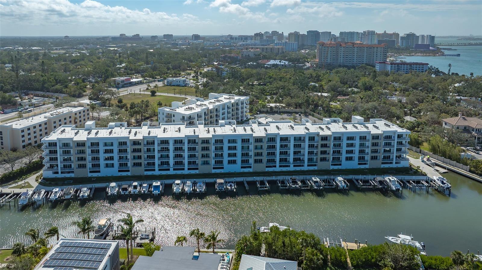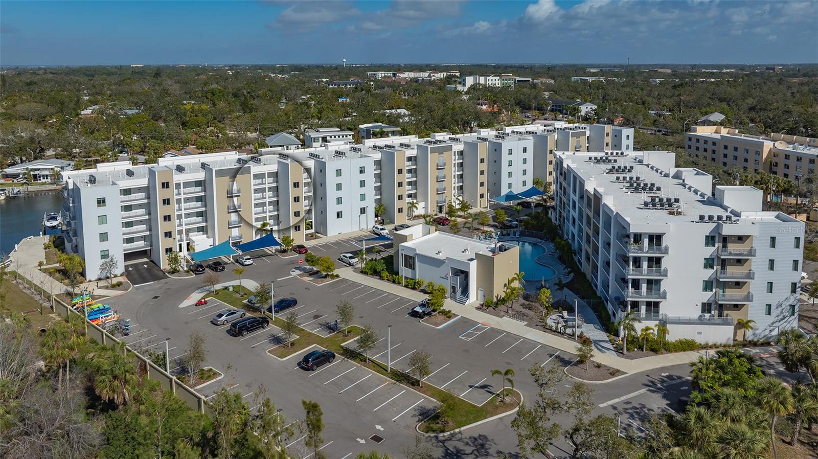 Location, location, location with water views. The Strand of Sarasota on Whitacre Bayou built in 2022 has two buildings with 147 units. Our building 1709 has 108 units in it, four floors, with 27 units per floor, and faces the water and all units have direct bayou water views. This complex has its own marina with 42 slips. This unit does NOT have a boat slip. There is a community clubhouse (1705) with a fitness center, grilling area, firepit, swimming pool, dog park, kayak and canoe storage and launch to access the Bayou. There is also an on-site manager. This fourth floor unit is a one-bedroom, with one and one-half bathrooms with 896 square feet of living space and the largest open, but covered 119 square foot balcony. One can see the Bay from the balcony and all the living area has a bayou water view. This unit is being sold turnkey-furnished, and has quartz countertops and tile flooring throughout. The primary bedroom is carpet and faces the front of the building. The primary bathroom has a single-sink and only the upgraded, larger shower stall. This unit has a deeded and assigned under building parking space #4 (10 x 17) and a deeded under building 3 x 6 storage cage, just to the left of the parking space. There is more than enough guest and second-car parking all over the complex. Unit A408 is the second unit from the left on that floor of the eight other units (401 to 409). This complex rental restrictions are a seven-day minimum 52 weeks a year, if desired. Two pets, dog or cat are allowed with no weight limit. The monthly maintenance fees are less than $500 and this seller has paid the first half of the only assessment due, with the balance of $1,780 due 08/01 for the 2025 calendar year. This unit's monthly utility costs average $65 for water, sewer, trash and recycle and $50 for electricity. All the appliances and the HVAC system are only two years new. This is a must-see for a individual, or couple who want to be on the water close to Downtown Sarasota. If you as a new owner would like to rent the unit for income, the rental company quoted us $3,000 a month on an annual lease and $4,800 a month in high-season, January, February, and March.
