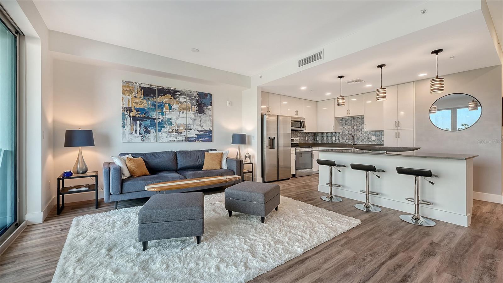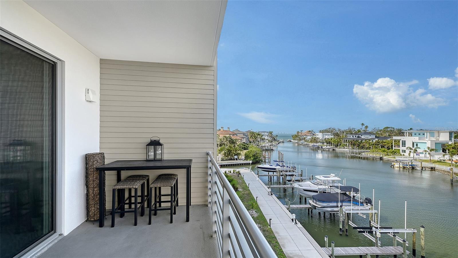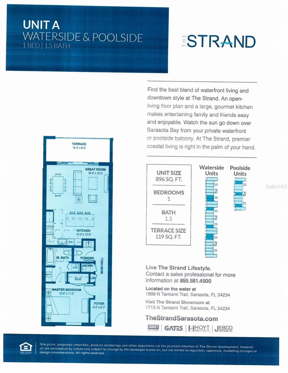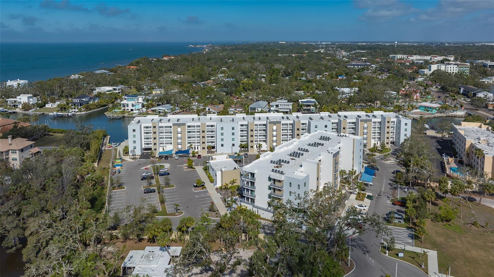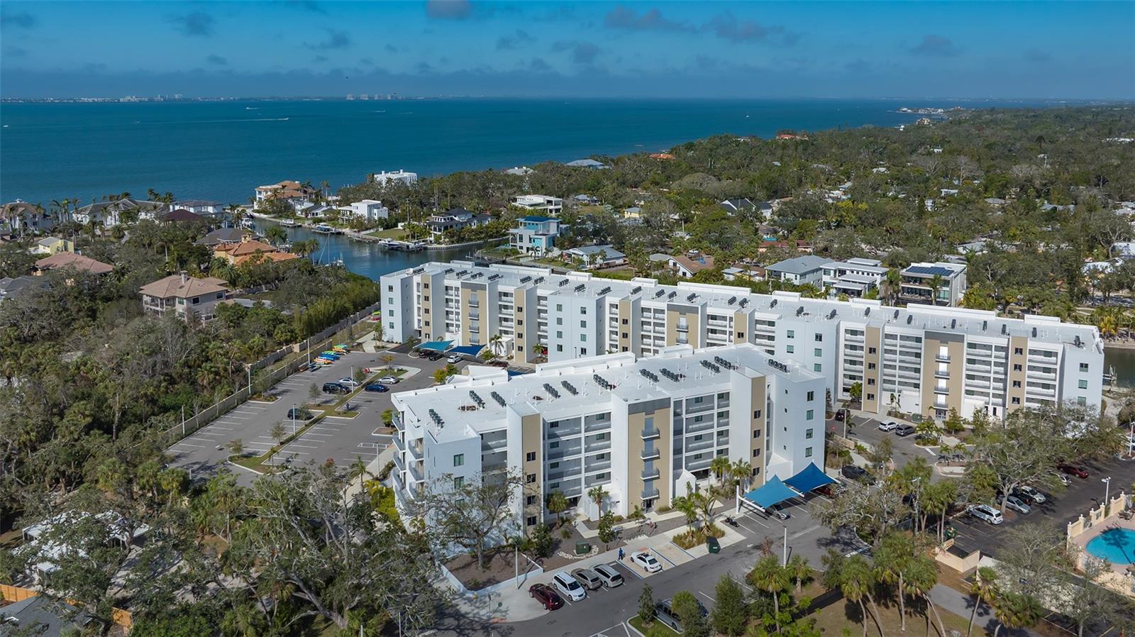 Location, location, location with water views. The Strand of Sarasota on Whitacre Bayou built in 2022 has two buildings with 147 units. Our building 1709 has 108 units in it, four floors, with 27 units per floor, and faces the water and all units have direct bayou water views. This complex has its own marina with 42 slips. This unit does NOT have a boat slip. There is a community clubhouse (1705) with a fitness center, grilling area, firepit, swimming pool, dog park, kayak and canoe storage and launch to access the Bayou. There is also an on-site manager. This fourth floor unit is a one-bedroom, with one and one-half bathrooms with 896 square feet of living space and the largest open, but covered 119 square foot balcony. One can see the Bay from the balcony and all the living area has a bayou water view. This unit is being sold turnkey-furnished, and has quartz countertops and tile flooring throughout. The primary bedroom is carpet and faces the front of the building. The primary bathroom has a single-sink and only the upgraded, larger shower stall. This unit has a deeded and assigned under building parking space #4 (10 x 17) and a deeded under building 3 x 6 storage cage, just to the left of the parking space. There is more than enough guest and second-car parking all over the complex. Unit A408 is the second unit from the left on that floor of the eight other units (401 to 409). This complex rental restrictions are a seven-day minimum 52 weeks a year, if desired. Two pets, dog or cat are allowed with no weight limit. The monthly maintenance fees are less than $500 and this seller has paid the first half of the only assessment due, with the balance of $1,780 due 08/01 for the 2025 calendar year. This unit's monthly utility costs average $65 for water, sewer, trash and recycle and $50 for electricity. All the appliances and the HVAC system are only two years new. This is a must-see for a individual, or couple who want to be on the water close to Downtown Sarasota. If you as a new owner would like to rent the unit for income, the rental company quoted us $3,000 a month on an annual lease and $4,800 a month in high-season, January, February, and March.