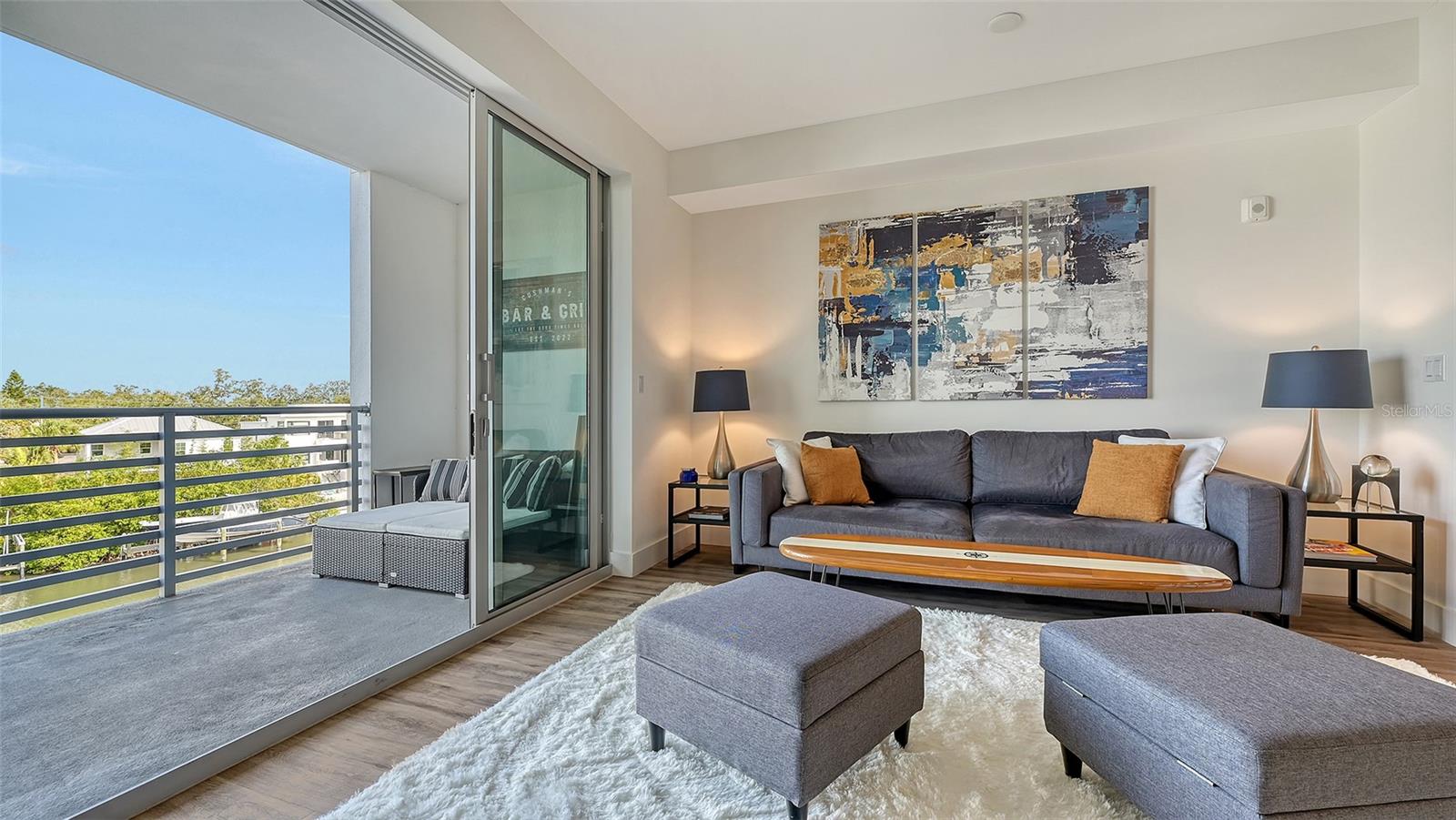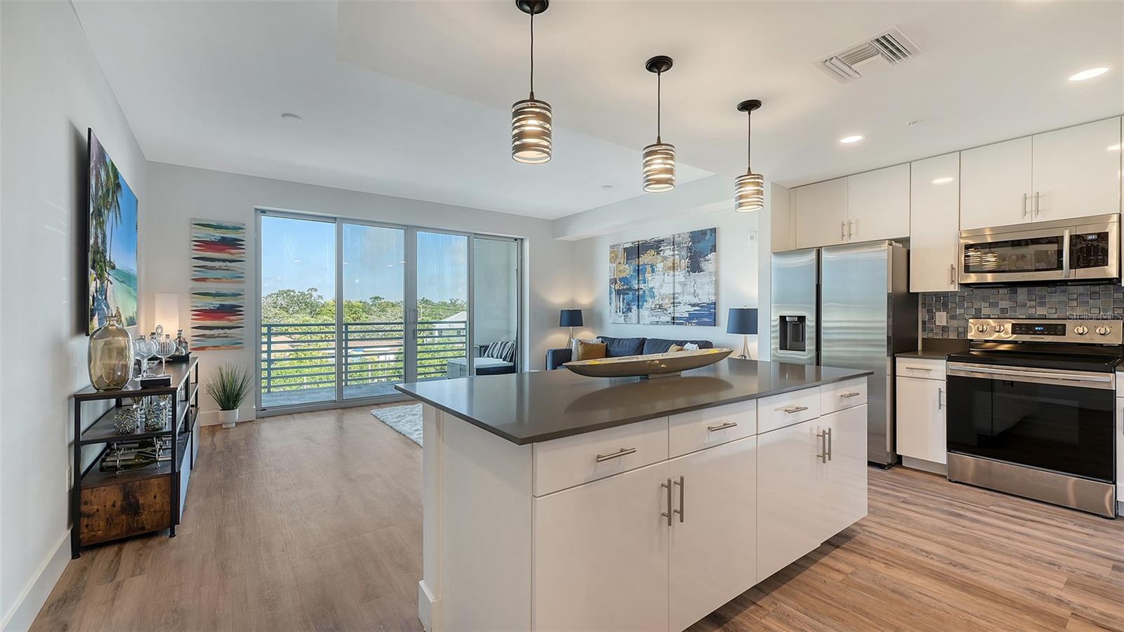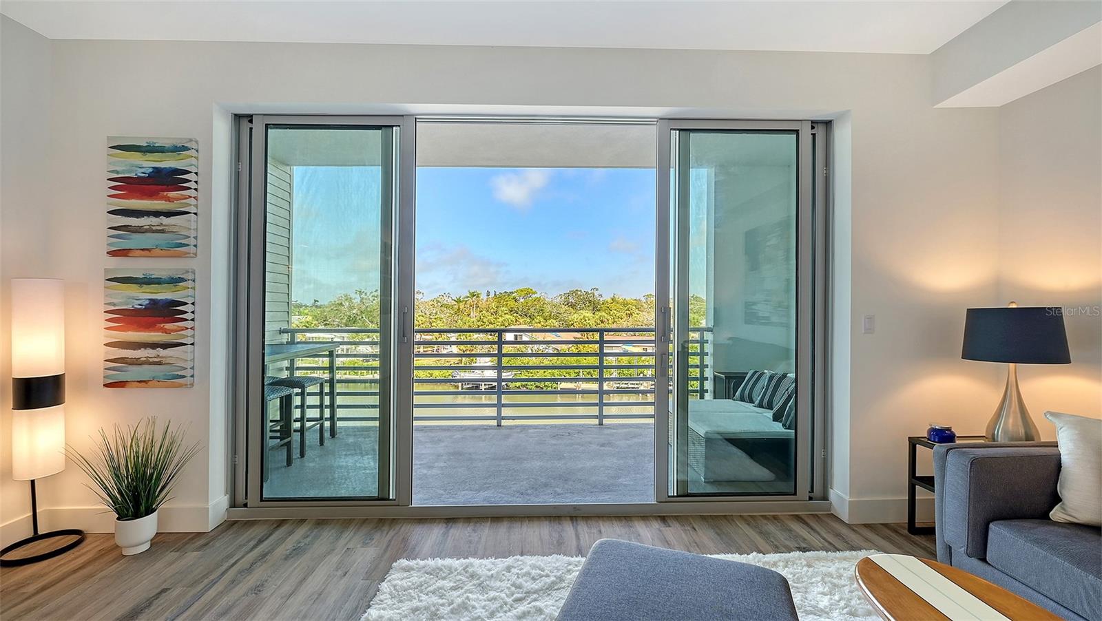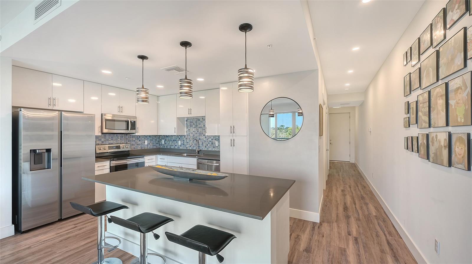 Location, location, location with water views. The Strand of Sarasota on Whitacre Bayou built in 2022 has two buildings with 147 units. Our building 1709 has 108 units in it, four floors, with 27 units per floor, and faces the water and all units have direct bayou water views. This complex has its own marina with 42 slips. This unit does NOT have a boat slip. There is a community clubhouse (1705) with a fitness center, grilling area, firepit, swimming pool, dog park, kayak and canoe storage and launch to access the Bayou. There is also an on-site manager. This fourth floor unit is a one-bedroom, with one and one-half bathrooms with 896 square feet of living space and the largest open, but covered 119 square foot balcony. One can see the Bay from the balcony and all the living area has a bayou water view. This unit is being sold turnkey-furnished, and has quartz countertops and tile flooring throughout. The primary bedroom is carpet and faces the front of the building. The primary bathroom has a single-sink and only the upgraded, larger shower stall. This unit has a deeded and assigned under building parking space #4 (10 x 17) and a deeded under building 3 x 6 storage cage, just to the left of the parking space. There is more than enough guest and second-car parking all over the complex. Unit A408 is the second unit from the left on that floor of the eight other units (401 to 409). This complex rental restrictions are a seven-day minimum 52 weeks a year, if desired. Two pets, dog or cat are allowed with no weight limit. The monthly maintenance fees are less than $500 and this seller has paid the first half of the only assessment due, with the balance of $1,780 due 08/01 for the 2025 calendar year. This unit's monthly utility costs average $65 for water, sewer, trash and recycle and $50 for electricity. All the appliances and the HVAC system are only two years new. This is a must-see for a individual, or couple who want to be on the water close to Downtown Sarasota. If you as a new owner would like to rent the unit for income, the rental company quoted us $3,000 a month on an annual lease and $4,800 a month in high-season, January, February, and March.