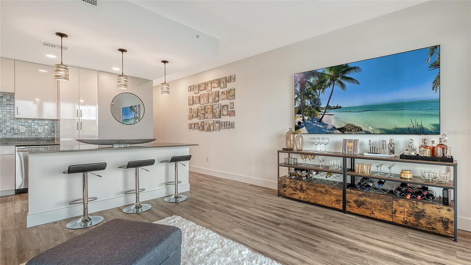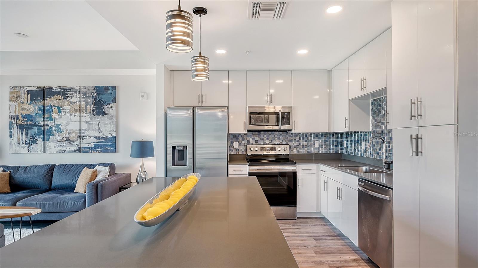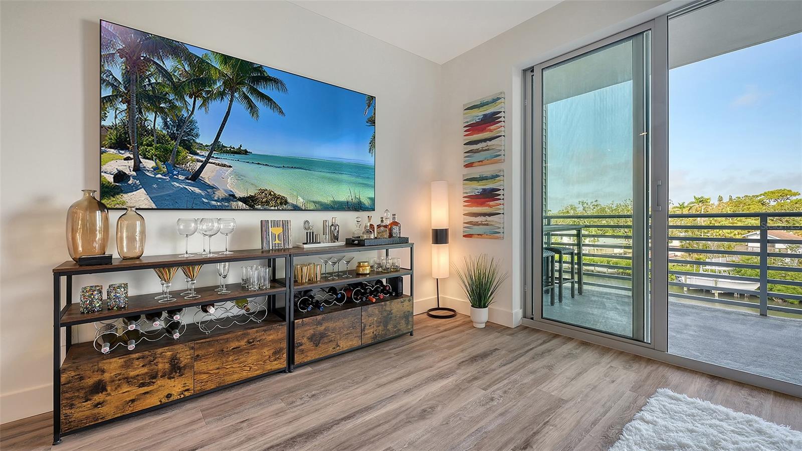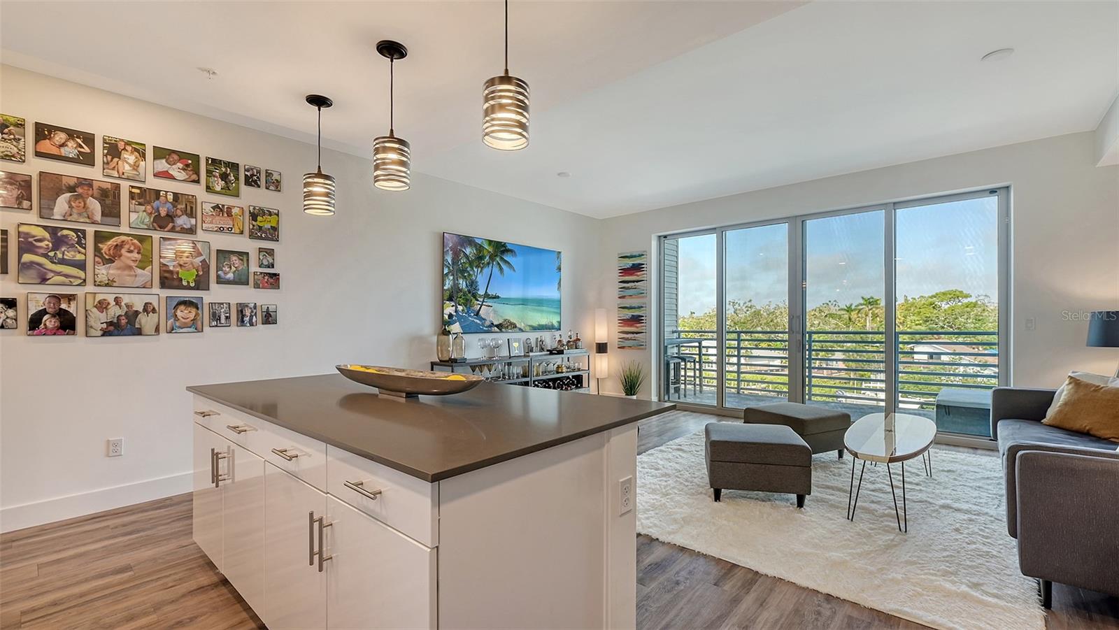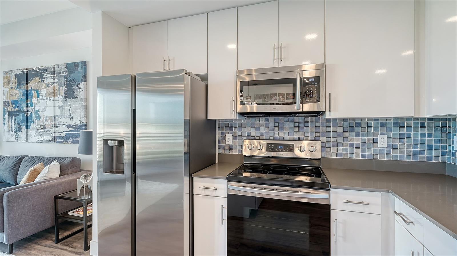 Location, location, location with water views. The Strand of Sarasota on Whitacre Bayou built in 2022 has two buildings with 147 units. Our building 1709 has 108 units in it, four floors, with 27 units per floor, and faces the water and all units have direct bayou water views. This complex has its own marina with 42 slips. This unit does NOT have a boat slip. There is a community clubhouse (1705) with a fitness center, grilling area, firepit, swimming pool, dog park, kayak and canoe storage and launch to access the Bayou. There is also an on-site manager. This fourth floor unit is a one-bedroom, with one and one-half bathrooms with 896 square feet of living space and the largest open, but covered 119 square foot balcony. One can see the Bay from the balcony and all the living area has a bayou water view. This unit is being sold turnkey-furnished, and has quartz countertops and tile flooring throughout. The primary bedroom is carpet and faces the front of the building. The primary bathroom has a single-sink and only the upgraded, larger shower stall. This unit has a deeded and assigned under building parking space #4 (10 x 17) and a deeded under building 3 x 6 storage cage, just to the left of the parking space. There is more than enough guest and second-car parking all over the complex. Unit A408 is the second unit from the left on that floor of the eight other units (401 to 409). This complex rental restrictions are a seven-day minimum 52 weeks a year, if desired. Two pets, dog or cat are allowed with no weight limit. The monthly maintenance fees are less than $500 and this seller has paid the first half of the only assessment due, with the balance of $1,780 due 08/01 for the 2025 calendar year. This unit's monthly utility costs average $65 for water, sewer, trash and recycle and $50 for electricity. All the appliances and the HVAC system are only two years new. This is a must-see for a individual, or couple who want to be on the water close to Downtown Sarasota. If you as a new owner would like to rent the unit for income, the rental company quoted us $3,000 a month on an annual lease and $4,800 a month in high-season, January, February, and March.