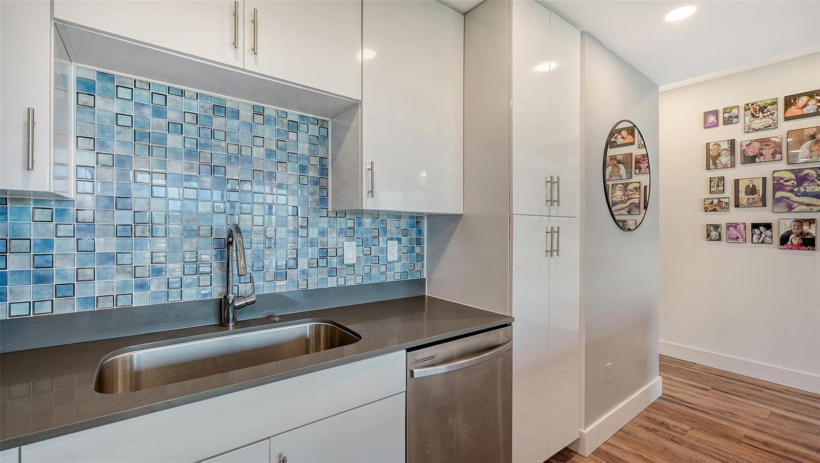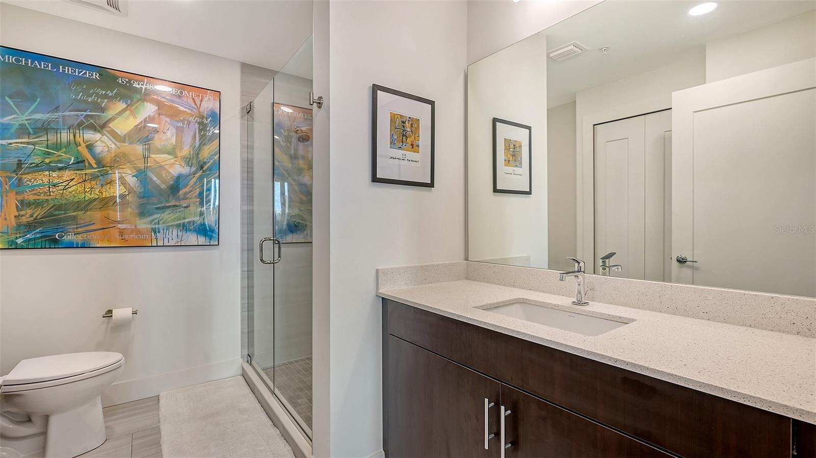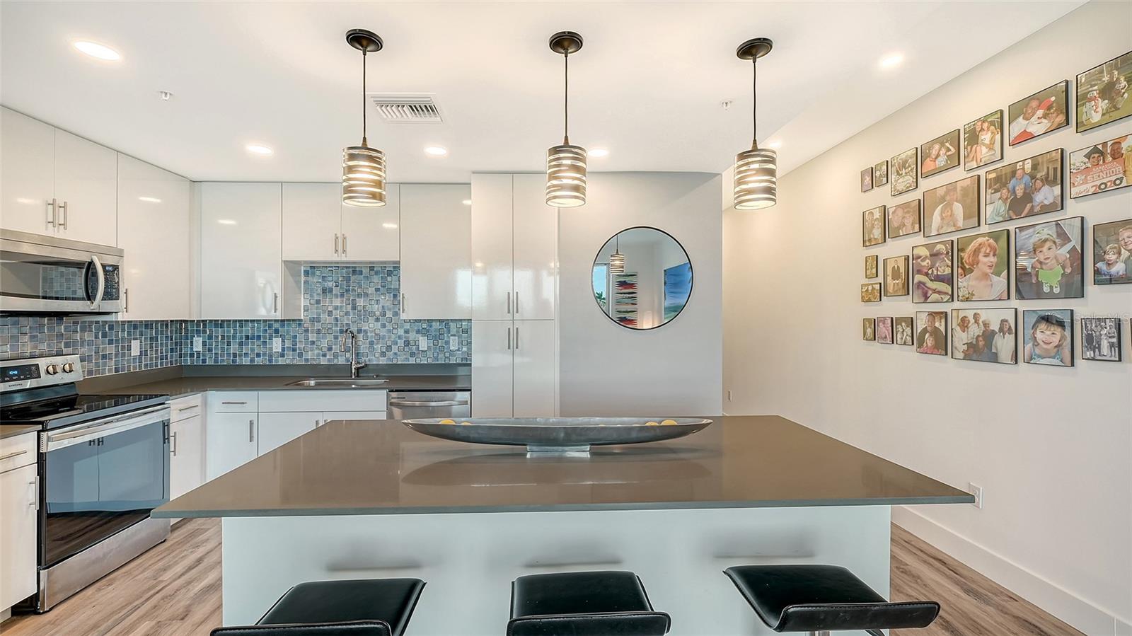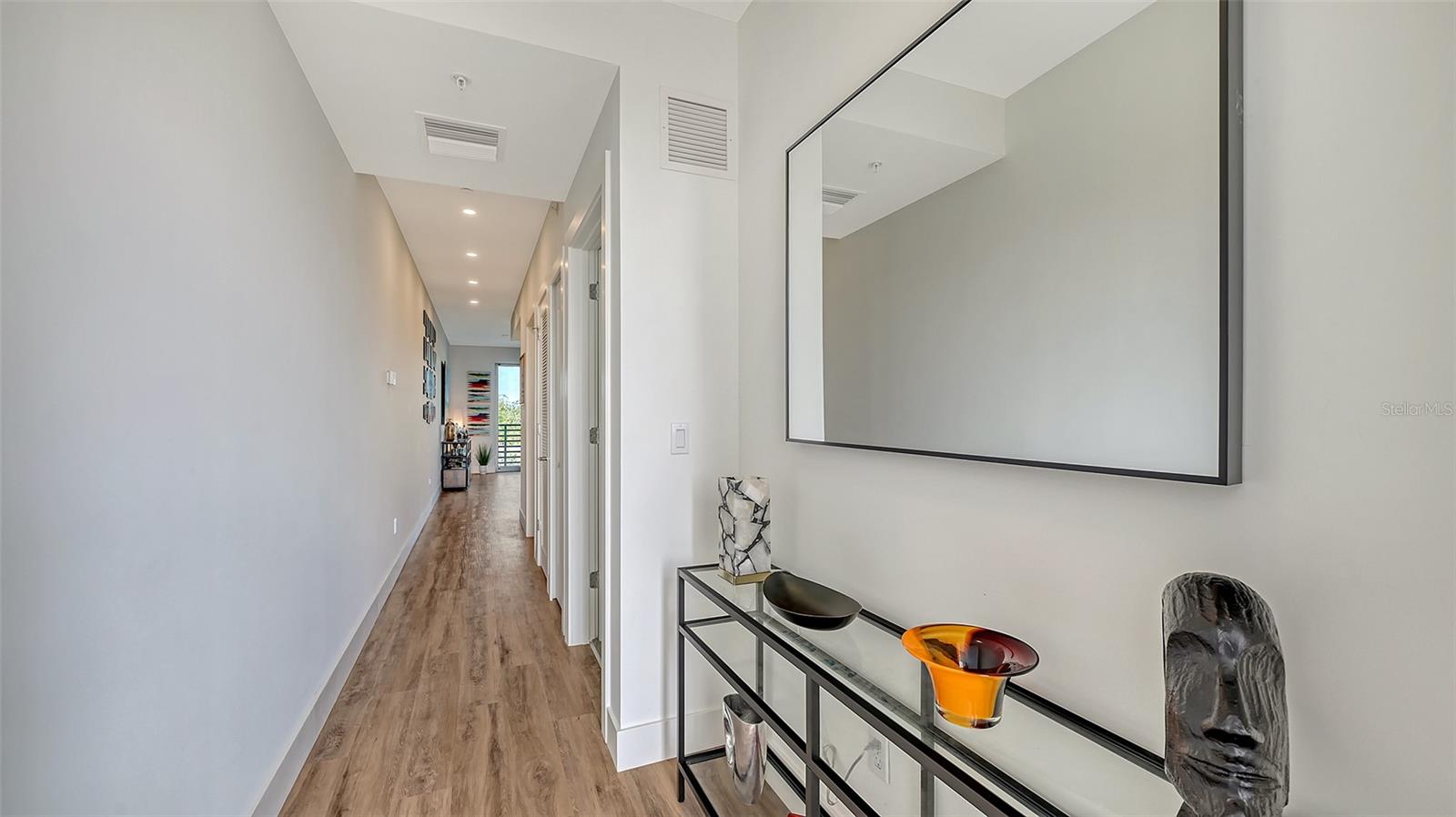 Location, location, location with water views. The Strand of Sarasota on Whitacre Bayou built in 2022 has two buildings with 147 units. Our building 1709 has 108 units in it, four floors, with 27 units per floor, and faces the water and all units have direct bayou water views. This complex has its own marina with 42 slips. This unit does NOT have a boat slip. There is a community clubhouse (1705) with a fitness center, grilling area, firepit, swimming pool, dog park, kayak and canoe storage and launch to access the Bayou. There is also an on-site manager. This fourth floor unit is a one-bedroom, with one and one-half bathrooms with 896 square feet of living space and the largest open, but covered 119 square foot balcony. One can see the Bay from the balcony and all the living area has a bayou water view. This unit is being sold turnkey-furnished, and has quartz countertops and tile flooring throughout. The primary bedroom is carpet and faces the front of the building. The primary bathroom has a single-sink and only the upgraded, larger shower stall. This unit has a deeded and assigned under building parking space #4 (10 x 17) and a deeded under building 3 x 6 storage cage, just to the left of the parking space. There is more than enough guest and second-car parking all over the complex. Unit A408 is the second unit from the left on that floor of the eight other units (401 to 409). This complex rental restrictions are a seven-day minimum 52 weeks a year, if desired. Two pets, dog or cat are allowed with no weight limit. The monthly maintenance fees are less than $500 and this seller has paid the first half of the only assessment due, with the balance of $1,780 due 08/01 for the 2025 calendar year. This unit's monthly utility costs average $65 for water, sewer, trash and recycle and $50 for electricity. All the appliances and the HVAC system are only two years new. This is a must-see for a individual, or couple who want to be on the water close to Downtown Sarasota. If you as a new owner would like to rent the unit for income, the rental company quoted us $3,000 a month on an annual lease and $4,800 a month in high-season, January, February, and March.