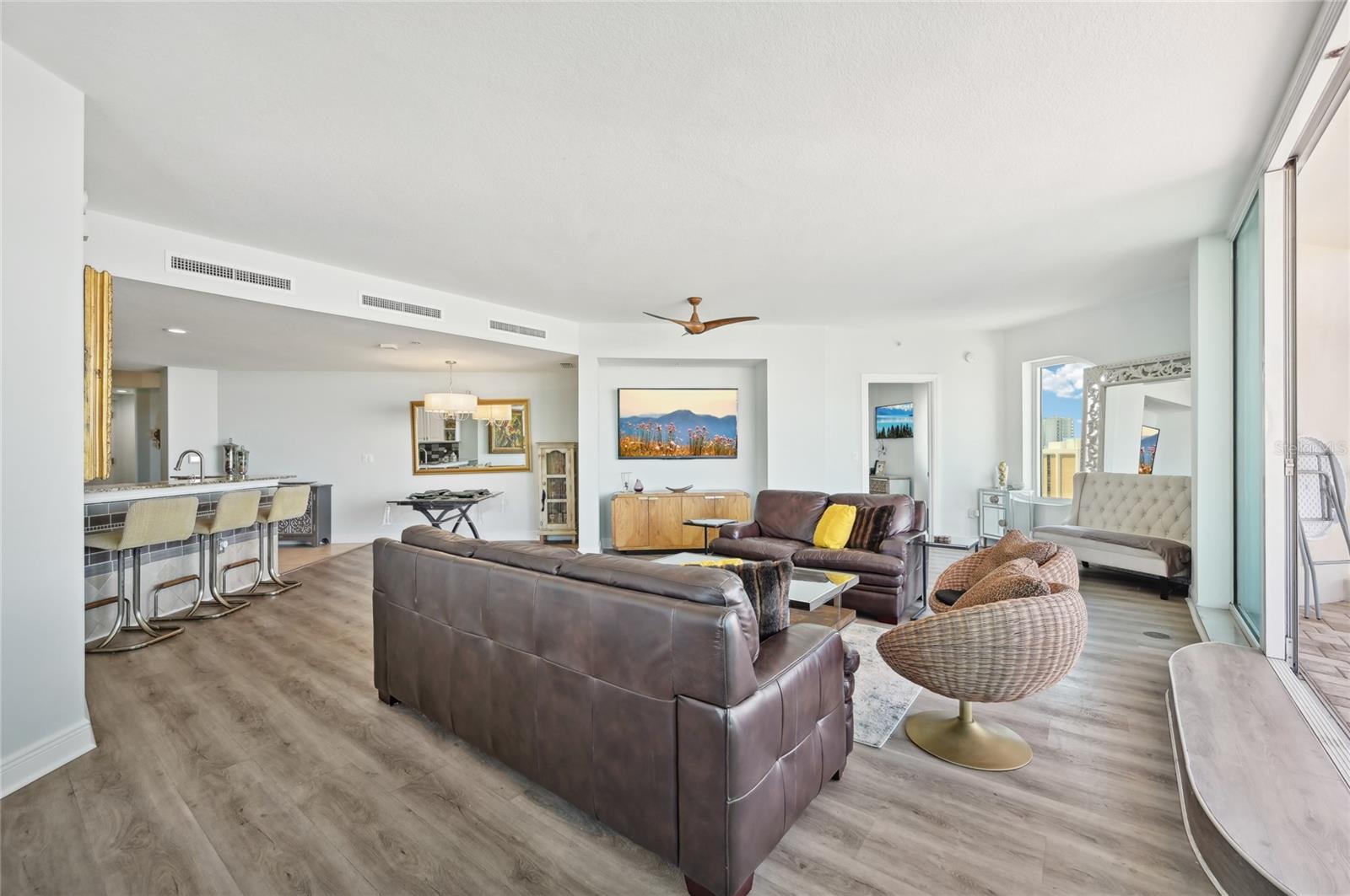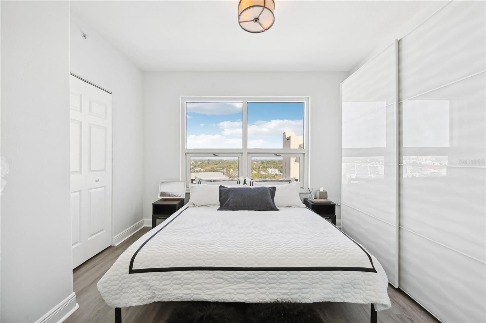 Unoccupied and easy to show make your appointment today! Priced under 09.2025 Appraisal Report. Report available to qualified Buyers. Discover the ultimate in contemporary living with this rarely available northwest corner unit on the 10th floor of Rivo at Ringling. This iconic residence promises a luxurious lifestyle, boasting extensive concierge services and an amenity-rich level that includes a pristine pool, a state-of-the-art fitness center, and secure parking. Upon entering, you're greeted by a welcoming generous foyer that effortlessly guides the eye through the expansive living area. The highlight? An impressive 16-foot sliding glass wall that opens onto a stunning 20’ x 9’ terrace, showcasing enchanting views over the city, the islands, and verdant landscapes. Enjoy vistas of Main Street and beyond, admiring diverse architectural styles juxtaposed with tree canopies and water views. The panorama also stretches through Big Pass to the Gulf of Mexico, extending to Siesta Key to the south and northerly to Sarasota Bay. The open-plan great room is a delight, offering ample space for casual seating and formal dining, all while being immersed in the beauty of the outdoor scenery and the evening's twinkling lights. The master suite is a private haven, featuring a custom walk-in closet and an en-suite bath adorned with a double-size vanity, a granite countertop, a spacious walk-in shower surrounded by chrome-framed glass, and a luxurious soaking tub. The thoughtful split-bedroom design offers additional seclusion, with two additional bedrooms providing captivating views of the city and water. A full bathroom boasts a shower/tub combination accented with a quartz countertop and a chic vessel sink. Abundant closet space and a dedicated full-size laundry room add to the well-planned functionality of the home. Recent upgrades include a new Rheem water heater ( 2022) and a Trane air conditioner (2024). The property's secure gated parking garage with two private spaces ensures stress-free parking. Rivo at Ringling delivers vibrant urban living within an architectural masterpiece built around an atrium bathing the interiors in natural light and adorned with lush indoor landscaping. Positioned perfectly to enjoy all that downtown Sarasota has for you to enjoy, while remaining a serene escape from the bustle, it is only a quick free trolley ride to stunning beaches and within a quick walk to fine dining, boutique shopping, and entertainment. On the third floor, residents are treated to luxurious amenities including a heated pool and spa with sundeck, a BBQ area, a modern gym, a social room, friendly on-site management, a convenient bike room, and a kayak rack. Redefining urban sophistication, Rivo at Ringling stands as a testament to iconic style, with fully funded reserves ensuring peace of mind and a vibrant social calendar that enriches community life.