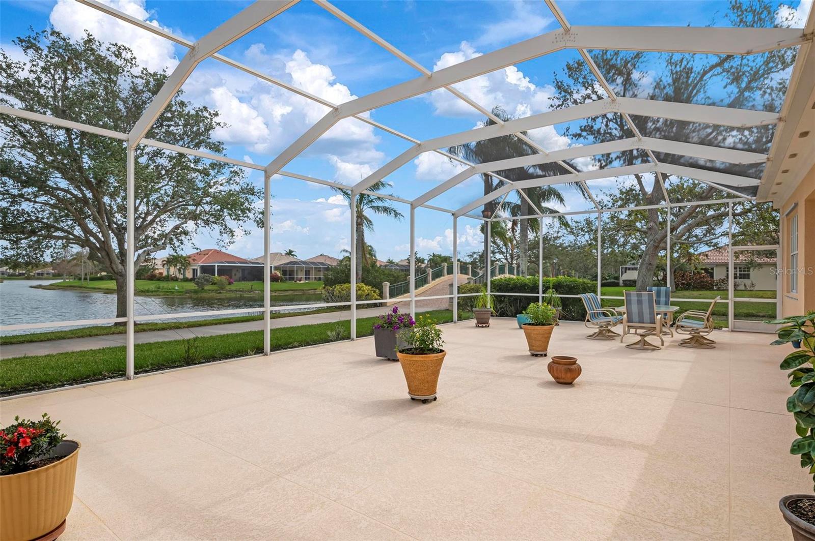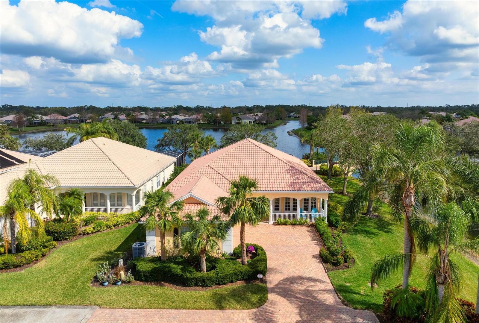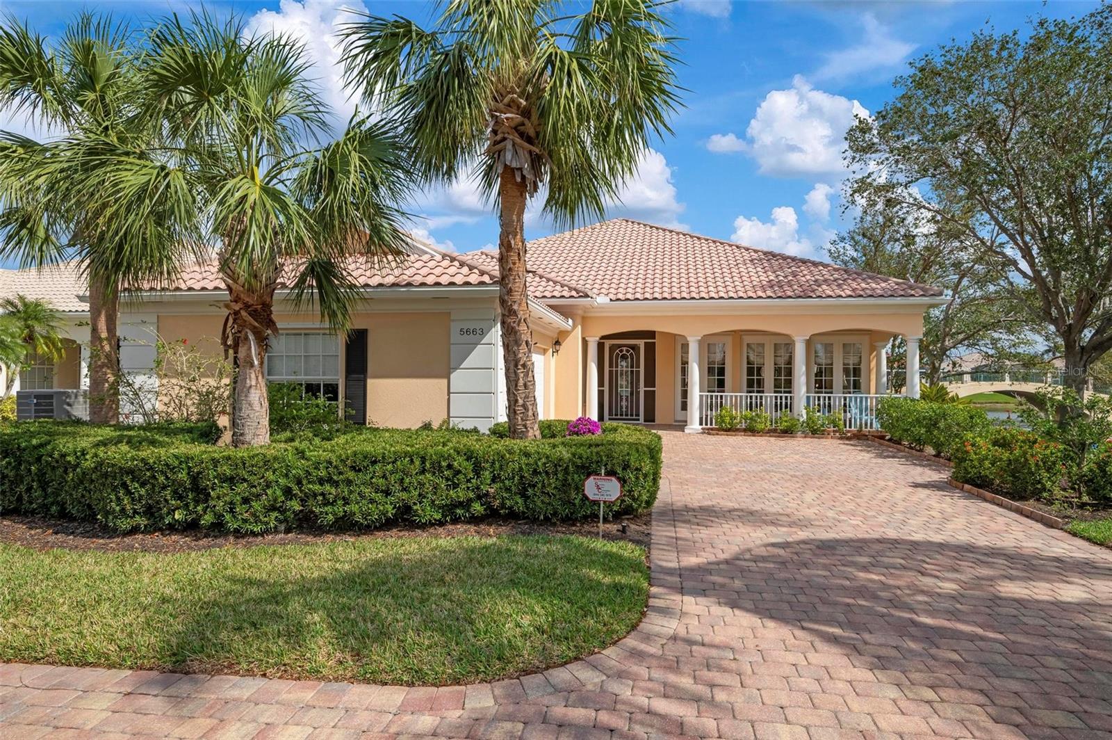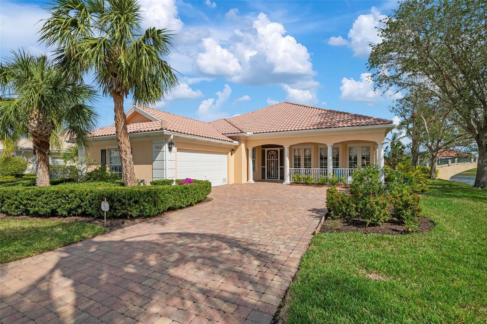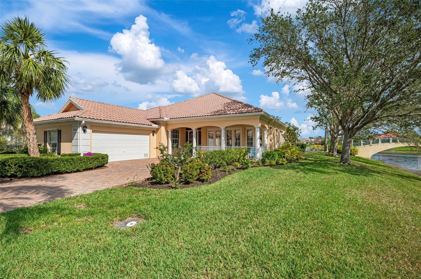 Welcome to your dream home nestled on one of the most beautiful waterfront and, at nearly 10,000 square feet, one of the largest lots in the luxury resort style living of Village Walk. As you pull up to the home, you're greeted by the large gorgeous Southern-style porch and a tropical water view extending along the entire stretch of the side property and beyond. This property’s breathtaking views offer peace and tranquility. This rare corner property is a private oasis. Situated facing East-West, you will be amazed by the sunrises over the lake in the morning and stunned by colorful sunsets off the porch in the evening – majestic bookends to your day to be capped off by clear views of luminous moons. Enjoy fantastic vistas of the serene water, elegant bridges, and the beautifully landscaped gardens from every room, creating an ever-changing backdrop of nature’s beauty, including the diverse bird life. As you step inside this meticulously maintained home, your eye is immediately drawn to the bright and open floor plan and the wide and long lake view. Large windows complimented by designer window treatments, tasteful custom built-ins, and crown molding throughout, among other unique features, create a distinct architectural space that is at once light, sophisticated, comfortable and inviting. The home’s updates include warm engineered wood flooring in all the bedrooms, living room and dining room; a new HVAC (2023) with a heat pump and an upgraded corrosion package to ensure long-lasting efficiency, a new LG washer and dryer (2023), and brand new 55 gallon Rheem water heater with new expansion tank (2025). The next owner will benefit from transferable warranties. From the family room, step outside onto the cozy sitting area of the under hang and the expansive screened-in lanai with new screens secured with new hardware (2023), making this space perfect for outdoor entertaining, container gardening, and relaxation. The lanai offers unobstructed water views in multiple directions accented by colorful Florida native gardens and landscaping. Feel secure knowing Village Walk construction is poured concrete walls and built very solid, including roofs reinforced exceeding building codes. This vibrant gated community gives residents of all ages access to miles of scenic walking paths along picturesque lakes, a heated lap pool, and a lagoon pool for leisurely afternoons. The state-of-the-art fitness center, six Har-Tru lighted tennis courts, pickleball, bocce, and Town Center gathering spaces that host a robust activities calendar all offer ample recreational opportunities. Additional amenities include a gift shop, a café with a poolside tiki bar, a hair salon, a gas station, and so much more. Come discover why this home and the Village Walk community, are truly special!