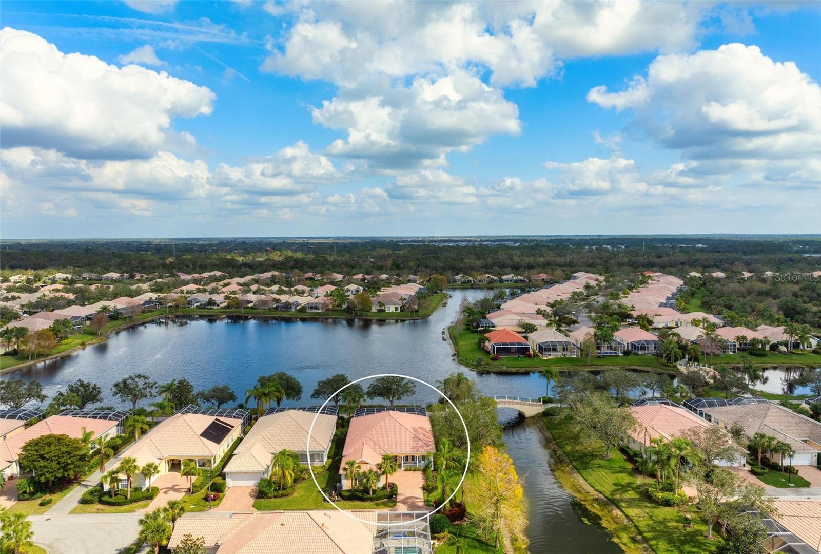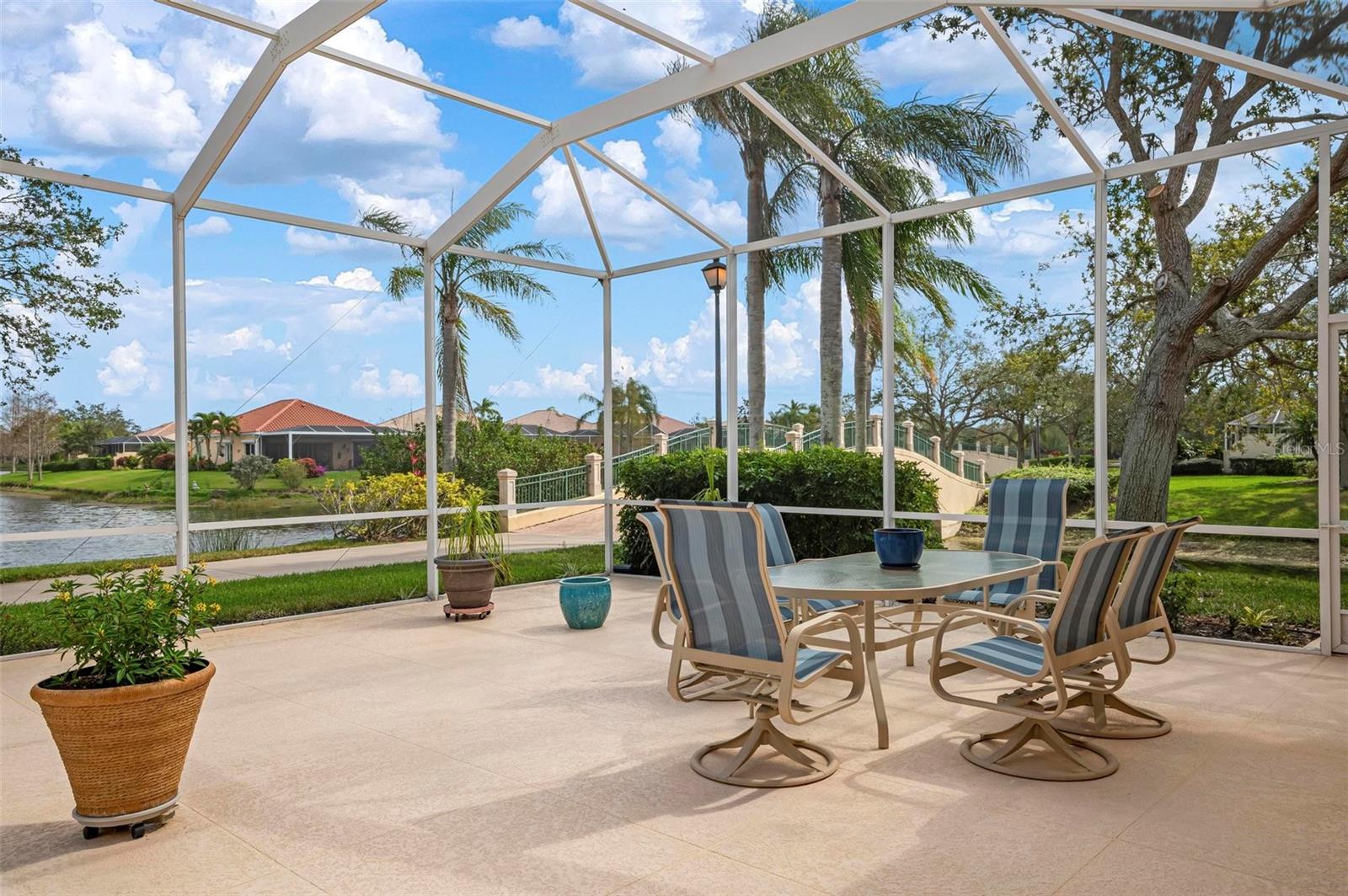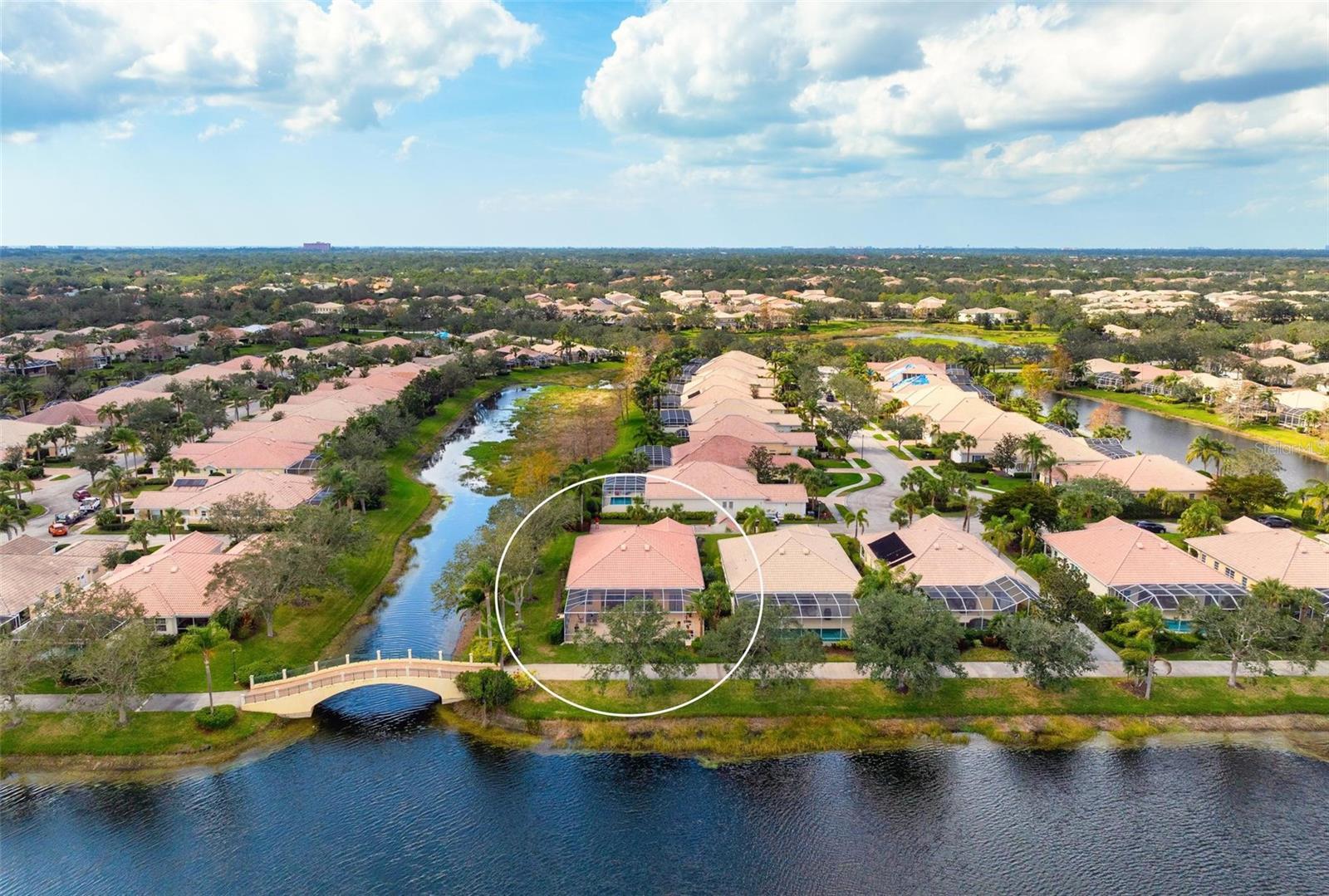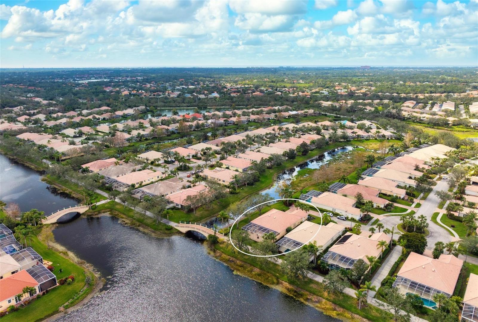 Welcome to your dream home nestled on one of the most beautiful waterfront and, at nearly 10,000 square feet, one of the largest lots in the luxury resort style living of Village Walk. As you pull up to the home, you're greeted by the large gorgeous Southern-style porch and a tropical water view extending along the entire stretch of the side property and beyond. This property’s breathtaking views offer peace and tranquility. This rare corner property is a private oasis. Situated facing East-West, you will be amazed by the sunrises over the lake in the morning and stunned by colorful sunsets off the porch in the evening – majestic bookends to your day to be capped off by clear views of luminous moons. Enjoy fantastic vistas of the serene water, elegant bridges, and the beautifully landscaped gardens from every room, creating an ever-changing backdrop of nature’s beauty, including the diverse bird life. As you step inside this meticulously maintained home, your eye is immediately drawn to the bright and open floor plan and the wide and long lake view. Large windows complimented by designer window treatments, tasteful custom built-ins, and crown molding throughout, among other unique features, create a distinct architectural space that is at once light, sophisticated, comfortable and inviting. The home’s updates include warm engineered wood flooring in all the bedrooms, living room and dining room; a new HVAC (2023) with a heat pump and an upgraded corrosion package to ensure long-lasting efficiency, a new LG washer and dryer (2023), and brand new 55 gallon Rheem water heater with new expansion tank (2025). The next owner will benefit from transferable warranties. From the family room, step outside onto the cozy sitting area of the under hang and the expansive screened-in lanai with new screens secured with new hardware (2023), making this space perfect for outdoor entertaining, container gardening, and relaxation. The lanai offers unobstructed water views in multiple directions accented by colorful Florida native gardens and landscaping. Feel secure knowing Village Walk construction is poured concrete walls and built very solid, including roofs reinforced exceeding building codes. This vibrant gated community gives residents of all ages access to miles of scenic walking paths along picturesque lakes, a heated lap pool, and a lagoon pool for leisurely afternoons. The state-of-the-art fitness center, six Har-Tru lighted tennis courts, pickleball, bocce, and Town Center gathering spaces that host a robust activities calendar all offer ample recreational opportunities. Additional amenities include a gift shop, a café with a poolside tiki bar, a hair salon, a gas station, and so much more. Come discover why this home and the Village Walk community, are truly special!