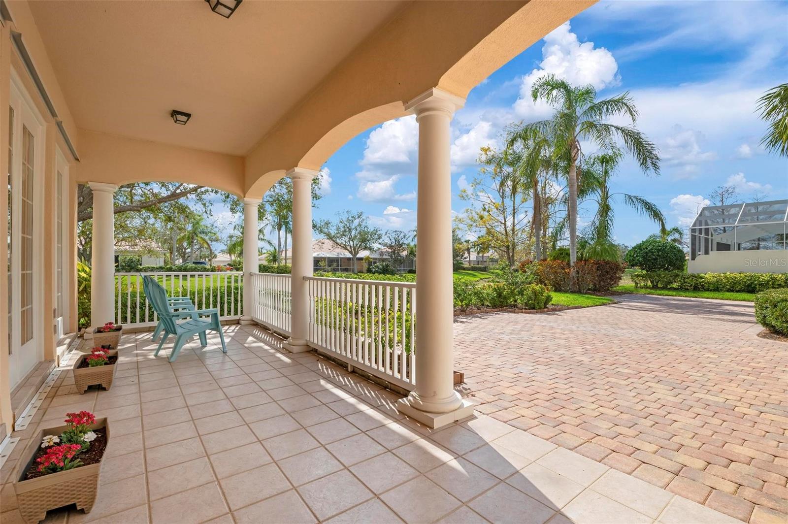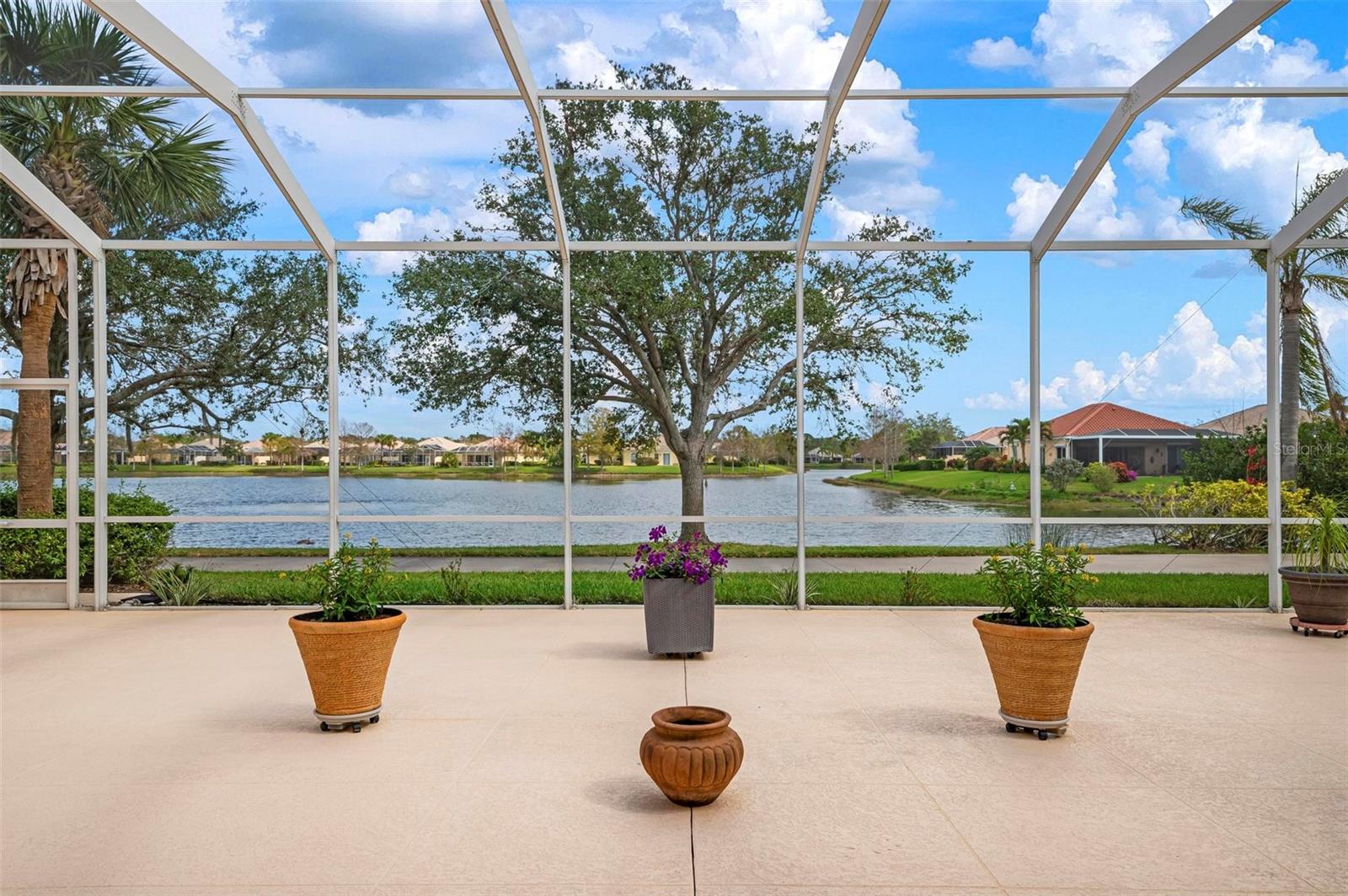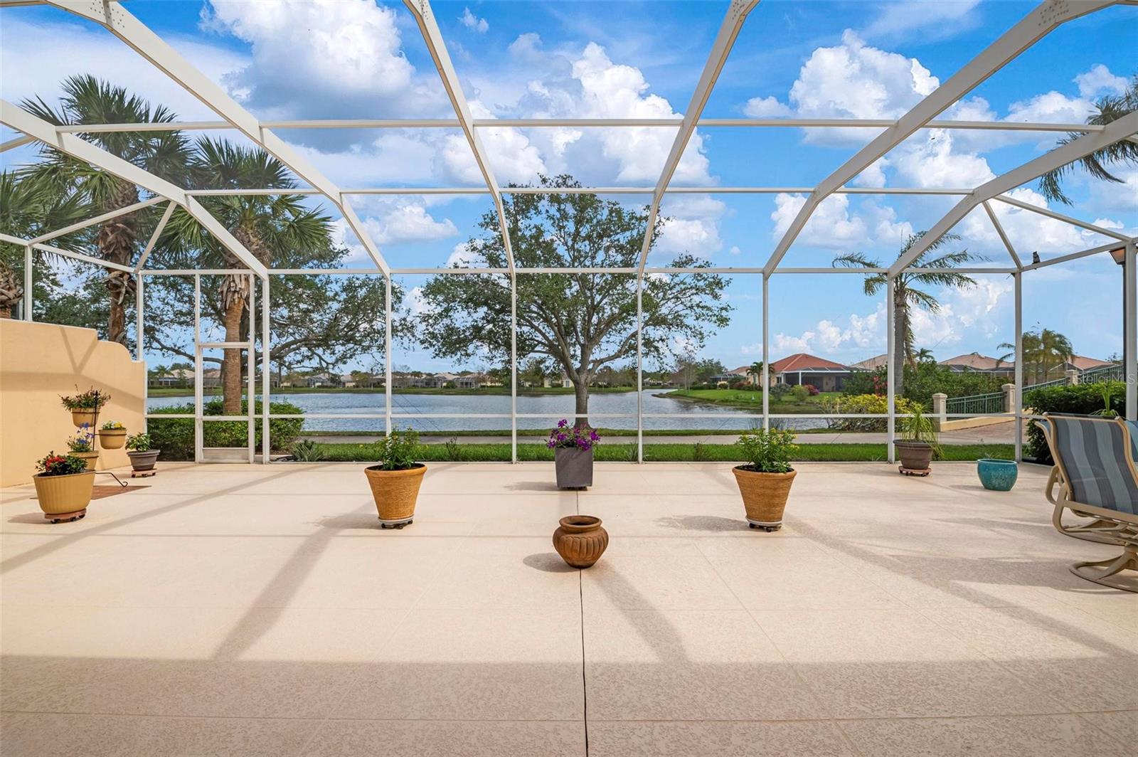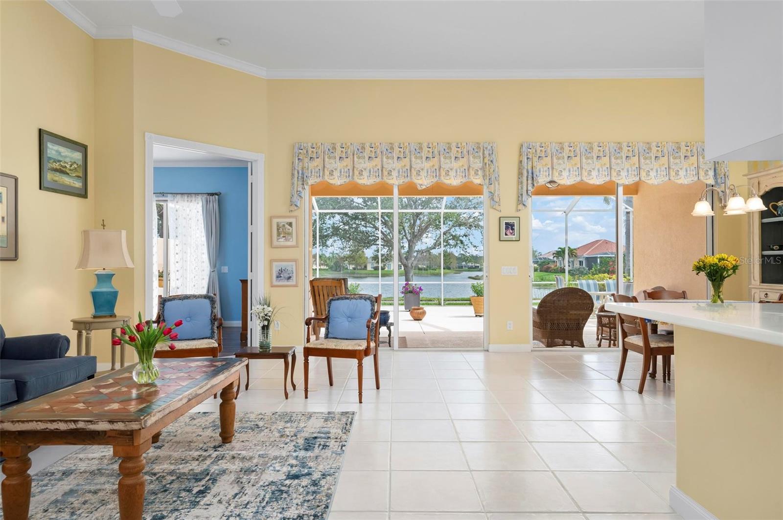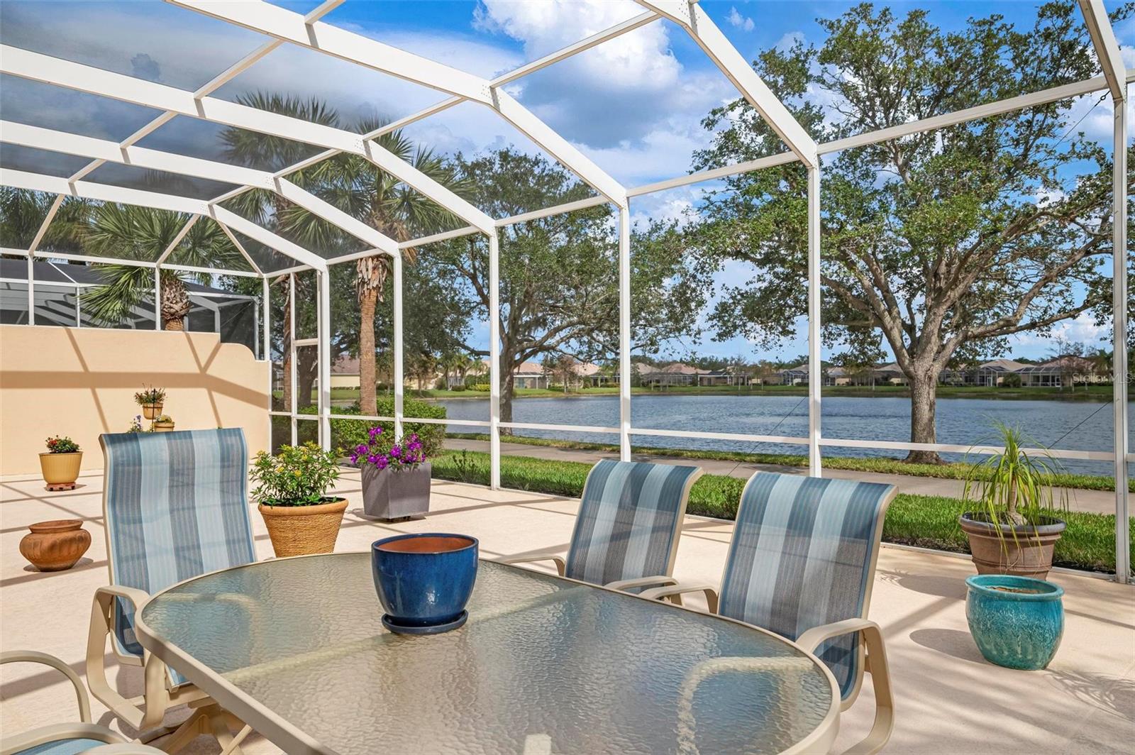 Welcome to your dream home nestled on one of the most beautiful waterfront and, at nearly 10,000 square feet, one of the largest lots in the luxury resort style living of Village Walk. As you pull up to the home, you're greeted by the large gorgeous Southern-style porch and a tropical water view extending along the entire stretch of the side property and beyond. This property’s breathtaking views offer peace and tranquility. This rare corner property is a private oasis. Situated facing East-West, you will be amazed by the sunrises over the lake in the morning and stunned by colorful sunsets off the porch in the evening – majestic bookends to your day to be capped off by clear views of luminous moons. Enjoy fantastic vistas of the serene water, elegant bridges, and the beautifully landscaped gardens from every room, creating an ever-changing backdrop of nature’s beauty, including the diverse bird life. As you step inside this meticulously maintained home, your eye is immediately drawn to the bright and open floor plan and the wide and long lake view. Large windows complimented by designer window treatments, tasteful custom built-ins, and crown molding throughout, among other unique features, create a distinct architectural space that is at once light, sophisticated, comfortable and inviting. The home’s updates include warm engineered wood flooring in all the bedrooms, living room and dining room; a new HVAC (2023) with a heat pump and an upgraded corrosion package to ensure long-lasting efficiency, a new LG washer and dryer (2023), and brand new 55 gallon Rheem water heater with new expansion tank (2025). The next owner will benefit from transferable warranties. From the family room, step outside onto the cozy sitting area of the under hang and the expansive screened-in lanai with new screens secured with new hardware (2023), making this space perfect for outdoor entertaining, container gardening, and relaxation. The lanai offers unobstructed water views in multiple directions accented by colorful Florida native gardens and landscaping. Feel secure knowing Village Walk construction is poured concrete walls and built very solid, including roofs reinforced exceeding building codes. This vibrant gated community gives residents of all ages access to miles of scenic walking paths along picturesque lakes, a heated lap pool, and a lagoon pool for leisurely afternoons. The state-of-the-art fitness center, six Har-Tru lighted tennis courts, pickleball, bocce, and Town Center gathering spaces that host a robust activities calendar all offer ample recreational opportunities. Additional amenities include a gift shop, a café with a poolside tiki bar, a hair salon, a gas station, and so much more. Come discover why this home and the Village Walk community, are truly special!