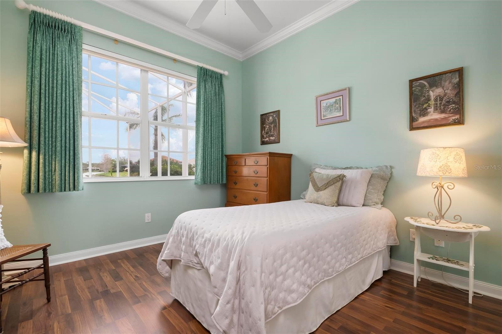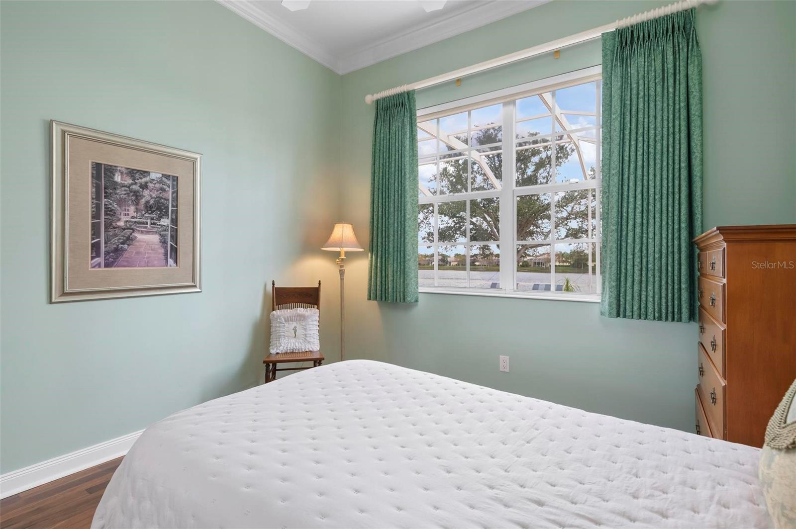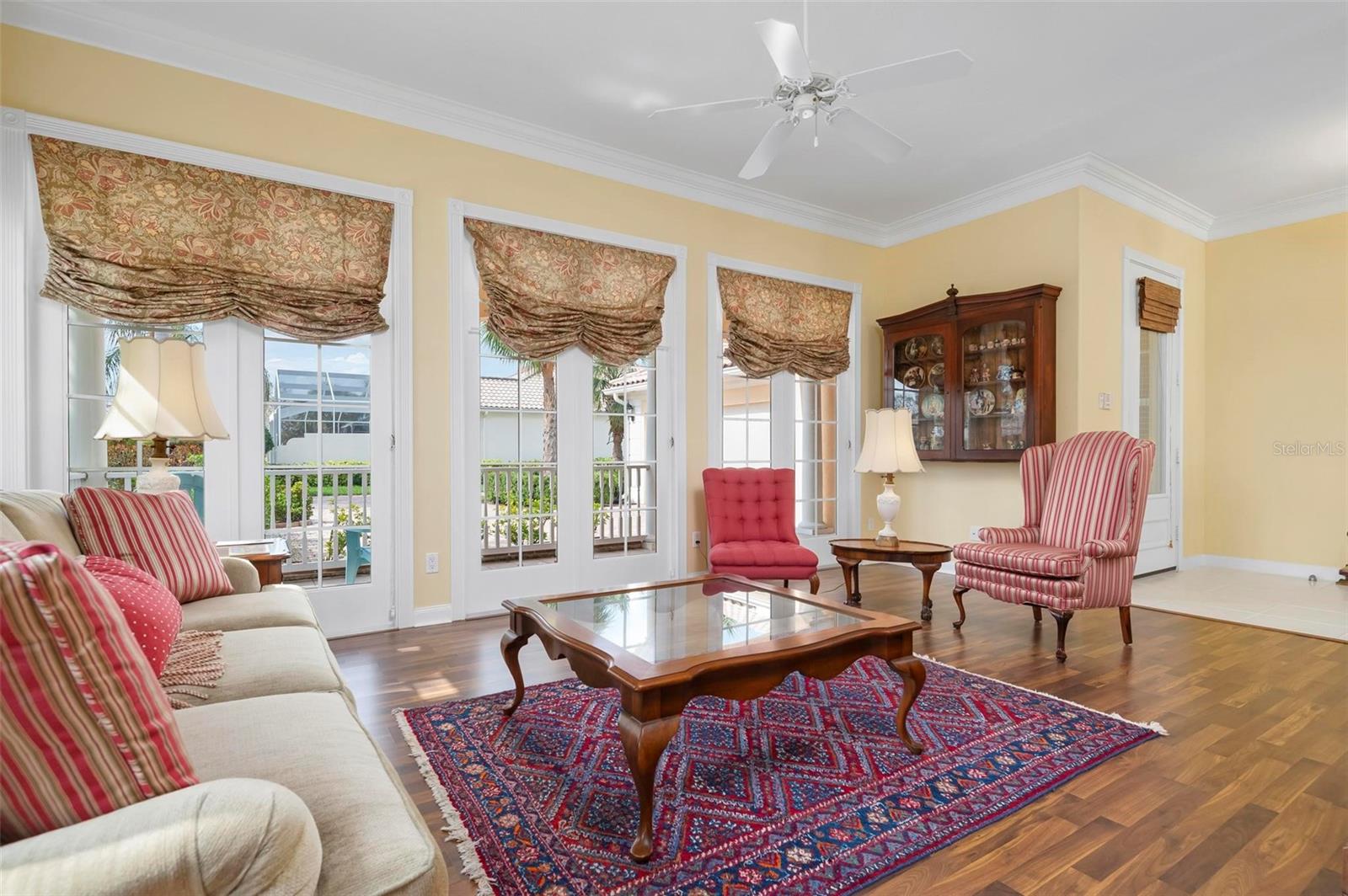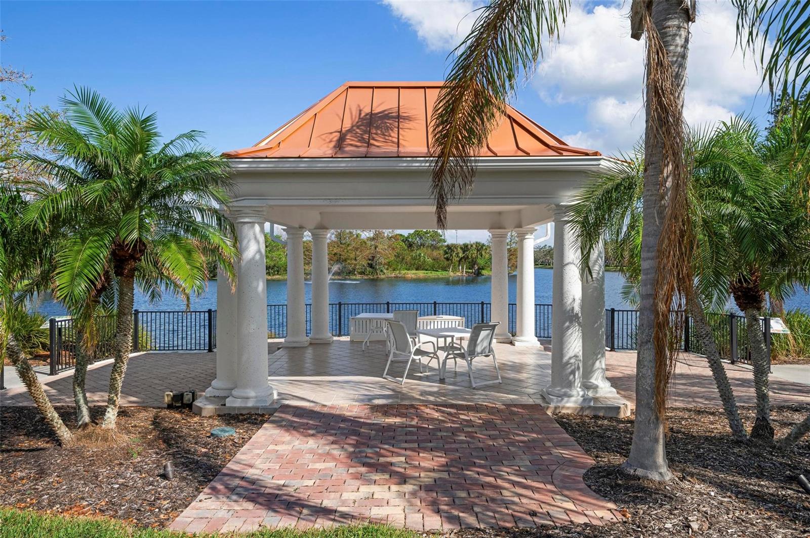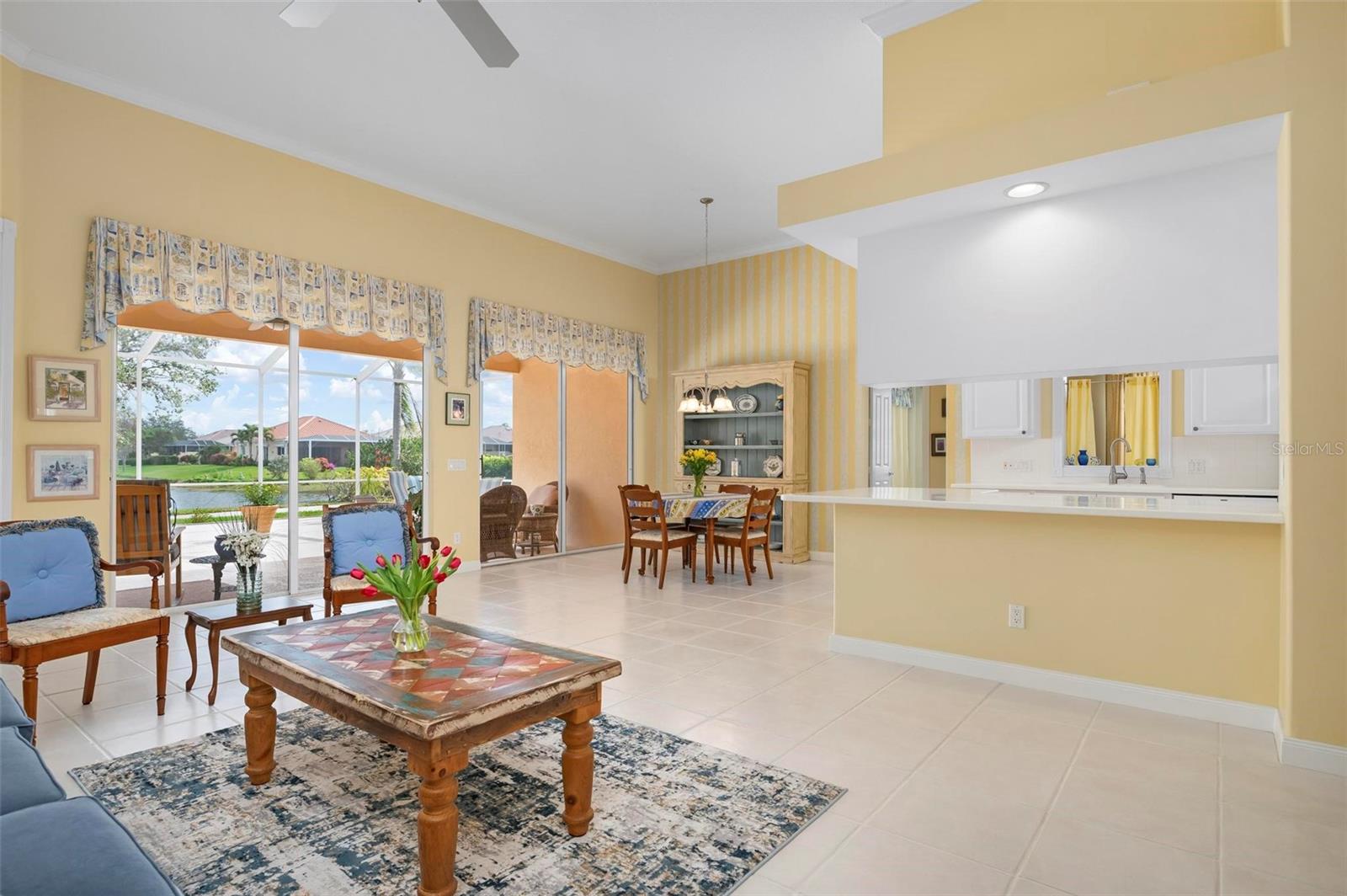 Welcome to your dream home nestled on one of the most beautiful waterfront and, at nearly 10,000 square feet, one of the largest lots in the luxury resort style living of Village Walk. As you pull up to the home, you're greeted by the large gorgeous Southern-style porch and a tropical water view extending along the entire stretch of the side property and beyond. This property’s breathtaking views offer peace and tranquility. This rare corner property is a private oasis. Situated facing East-West, you will be amazed by the sunrises over the lake in the morning and stunned by colorful sunsets off the porch in the evening – majestic bookends to your day to be capped off by clear views of luminous moons. Enjoy fantastic vistas of the serene water, elegant bridges, and the beautifully landscaped gardens from every room, creating an ever-changing backdrop of nature’s beauty, including the diverse bird life. As you step inside this meticulously maintained home, your eye is immediately drawn to the bright and open floor plan and the wide and long lake view. Large windows complimented by designer window treatments, tasteful custom built-ins, and crown molding throughout, among other unique features, create a distinct architectural space that is at once light, sophisticated, comfortable and inviting. The home’s updates include warm engineered wood flooring in all the bedrooms, living room and dining room; a new HVAC (2023) with a heat pump and an upgraded corrosion package to ensure long-lasting efficiency, a new LG washer and dryer (2023), and brand new 55 gallon Rheem water heater with new expansion tank (2025). The next owner will benefit from transferable warranties. From the family room, step outside onto the cozy sitting area of the under hang and the expansive screened-in lanai with new screens secured with new hardware (2023), making this space perfect for outdoor entertaining, container gardening, and relaxation. The lanai offers unobstructed water views in multiple directions accented by colorful Florida native gardens and landscaping. Feel secure knowing Village Walk construction is poured concrete walls and built very solid, including roofs reinforced exceeding building codes. This vibrant gated community gives residents of all ages access to miles of scenic walking paths along picturesque lakes, a heated lap pool, and a lagoon pool for leisurely afternoons. The state-of-the-art fitness center, six Har-Tru lighted tennis courts, pickleball, bocce, and Town Center gathering spaces that host a robust activities calendar all offer ample recreational opportunities. Additional amenities include a gift shop, a café with a poolside tiki bar, a hair salon, a gas station, and so much more. Come discover why this home and the Village Walk community, are truly special!