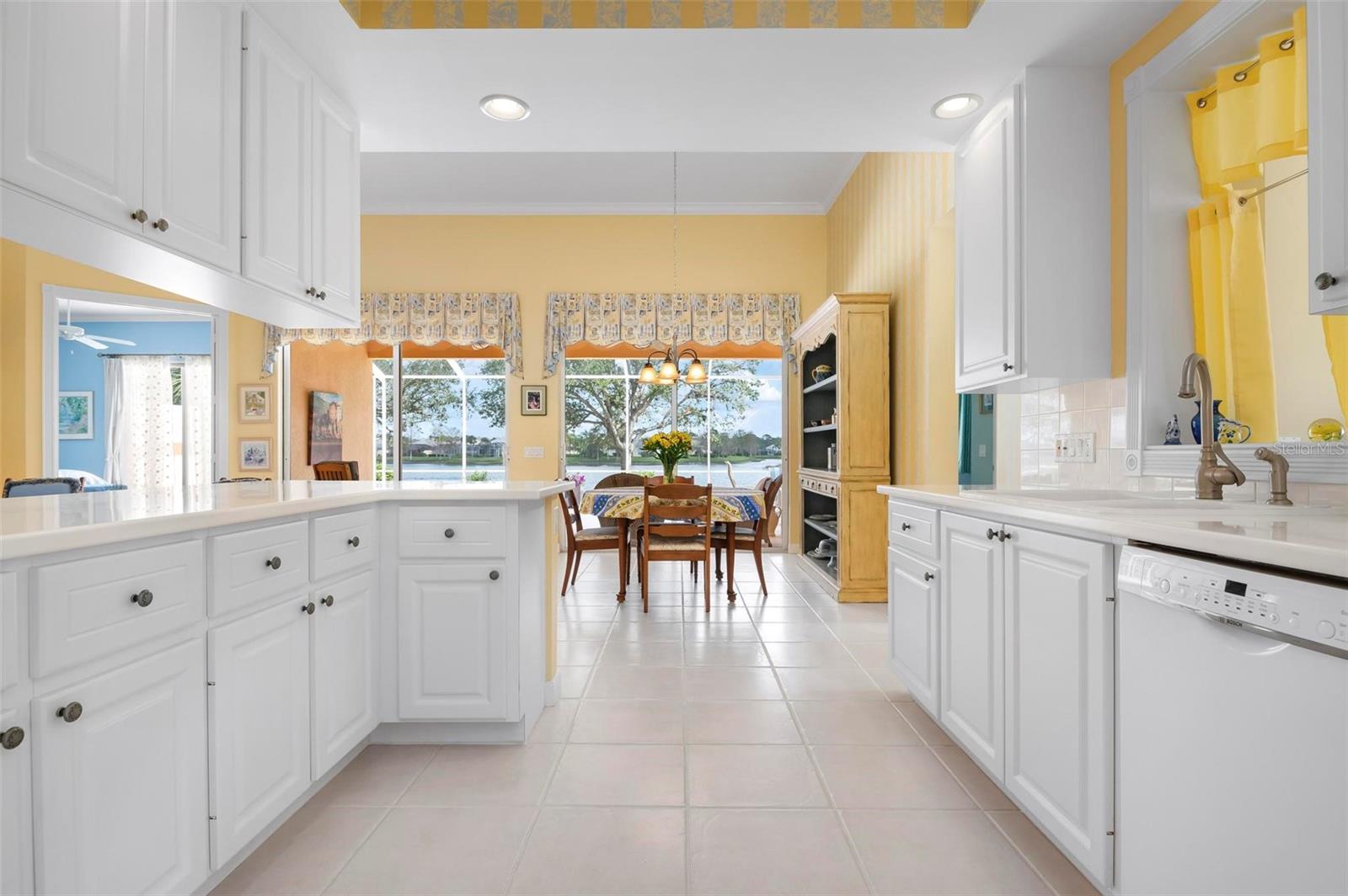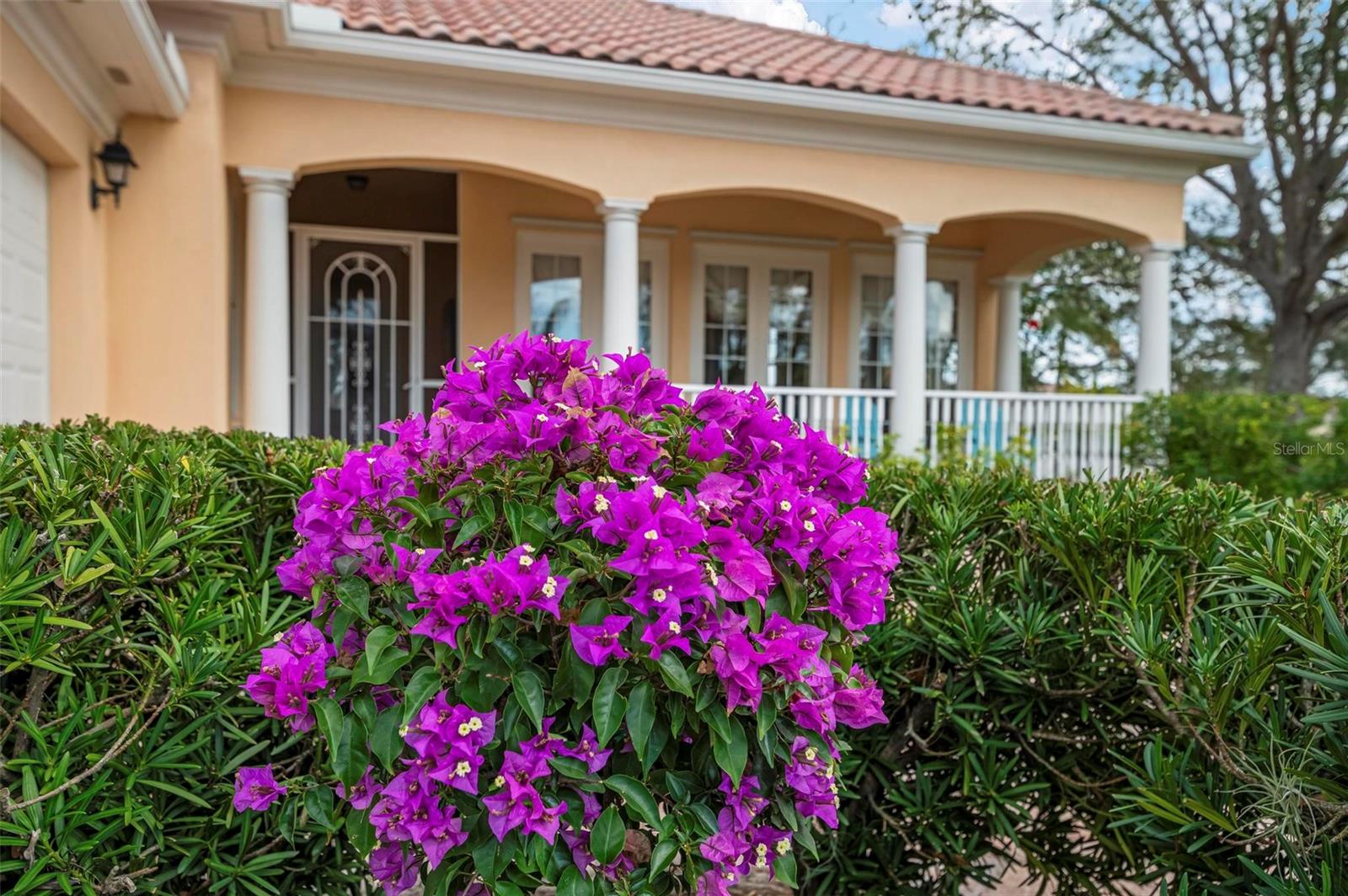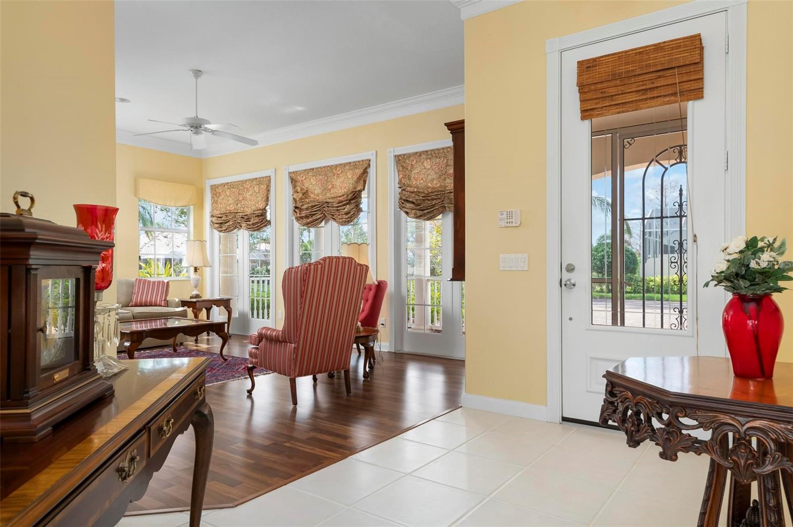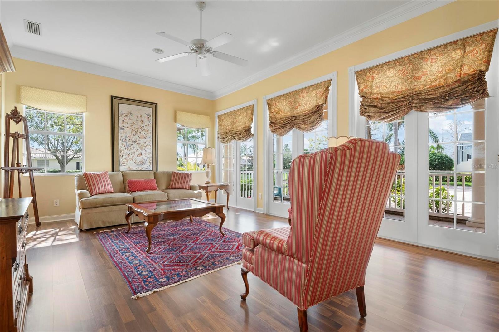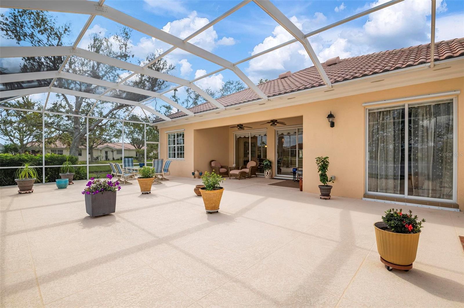 Welcome to your dream home nestled on one of the most beautiful waterfront and, at nearly 10,000 square feet, one of the largest lots in the luxury resort style living of Village Walk. As you pull up to the home, you're greeted by the large gorgeous Southern-style porch and a tropical water view extending along the entire stretch of the side property and beyond. This property’s breathtaking views offer peace and tranquility. This rare corner property is a private oasis. Situated facing East-West, you will be amazed by the sunrises over the lake in the morning and stunned by colorful sunsets off the porch in the evening – majestic bookends to your day to be capped off by clear views of luminous moons. Enjoy fantastic vistas of the serene water, elegant bridges, and the beautifully landscaped gardens from every room, creating an ever-changing backdrop of nature’s beauty, including the diverse bird life. As you step inside this meticulously maintained home, your eye is immediately drawn to the bright and open floor plan and the wide and long lake view. Large windows complimented by designer window treatments, tasteful custom built-ins, and crown molding throughout, among other unique features, create a distinct architectural space that is at once light, sophisticated, comfortable and inviting. The home’s updates include warm engineered wood flooring in all the bedrooms, living room and dining room; a new HVAC (2023) with a heat pump and an upgraded corrosion package to ensure long-lasting efficiency, a new LG washer and dryer (2023), and brand new 55 gallon Rheem water heater with new expansion tank (2025). The next owner will benefit from transferable warranties. From the family room, step outside onto the cozy sitting area of the under hang and the expansive screened-in lanai with new screens secured with new hardware (2023), making this space perfect for outdoor entertaining, container gardening, and relaxation. The lanai offers unobstructed water views in multiple directions accented by colorful Florida native gardens and landscaping. Feel secure knowing Village Walk construction is poured concrete walls and built very solid, including roofs reinforced exceeding building codes. This vibrant gated community gives residents of all ages access to miles of scenic walking paths along picturesque lakes, a heated lap pool, and a lagoon pool for leisurely afternoons. The state-of-the-art fitness center, six Har-Tru lighted tennis courts, pickleball, bocce, and Town Center gathering spaces that host a robust activities calendar all offer ample recreational opportunities. Additional amenities include a gift shop, a café with a poolside tiki bar, a hair salon, a gas station, and so much more. Come discover why this home and the Village Walk community, are truly special!