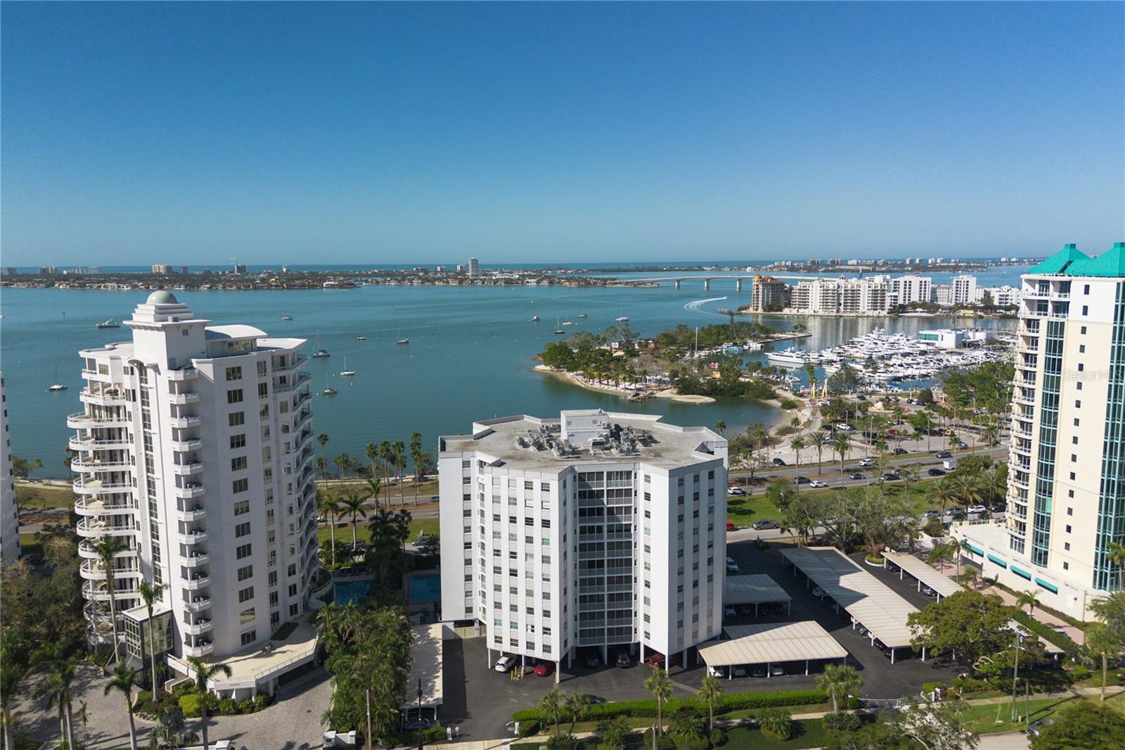 HUGE PRICE REDUCTION!!! Motivated Sellers *The best Priced Penthouse with Direct Bayfront View *Rare Opportunity to own a Downtown Sarasota Penthouse for under 1 million with Stunning, breathtaking full-bay views, two bedrooms/two baths, and a luxurious condo with a spacious great room floor plan. Natural light is throughout, and beautiful harbor views overlook the Bayfront, Marina Jack, and Big Pass to the Gulf of Mexico. Enjoy nightly sunsets. Wood flooring flows throughout all the rooms. Designer kitchen with stainless steel appliances, classic, rich wood cabinets, luxurious granite countertops, cooktop, and wall oven- a chef's delight. A designed electric fireplace and a large primary bedroom suite entice you to enjoy tranquil water views of the bay, including the Ringling Bridge. Gorgeous bathrooms. New washer and dryer. Additional storage closets are available for your convenience. PLEASE NOTE: Older condos are experiencing BUYERS' concerns about the maintenance costs of aging buildings. However, it's important to note that this building has undergone a thorough inspection and maintains reasonable reserves, making it a solid investment opportunity. Experience maintenance-free living with 24-hour concierge service, a heated pool, a club room, an exercise room, and a library. Enjoy the rich cultural amenities of our fabulous town: fine dining, galleries, shops, opera, theatre, Whole Foods, and Selby Gardens. Prime location with the marina across the street and just minutes over the bridge to St. Armand's world-famous shopping. It is a short drive to Siesta Key and Lido beaches. The Selby Gardens is within a short distance. Restaurants are nearby. Walk to Palm Avenue, visit famous art galleries and great restaurants, and enjoy one of the best Sarasota areas to work and live in.