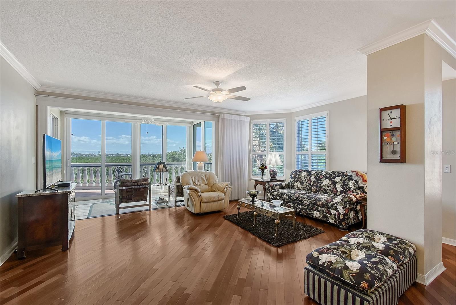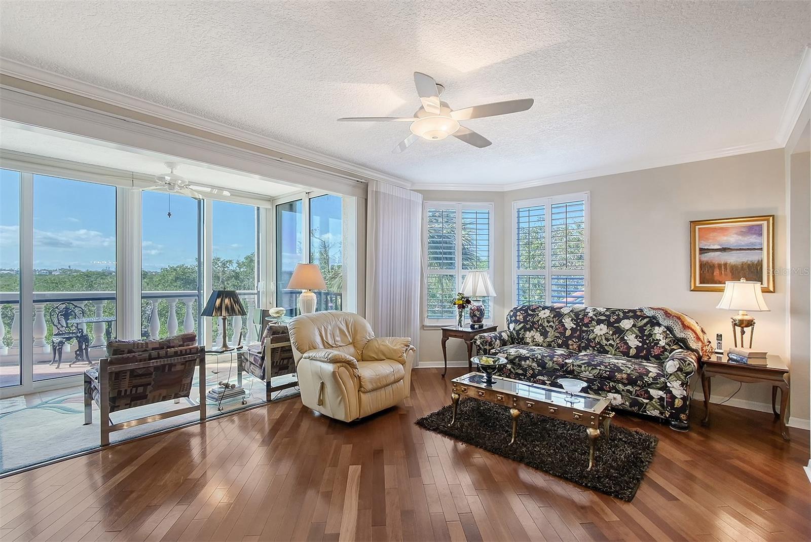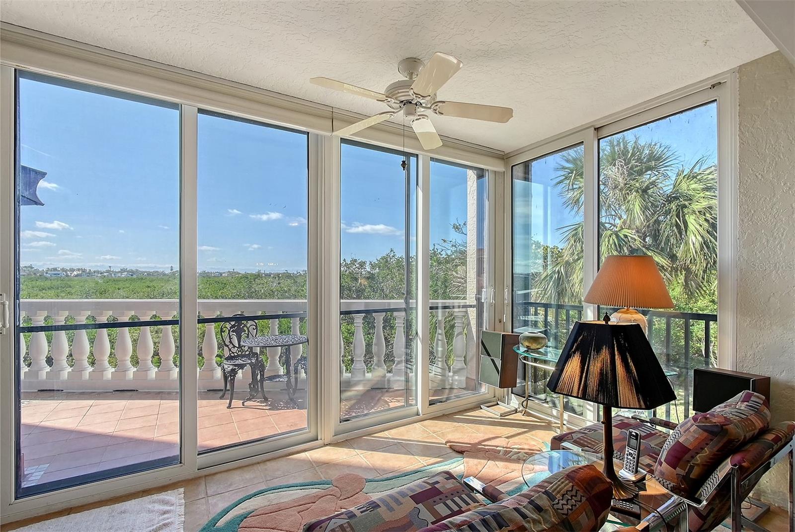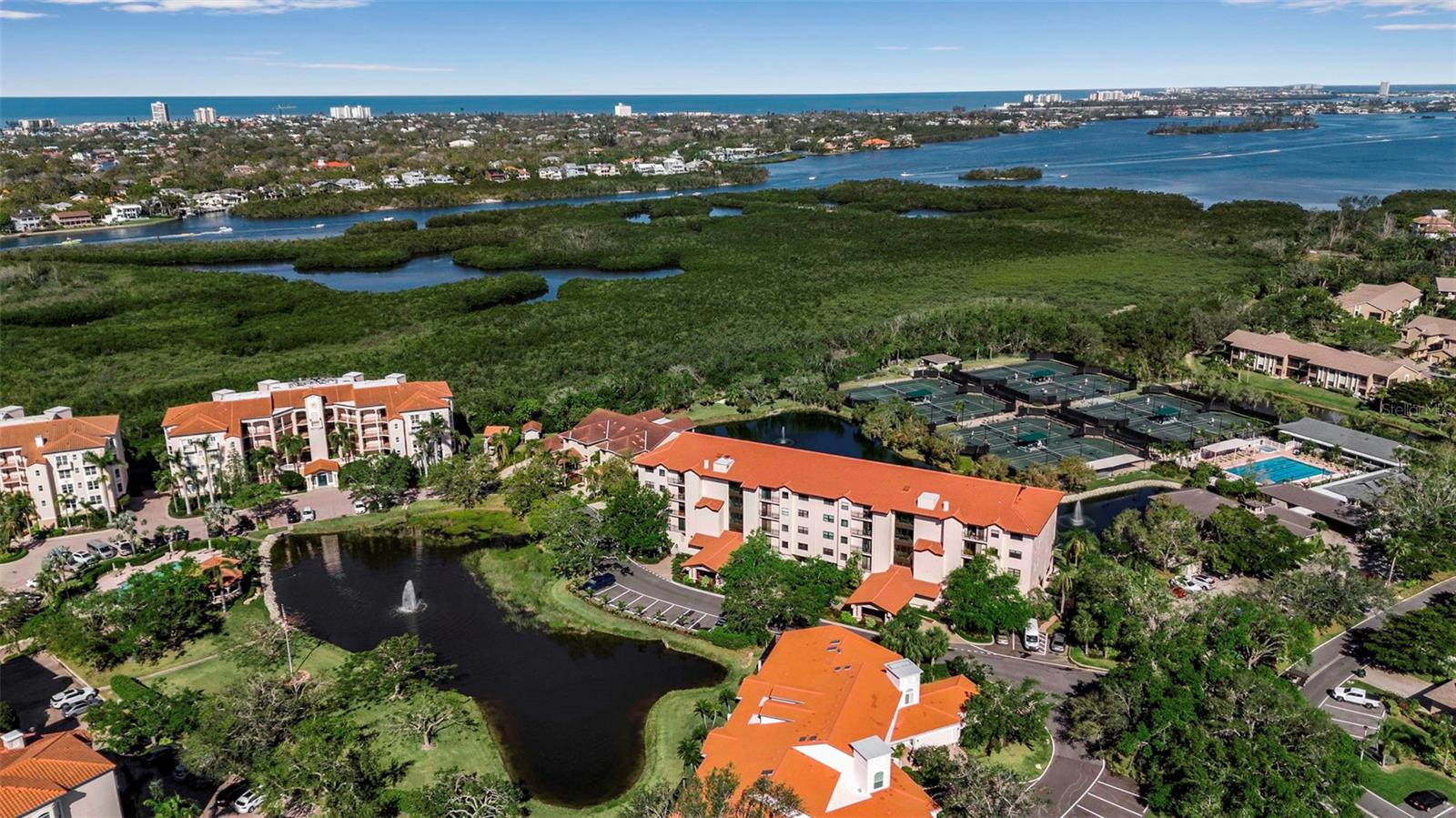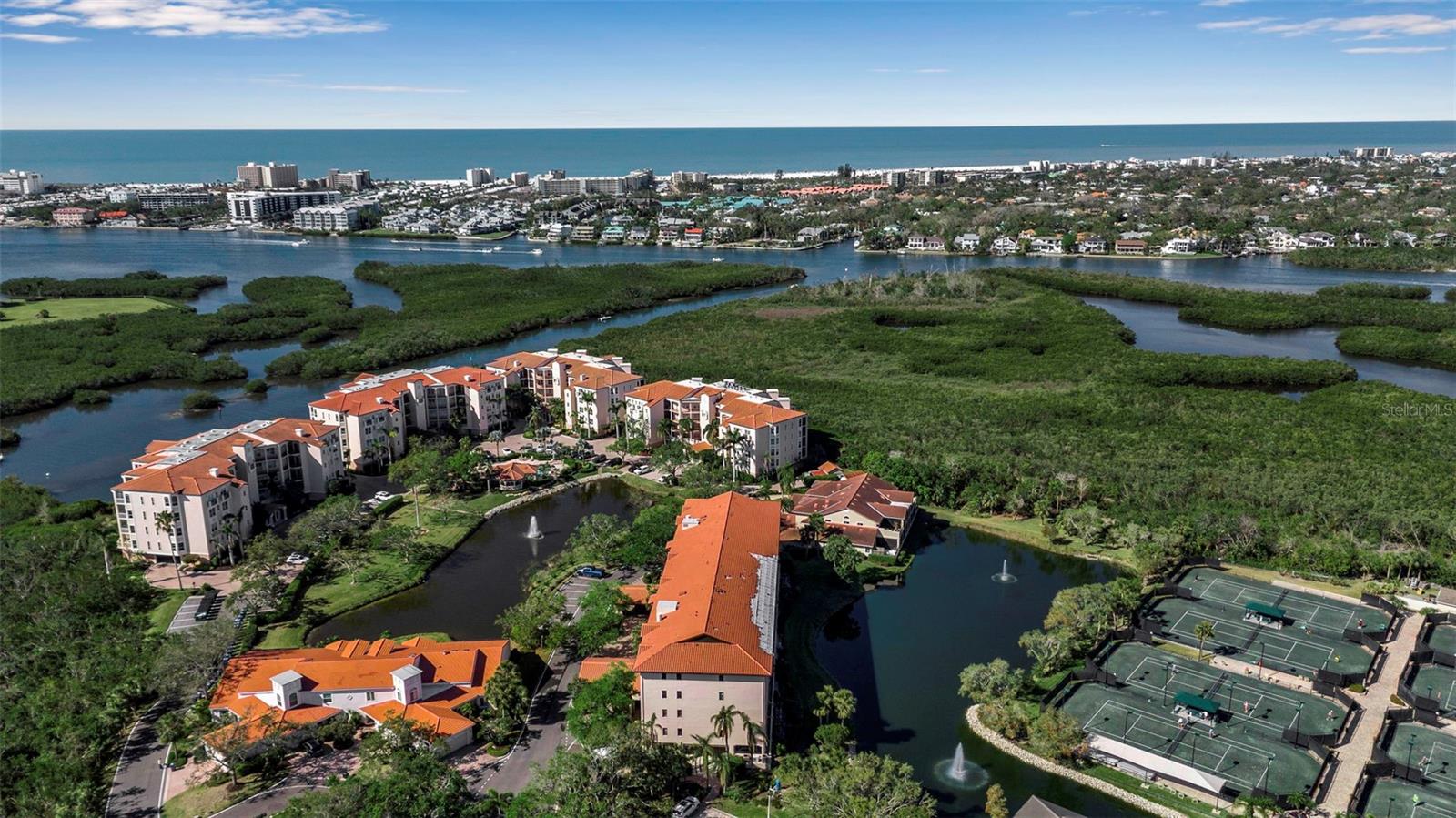 BEST PRICED 3 BR CONDO NEAR WATER! Enjoy gracious living in this 3 bedroom, 3 bath condo situated in the heart of Sarasota. Located in Eagles Point, within the gated community of The Landings, you will experience everyday living in comfort, while feeling like you are on vacation. As once you call this lovely unit home, you will be within minutes of Siesta Key and its World-Famous Beach, as well as Sarasota's vibrant Downtown. Enjoy all the shopping, dining, cultural and recreational options the area offers, or just stay home and enjoy this incredible condo and community. As you enter you will immediately be taken in by the expansive living areas. An end unit, the sun shines in from every direction filling the space with natural light. The warmth of the Brazilian cherry wood floors guides you from room to room, through the dining room, into the living room, and Florida room. The kitchen features newer cabinets and doorknobs, Italian tile countertops, a large granite island, ample storage, a walled pantry, a new stainless steel workstation sink, and a reverse osmosis water system with a warranty until February 2026. The dining room is spacious enough to accommodate large gatherings and the Swarovski chandelier adds a true touch of elegance. The expanded Florida room, with newer tile and hurricane sliders, provides over 2,000 square feet of living space. The balcony overlooks a natural mangrove habitat. This is the place to relax after a beautiful day take in one the Gulf Coast’s incredible sunsets. The main bedroom, also overlooking the natural habitat, has been recently painted in a soft, pastel shade. New Brazilian cherry wood floors have been added to the bedroom and the custom-designed main closet. The main bathroom features newer granite countertops, cabinets with new knobs, sinks and faucets, a new mirror with molding, an updated shower with a new shower head, grab bars, and doors, and a comfort-height toilet. The lighting fixtures have also been updated. Both guest rooms are generously sized. One guest room features views of the lake and plantation shutters, while the other, currently used as an office, also has lake views, new carpet, freshly painted, and plantation shutters. A lovely gallery with gallery lighting and ample wall space to display your favorite pieces welcomes you upon entering the home. Parking is under the building in a gated garage, and your deeded space and private storage room are near the secure lobby entrance. Want to enjoy resort living at home? Explore the grounds and everything it has to offer. Eagles Point has its own pool, and you can also enjoy access to all of the other community amenities, including the Landings Racquet Club featuring Har-Tru tennis courts, a pool, spa, sauna, and fitness center. There are walking paths that lead to the community gazebo on the bay where you can watch the boats and the birds, fish and relax. Don’t miss the opportunity to live, work and play in the middle of it all in sunny Sarasota!