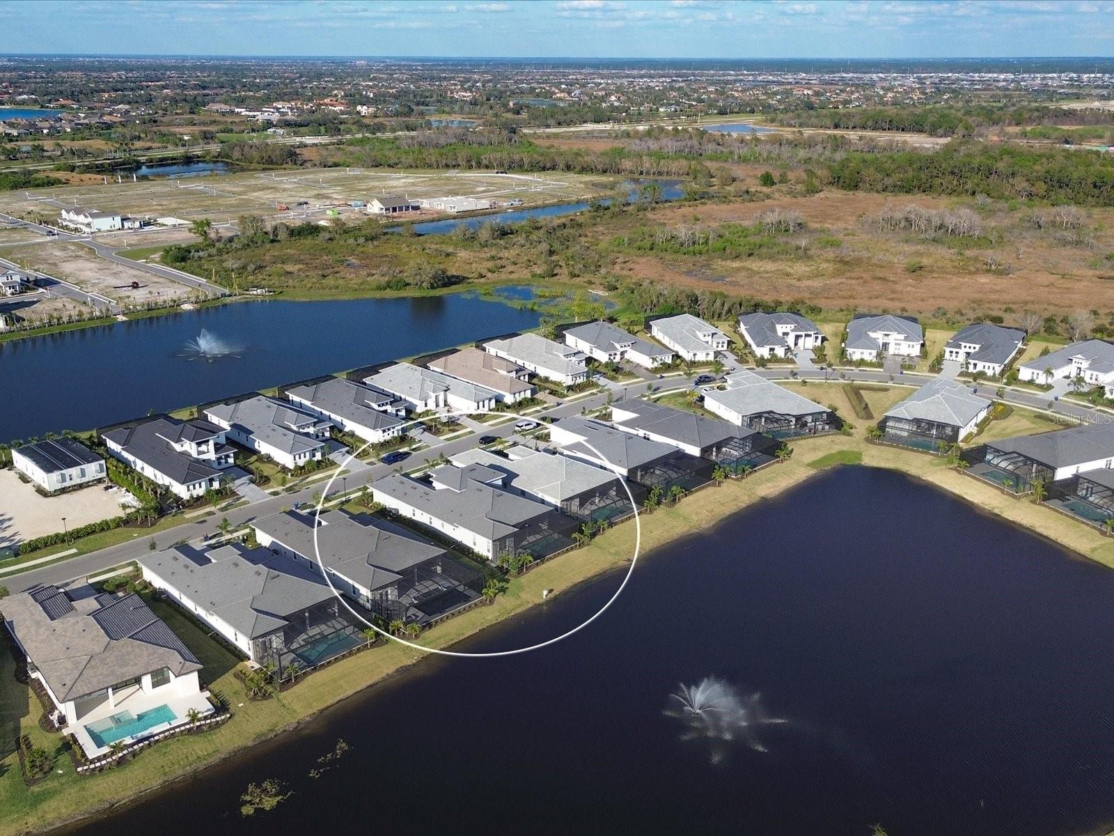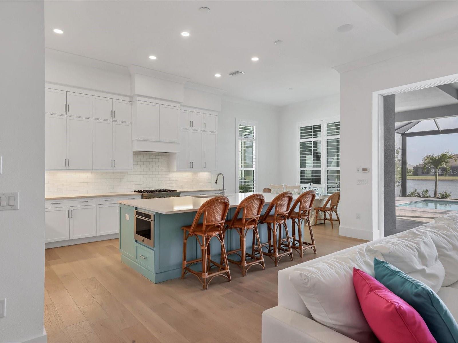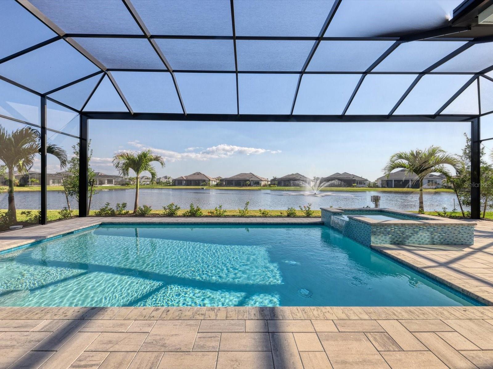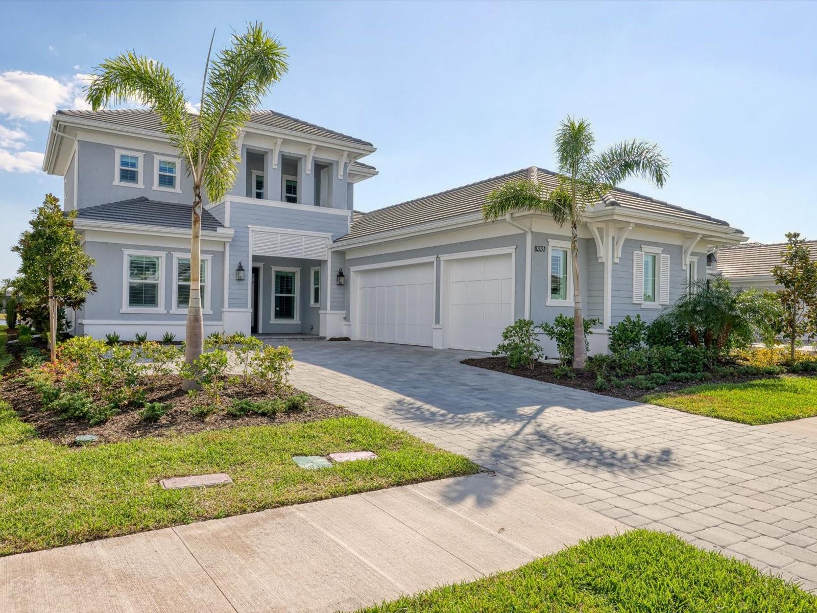 One or more photo(s) have been virtually staged. Experience Luxury Living with Breathtaking Water Views and Stunning Sunsets. Step into elegance with this custom-built, 5-bedroom, 4.5-bathroom masterpiece, perfectly designed for both comfort and sophistication. Nestled on a spacious 72’ lot, this Mayfield Grande III home offers a seamless blend of indoor and outdoor living, complete with a stunning water view that provides picturesque sunsets every evening. At the heart of the home, the gourmet kitchen boasts soft-close cabinetry, high-end Jenn-Air appliances, and an integrated refrigerator, ensuring a sleek and seamless aesthetic. The expansive 10-foot quartz island serves as the perfect gathering spot for entertaining, flowing effortlessly into the open-concept living space. Slide open the pocketing impact-resistant glass doors to reveal your private outdoor oasis, featuring a summer kitchen, saltwater pool and spa, and a panoramic screen overlooking the water—all designed for year-round enjoyment. The thoughtfully designed floor plan places the primary suite, three guest bedrooms, and a dedicated office on the first floor, while an additional guest suite, full bathroom, and loft provide privacy and flexibility upstairs. Elegant crown molding, soaring high ceilings, and premium finishes add to the home’s luxurious appeal. The three-car side-load garage, complete with epoxy flooring, offers ample space for vehicles and storage. Residents of Wild Blue enjoy an unmatched lifestyle, with access to an exclusive, resort-style clubhouse featuring concierge service, a theater, fitness studio, golf simulator, billiards, and an expansive pool complex with two resort-style swimming pools, a restaurant, and a patio bar. Outdoor enthusiasts will love the miles of scenic walking trails, a yoga lawn, and a putting green, while sports lovers can take advantage of the Midway Sports Complex with eight pickleball courts, six tennis courts, and a professional-grade pro shop. A dog park and playground add to the community’s appeal. For added convenience, maintenance-free living includes landscape maintenance and irrigation, allowing you to fully enjoy your home without the added stress. Located just minutes from Lakewood Ranch’s premier dining, shopping, and entertainment, this exceptional home offers the perfect blend of luxury, convenience, and an unbeatable lifestyle.