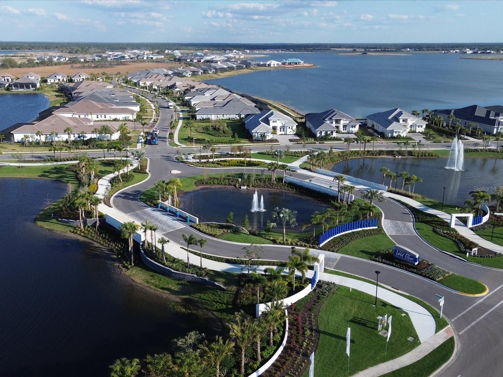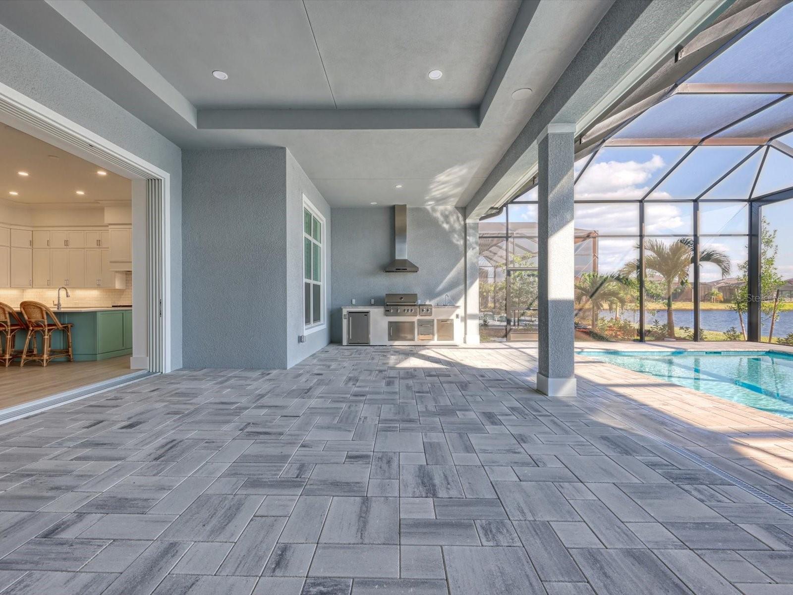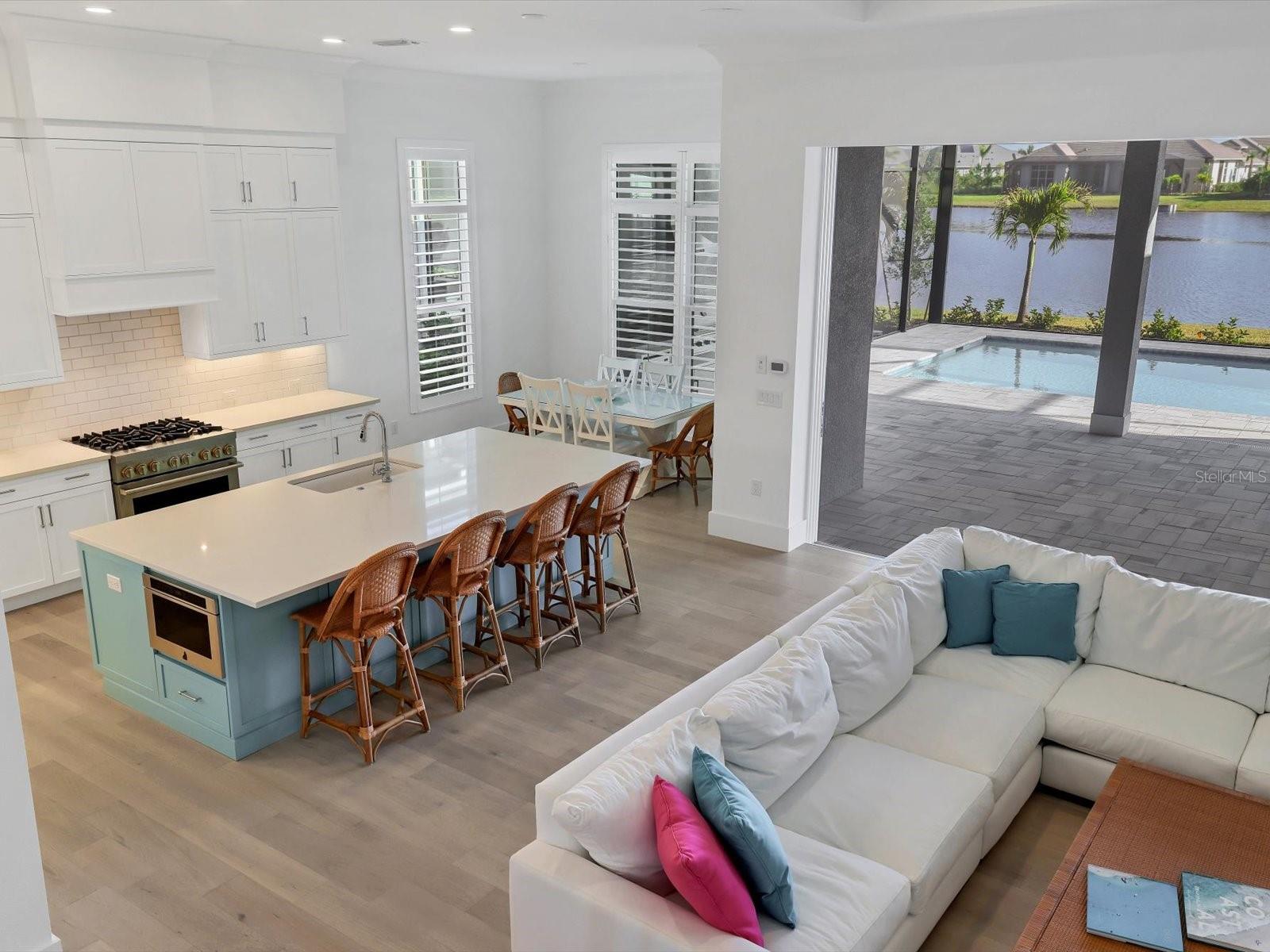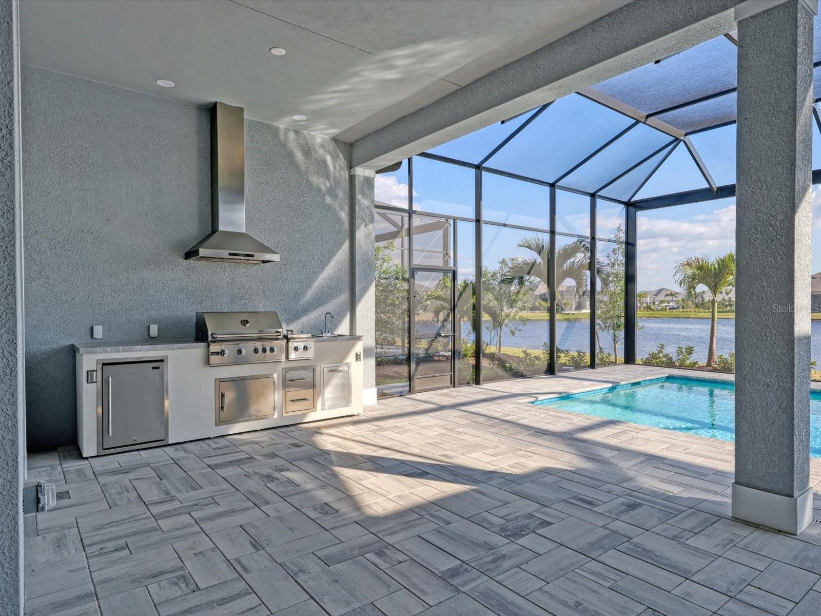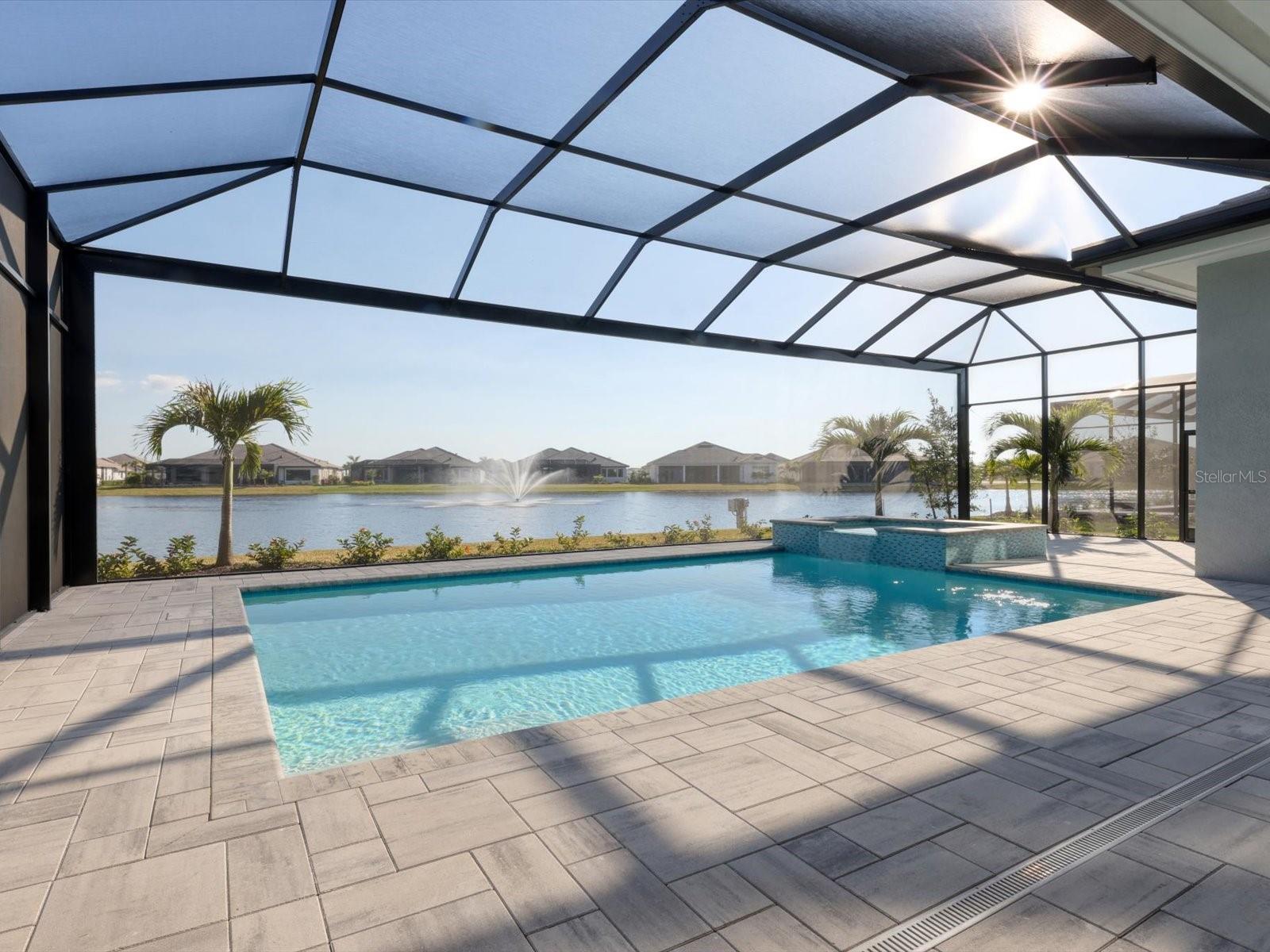 One or more photo(s) have been virtually staged. Experience Luxury Living with Breathtaking Water Views and Stunning Sunsets. Step into elegance with this custom-built, 5-bedroom, 4.5-bathroom masterpiece, perfectly designed for both comfort and sophistication. Nestled on a spacious 72’ lot, this Mayfield Grande III home offers a seamless blend of indoor and outdoor living, complete with a stunning water view that provides picturesque sunsets every evening. At the heart of the home, the gourmet kitchen boasts soft-close cabinetry, high-end Jenn-Air appliances, and an integrated refrigerator, ensuring a sleek and seamless aesthetic. The expansive 10-foot quartz island serves as the perfect gathering spot for entertaining, flowing effortlessly into the open-concept living space. Slide open the pocketing impact-resistant glass doors to reveal your private outdoor oasis, featuring a summer kitchen, saltwater pool and spa, and a panoramic screen overlooking the water—all designed for year-round enjoyment. The thoughtfully designed floor plan places the primary suite, three guest bedrooms, and a dedicated office on the first floor, while an additional guest suite, full bathroom, and loft provide privacy and flexibility upstairs. Elegant crown molding, soaring high ceilings, and premium finishes add to the home’s luxurious appeal. The three-car side-load garage, complete with epoxy flooring, offers ample space for vehicles and storage. Residents of Wild Blue enjoy an unmatched lifestyle, with access to an exclusive, resort-style clubhouse featuring concierge service, a theater, fitness studio, golf simulator, billiards, and an expansive pool complex with two resort-style swimming pools, a restaurant, and a patio bar. Outdoor enthusiasts will love the miles of scenic walking trails, a yoga lawn, and a putting green, while sports lovers can take advantage of the Midway Sports Complex with eight pickleball courts, six tennis courts, and a professional-grade pro shop. A dog park and playground add to the community’s appeal. For added convenience, maintenance-free living includes landscape maintenance and irrigation, allowing you to fully enjoy your home without the added stress. Located just minutes from Lakewood Ranch’s premier dining, shopping, and entertainment, this exceptional home offers the perfect blend of luxury, convenience, and an unbeatable lifestyle.