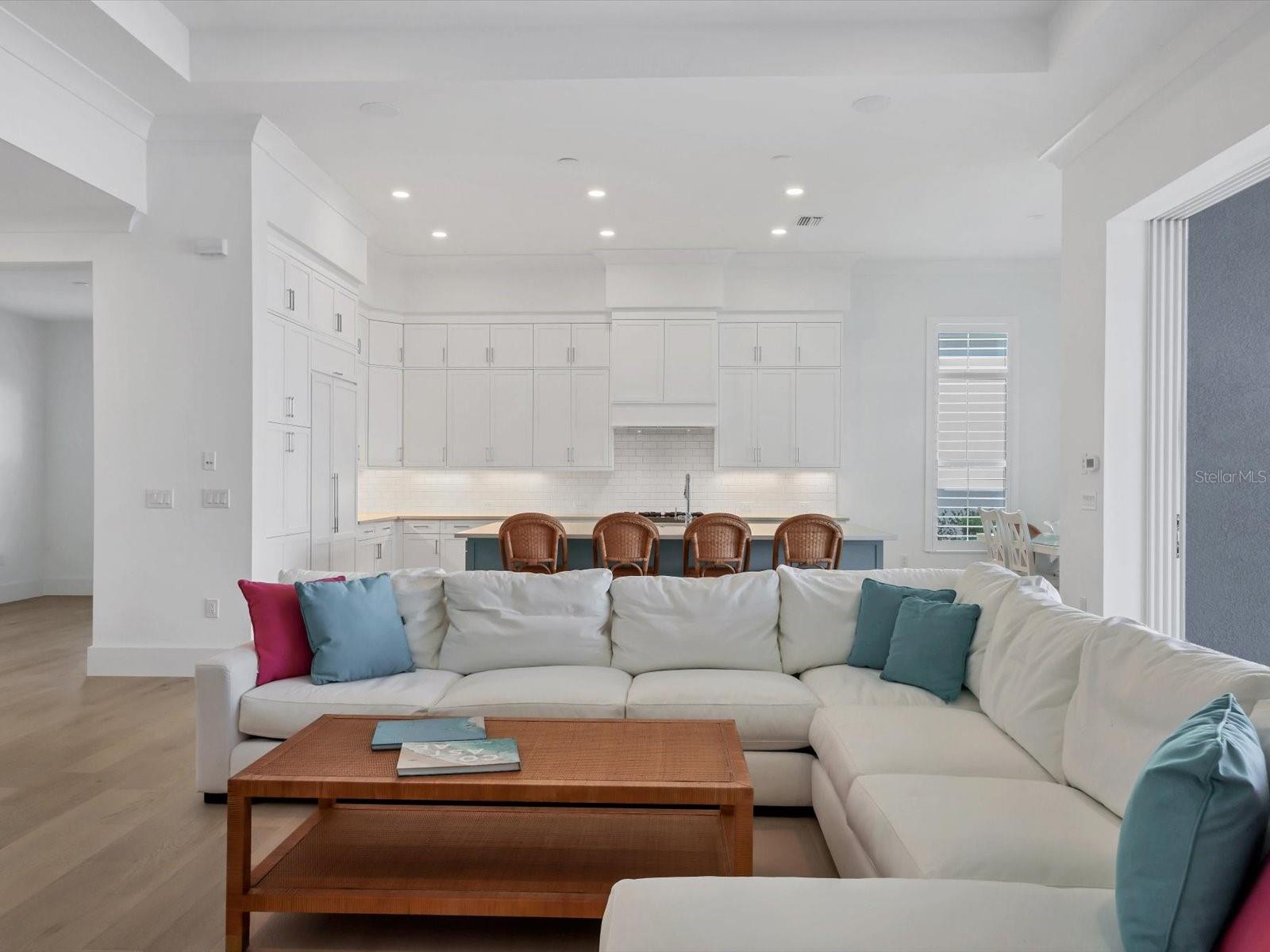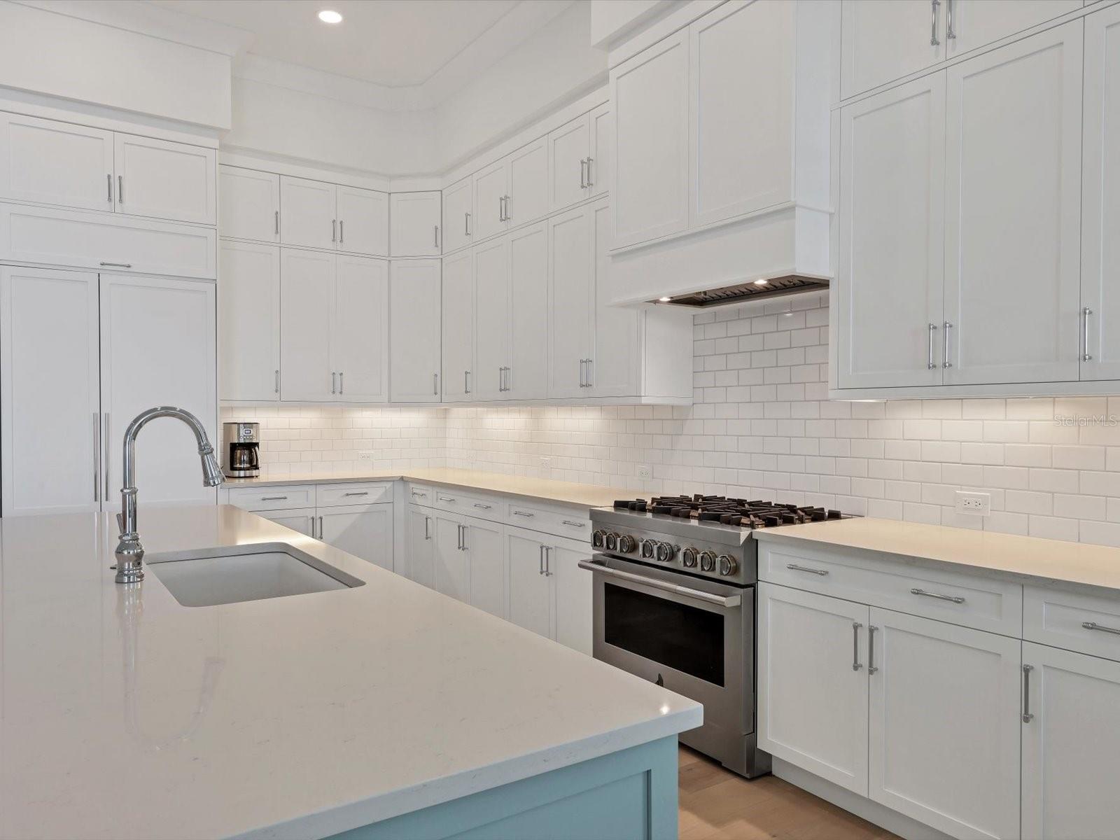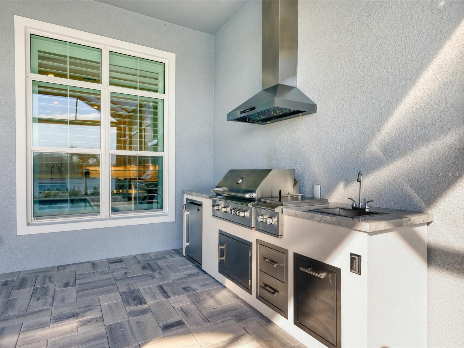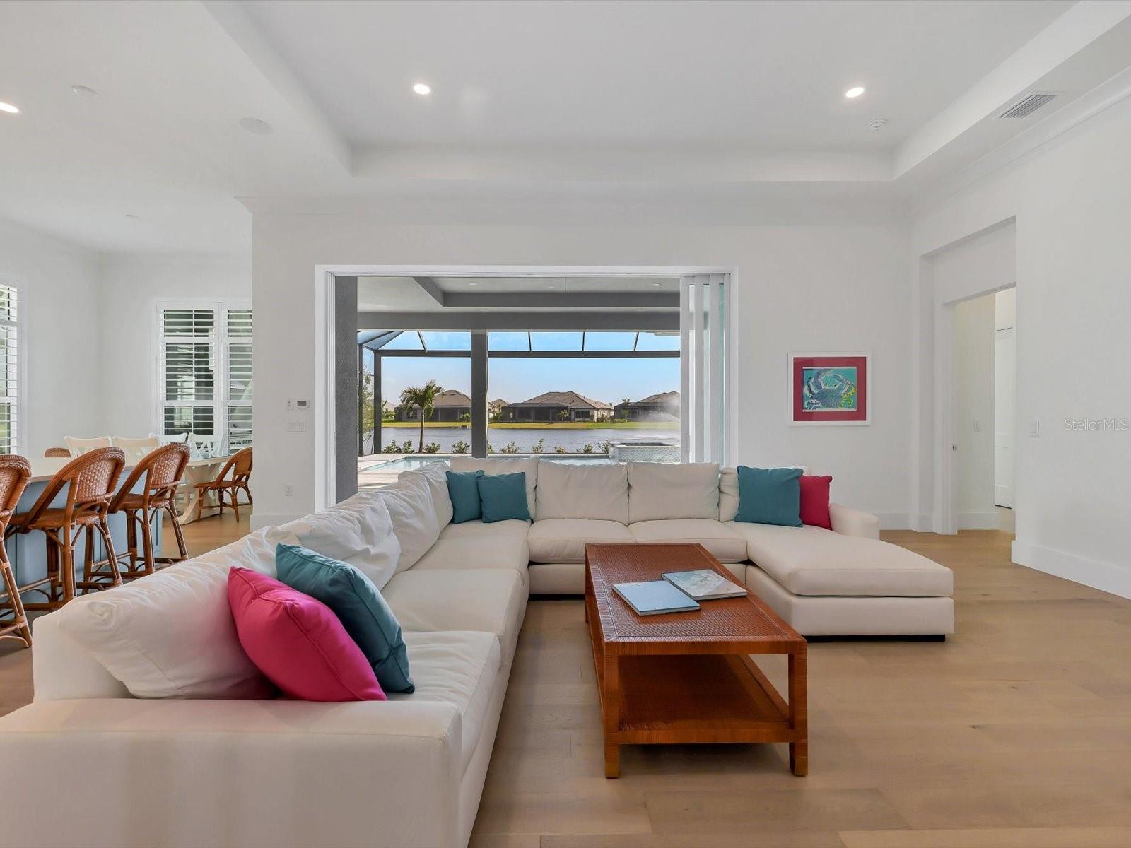 One or more photo(s) have been virtually staged. Experience Luxury Living with Breathtaking Water Views and Stunning Sunsets. Step into elegance with this custom-built, 5-bedroom, 4.5-bathroom masterpiece, perfectly designed for both comfort and sophistication. Nestled on a spacious 72’ lot, this Mayfield Grande III home offers a seamless blend of indoor and outdoor living, complete with a stunning water view that provides picturesque sunsets every evening. At the heart of the home, the gourmet kitchen boasts soft-close cabinetry, high-end Jenn-Air appliances, and an integrated refrigerator, ensuring a sleek and seamless aesthetic. The expansive 10-foot quartz island serves as the perfect gathering spot for entertaining, flowing effortlessly into the open-concept living space. Slide open the pocketing impact-resistant glass doors to reveal your private outdoor oasis, featuring a summer kitchen, saltwater pool and spa, and a panoramic screen overlooking the water—all designed for year-round enjoyment. The thoughtfully designed floor plan places the primary suite, three guest bedrooms, and a dedicated office on the first floor, while an additional guest suite, full bathroom, and loft provide privacy and flexibility upstairs. Elegant crown molding, soaring high ceilings, and premium finishes add to the home’s luxurious appeal. The three-car side-load garage, complete with epoxy flooring, offers ample space for vehicles and storage. Residents of Wild Blue enjoy an unmatched lifestyle, with access to an exclusive, resort-style clubhouse featuring concierge service, a theater, fitness studio, golf simulator, billiards, and an expansive pool complex with two resort-style swimming pools, a restaurant, and a patio bar. Outdoor enthusiasts will love the miles of scenic walking trails, a yoga lawn, and a putting green, while sports lovers can take advantage of the Midway Sports Complex with eight pickleball courts, six tennis courts, and a professional-grade pro shop. A dog park and playground add to the community’s appeal. For added convenience, maintenance-free living includes landscape maintenance and irrigation, allowing you to fully enjoy your home without the added stress. Located just minutes from Lakewood Ranch’s premier dining, shopping, and entertainment, this exceptional home offers the perfect blend of luxury, convenience, and an unbeatable lifestyle.
