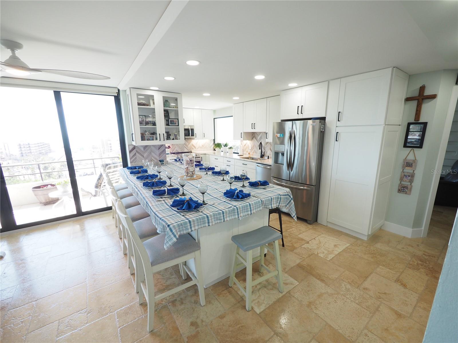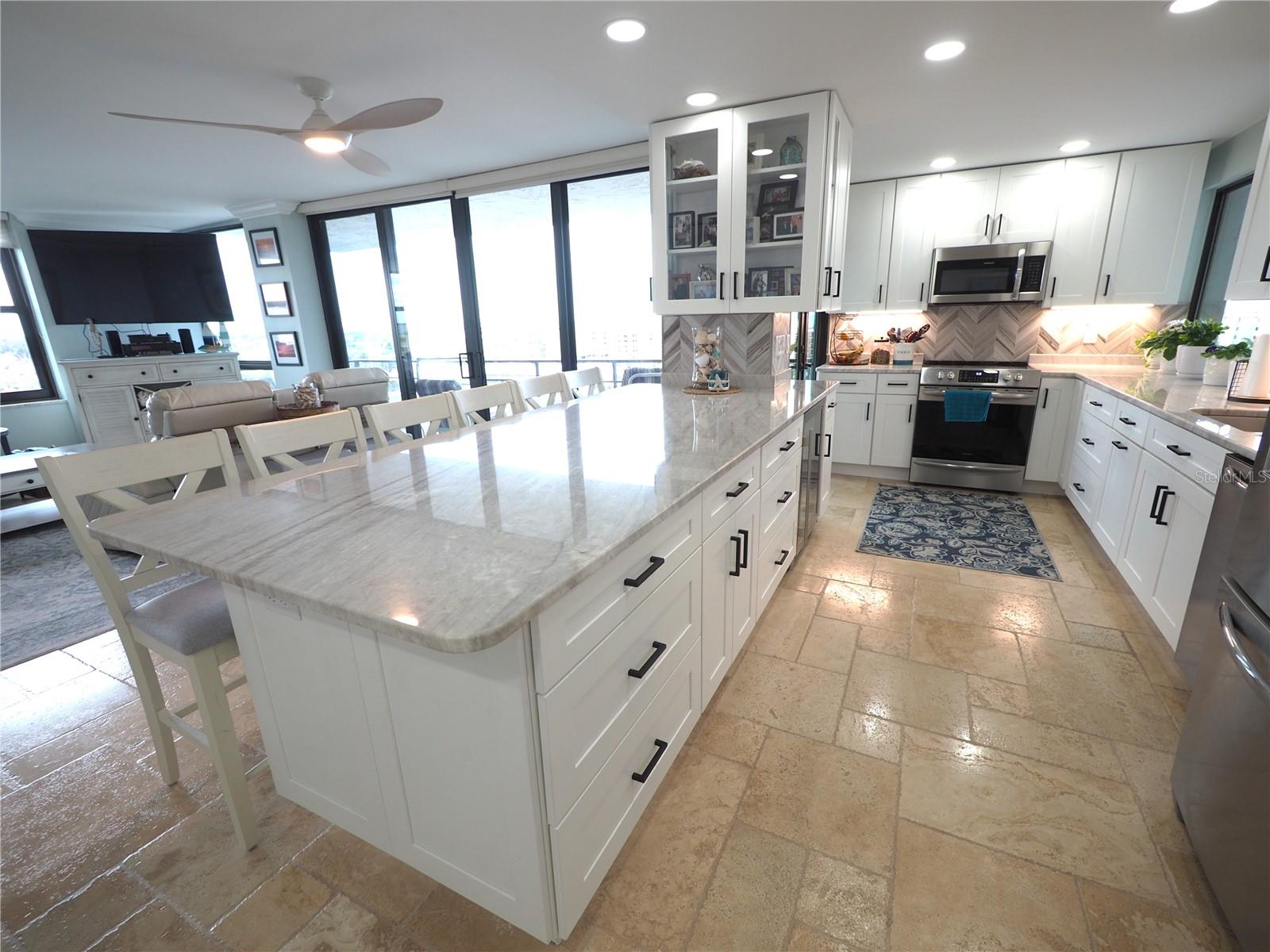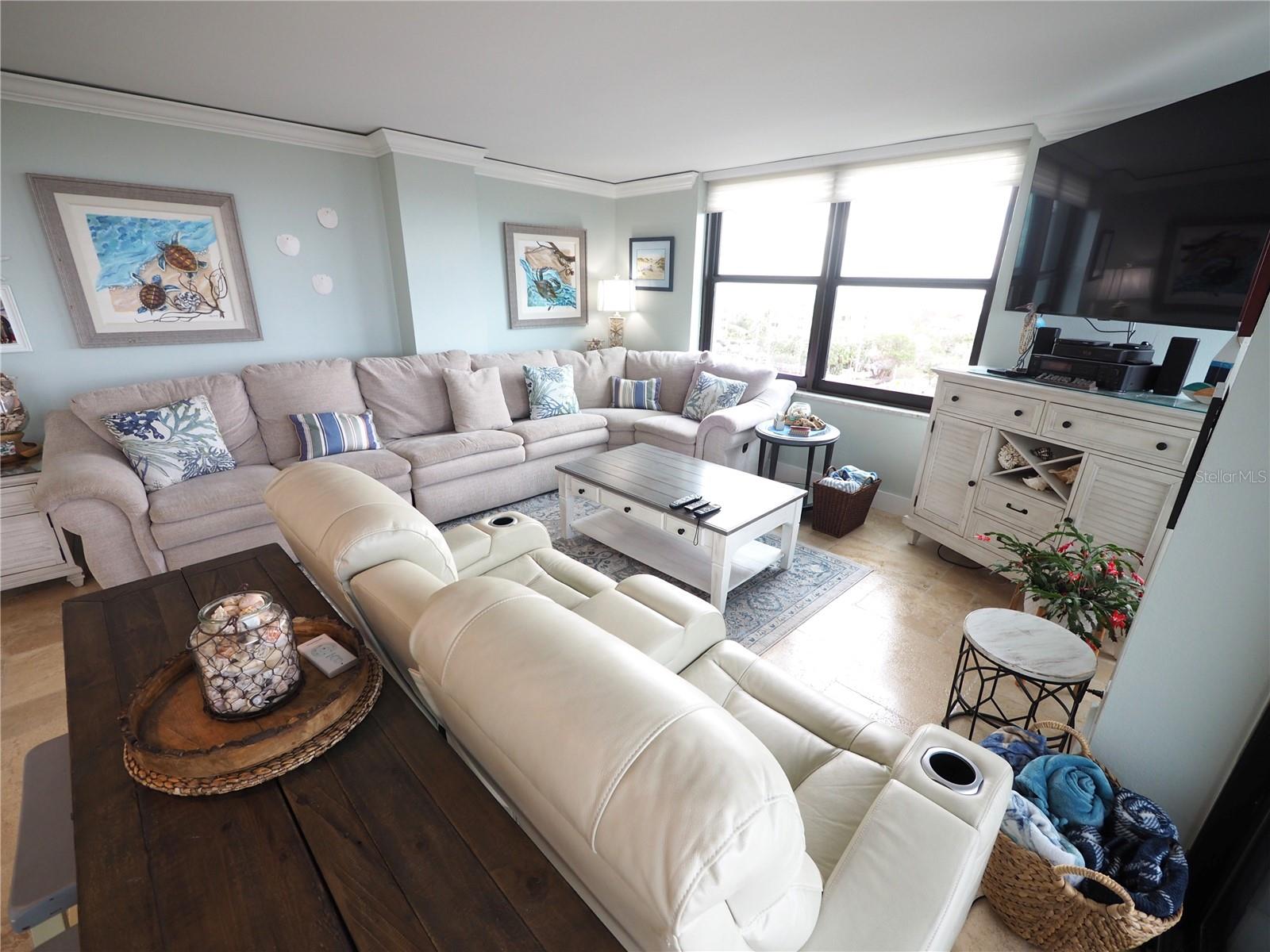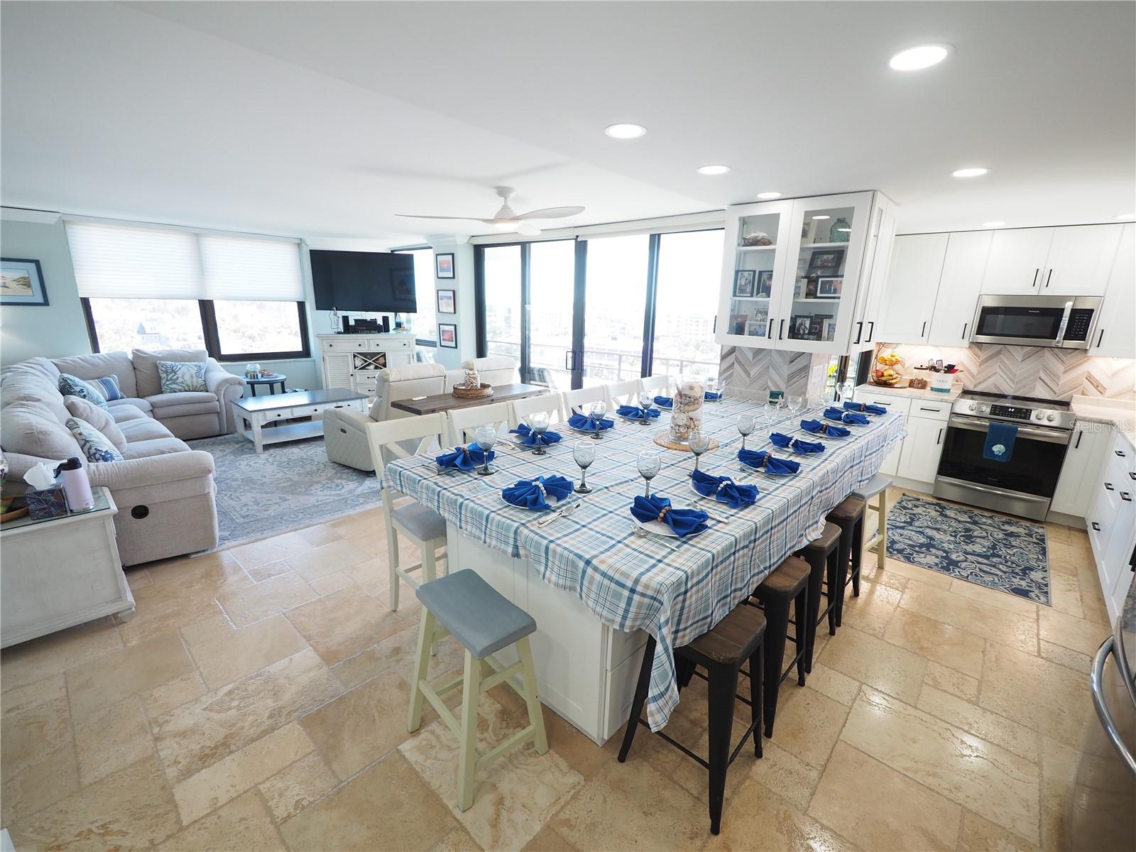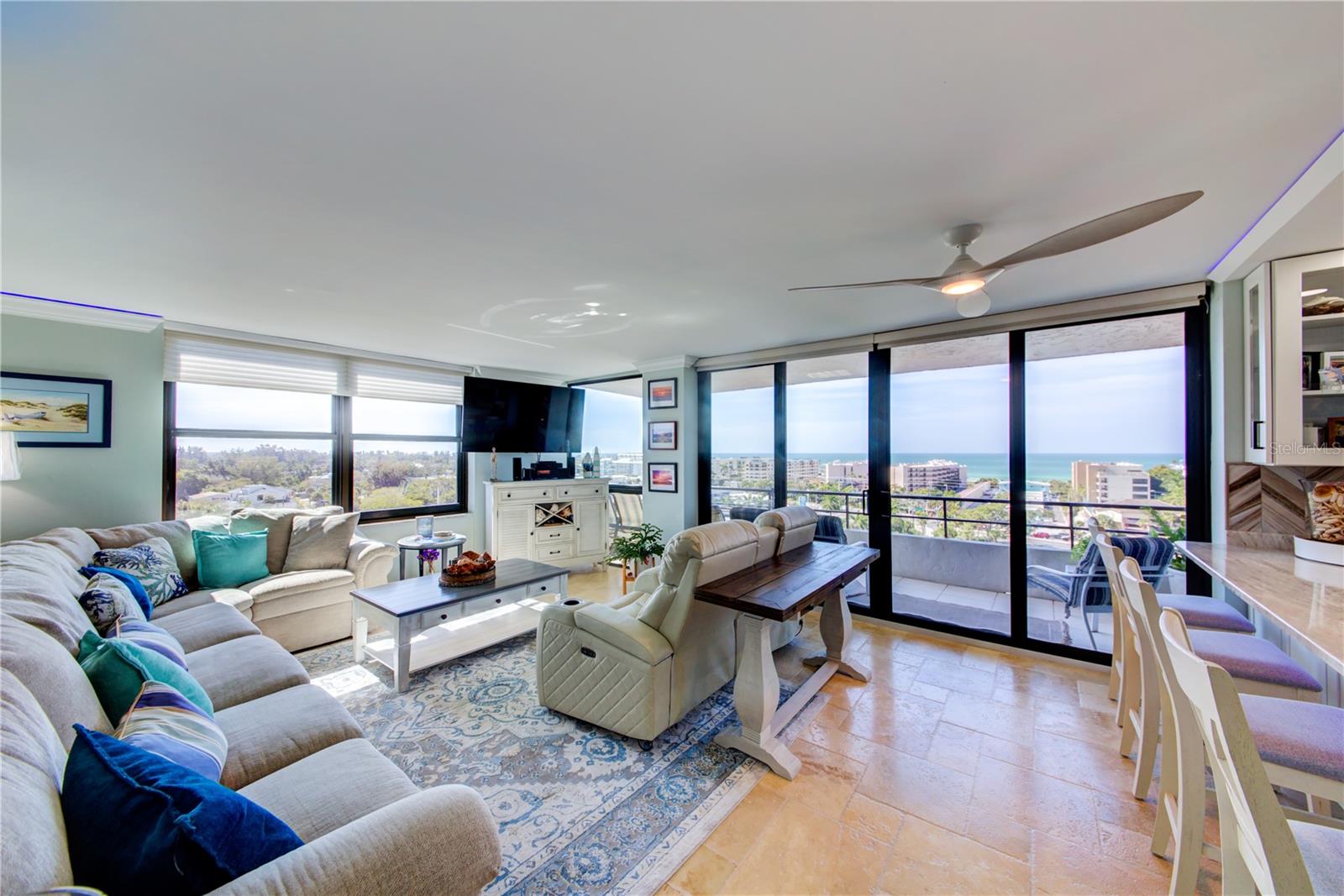 Luxurious Coastal Living at its Finest. - PRICE IMPROVEMENT OF $180,000 IN VALUE. Welcome to a lifestyle of unparalleled elegance in this impeccably renovated 9th-floor corner unit at Anchorage Yacht and Tennis on Siesta Key. Revel in the epitome of beachfront living, just steps away from the pristine crystal sands of Siesta Key with deeded beach access.The Anchorage offers a host of exclusive amenities, including ample parking for owners and guests. Comes with 1 carport. Option to purchase 1 tandem under-building parking spot. Free Boat Parking/Dock for owners and guests, Olympic-size pool, hot tub, sauna, tennis/pickle-ball courts, fitness center, BBQ area, and a park-like setting overlooking the intracoastal waterway. This stunning unit showcases meticulous attention to detail and design. Enjoy breathtaking Gulf water views and mesmerizing sunsets from all major rooms. The beautifully designed kitchen boasts endless storage space, new top-of-the-line appliances, and a striking 11-ft natural stone island that comfortably seats up to 12, seamlessly connecting to the spacious living area.The two well-appointed bedrooms and professionally designed bathrooms exude luxury, while three outdoor patios provide the perfect setting to soak in the coastal ambiance. The property is fortified with all-new hurricane impact windows and doors, ensuring both safety and tranquility. Distinctive features include travertine floors throughout, upgraded trim, illuminated crown molding, a large master walk-in shower stall, fresh neutral wall colors, and stowaway bunk beds (included) in the second bedroom. Selling turn-key with all furnishings and ready for personal occupancy or rentals. Every detail has been carefully curated to enhance the property's exceptional value. Strategically located off the Stickney Point Bridge, this residence is within close distance to the beach, renowned restaurants, shops, and an array of amenities. Whether you're looking for a coastal dream home or a prime investment for year-round vacation rentals, this property is a rare gem. Don't miss the opportunity to experience true luxury living – book your viewing now and make this coastal haven your own. Move right in and embrace the Siesta Key lifestyle or capitalize on its potential for lucrative year-round vacation rentals. HOA fee currently includes $250 funding for "fire and safety/sprinklers" upgrade project.