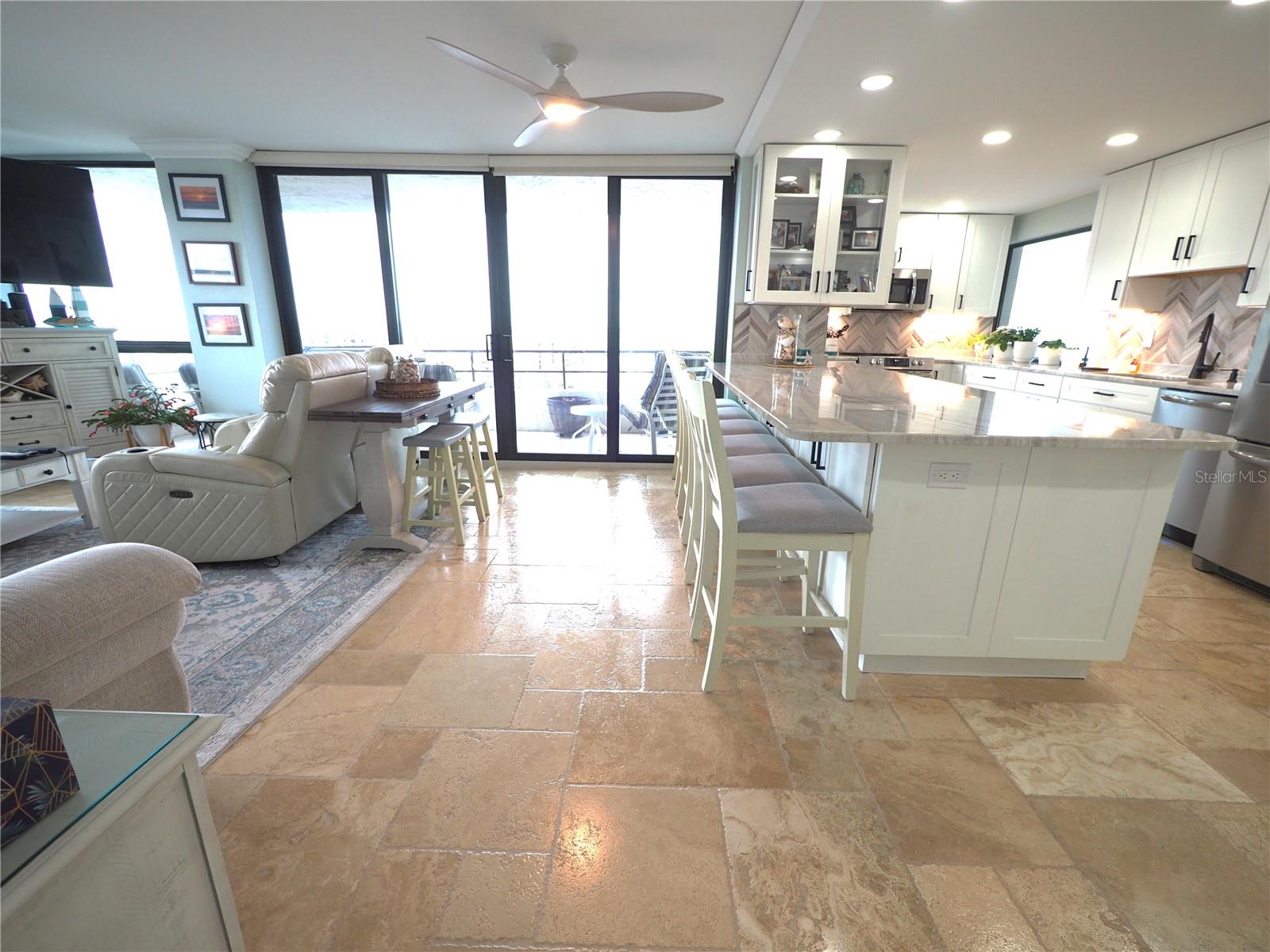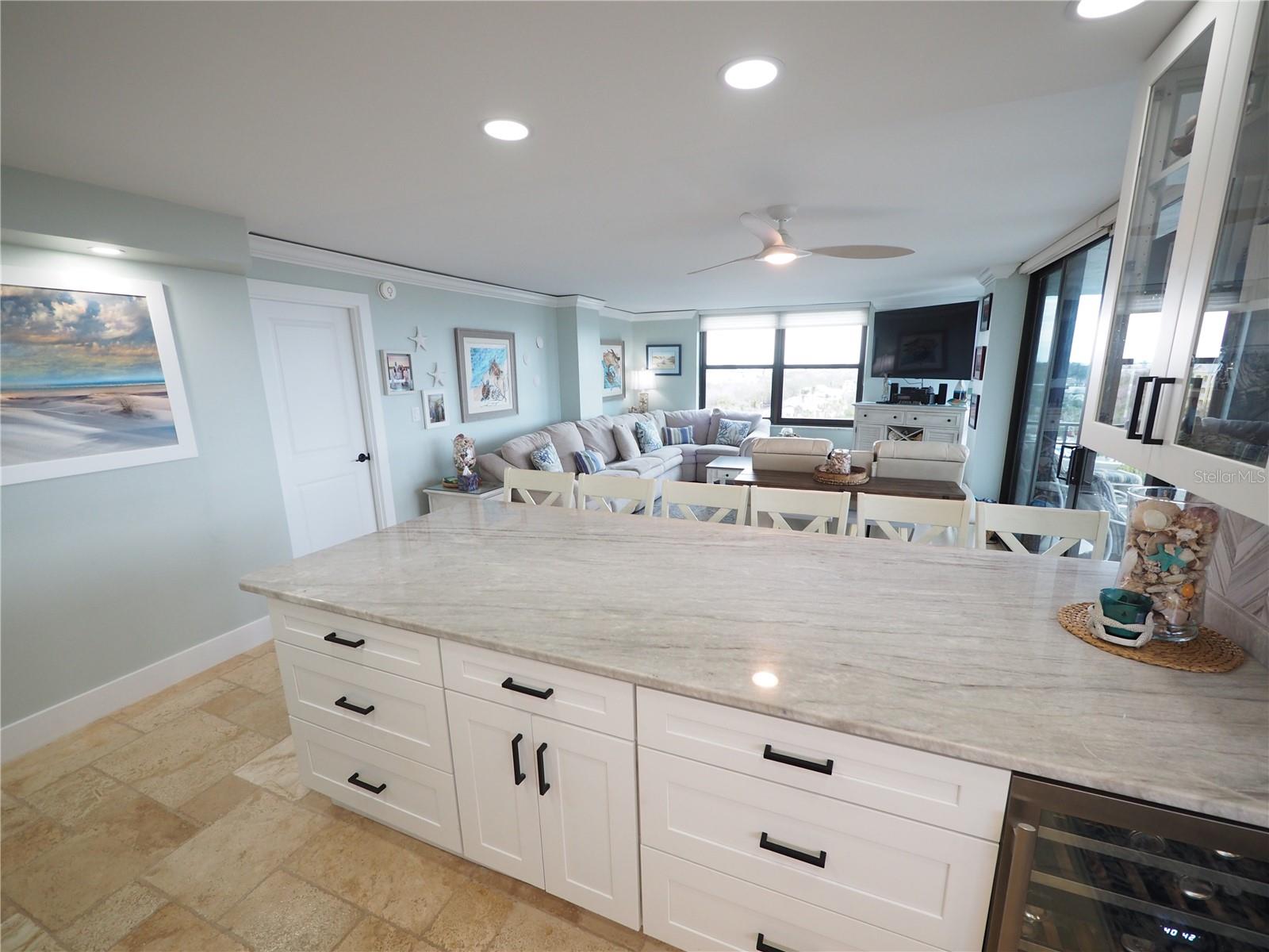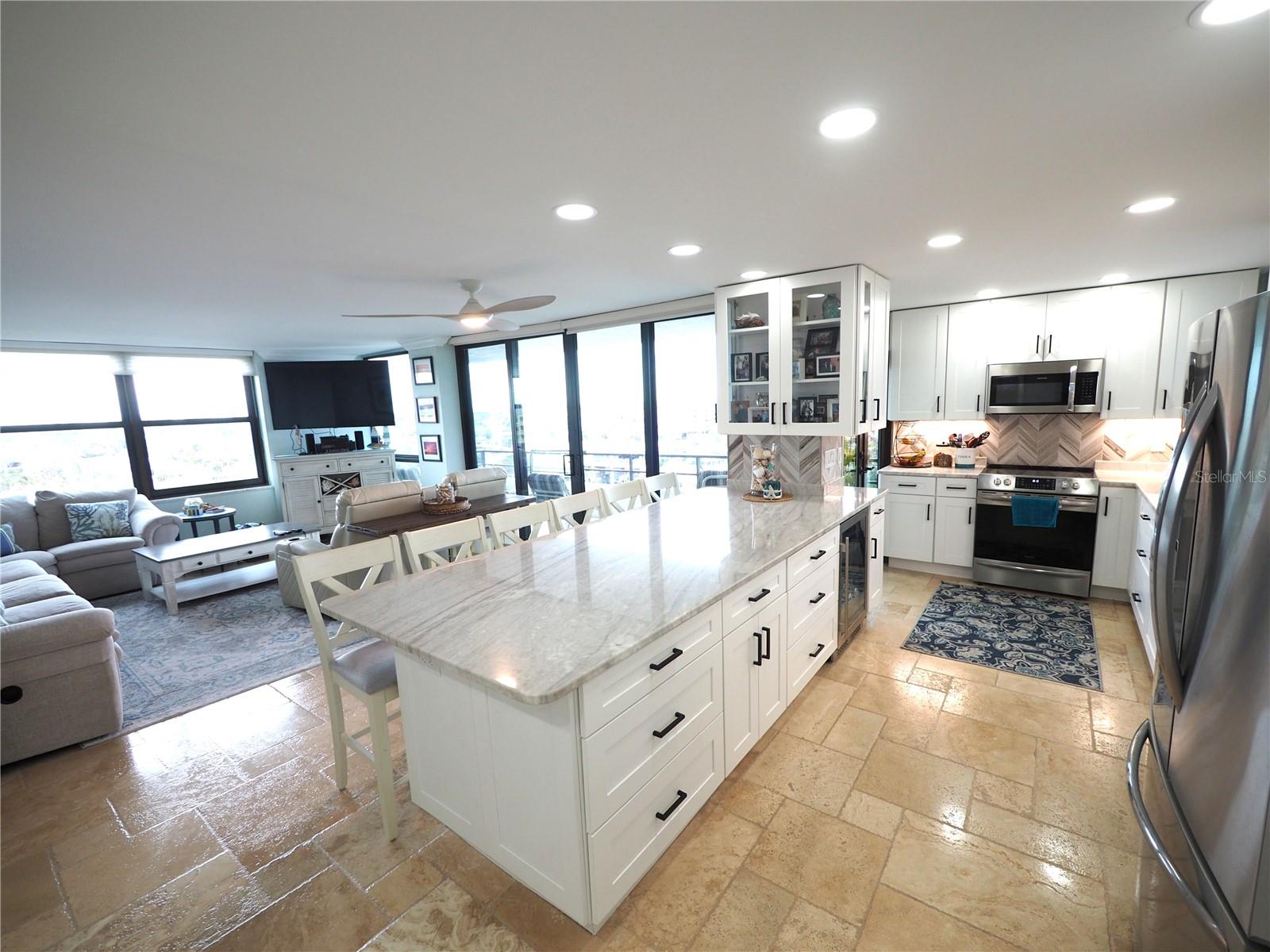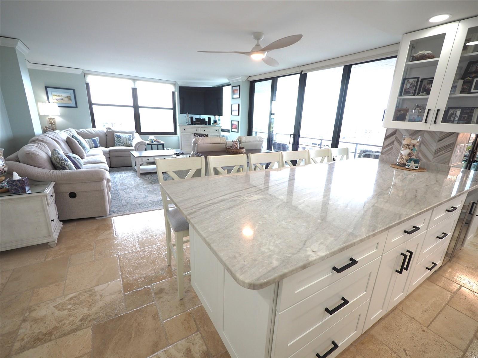 Luxurious Coastal Living at its Finest. - PRICE IMPROVEMENT OF $180,000 IN VALUE. Welcome to a lifestyle of unparalleled elegance in this impeccably renovated 9th-floor corner unit at Anchorage Yacht and Tennis on Siesta Key. Revel in the epitome of beachfront living, just steps away from the pristine crystal sands of Siesta Key with deeded beach access.The Anchorage offers a host of exclusive amenities, including ample parking for owners and guests. Comes with 1 carport. Option to purchase 1 tandem under-building parking spot. Free Boat Parking/Dock for owners and guests, Olympic-size pool, hot tub, sauna, tennis/pickle-ball courts, fitness center, BBQ area, and a park-like setting overlooking the intracoastal waterway. This stunning unit showcases meticulous attention to detail and design. Enjoy breathtaking Gulf water views and mesmerizing sunsets from all major rooms. The beautifully designed kitchen boasts endless storage space, new top-of-the-line appliances, and a striking 11-ft natural stone island that comfortably seats up to 12, seamlessly connecting to the spacious living area.The two well-appointed bedrooms and professionally designed bathrooms exude luxury, while three outdoor patios provide the perfect setting to soak in the coastal ambiance. The property is fortified with all-new hurricane impact windows and doors, ensuring both safety and tranquility. Distinctive features include travertine floors throughout, upgraded trim, illuminated crown molding, a large master walk-in shower stall, fresh neutral wall colors, and stowaway bunk beds (included) in the second bedroom. Selling turn-key with all furnishings and ready for personal occupancy or rentals. Every detail has been carefully curated to enhance the property's exceptional value. Strategically located off the Stickney Point Bridge, this residence is within close distance to the beach, renowned restaurants, shops, and an array of amenities. Whether you're looking for a coastal dream home or a prime investment for year-round vacation rentals, this property is a rare gem. Don't miss the opportunity to experience true luxury living – book your viewing now and make this coastal haven your own. Move right in and embrace the Siesta Key lifestyle or capitalize on its potential for lucrative year-round vacation rentals. HOA fee currently includes $250 funding for "fire and safety/sprinklers" upgrade project.