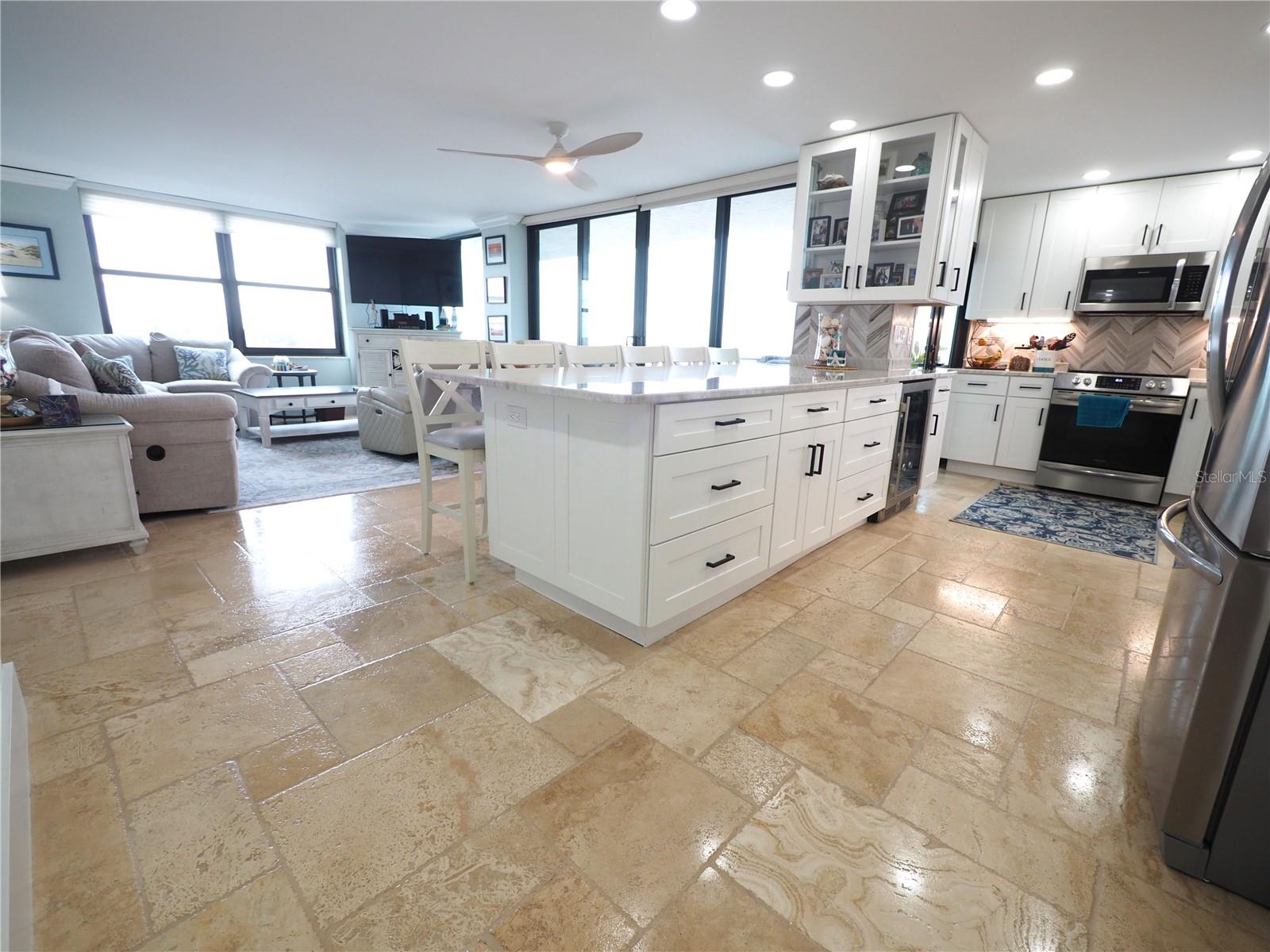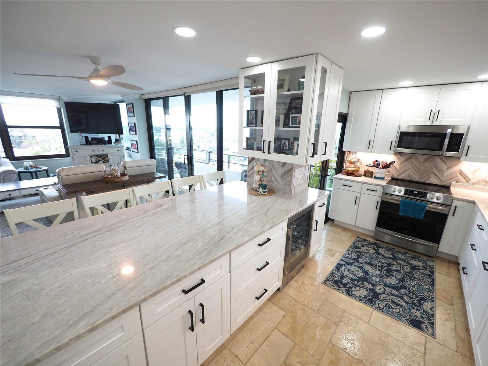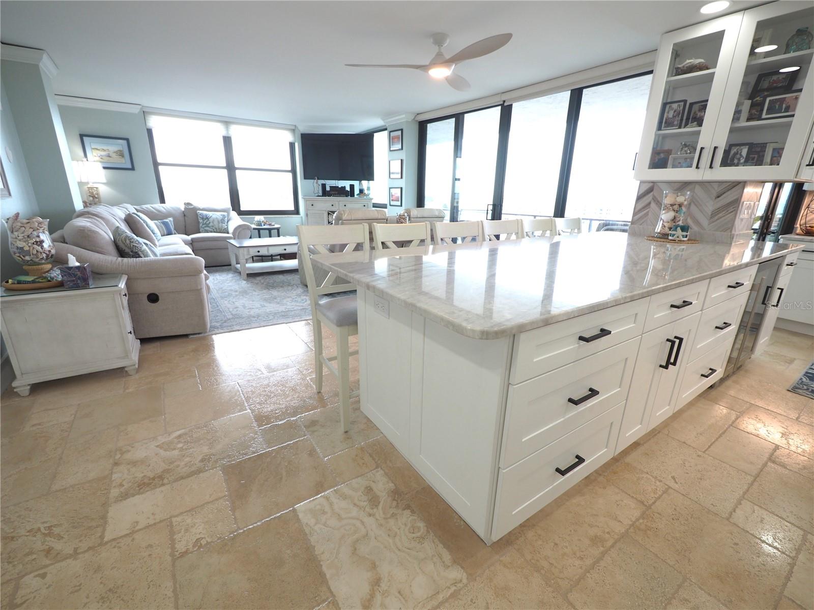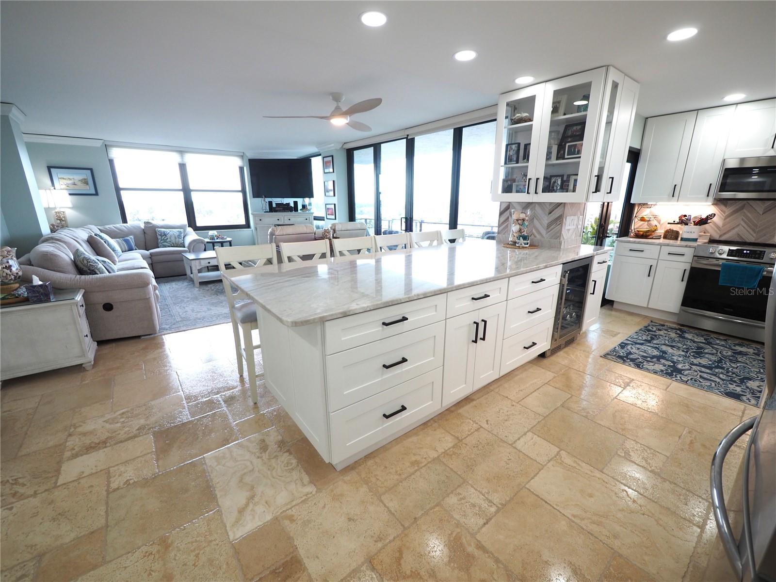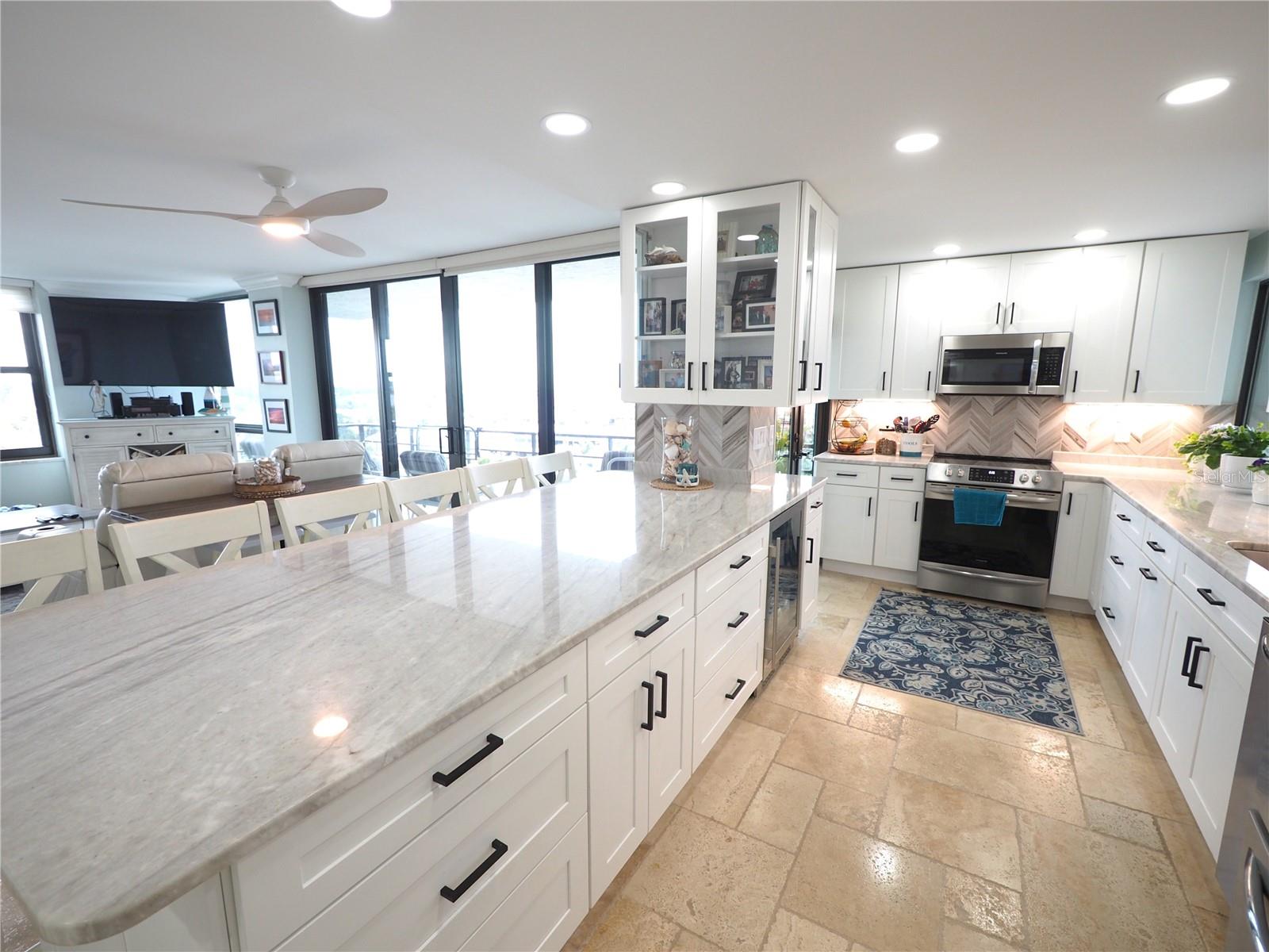 Luxurious Coastal Living at its Finest. - PRICE IMPROVEMENT OF $180,000 IN VALUE. Welcome to a lifestyle of unparalleled elegance in this impeccably renovated 9th-floor corner unit at Anchorage Yacht and Tennis on Siesta Key. Revel in the epitome of beachfront living, just steps away from the pristine crystal sands of Siesta Key with deeded beach access.The Anchorage offers a host of exclusive amenities, including ample parking for owners and guests. Comes with 1 carport. Option to purchase 1 tandem under-building parking spot. Free Boat Parking/Dock for owners and guests, Olympic-size pool, hot tub, sauna, tennis/pickle-ball courts, fitness center, BBQ area, and a park-like setting overlooking the intracoastal waterway. This stunning unit showcases meticulous attention to detail and design. Enjoy breathtaking Gulf water views and mesmerizing sunsets from all major rooms. The beautifully designed kitchen boasts endless storage space, new top-of-the-line appliances, and a striking 11-ft natural stone island that comfortably seats up to 12, seamlessly connecting to the spacious living area.The two well-appointed bedrooms and professionally designed bathrooms exude luxury, while three outdoor patios provide the perfect setting to soak in the coastal ambiance. The property is fortified with all-new hurricane impact windows and doors, ensuring both safety and tranquility. Distinctive features include travertine floors throughout, upgraded trim, illuminated crown molding, a large master walk-in shower stall, fresh neutral wall colors, and stowaway bunk beds (included) in the second bedroom. Selling turn-key with all furnishings and ready for personal occupancy or rentals. Every detail has been carefully curated to enhance the property's exceptional value. Strategically located off the Stickney Point Bridge, this residence is within close distance to the beach, renowned restaurants, shops, and an array of amenities. Whether you're looking for a coastal dream home or a prime investment for year-round vacation rentals, this property is a rare gem. Don't miss the opportunity to experience true luxury living – book your viewing now and make this coastal haven your own. Move right in and embrace the Siesta Key lifestyle or capitalize on its potential for lucrative year-round vacation rentals. HOA fee currently includes $250 funding for "fire and safety/sprinklers" upgrade project.