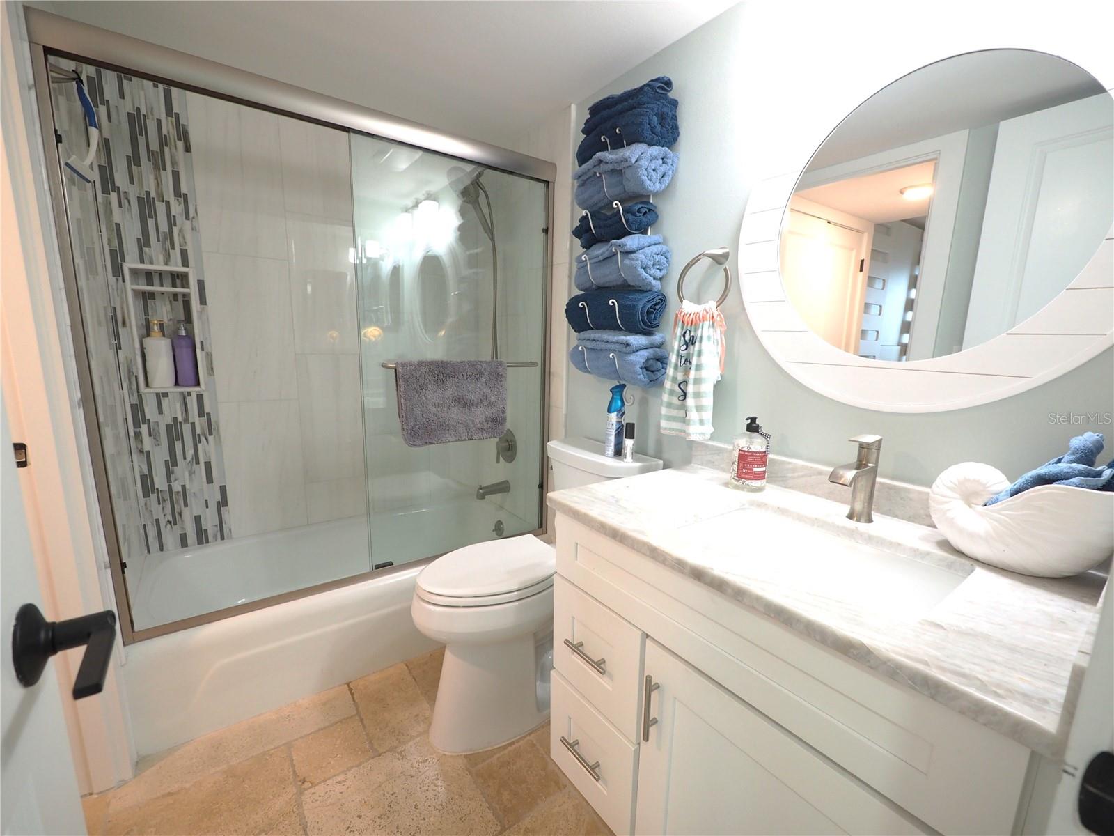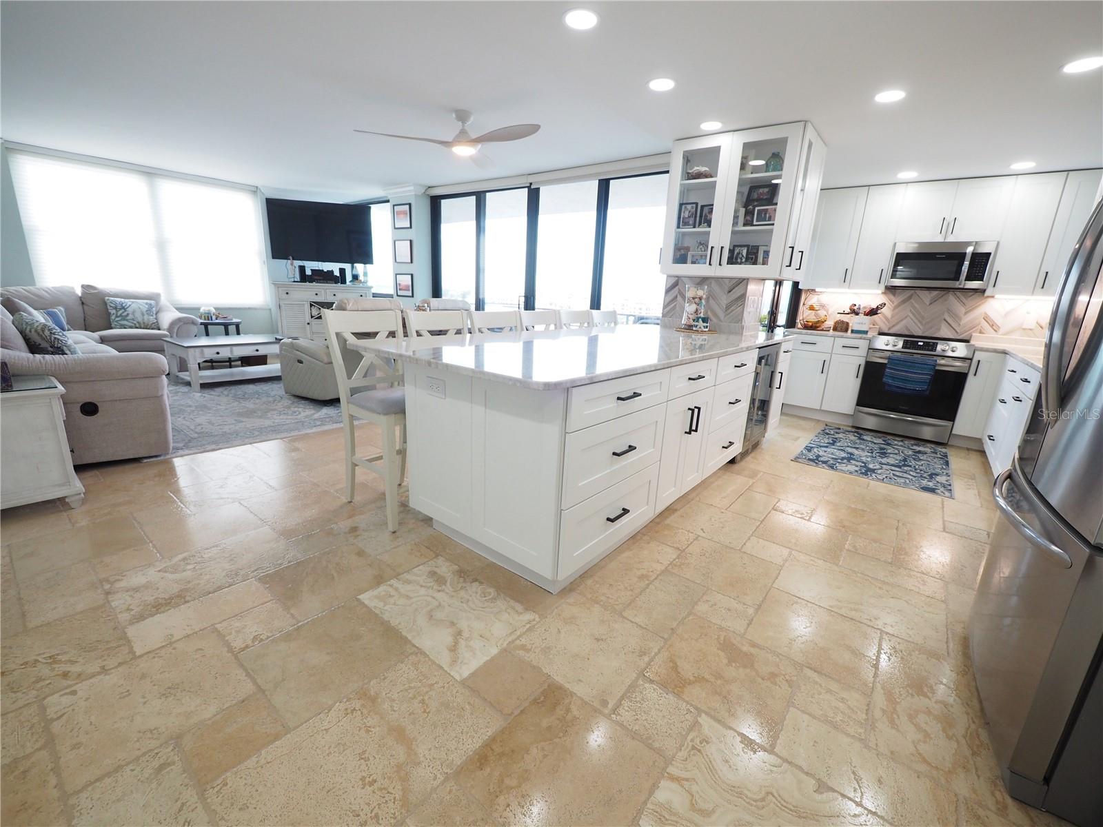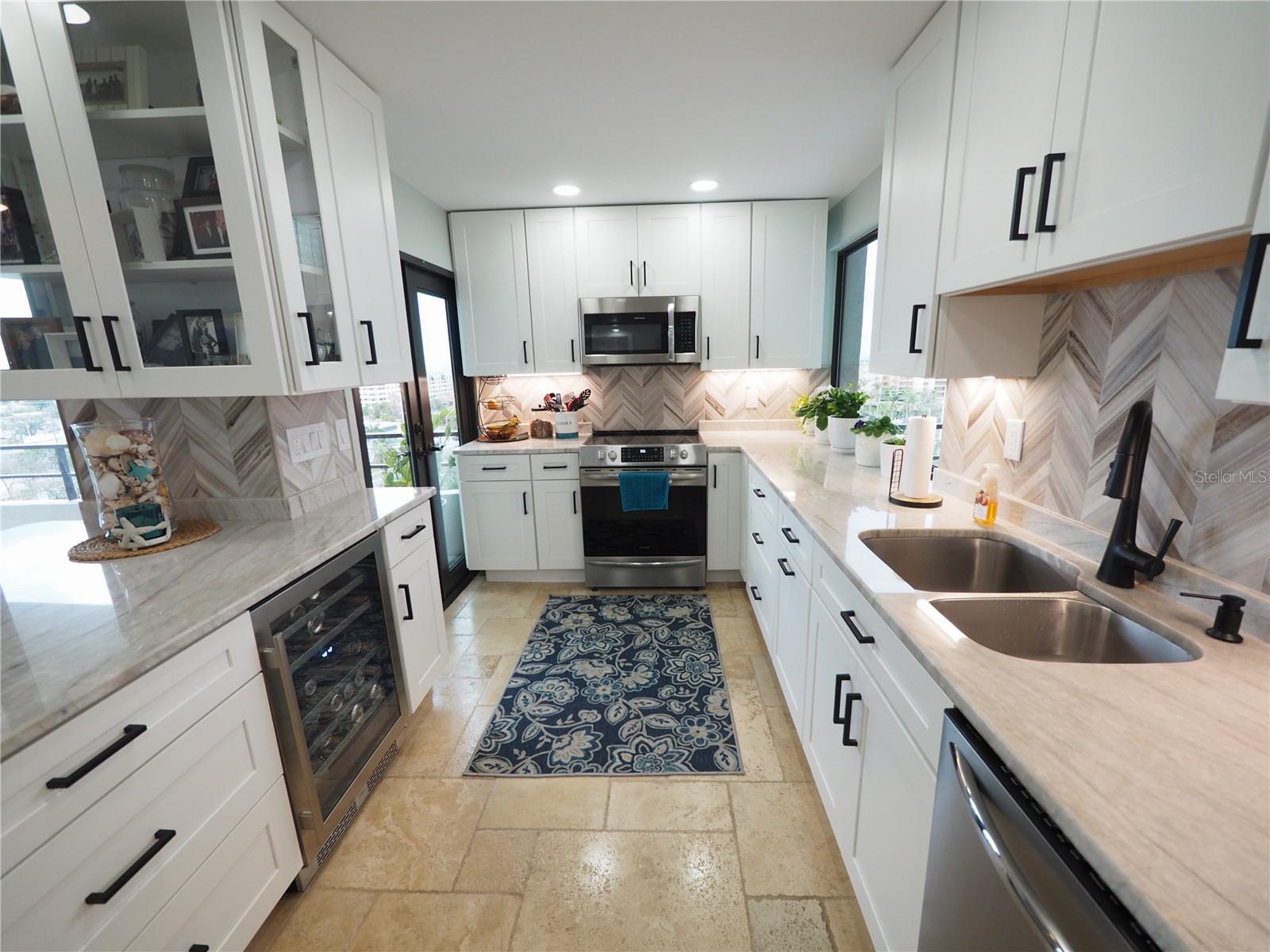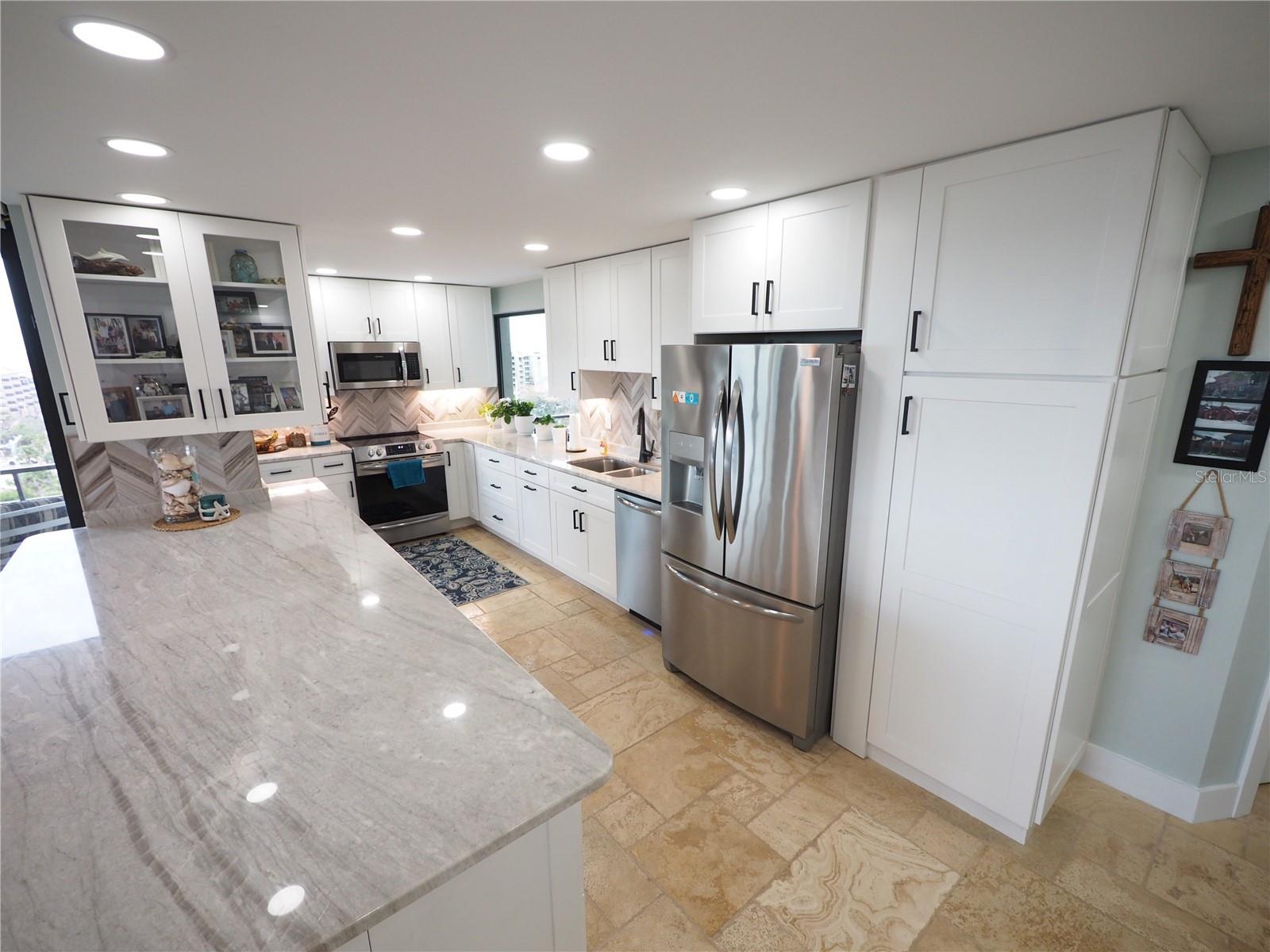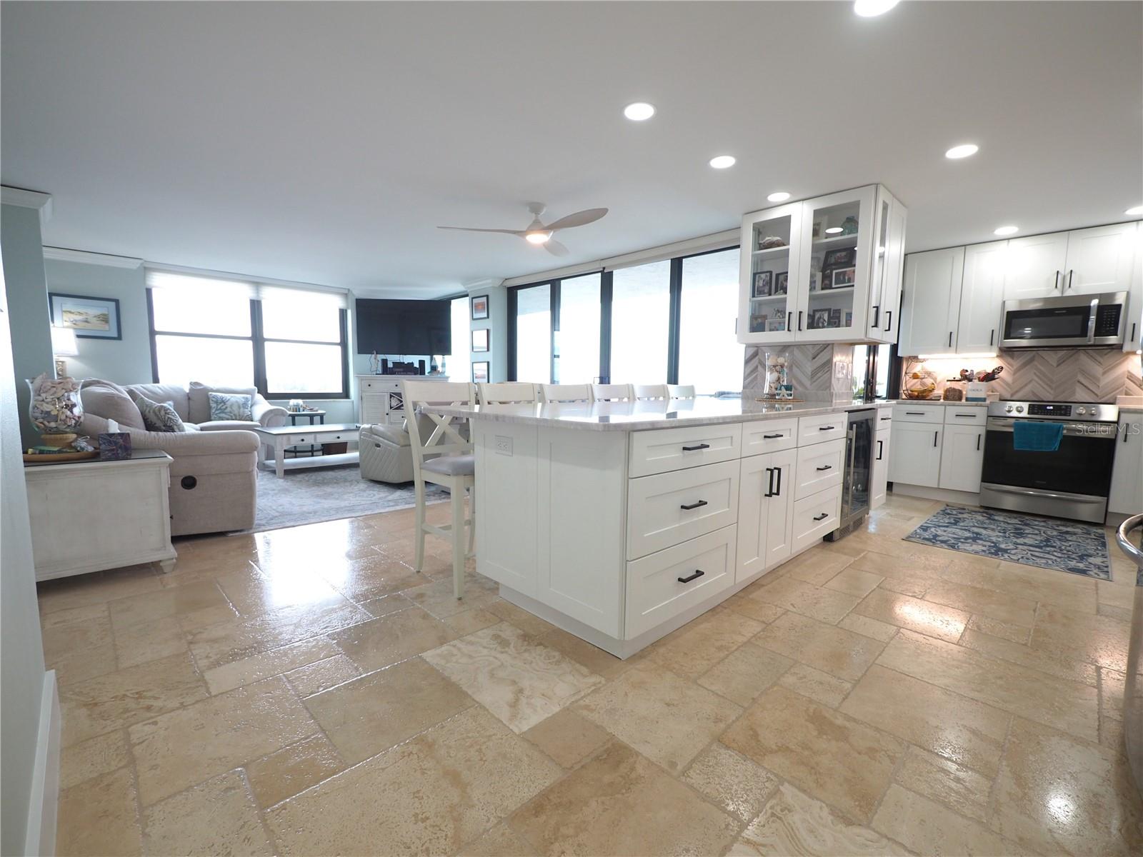 Luxurious Coastal Living at its Finest. - PRICE IMPROVEMENT OF $180,000 IN VALUE. Welcome to a lifestyle of unparalleled elegance in this impeccably renovated 9th-floor corner unit at Anchorage Yacht and Tennis on Siesta Key. Revel in the epitome of beachfront living, just steps away from the pristine crystal sands of Siesta Key with deeded beach access.The Anchorage offers a host of exclusive amenities, including ample parking for owners and guests. Comes with 1 carport. Option to purchase 1 tandem under-building parking spot. Free Boat Parking/Dock for owners and guests, Olympic-size pool, hot tub, sauna, tennis/pickle-ball courts, fitness center, BBQ area, and a park-like setting overlooking the intracoastal waterway. This stunning unit showcases meticulous attention to detail and design. Enjoy breathtaking Gulf water views and mesmerizing sunsets from all major rooms. The beautifully designed kitchen boasts endless storage space, new top-of-the-line appliances, and a striking 11-ft natural stone island that comfortably seats up to 12, seamlessly connecting to the spacious living area.The two well-appointed bedrooms and professionally designed bathrooms exude luxury, while three outdoor patios provide the perfect setting to soak in the coastal ambiance. The property is fortified with all-new hurricane impact windows and doors, ensuring both safety and tranquility. Distinctive features include travertine floors throughout, upgraded trim, illuminated crown molding, a large master walk-in shower stall, fresh neutral wall colors, and stowaway bunk beds (included) in the second bedroom. Selling turn-key with all furnishings and ready for personal occupancy or rentals. Every detail has been carefully curated to enhance the property's exceptional value. Strategically located off the Stickney Point Bridge, this residence is within close distance to the beach, renowned restaurants, shops, and an array of amenities. Whether you're looking for a coastal dream home or a prime investment for year-round vacation rentals, this property is a rare gem. Don't miss the opportunity to experience true luxury living – book your viewing now and make this coastal haven your own. Move right in and embrace the Siesta Key lifestyle or capitalize on its potential for lucrative year-round vacation rentals. HOA fee currently includes $250 funding for "fire and safety/sprinklers" upgrade project.