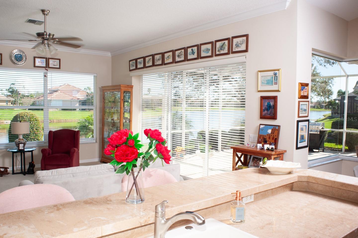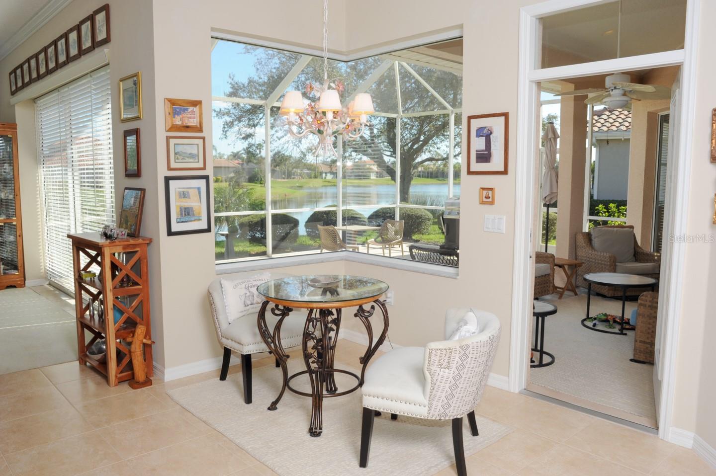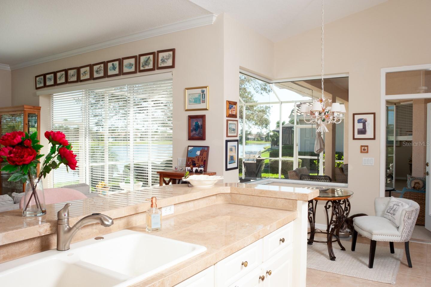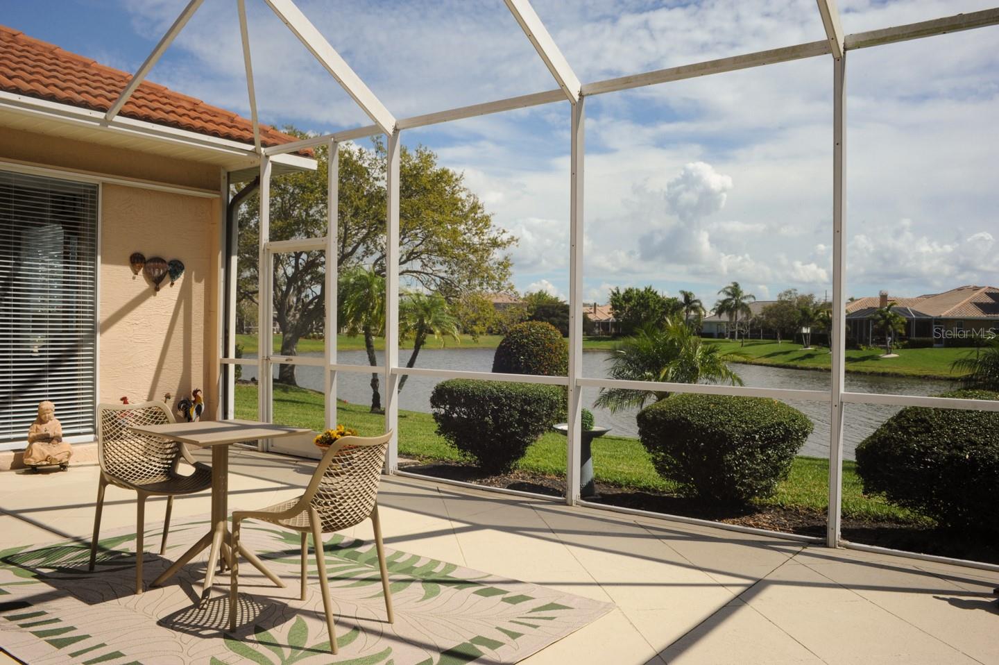 Panoramic Water Views, subtle architectural features, high ceilings, and crown molding. This 3/2 split floor plan offers privacy with a separate primary bedroom, separate wash basins, oval tub, and discrete shower area. The living room/dining area look out through 3 large glass doors leading to a large lanai, bringing the beauty of the water into the house. The kitchen, which features all new appliances, opens up into the family room where 3 large sliding glass doors, and a triple window let the sunshine in. Two more bedrooms, one featuring a walk in closet are separated by a full bathroom. There’s a laundry room with a large sink. The 3 car garage has finished walls and an epoxy floor. Recent upgrades include New HVAC, New Water Heater, Epoxy Garage Floor, Lanai Rescreen, New Dryer, toilet, and blinds. Exterior features new flowering plants and trees reminiscent of the tropical locale. Laurel Lakes is a gated community, with low HOA Fees and no CDD. Enjoy the community pool, fitness center, tennis courts. Easy access to groceries, I-75, golf courses, beaches, and everything Sarasota is known for.