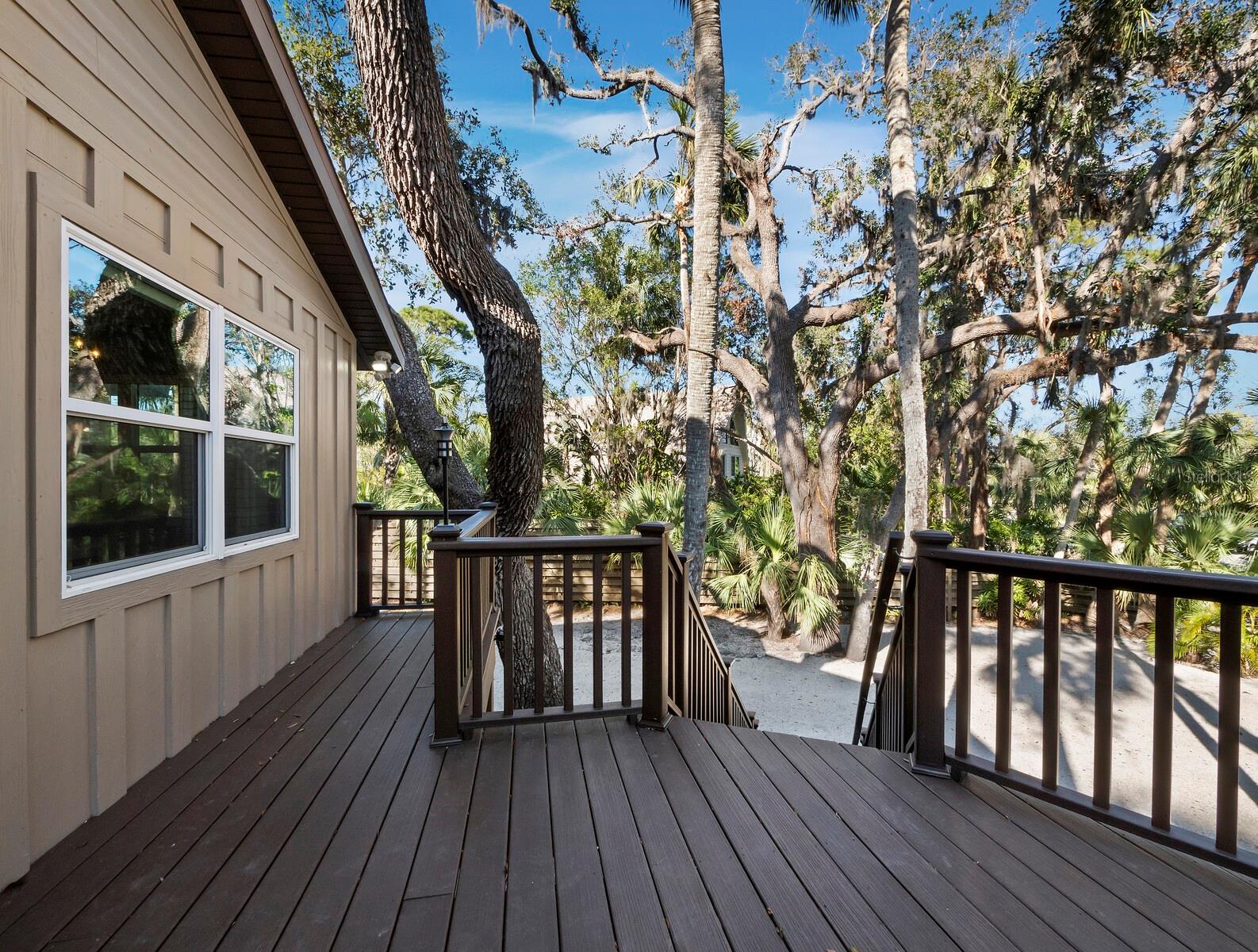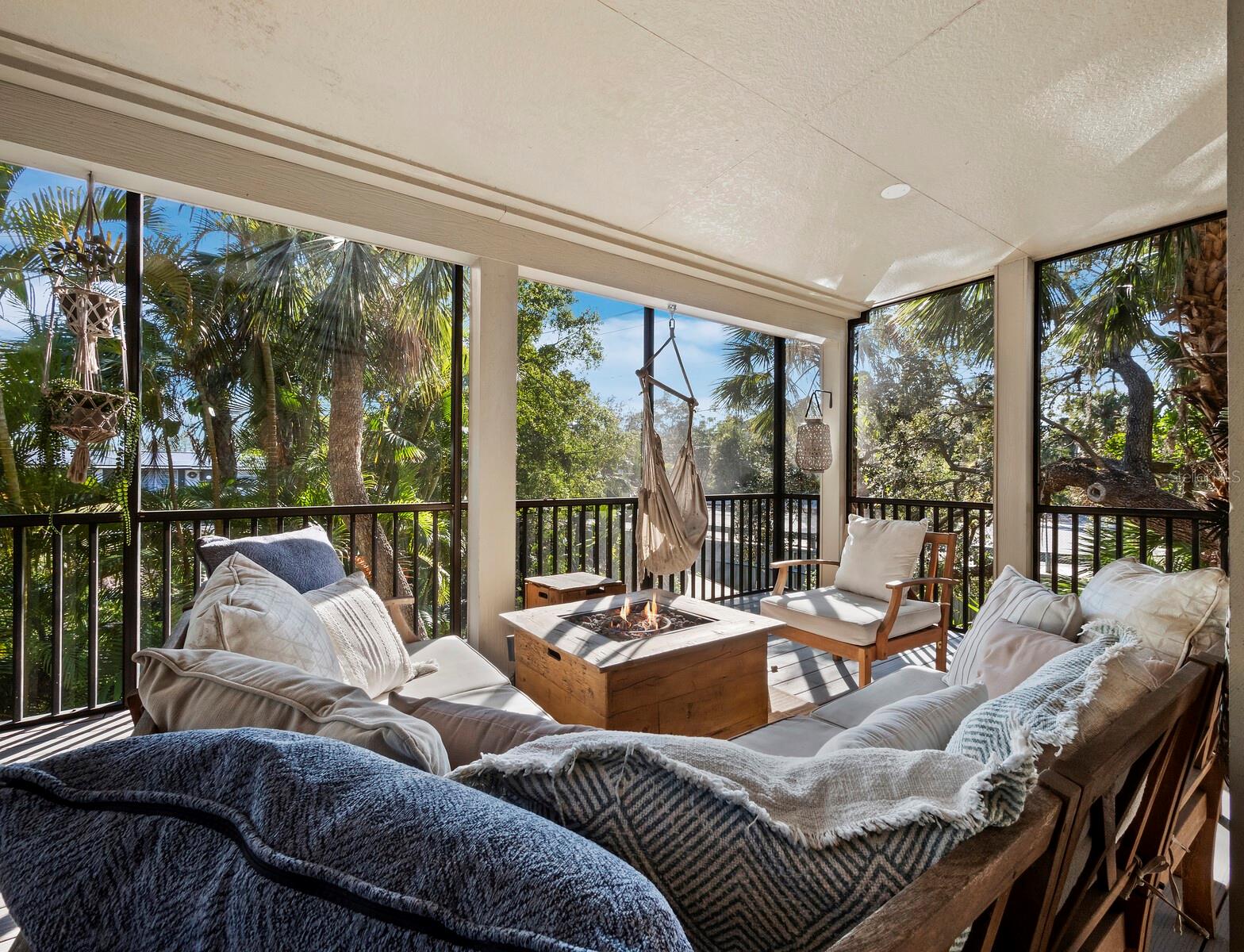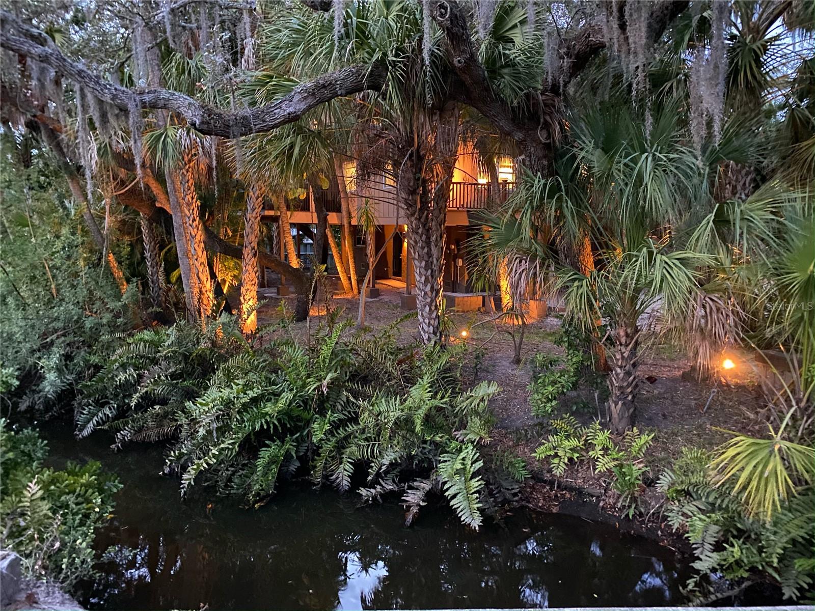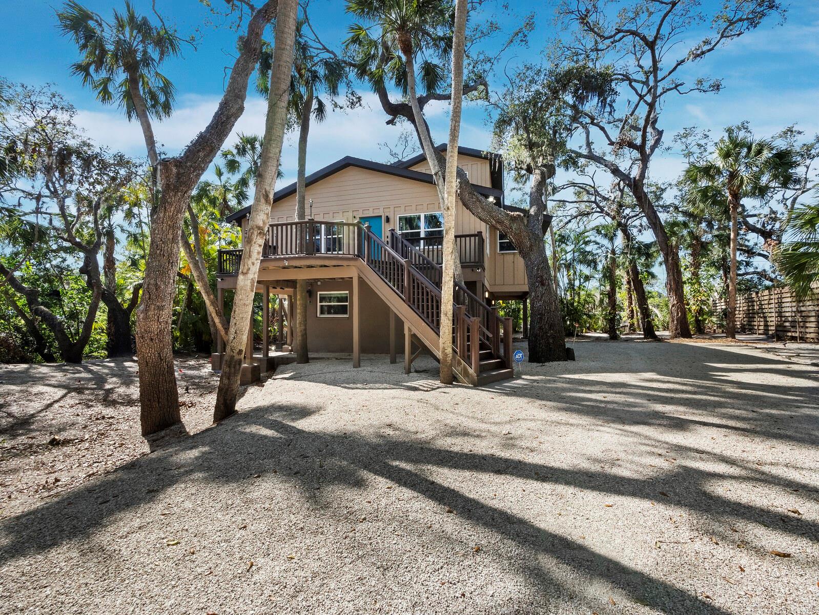 One or more photo(s) has been virtually staged. Located in popular and convenient South Gate, this home is anything but typical! Elevated and surrounded by gorgeous nature, it has the feel of a luxurious tropical treehouse. From the large lot on a quiet & private street to the huge deck at the front door, you will appreciate the cool style as soon as you pull up…this property is unique and beautiful and nestled into its surroundings in a way that you don’t often see. Phillippi Creek winds around the edge of the lot and you’ll often spot egrets, wood storks, blue heron, and even roseate spoonbills wading there, plus bald eagles and owls are known to nest nearby – it is truly a nature-lover’s paradise! Also, the creek is ideal for kayaking and you can launch right from the property and paddle all the way to in intercoastal if you like. The first floor features a spacious 2-car garage and loads of storage, with all living space located safely high above on the second and third stories. Soaring ceilings and a beautifully updated & chic kitchen define the main living area, with an elegant bath and the two nicely-sized bedrooms located on the same level. The property is offered furnished for your ultimate ease and convenience. You’ll adore the large screened deck with grill & gas fire pit too! Tucked into the treetops, this outdoor living space is infinitely enjoyable. Ascend to the main bedroom suite, where you will be absolutely wowed by the spaciousness and fantastic high ceilings! There is plenty of room for a sitting area, desk, or even a yoga or meditation spot so you can create a true retreat. The updated bath features a freestanding tub and shower with space for two, and the large walk-in closet has ample space and is already customized! The laundry is conveniently located upstairs in a second closet, and there is also a second fabulous screen porch to enjoy. Many smart home features make for easy living: Lutron lighting throughout, in-ceiling speakers, Arlo camera system, and an August automated front door lock. This entire home is perfectly updated and ready to enjoy and you will also be thrilled with the location: easily drive or bike to Siesta Key Beach or downtown, or hop on the nearby Legacy Trail! 10 minutes or less will get you most places, which is a rarity in Sarasota. Your tropical paradise treehouse awaits…come take a look at this unique and dazzling property today!