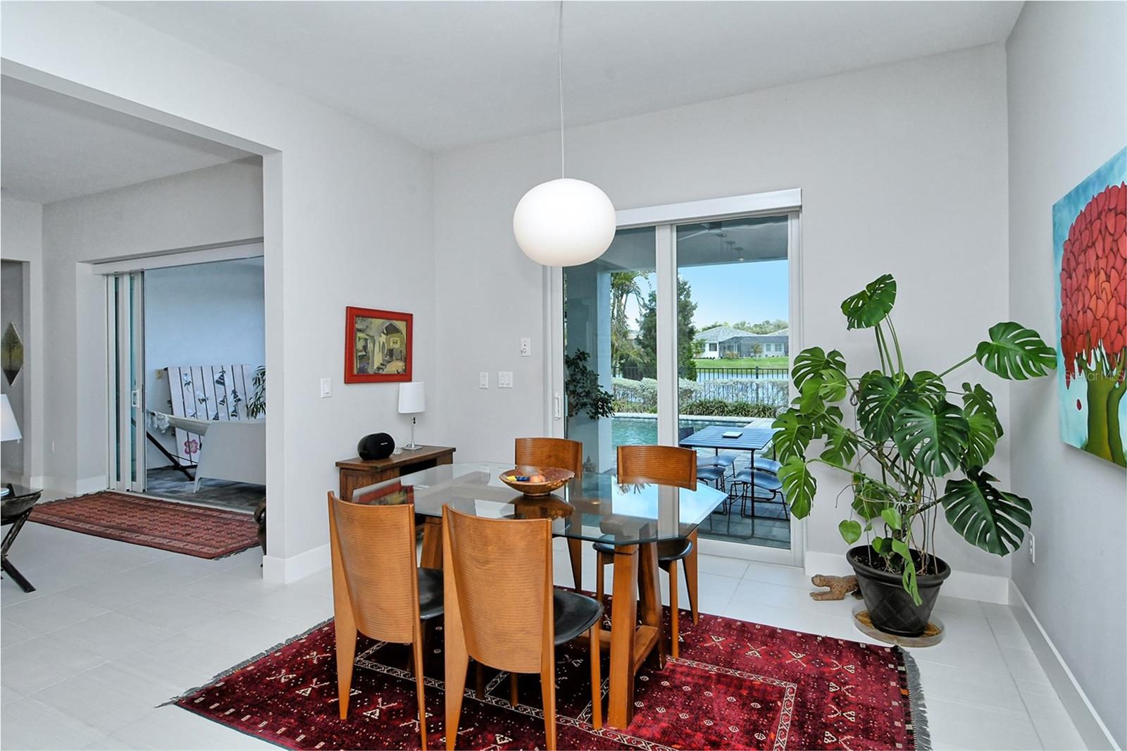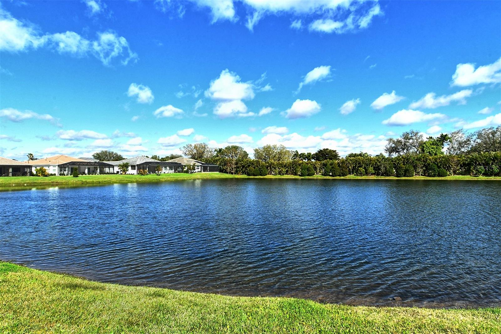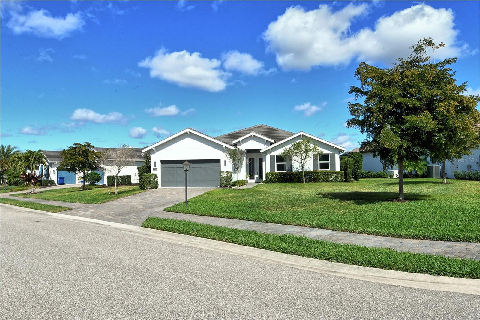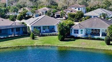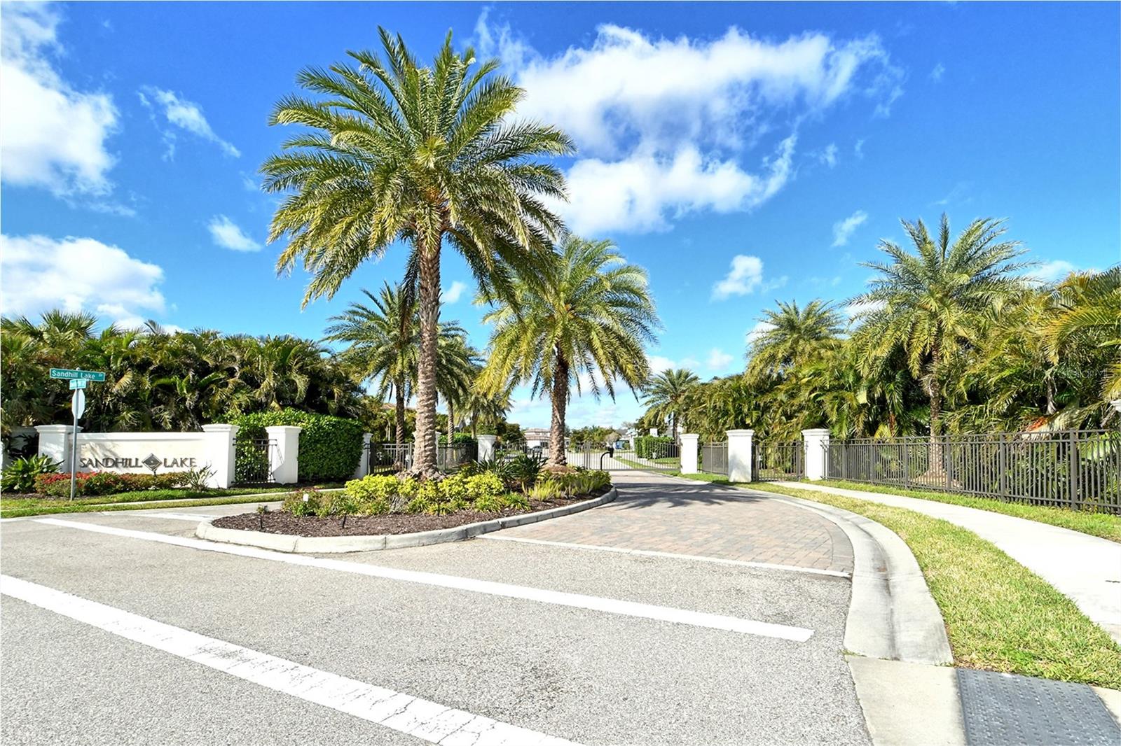 Situated on one of the largest corner lots in the prestigious gated enclave of Sandhill Lake, this exquisite pool residence offers breathtaking lake views and meticulously landscaped surroundings. Crafted by award-winning luxury builder Heritage Builders, this residence showcases unparalleled design and superior craftsmanship. The open-concept floor plan features soaring 12-foot ceilings, creating a seamless flow throughout the living spaces. Enter through grand 10-foot double doors with glass panels and be captivated by the modern elegance and high-end finishes. Hurricane-impact windows and sliding glass doors provide peace of mind, and this home remained completely unaffected by last year’s hurricanes. The 12x24 luxury porcelain tile floors add a touch of sophistication. Built in 2020, this residence features three spacious en-suite bedrooms, each designed for comfort and privacy. The lavish primary suite is a private retreat with oversized windows overlooking the serene pool and lake, along with direct access to the lanai. The spa-like bathroom features quartz countertops, dual sinks, and a stand-alone custom imported porcelain tub. Each additional en-suite bedroom includes a custom wood walk-in closet and a private bath. A guest room with a built-in office nook adds versatility to the home. Designed for the culinary enthusiast, the gourmet kitchen features a gas stove, waterfall-edge quartz countertops, a glass tile backsplash, custom wood cabinetry, top-of-the-line Café Series appliances, and a spacious pantry. Seamlessly blending indoor and outdoor living, the enclosed lanai, fenced yard, and state-of-the-art pool create a resort-style oasis. The elegant concrete paver patio provides the perfect setting for relaxation or entertaining, with space to add an outdoor kitchen. Not in a flood zone! The low HOA fees cover lawn maintenance and pest control, and with no CDD fees, residents enjoy both luxury and affordability. Located in an A-rated school district, including Riverview High School, this home is just minutes from Siesta Key Beach, Myakka Park, downtown Sarasota, top-rated golf courses, and fine dining. Residents of Sandhill Lake enjoy exclusive access to a clubhouse, resort-style pool, spa, and fire pit. Move-in ready, this modern luxury home offers an exceptional blend of elegance, comfort, and convenience.