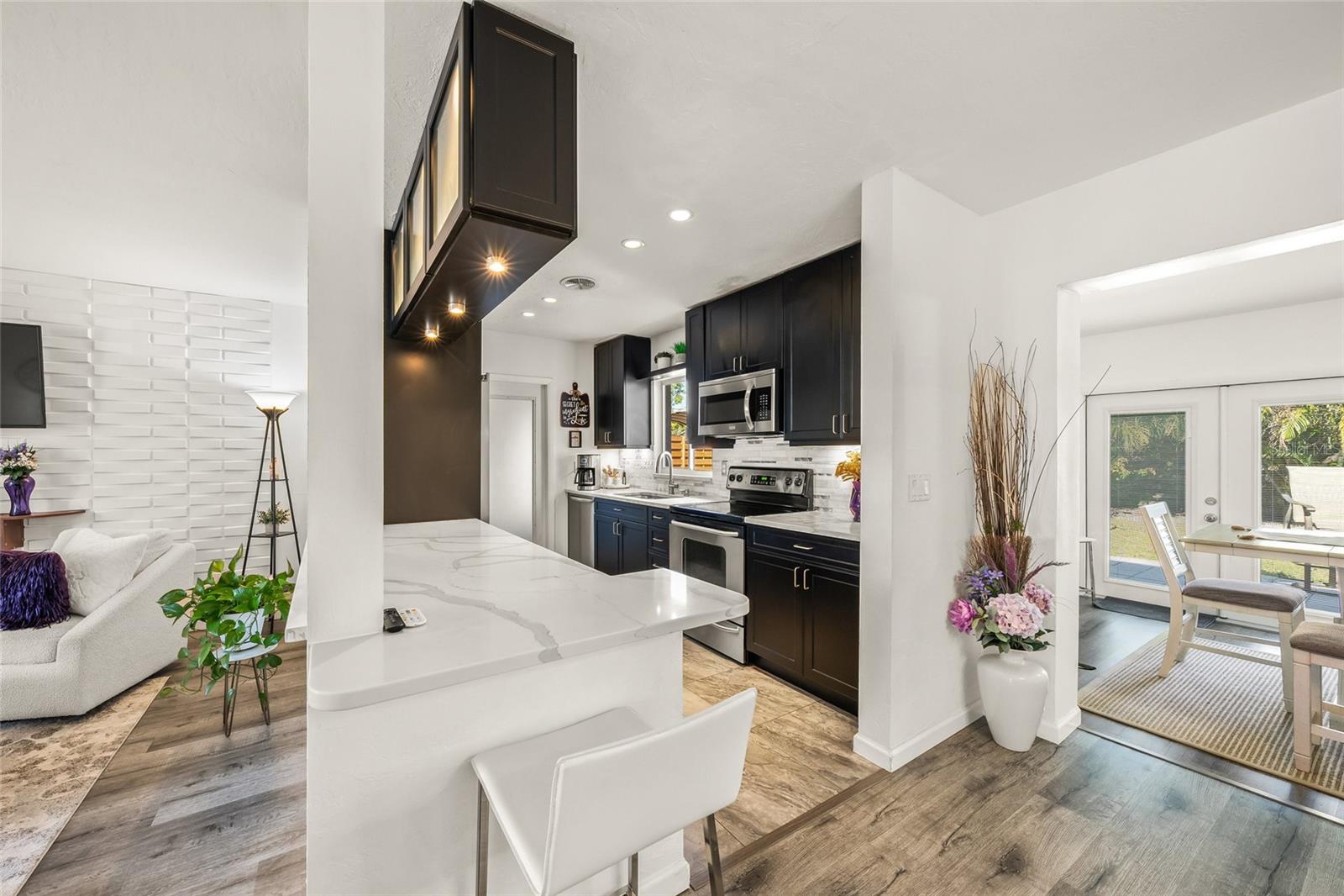 You are in luck! Chic Coastal Living is now possible, right in the Heart of Sarasota! Nestled in the desirable South Gate community, this impeccably updated home blends modern elegance with timeless charm. From the moment you arrive, you’ll be captivated by its pristine curb appeal, accentuated by lush landscaping and swaying palms. Step inside to experience an airy, sun-drenched interior with stylish finishes and thoughtful renovations from floor to ceiling. The open-concept living area features a newer roof, newer HVAC, newer hot water heater, luxury vinyl plank flooring, fresh neutral tones, and a stunning accent wall that adds character and depth to the space. A wall of PGT replacement windows bathes the home in natural light, enhancing the warm and welcoming atmosphere. At the heart of the home, the modern chef’s kitchen has been tastefully redesigned with sleek quartz countertops, bold black cabinetry, and an elegant pass-through bar, perfect for entertaining. Stainless steel appliances, upgraded fixtures, and a stylish glass-front display cabinet elevate the space, making meal prep a delight. The spacious dining area is a true showstopper, boasting vaulted ceilings, dual French doors, and expansive backyard views. Whether hosting an intimate dinner or a festive gathering, this space seamlessly blends indoor-outdoor living. Retreat to the serene primary suite, a tranquil haven featuring plush carpeting, oversized windows, and ample storage. The secondary bedrooms are equally inviting, offering flexible spaces for family, guests, or a home office. Step outside into your private oasis, where a fully fenced backyard provides both privacy and serenity. The large paver patio is perfect for al fresco dining, shaded under a chic umbrella, while tropical landscaping adds a touch of paradise. Whether enjoying your morning coffee or hosting an evening get-together, this backyard is an entertainer’s dream. Additional highlights include a newer roof, updated HVAC and hot water heater, knockdown finished ceilings, and fresh paint. Situated on a quiet street, this home is just minutes from Downtown Sarasota, St. Armands Circle, and the world-famous Siesta Key Beach—ranked #1 in the U.S.! Experience Florida living at its finest—schedule your private tour today before this gem is gone!