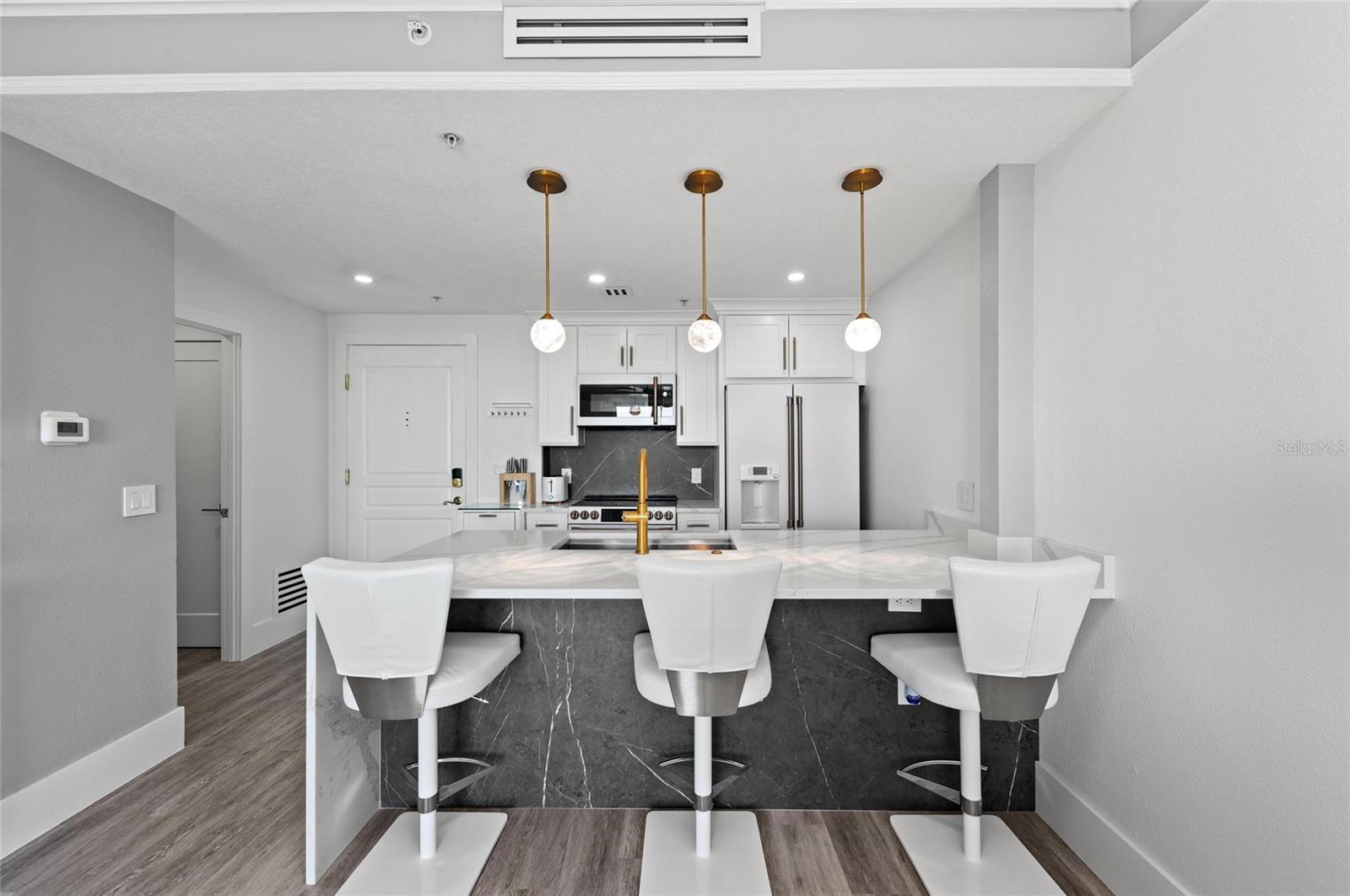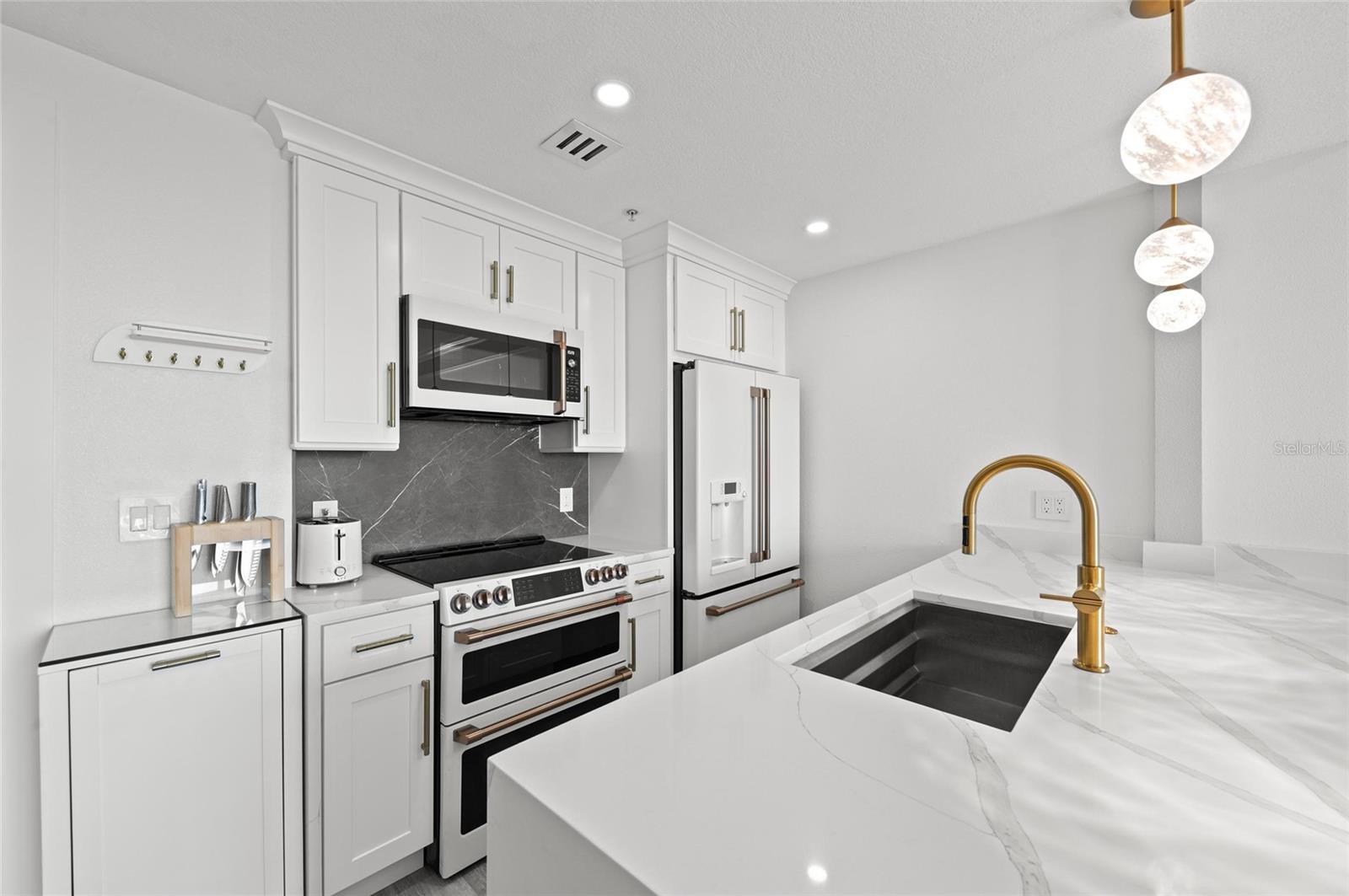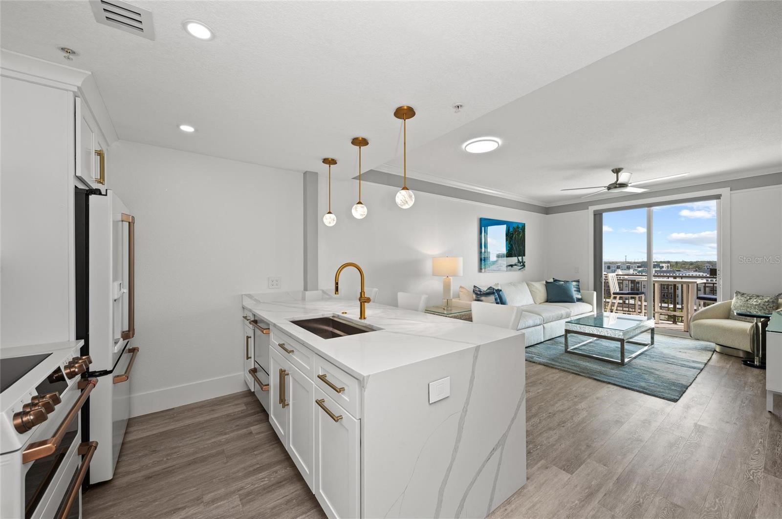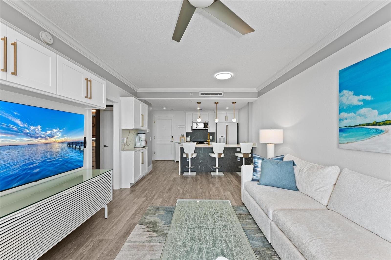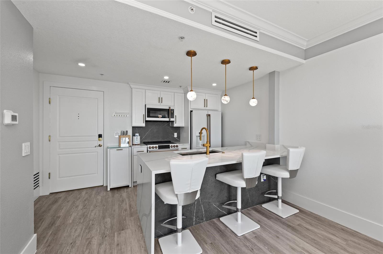 THREE COVERED GARAGE PARKING SPACES. Luxury and elegance come together in this fully remodeled, turnkey-furnished 1-bedroom, 1-bath condo in the prestigious Renaissance at Rosemarie Place. Every inch of this stunning residence has been thoughtfully redesigned, offering a seamless blend of sophisticated style and modern convenience. Step inside to find a bright, open living space adorned with hand-selected Robb Stucky furnishings, creating an inviting yet refined atmosphere. The gourmet kitchen is a chef’s dream, featuring GE Café matte white appliances with gold accents, exquisite finishes, and top-of-the-line details. Every comfort has been considered, from the Williams Sonoma and Pottery Barn linens and kitchenware to the luxurious spa-inspired bath. A new washer and dryer, along with an additional refrigerator in the laundry room, add to the effortless livability of this home. Beyond the condo’s impeccable interior, convenience is unmatched. The unit includes three premium parking spaces—two side-by-side penthouse-level spots just steps from the elevator and an oversized first-floor space, along with an oversized secured penthouse storage unit. Living at the Renaissance at Rosemarie Place means enjoying resort-style amenities, including a 70-foot heated pool, fitness center, theater room, business center, and 24-hour security. Nestled just steps from downtown’s vibrant shopping, dining, and cultural attractions and only a short drive to Lido Beach and Siesta Key Beach, this exceptional home offers the perfect balance of city energy and coastal tranquility. Move right in and start living the luxury lifestyle today.
