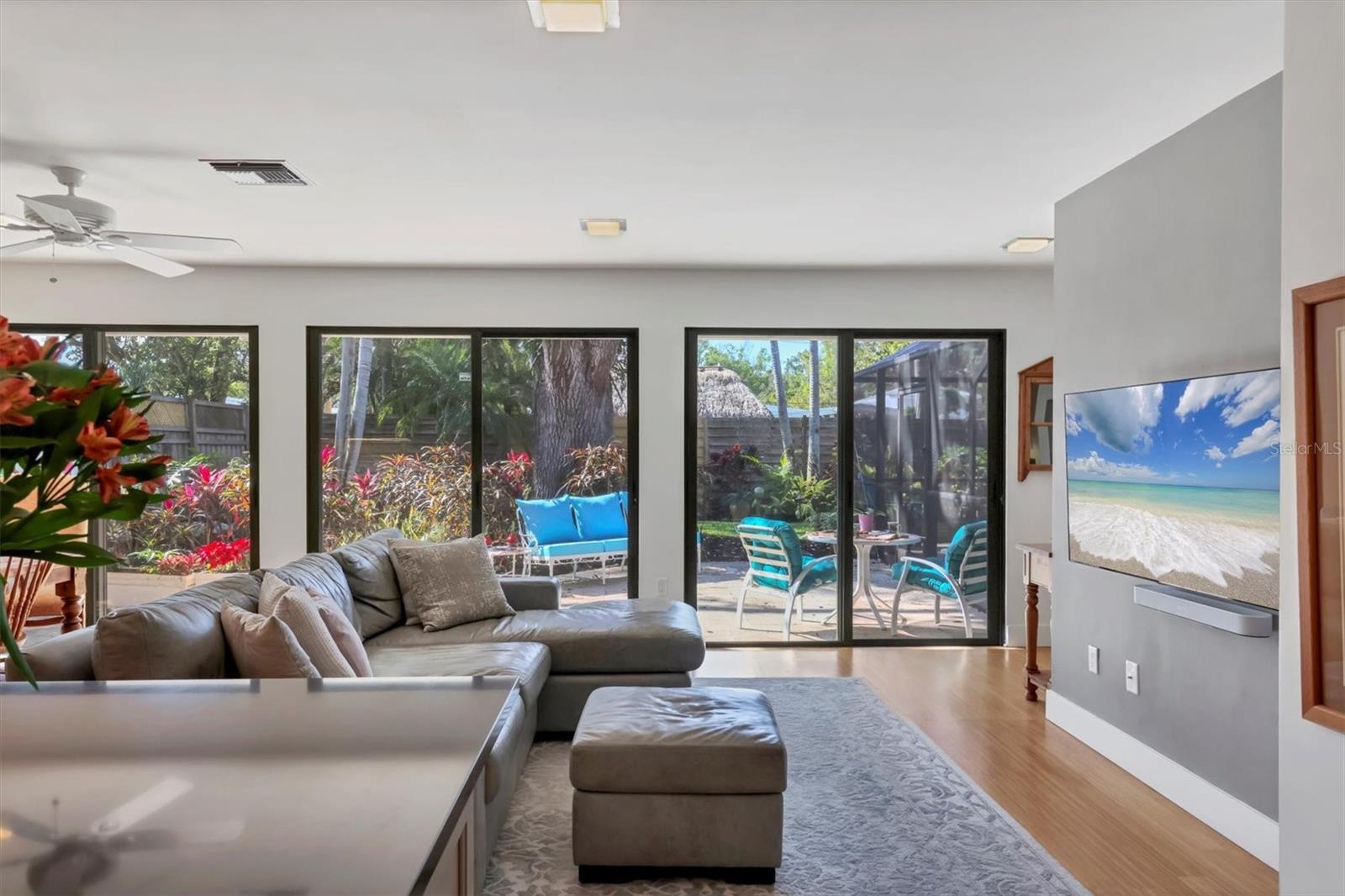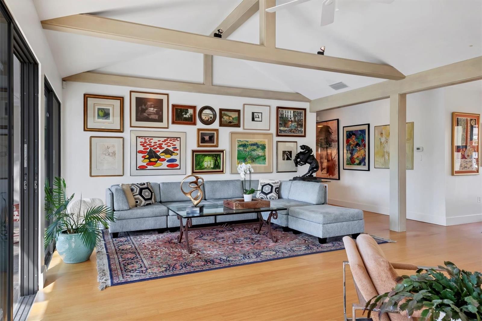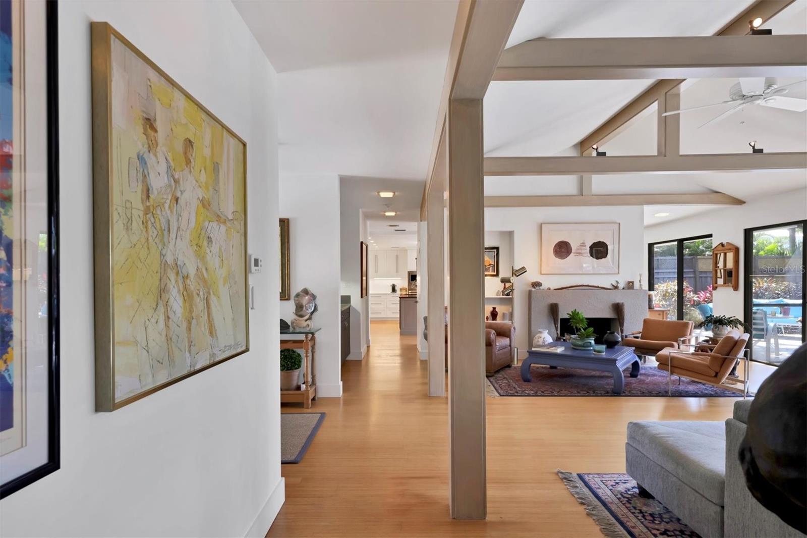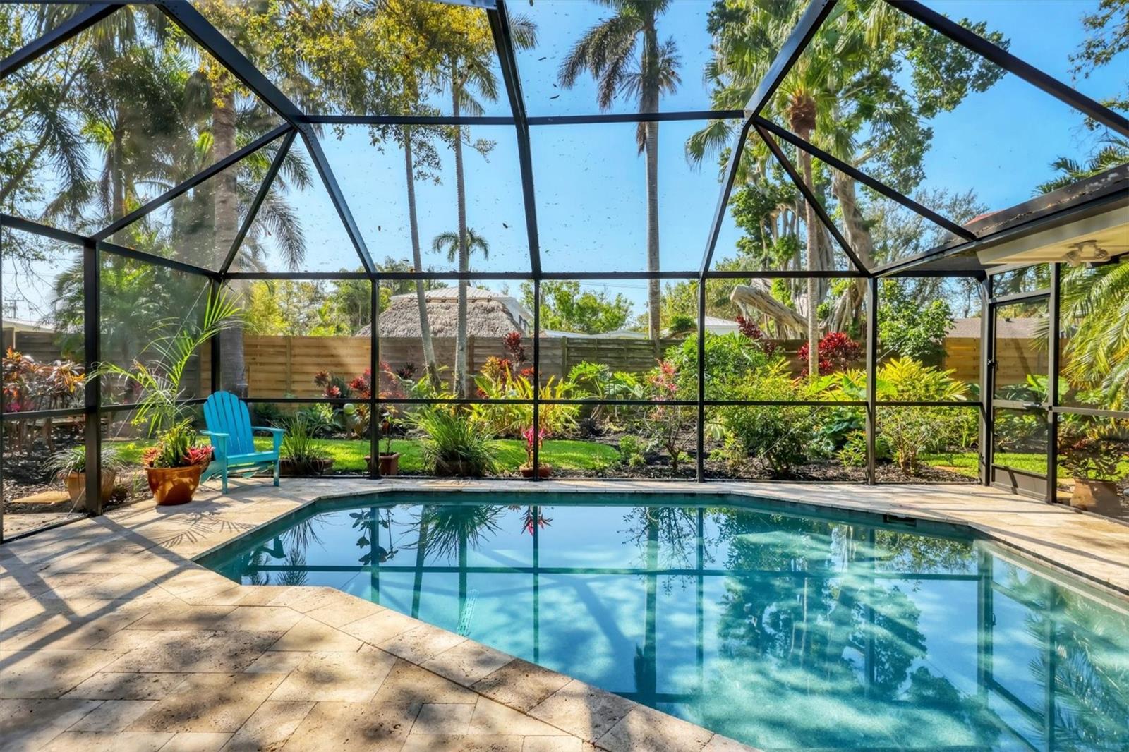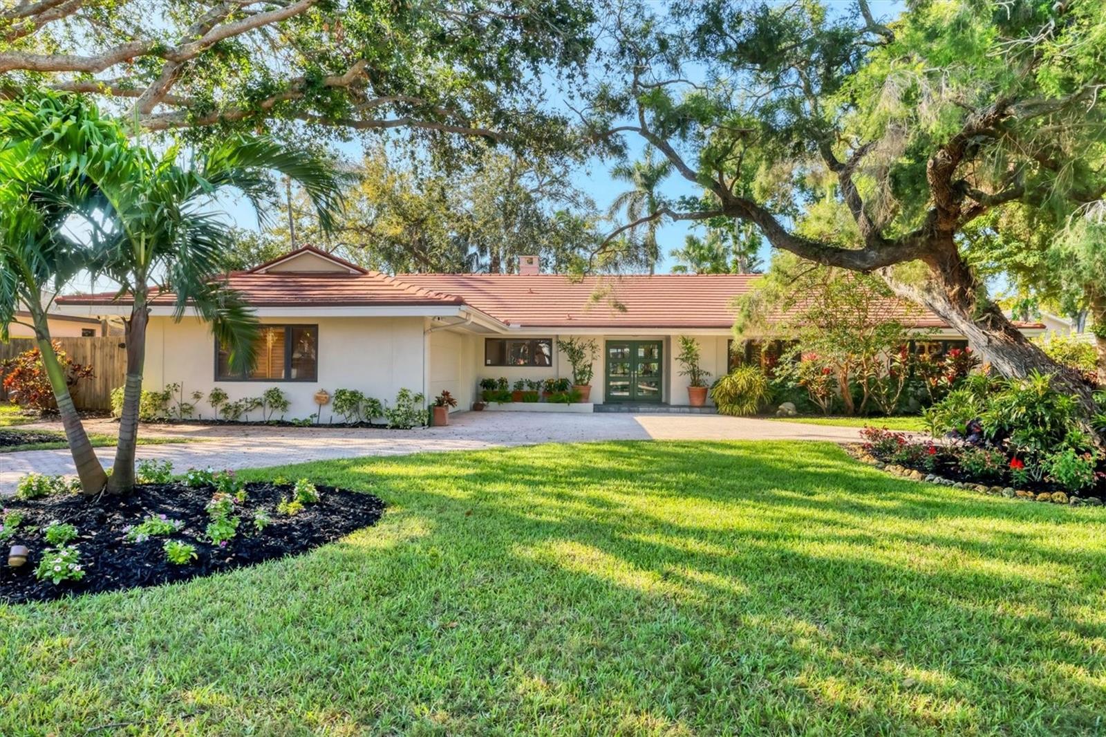 Nestled among towering oaks and mature landscaping sits this mid-century modern home. On an oversized lot with a pavered circular driveway, a fully fenced yard that is perfect for pets, and a side entry oversized 2 car garage. This updated home exudes both charm and sophistication. Boasting 9 sets of sliding glass doors, the views of the tropical gardens and outdoors blend seamlessly with indoor living... a true nod to Sarasota architecture. A large foyer leads to a living room with a vaulted and beamed ceiling, wood burning fireplace, with views of the caged pool and butterly garden, a gracious entertaining space. The updated kitchen features white cabinets, quartz counters and an oversized island with a breakfast bar and storage, Monogram gas cooktop, built-in oven, microwave, Bosch dishwasher, a large side-by-side Kitchen Aid refrigerator, and a wine cooler make this kitchen a cook's delight! Open to the family room, with uncompromised views of the outdoors, this space easily becomes the hub of casual dining. A cozy "office" complete with a built-in desk, 2 storage closets and windows also viewing the outdoors, is an added bonus. Bamboo floors throughout, updated baths, an abundance of storage space, an above ground hot tub and heated pool make this Oyster Bay Estates property special. Conveniently located close to the Field Club and Publix and all the fantastic amenities in the re-imagined Landings Shopping Center.