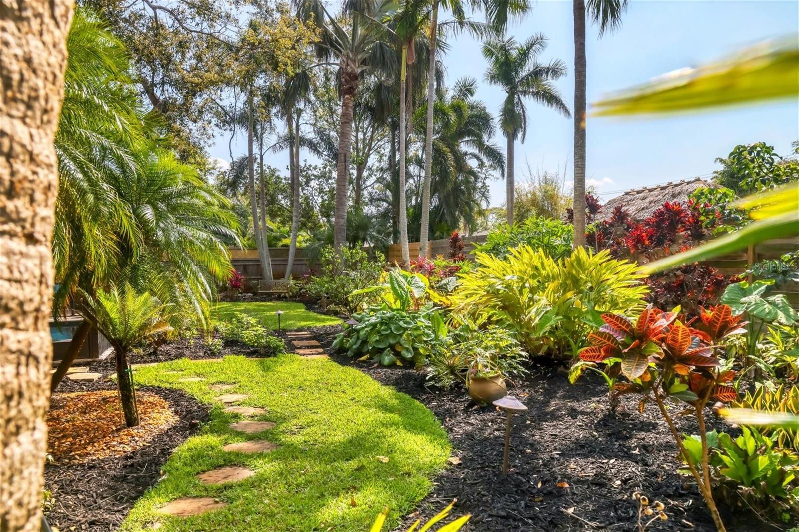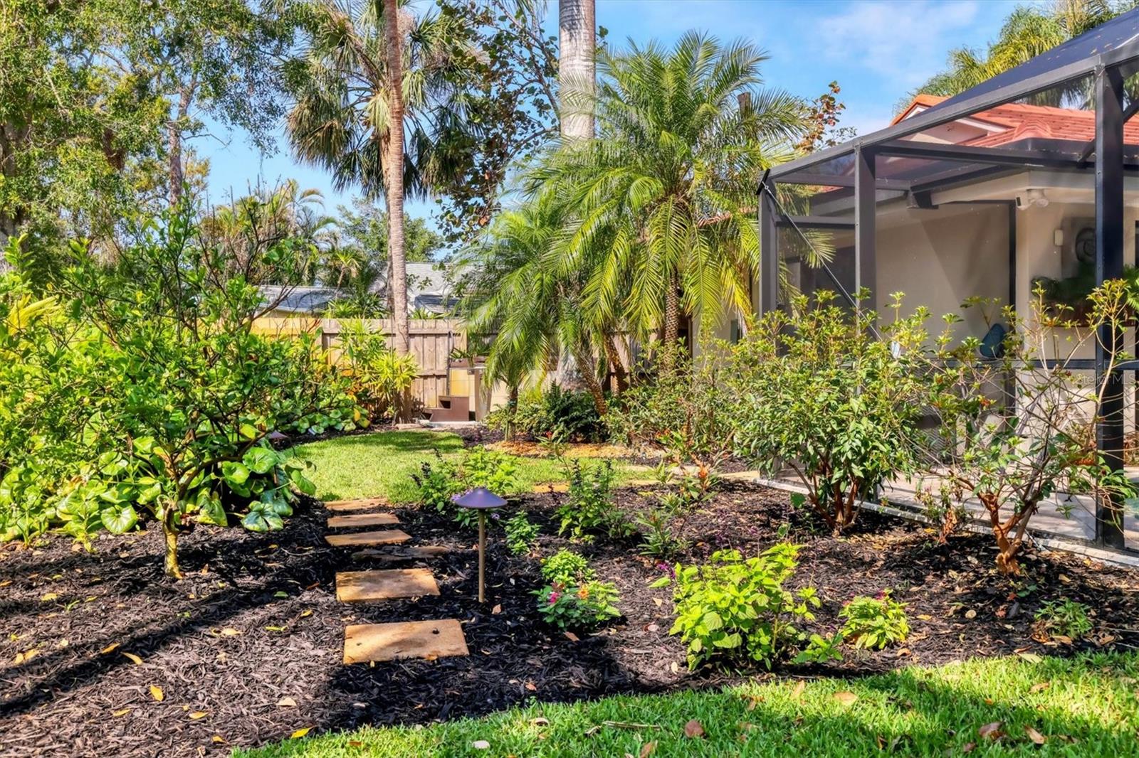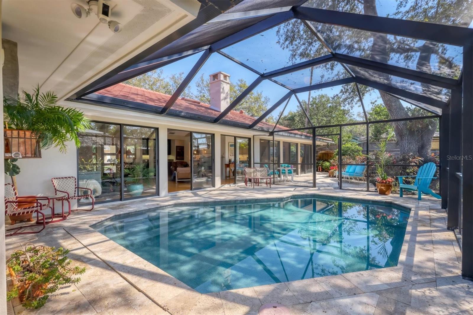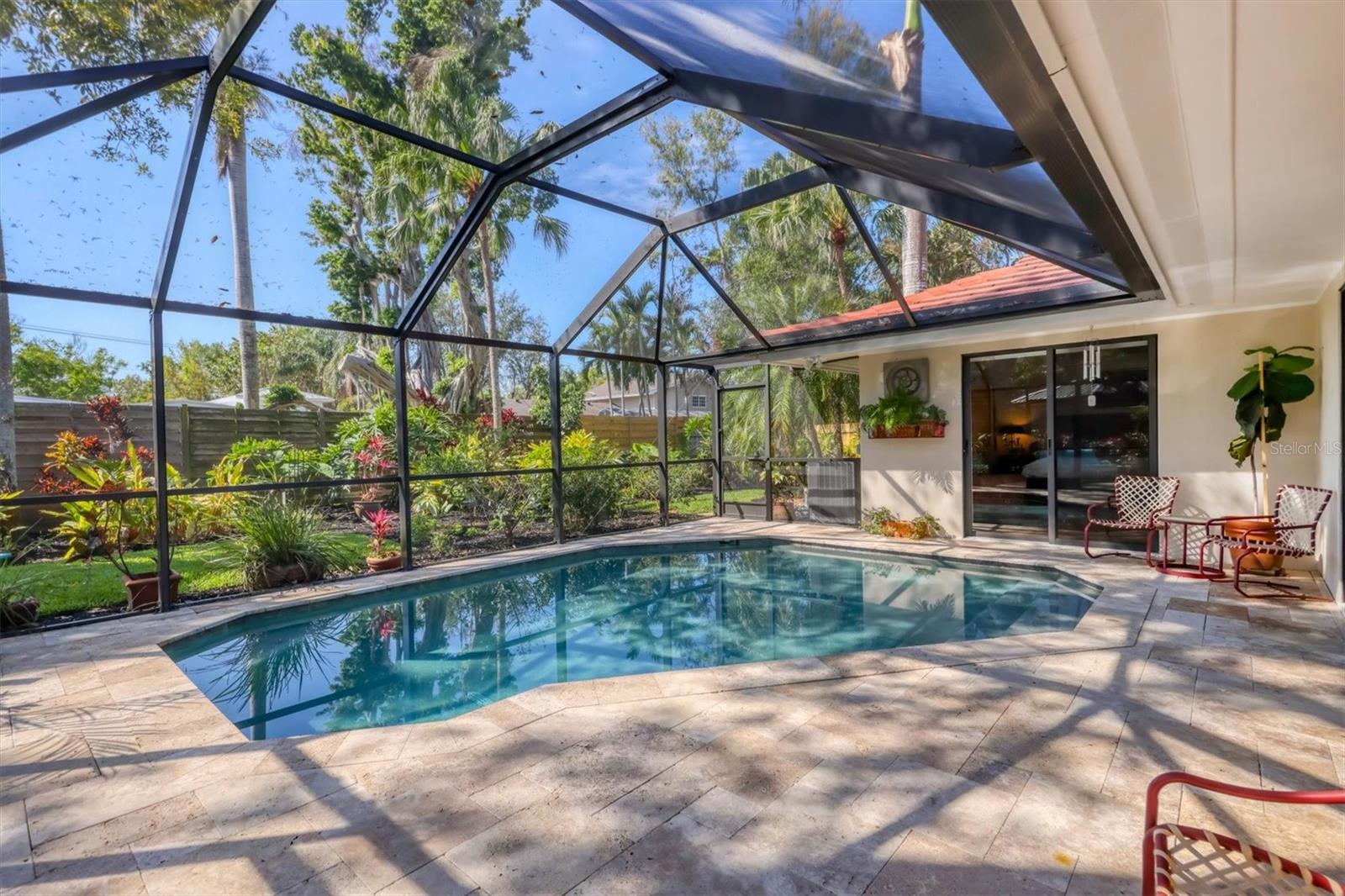 Nestled among towering oaks and mature landscaping sits this mid-century modern home. On an oversized lot with a pavered circular driveway, a fully fenced yard that is perfect for pets, and a side entry oversized 2 car garage. This updated home exudes both charm and sophistication. Boasting 9 sets of sliding glass doors, the views of the tropical gardens and outdoors blend seamlessly with indoor living... a true nod to Sarasota architecture. A large foyer leads to a living room with a vaulted and beamed ceiling, wood burning fireplace, with views of the caged pool and butterly garden, a gracious entertaining space. The updated kitchen features white cabinets, quartz counters and an oversized island with a breakfast bar and storage, Monogram gas cooktop, built-in oven, microwave, Bosch dishwasher, a large side-by-side Kitchen Aid refrigerator, and a wine cooler make this kitchen a cook's delight! Open to the family room, with uncompromised views of the outdoors, this space easily becomes the hub of casual dining. A cozy "office" complete with a built-in desk, 2 storage closets and windows also viewing the outdoors, is an added bonus. Bamboo floors throughout, updated baths, an abundance of storage space, an above ground hot tub and heated pool make this Oyster Bay Estates property special. Conveniently located close to the Field Club and Publix and all the fantastic amenities in the re-imagined Landings Shopping Center.