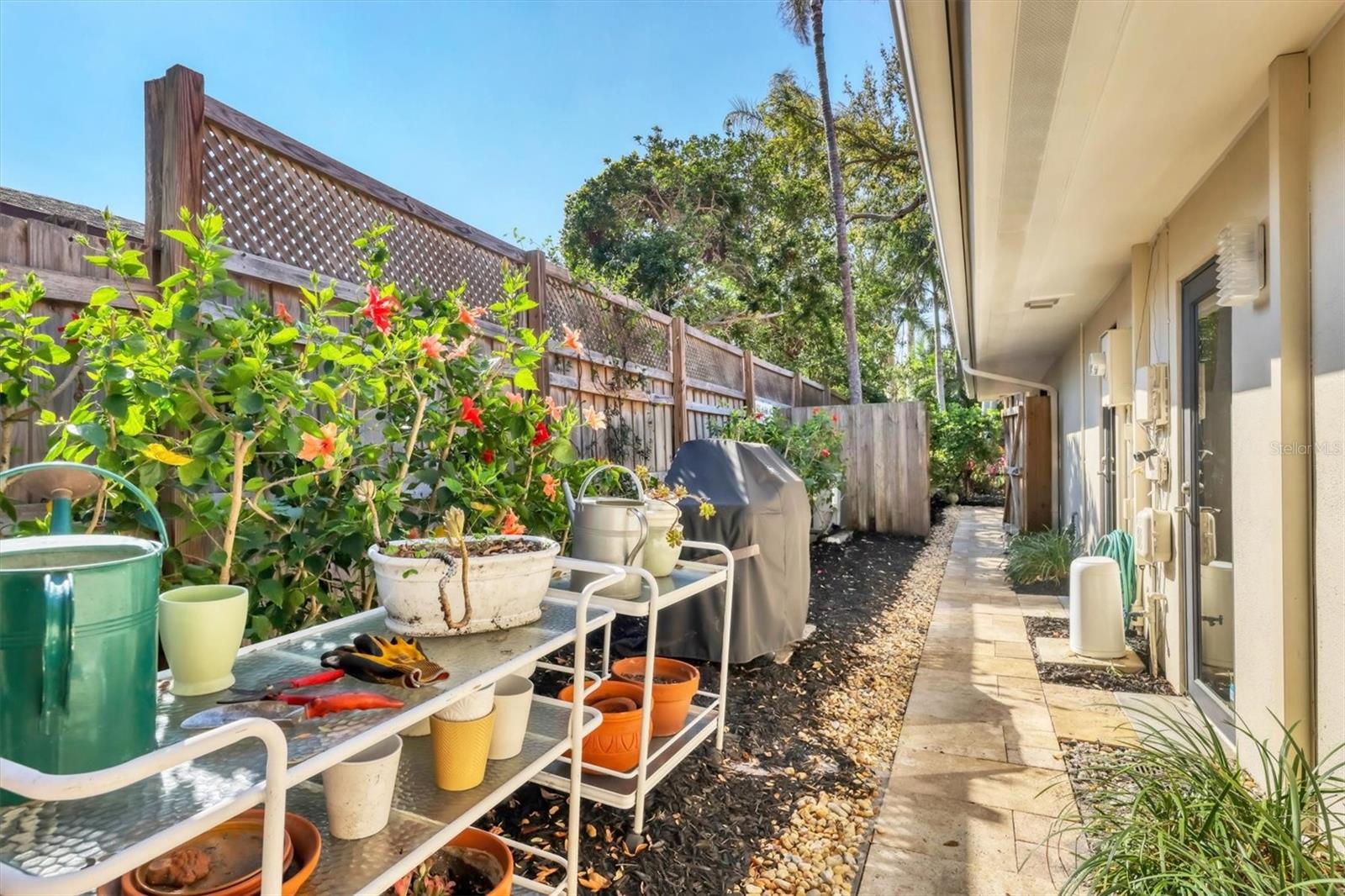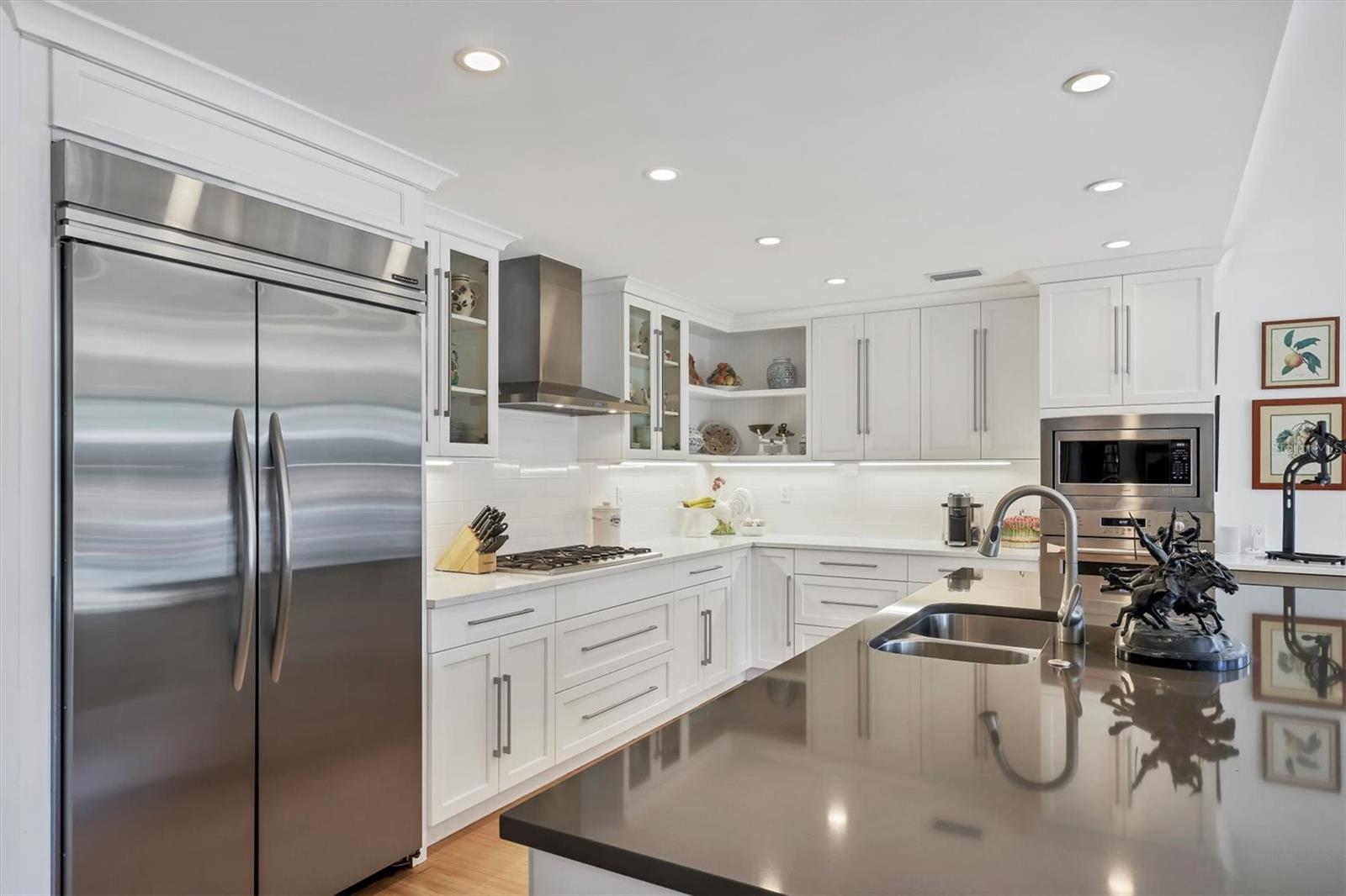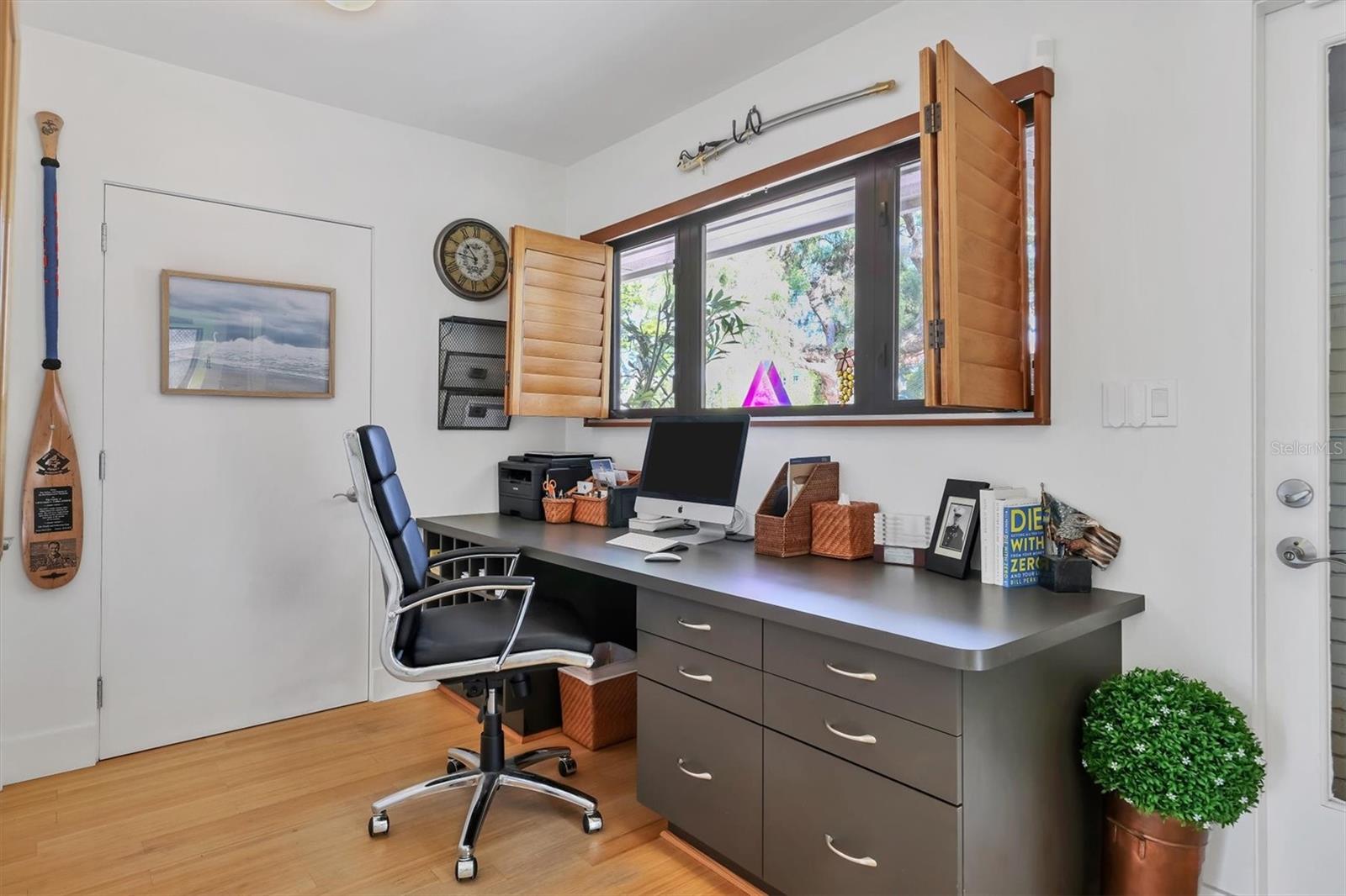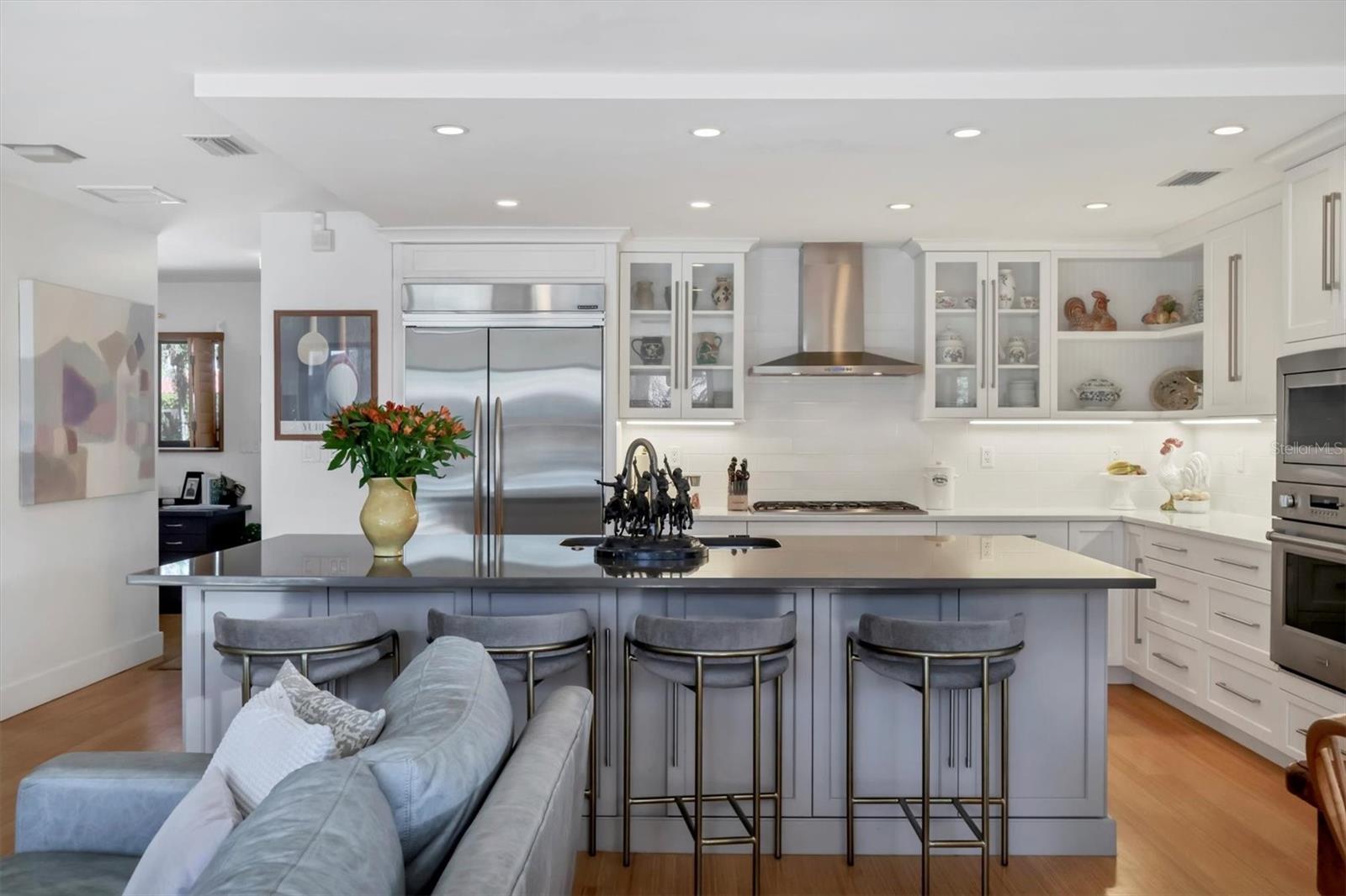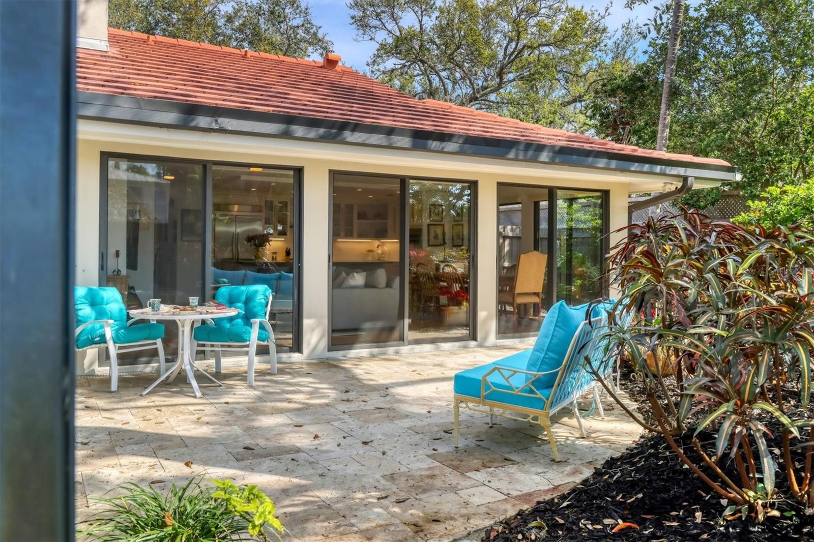 Nestled among towering oaks and mature landscaping sits this mid-century modern home. On an oversized lot with a pavered circular driveway, a fully fenced yard that is perfect for pets, and a side entry oversized 2 car garage. This updated home exudes both charm and sophistication. Boasting 9 sets of sliding glass doors, the views of the tropical gardens and outdoors blend seamlessly with indoor living... a true nod to Sarasota architecture. A large foyer leads to a living room with a vaulted and beamed ceiling, wood burning fireplace, with views of the caged pool and butterly garden, a gracious entertaining space. The updated kitchen features white cabinets, quartz counters and an oversized island with a breakfast bar and storage, Monogram gas cooktop, built-in oven, microwave, Bosch dishwasher, a large side-by-side Kitchen Aid refrigerator, and a wine cooler make this kitchen a cook's delight! Open to the family room, with uncompromised views of the outdoors, this space easily becomes the hub of casual dining. A cozy "office" complete with a built-in desk, 2 storage closets and windows also viewing the outdoors, is an added bonus. Bamboo floors throughout, updated baths, an abundance of storage space, an above ground hot tub and heated pool make this Oyster Bay Estates property special. Conveniently located close to the Field Club and Publix and all the fantastic amenities in the re-imagined Landings Shopping Center.