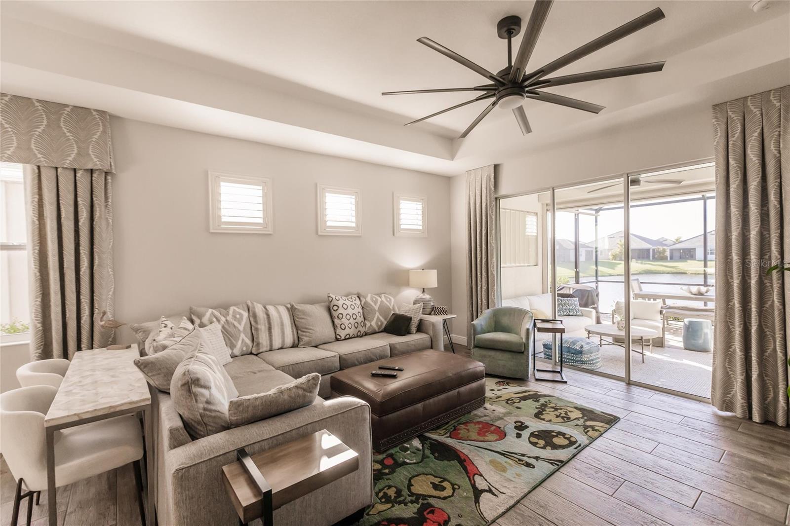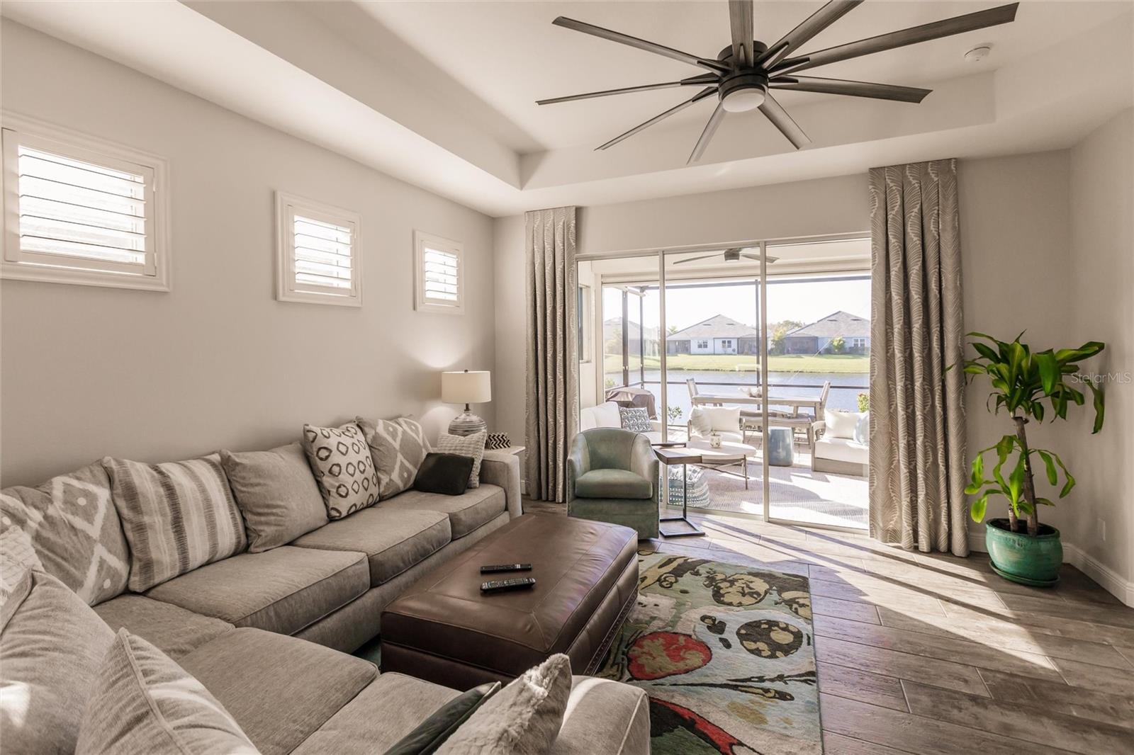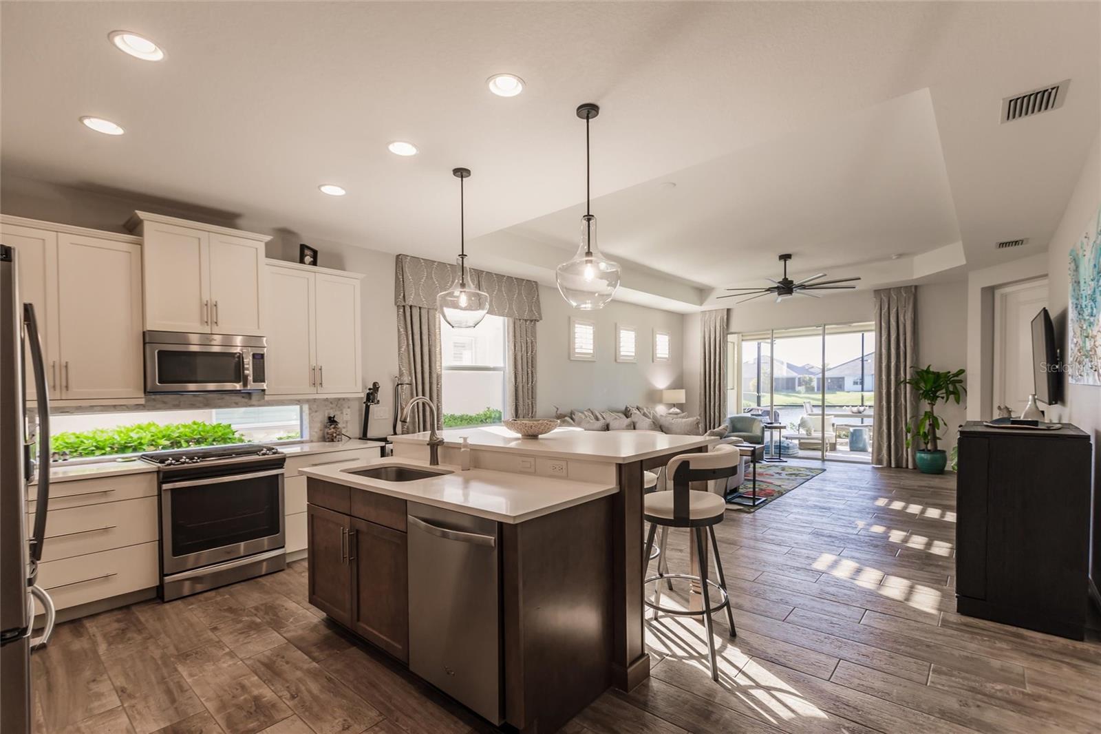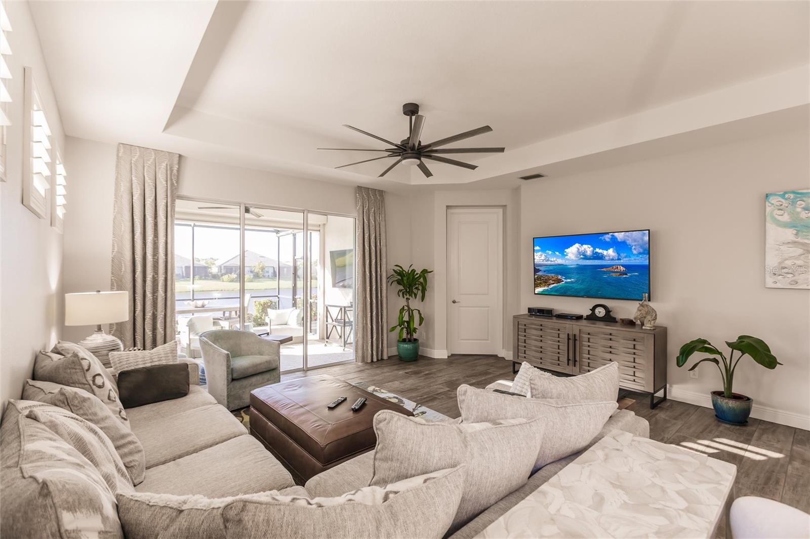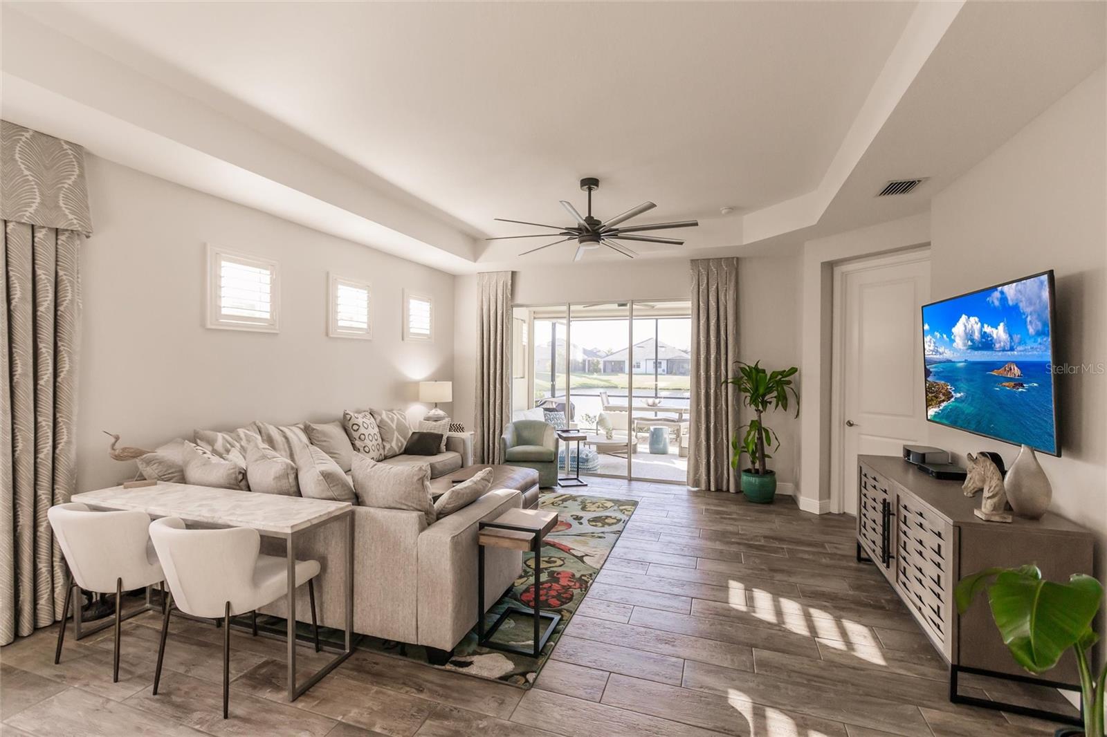 Experience resort-style living at its finest in the highly sought-after University Village, a gated, maintenance-free community. This meticulously maintained Anna Maria model offers the largest floor plan and breathtaking water views. With beautiful wood plank tile flooring throughout, a neutral color palette, and elegant finishes, this home is move-in ready—simply unpack and enjoy! The chef-inspired kitchen features an oversized center island with an extended bar top, providing abundant space for cooking and entertaining. The spacious family room boasts a wall of slider doors that open to an incredible outdoor living space, seamlessly blending indoor and outdoor relaxation. Step outside and indulge in your private oasis, complete with a screened-in covered patio, ceiling fan, mounted TV, custom blinds, and a remote-controlled hurricane shutter for peace of mind. The expansive primary suite offers tray ceilings, a luxurious ensuite bathroom with dual closets featuring built-in shelving, an oversized walk-in shower with a frameless glass enclosure, dual sink vanities, and a separate water closet for added privacy. The generously sized second bedroom is conveniently located near the hall bathroom, offering ideal separation from the primary suite. The versatile den is enhanced with a stylish sliding barn door and a Murphy bed, perfect for accommodating guests or creating an office space. The two-car garage is a standout, featuring polyaspartic flooring, overhead storage racks, and custom cabinetry for optimal organization. Enjoy year-round access to the heated community pool and take advantage of the private dog park. University Village offers the added benefit of no CDD fees and is perfectly situated just minutes from SRQ Airport. Enjoy easy access to pristine white-sand beaches, world-class dining, premier shopping, and Desantis Park, which features pickleball courts, scenic walking trails, and playgrounds.