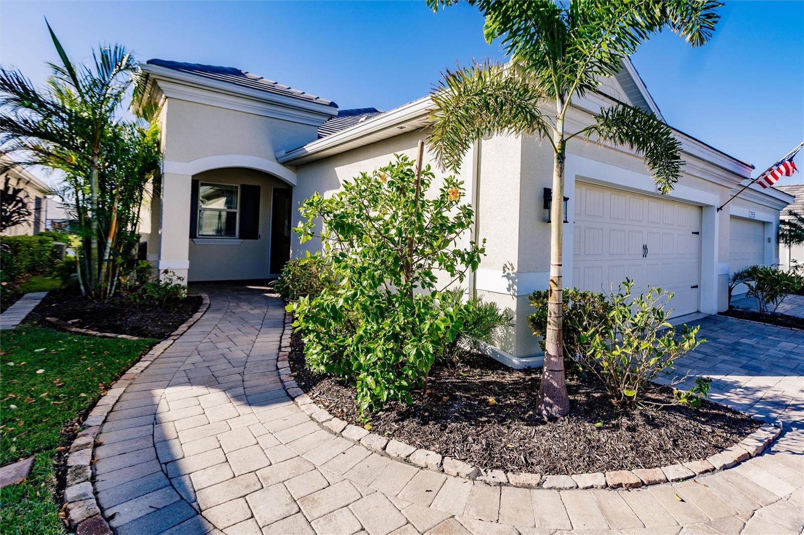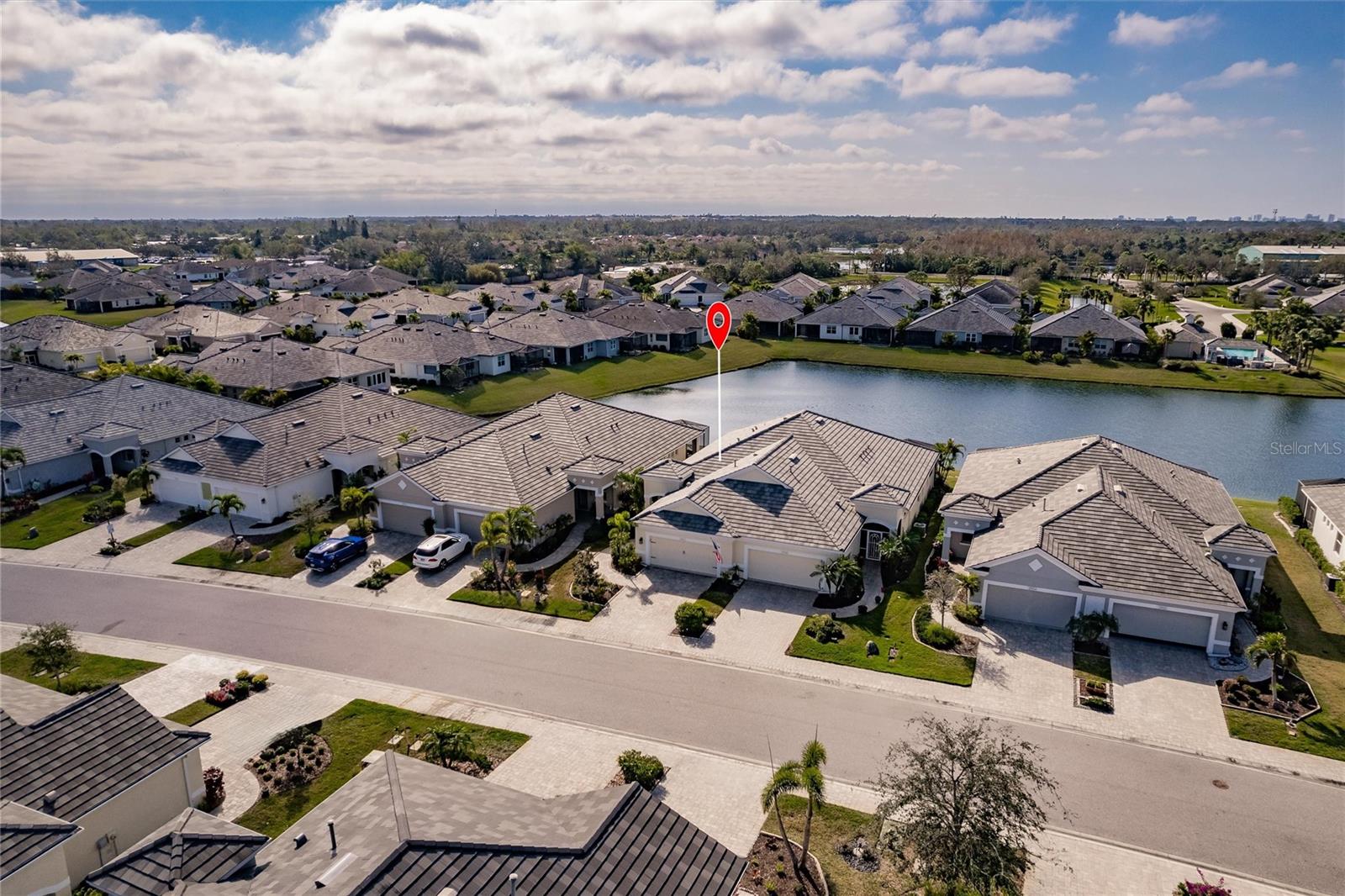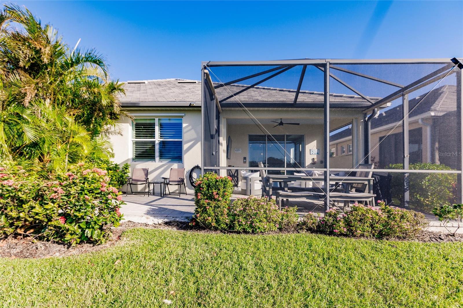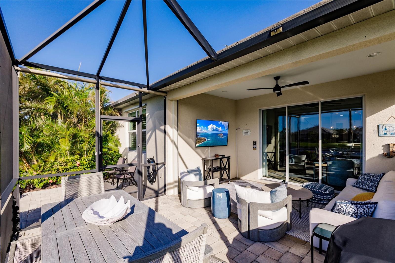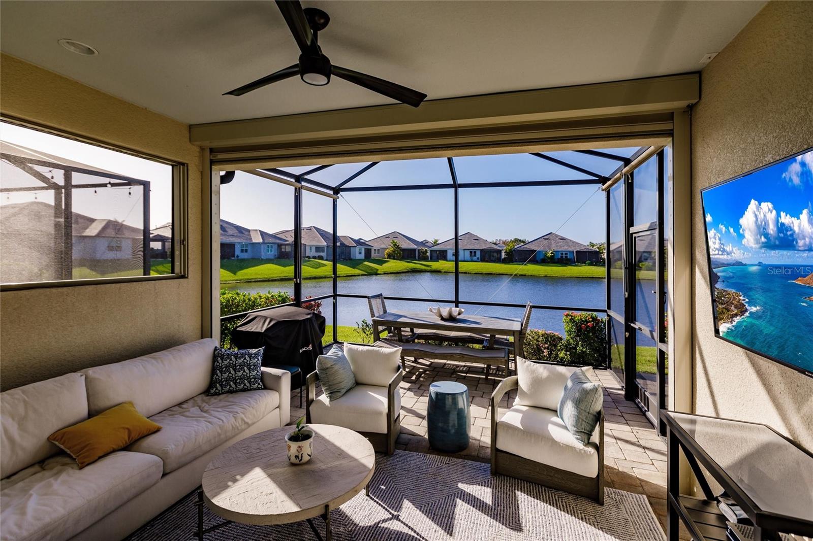 Experience resort-style living at its finest in the highly sought-after University Village, a gated, maintenance-free community. This meticulously maintained Anna Maria model offers the largest floor plan and breathtaking water views. With beautiful wood plank tile flooring throughout, a neutral color palette, and elegant finishes, this home is move-in ready—simply unpack and enjoy! The chef-inspired kitchen features an oversized center island with an extended bar top, providing abundant space for cooking and entertaining. The spacious family room boasts a wall of slider doors that open to an incredible outdoor living space, seamlessly blending indoor and outdoor relaxation. Step outside and indulge in your private oasis, complete with a screened-in covered patio, ceiling fan, mounted TV, custom blinds, and a remote-controlled hurricane shutter for peace of mind. The expansive primary suite offers tray ceilings, a luxurious ensuite bathroom with dual closets featuring built-in shelving, an oversized walk-in shower with a frameless glass enclosure, dual sink vanities, and a separate water closet for added privacy. The generously sized second bedroom is conveniently located near the hall bathroom, offering ideal separation from the primary suite. The versatile den is enhanced with a stylish sliding barn door and a Murphy bed, perfect for accommodating guests or creating an office space. The two-car garage is a standout, featuring polyaspartic flooring, overhead storage racks, and custom cabinetry for optimal organization. Enjoy year-round access to the heated community pool and take advantage of the private dog park. University Village offers the added benefit of no CDD fees and is perfectly situated just minutes from SRQ Airport. Enjoy easy access to pristine white-sand beaches, world-class dining, premier shopping, and Desantis Park, which features pickleball courts, scenic walking trails, and playgrounds.