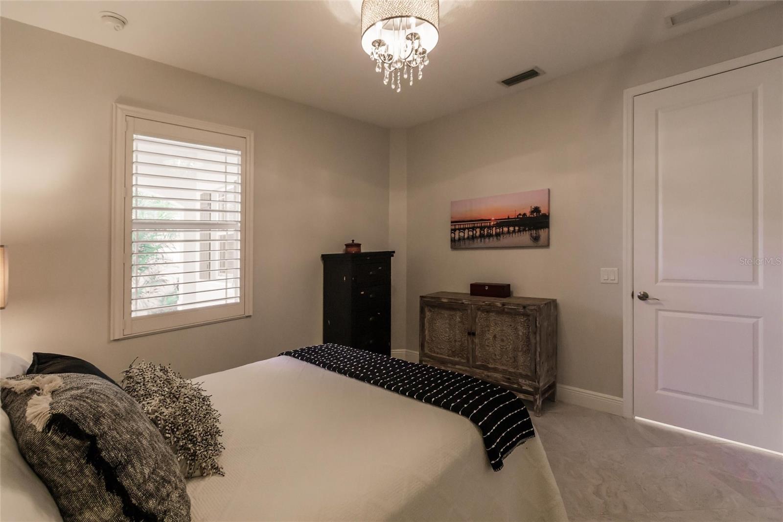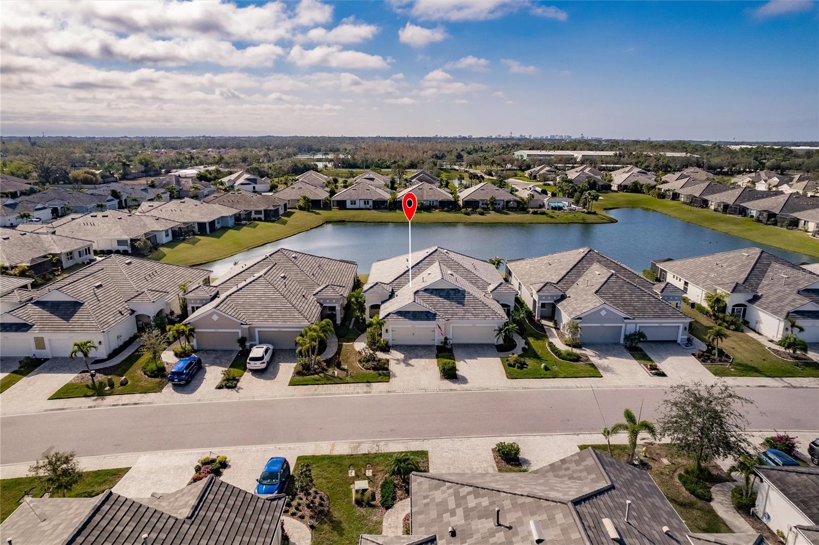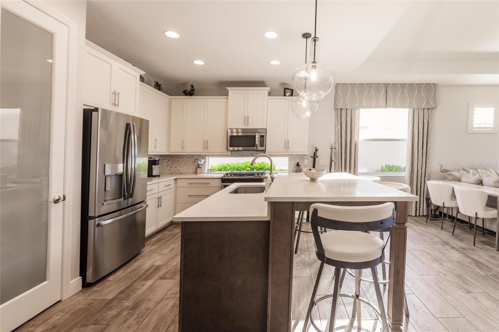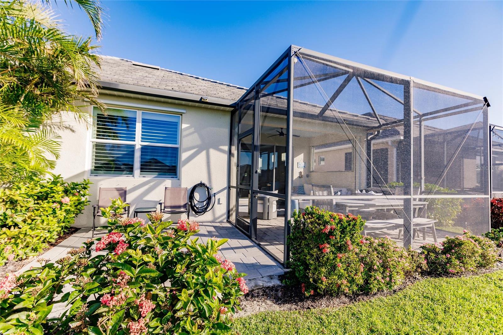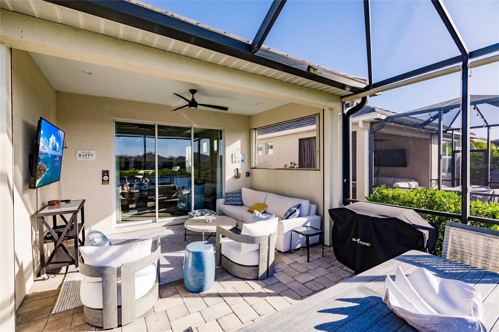 Experience resort-style living at its finest in the highly sought-after University Village, a gated, maintenance-free community. This meticulously maintained Anna Maria model offers the largest floor plan and breathtaking water views. With beautiful wood plank tile flooring throughout, a neutral color palette, and elegant finishes, this home is move-in ready—simply unpack and enjoy! The chef-inspired kitchen features an oversized center island with an extended bar top, providing abundant space for cooking and entertaining. The spacious family room boasts a wall of slider doors that open to an incredible outdoor living space, seamlessly blending indoor and outdoor relaxation. Step outside and indulge in your private oasis, complete with a screened-in covered patio, ceiling fan, mounted TV, custom blinds, and a remote-controlled hurricane shutter for peace of mind. The expansive primary suite offers tray ceilings, a luxurious ensuite bathroom with dual closets featuring built-in shelving, an oversized walk-in shower with a frameless glass enclosure, dual sink vanities, and a separate water closet for added privacy. The generously sized second bedroom is conveniently located near the hall bathroom, offering ideal separation from the primary suite. The versatile den is enhanced with a stylish sliding barn door and a Murphy bed, perfect for accommodating guests or creating an office space. The two-car garage is a standout, featuring polyaspartic flooring, overhead storage racks, and custom cabinetry for optimal organization. Enjoy year-round access to the heated community pool and take advantage of the private dog park. University Village offers the added benefit of no CDD fees and is perfectly situated just minutes from SRQ Airport. Enjoy easy access to pristine white-sand beaches, world-class dining, premier shopping, and Desantis Park, which features pickleball courts, scenic walking trails, and playgrounds.