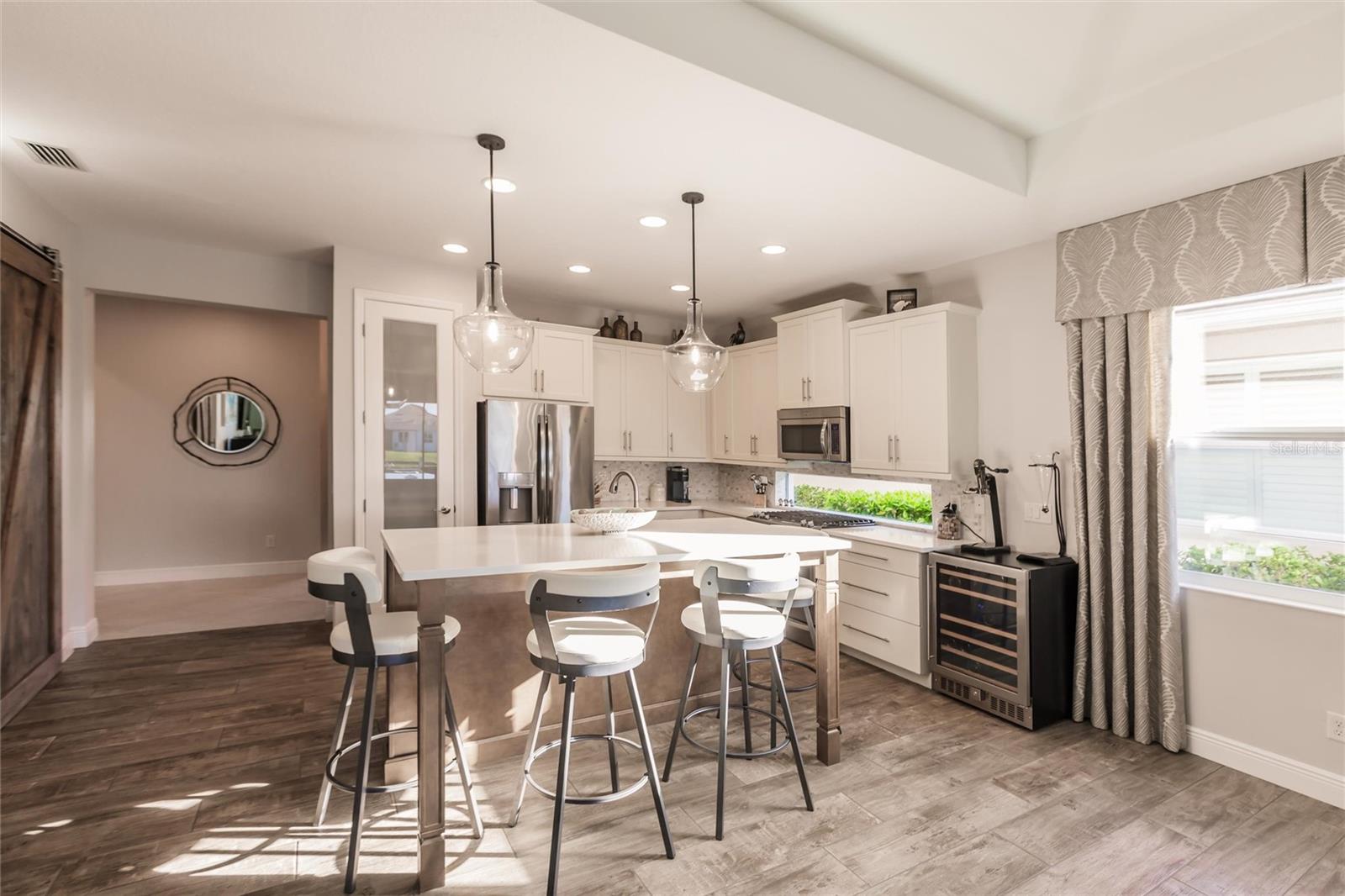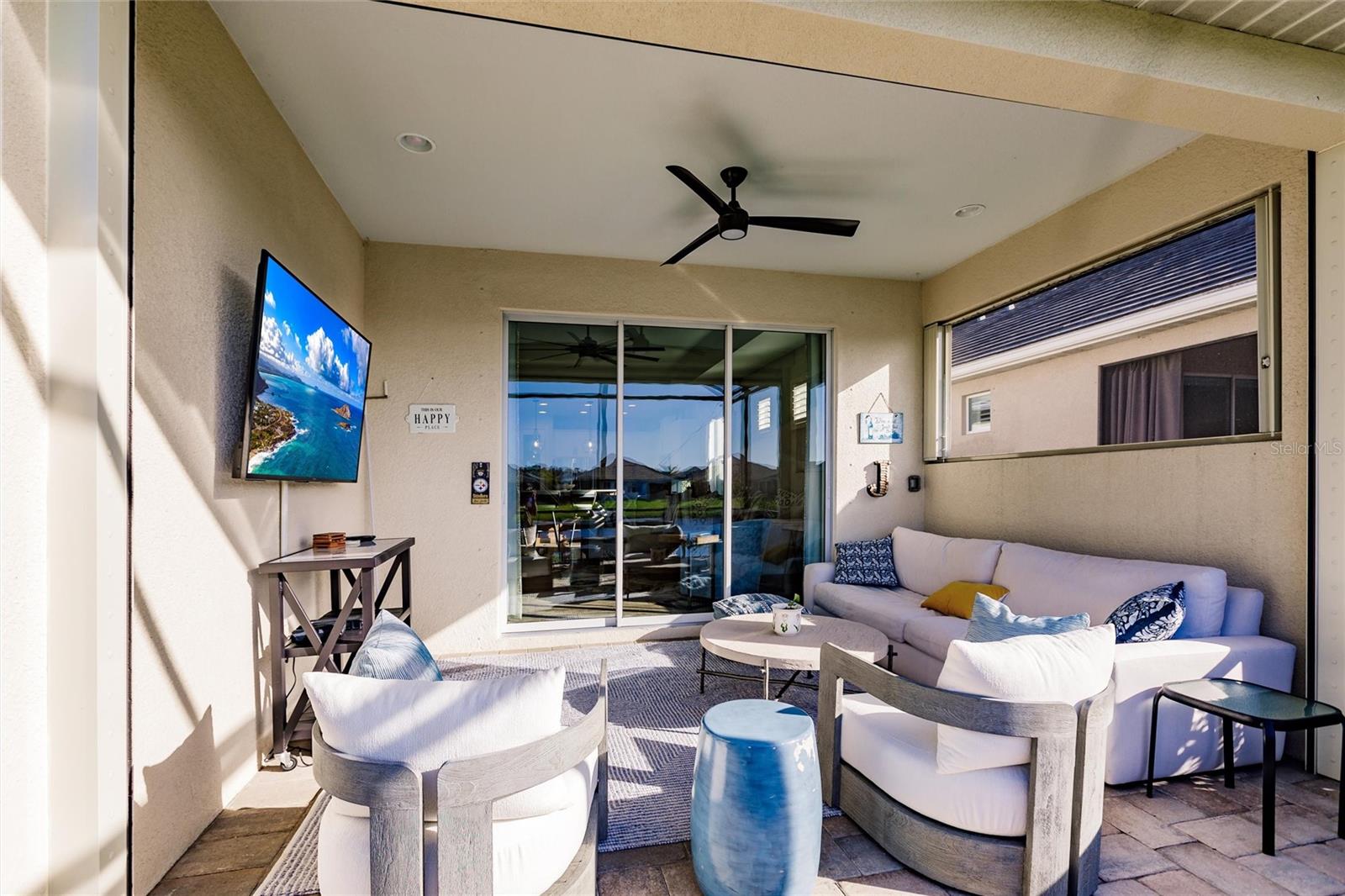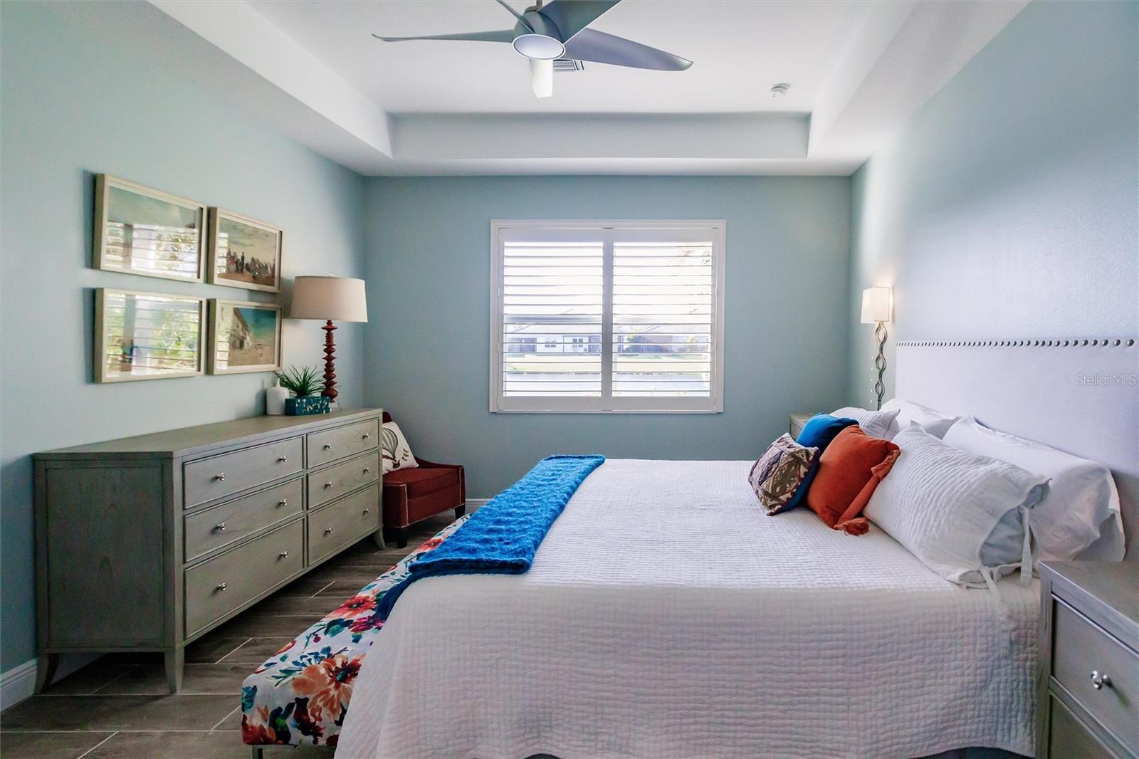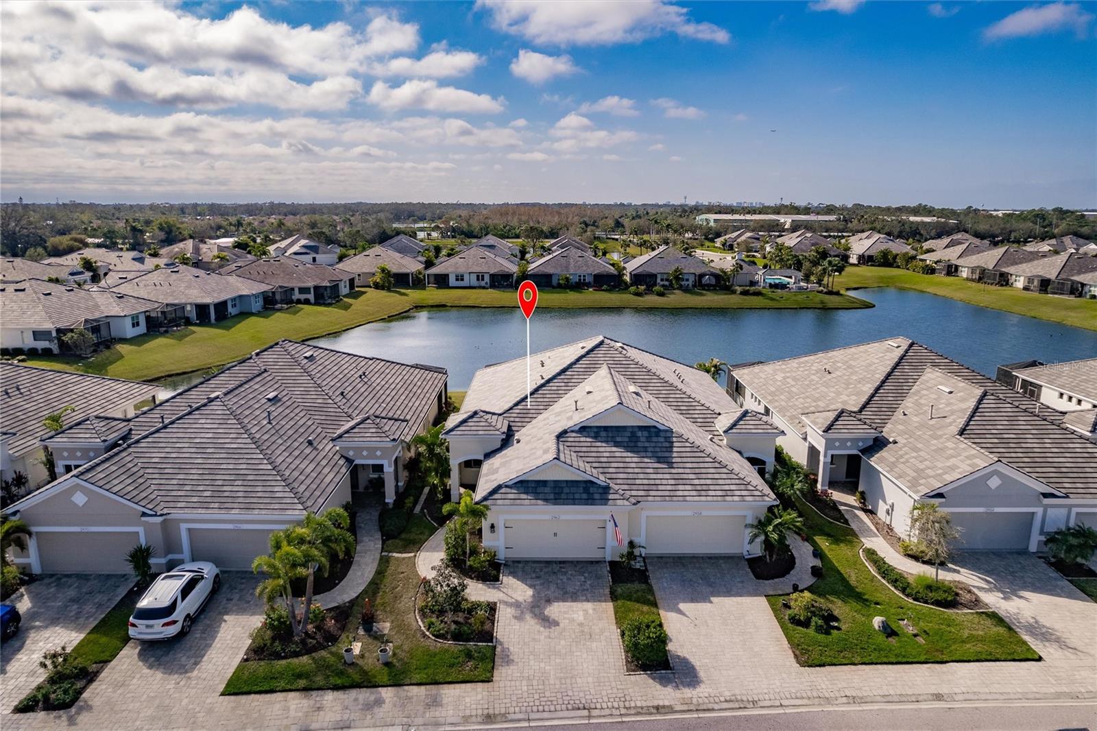 Experience resort-style living at its finest in the highly sought-after University Village, a gated, maintenance-free community. This meticulously maintained Anna Maria model offers the largest floor plan and breathtaking water views. With beautiful wood plank tile flooring throughout, a neutral color palette, and elegant finishes, this home is move-in ready—simply unpack and enjoy! The chef-inspired kitchen features an oversized center island with an extended bar top, providing abundant space for cooking and entertaining. The spacious family room boasts a wall of slider doors that open to an incredible outdoor living space, seamlessly blending indoor and outdoor relaxation. Step outside and indulge in your private oasis, complete with a screened-in covered patio, ceiling fan, mounted TV, custom blinds, and a remote-controlled hurricane shutter for peace of mind. The expansive primary suite offers tray ceilings, a luxurious ensuite bathroom with dual closets featuring built-in shelving, an oversized walk-in shower with a frameless glass enclosure, dual sink vanities, and a separate water closet for added privacy. The generously sized second bedroom is conveniently located near the hall bathroom, offering ideal separation from the primary suite. The versatile den is enhanced with a stylish sliding barn door and a Murphy bed, perfect for accommodating guests or creating an office space. The two-car garage is a standout, featuring polyaspartic flooring, overhead storage racks, and custom cabinetry for optimal organization. Enjoy year-round access to the heated community pool and take advantage of the private dog park. University Village offers the added benefit of no CDD fees and is perfectly situated just minutes from SRQ Airport. Enjoy easy access to pristine white-sand beaches, world-class dining, premier shopping, and Desantis Park, which features pickleball courts, scenic walking trails, and playgrounds.