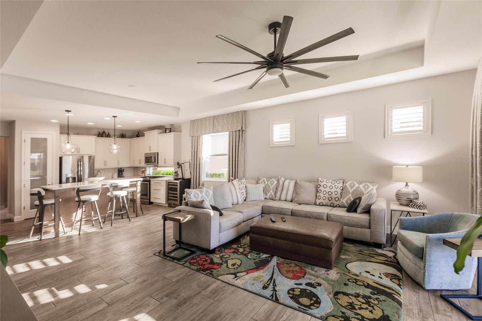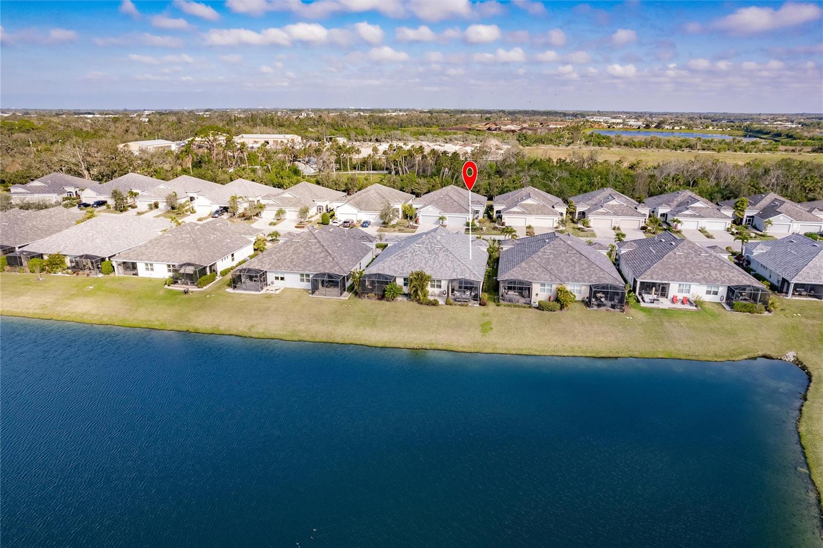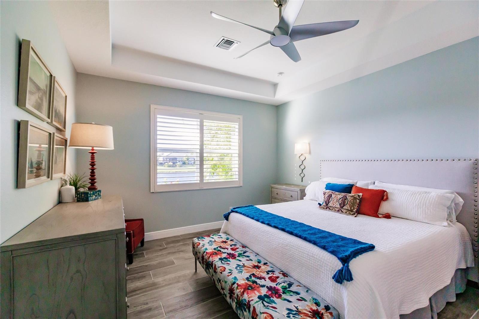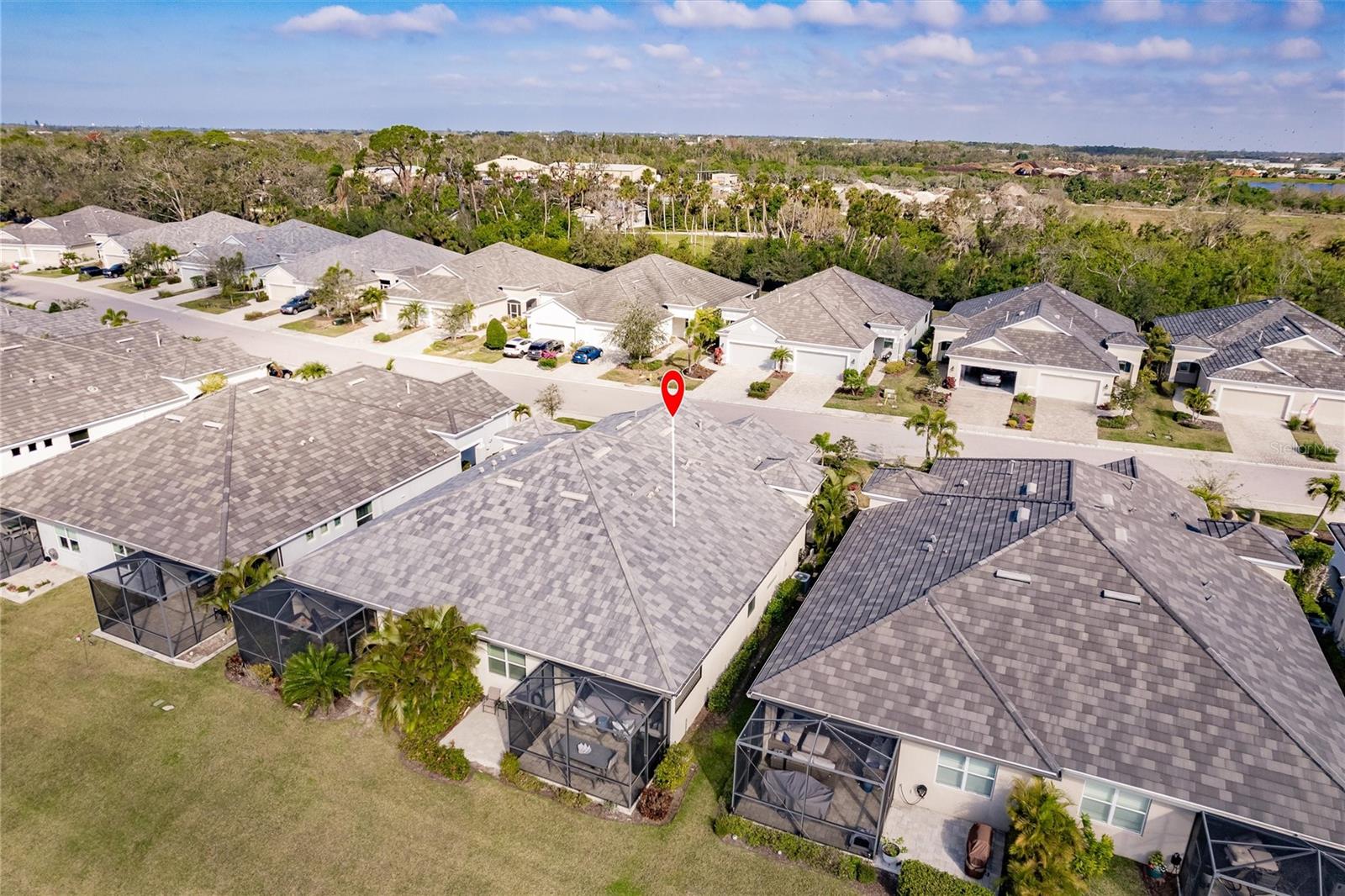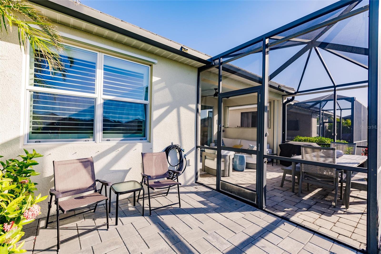 Experience resort-style living at its finest in the highly sought-after University Village, a gated, maintenance-free community. This meticulously maintained Anna Maria model offers the largest floor plan and breathtaking water views. With beautiful wood plank tile flooring throughout, a neutral color palette, and elegant finishes, this home is move-in ready—simply unpack and enjoy! The chef-inspired kitchen features an oversized center island with an extended bar top, providing abundant space for cooking and entertaining. The spacious family room boasts a wall of slider doors that open to an incredible outdoor living space, seamlessly blending indoor and outdoor relaxation. Step outside and indulge in your private oasis, complete with a screened-in covered patio, ceiling fan, mounted TV, custom blinds, and a remote-controlled hurricane shutter for peace of mind. The expansive primary suite offers tray ceilings, a luxurious ensuite bathroom with dual closets featuring built-in shelving, an oversized walk-in shower with a frameless glass enclosure, dual sink vanities, and a separate water closet for added privacy. The generously sized second bedroom is conveniently located near the hall bathroom, offering ideal separation from the primary suite. The versatile den is enhanced with a stylish sliding barn door and a Murphy bed, perfect for accommodating guests or creating an office space. The two-car garage is a standout, featuring polyaspartic flooring, overhead storage racks, and custom cabinetry for optimal organization. Enjoy year-round access to the heated community pool and take advantage of the private dog park. University Village offers the added benefit of no CDD fees and is perfectly situated just minutes from SRQ Airport. Enjoy easy access to pristine white-sand beaches, world-class dining, premier shopping, and Desantis Park, which features pickleball courts, scenic walking trails, and playgrounds.