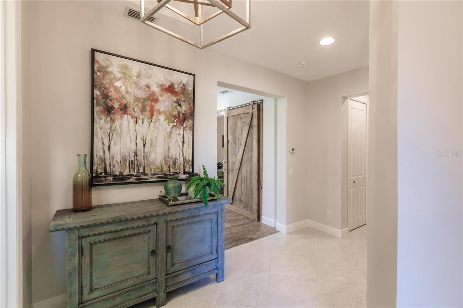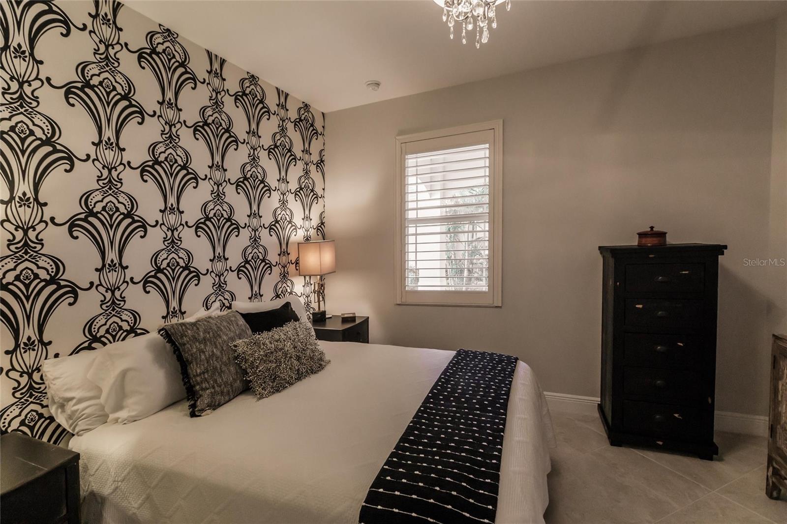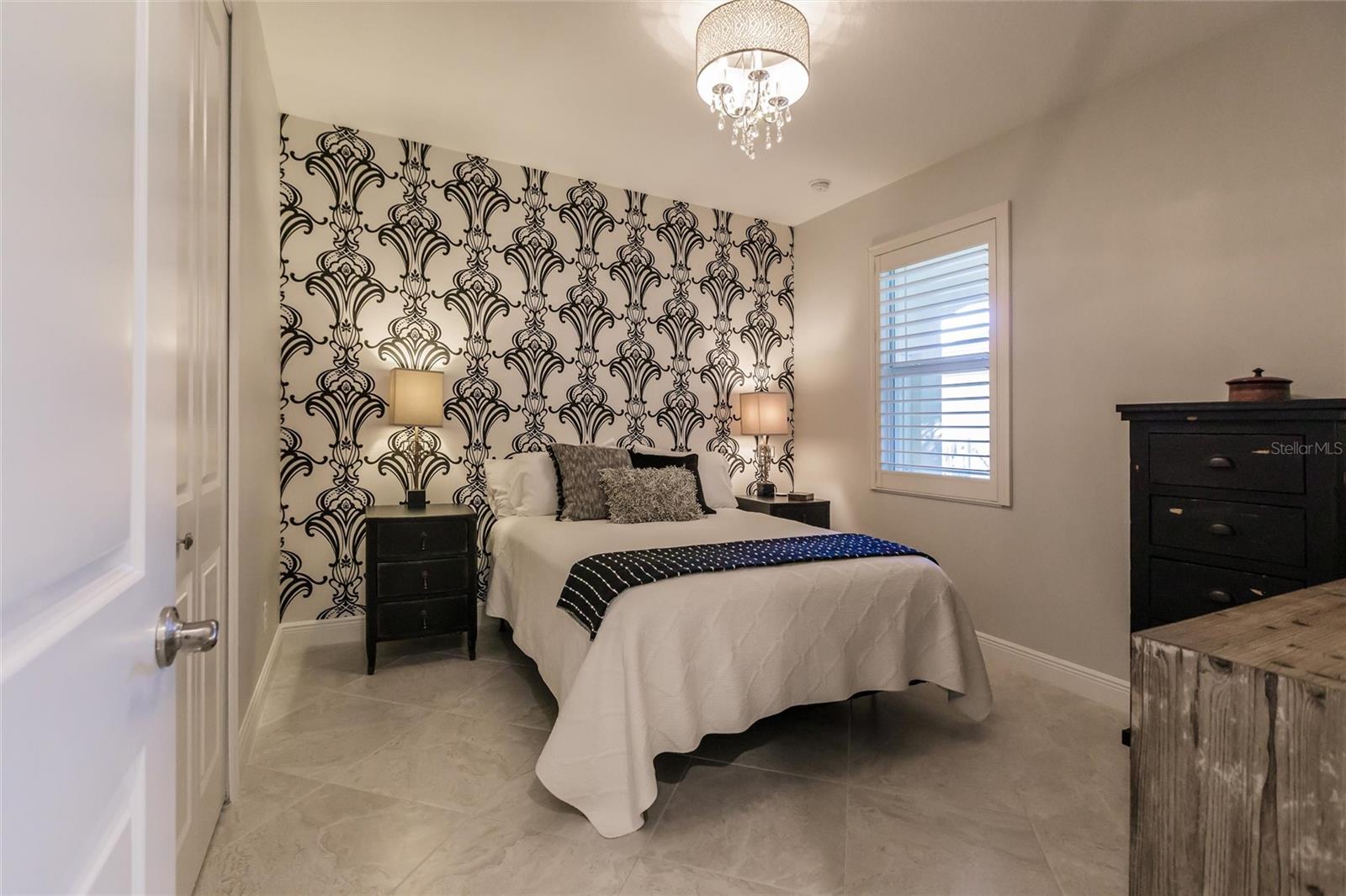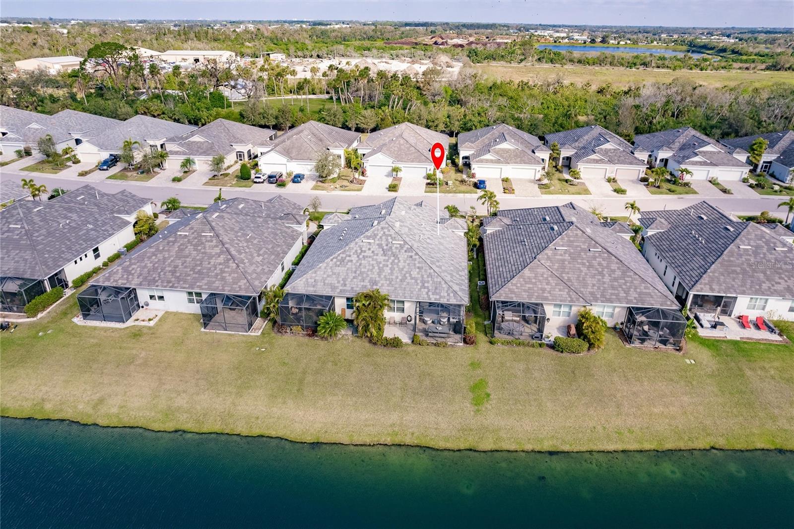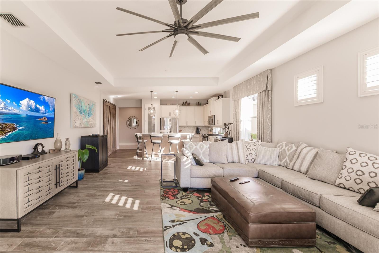 Experience resort-style living at its finest in the highly sought-after University Village, a gated, maintenance-free community. This meticulously maintained Anna Maria model offers the largest floor plan and breathtaking water views. With beautiful wood plank tile flooring throughout, a neutral color palette, and elegant finishes, this home is move-in ready—simply unpack and enjoy! The chef-inspired kitchen features an oversized center island with an extended bar top, providing abundant space for cooking and entertaining. The spacious family room boasts a wall of slider doors that open to an incredible outdoor living space, seamlessly blending indoor and outdoor relaxation. Step outside and indulge in your private oasis, complete with a screened-in covered patio, ceiling fan, mounted TV, custom blinds, and a remote-controlled hurricane shutter for peace of mind. The expansive primary suite offers tray ceilings, a luxurious ensuite bathroom with dual closets featuring built-in shelving, an oversized walk-in shower with a frameless glass enclosure, dual sink vanities, and a separate water closet for added privacy. The generously sized second bedroom is conveniently located near the hall bathroom, offering ideal separation from the primary suite. The versatile den is enhanced with a stylish sliding barn door and a Murphy bed, perfect for accommodating guests or creating an office space. The two-car garage is a standout, featuring polyaspartic flooring, overhead storage racks, and custom cabinetry for optimal organization. Enjoy year-round access to the heated community pool and take advantage of the private dog park. University Village offers the added benefit of no CDD fees and is perfectly situated just minutes from SRQ Airport. Enjoy easy access to pristine white-sand beaches, world-class dining, premier shopping, and Desantis Park, which features pickleball courts, scenic walking trails, and playgrounds.
