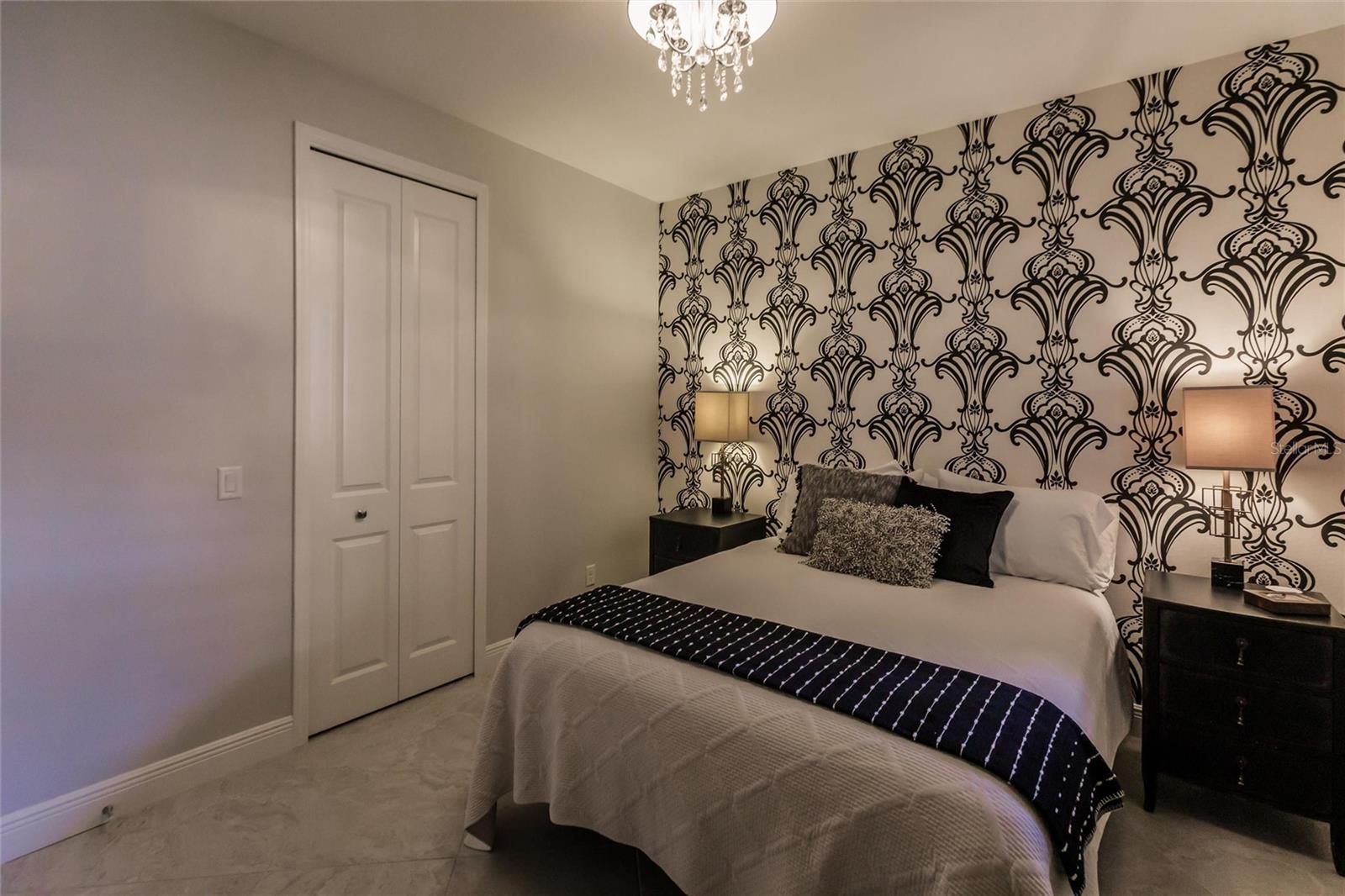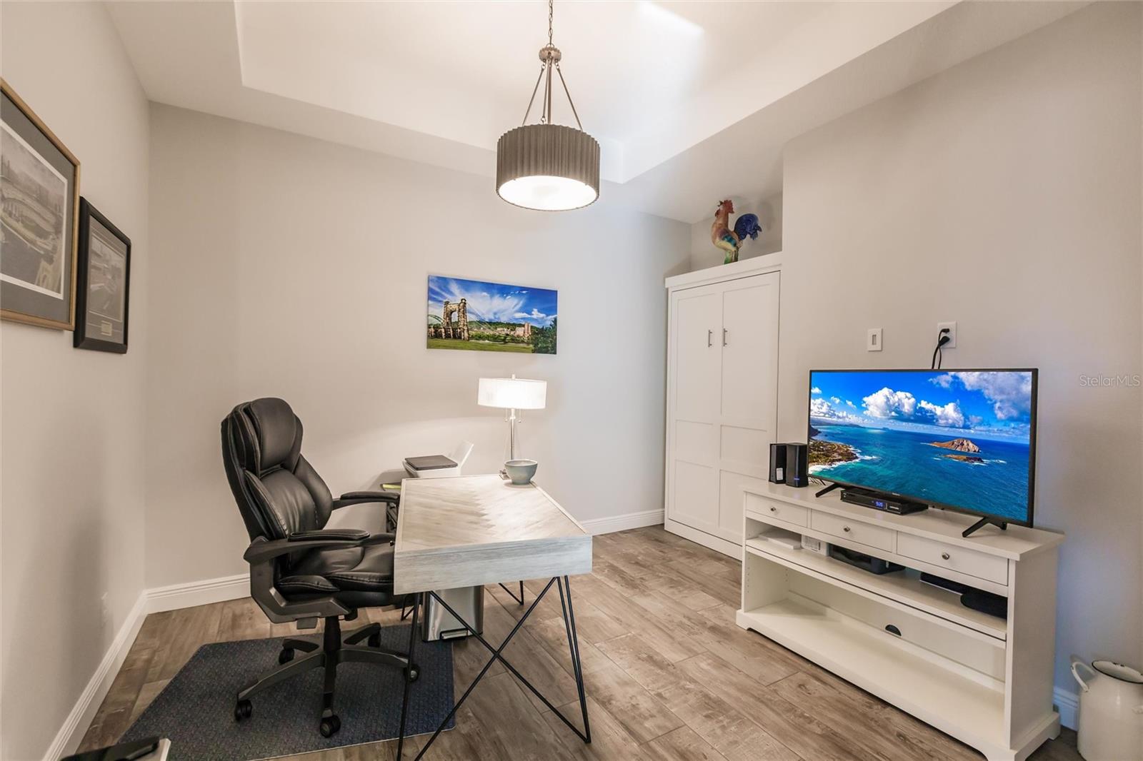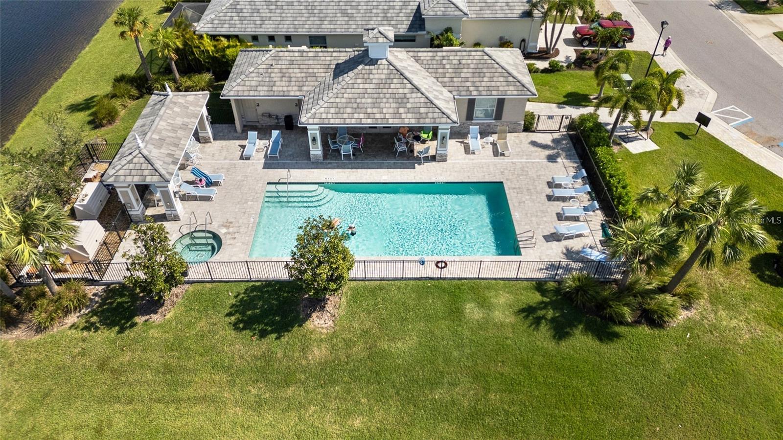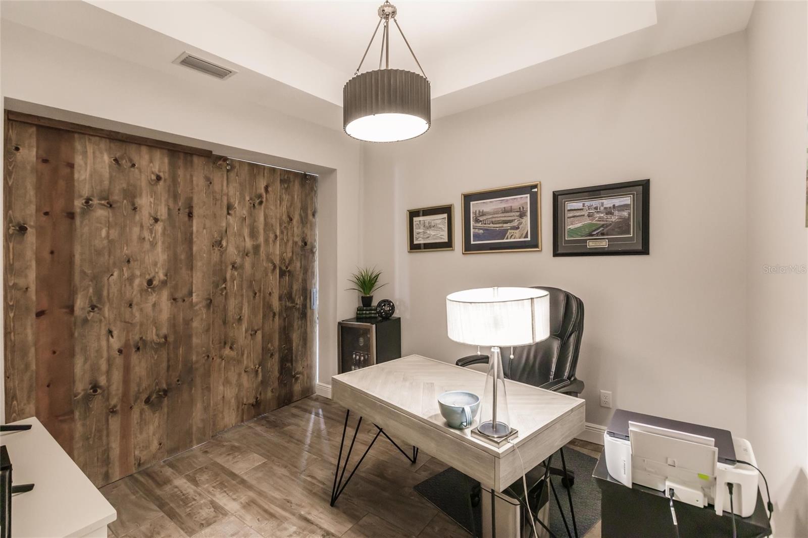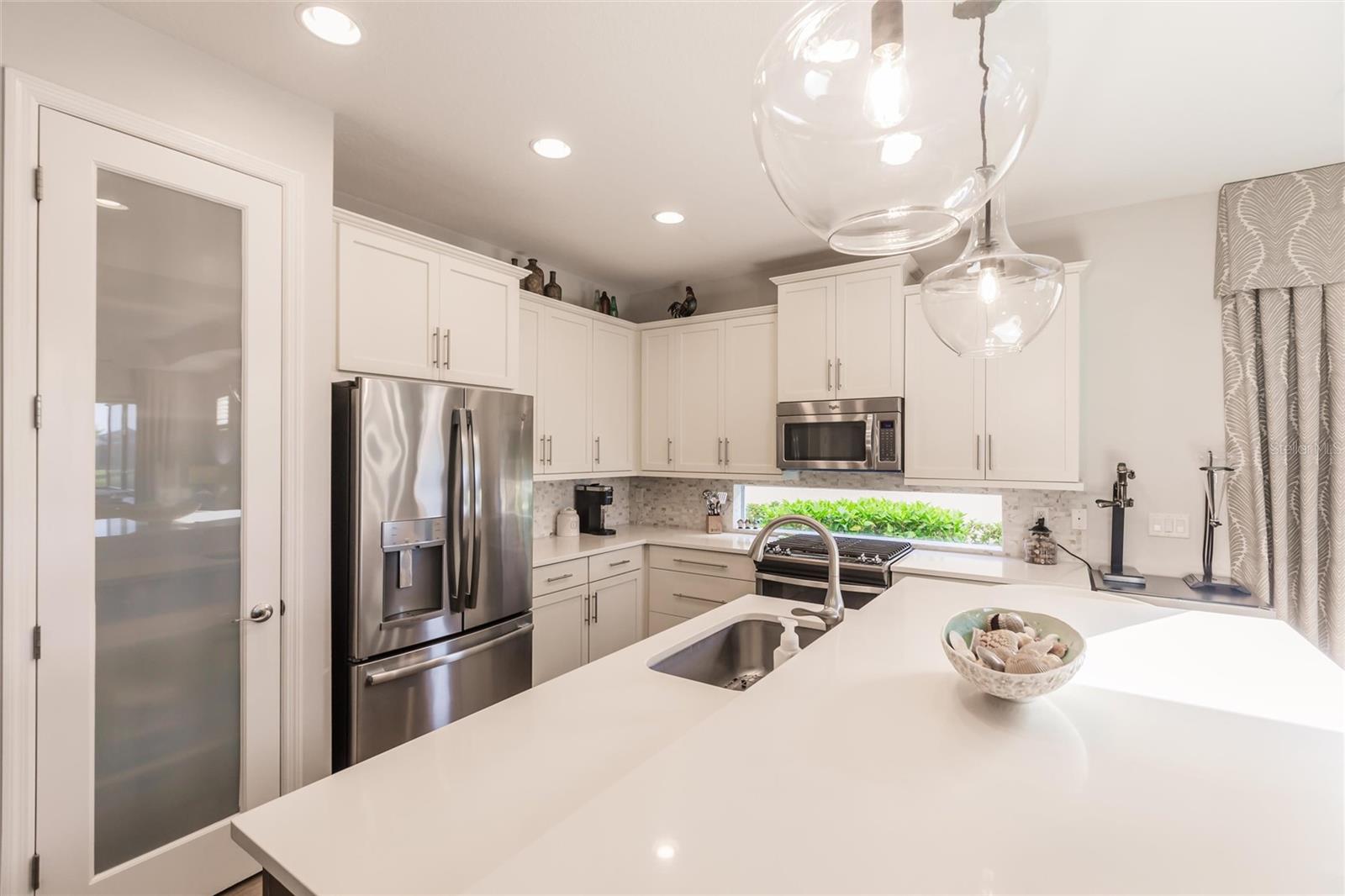 Experience resort-style living at its finest in the highly sought-after University Village, a gated, maintenance-free community. This meticulously maintained Anna Maria model offers the largest floor plan and breathtaking water views. With beautiful wood plank tile flooring throughout, a neutral color palette, and elegant finishes, this home is move-in ready—simply unpack and enjoy! The chef-inspired kitchen features an oversized center island with an extended bar top, providing abundant space for cooking and entertaining. The spacious family room boasts a wall of slider doors that open to an incredible outdoor living space, seamlessly blending indoor and outdoor relaxation. Step outside and indulge in your private oasis, complete with a screened-in covered patio, ceiling fan, mounted TV, custom blinds, and a remote-controlled hurricane shutter for peace of mind. The expansive primary suite offers tray ceilings, a luxurious ensuite bathroom with dual closets featuring built-in shelving, an oversized walk-in shower with a frameless glass enclosure, dual sink vanities, and a separate water closet for added privacy. The generously sized second bedroom is conveniently located near the hall bathroom, offering ideal separation from the primary suite. The versatile den is enhanced with a stylish sliding barn door and a Murphy bed, perfect for accommodating guests or creating an office space. The two-car garage is a standout, featuring polyaspartic flooring, overhead storage racks, and custom cabinetry for optimal organization. Enjoy year-round access to the heated community pool and take advantage of the private dog park. University Village offers the added benefit of no CDD fees and is perfectly situated just minutes from SRQ Airport. Enjoy easy access to pristine white-sand beaches, world-class dining, premier shopping, and Desantis Park, which features pickleball courts, scenic walking trails, and playgrounds.