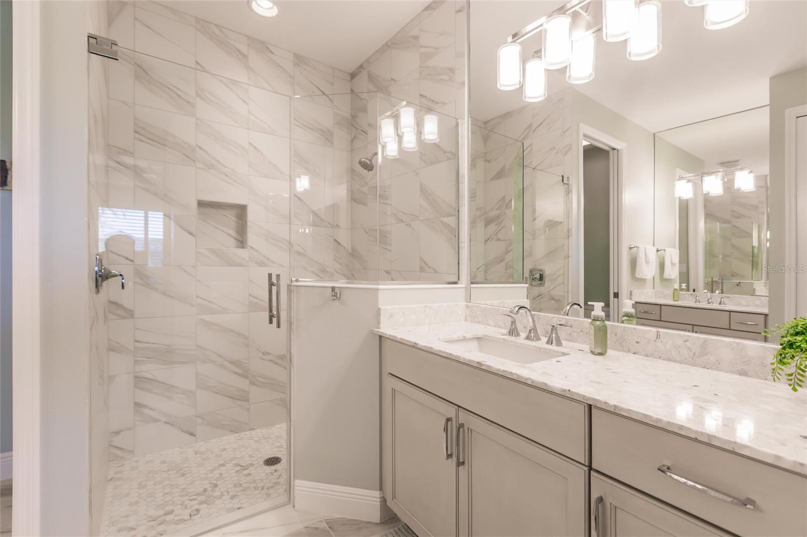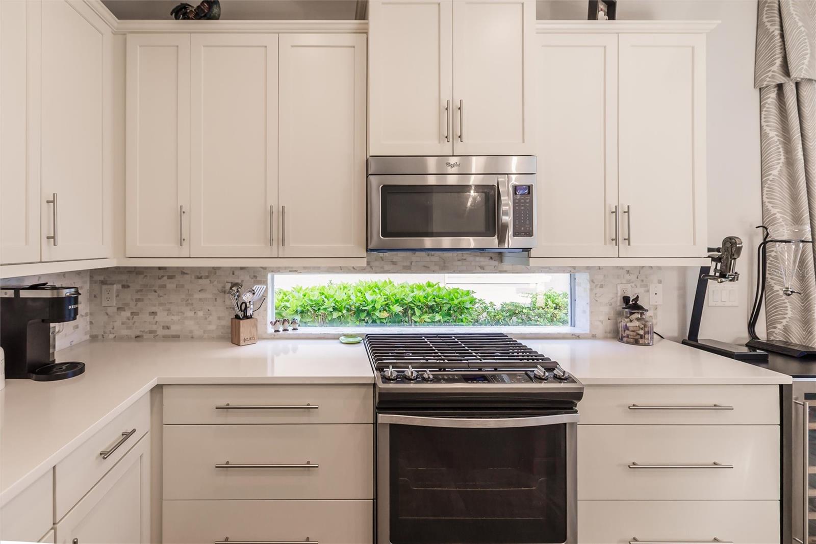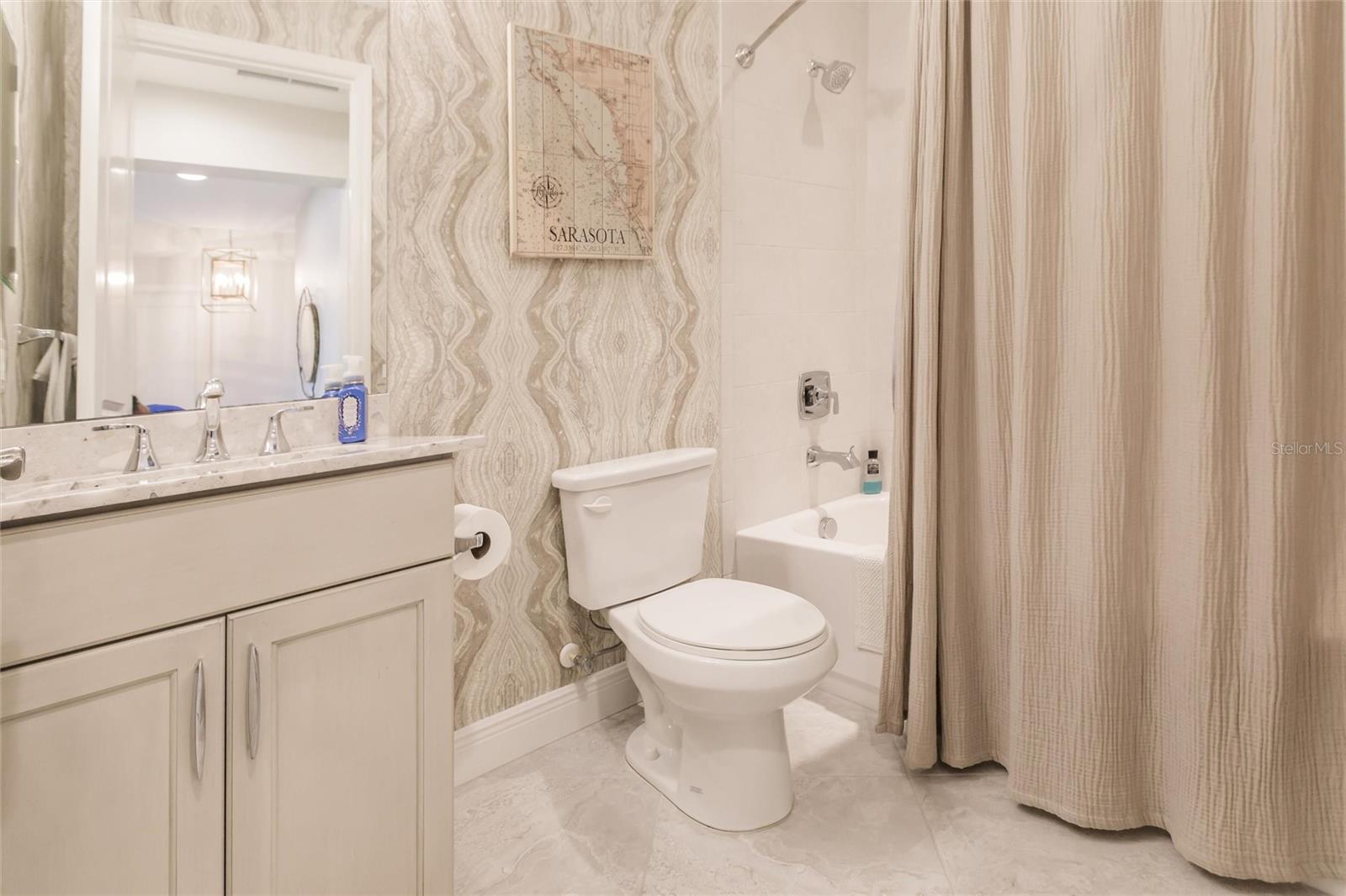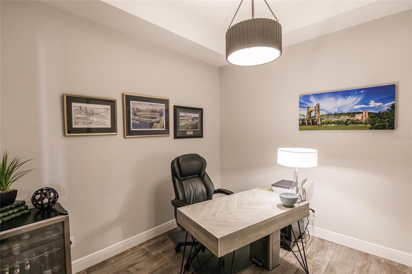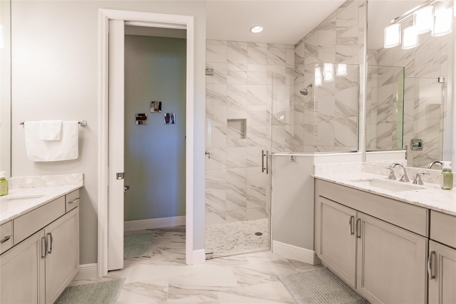 Experience resort-style living at its finest in the highly sought-after University Village, a gated, maintenance-free community. This meticulously maintained Anna Maria model offers the largest floor plan and breathtaking water views. With beautiful wood plank tile flooring throughout, a neutral color palette, and elegant finishes, this home is move-in ready—simply unpack and enjoy! The chef-inspired kitchen features an oversized center island with an extended bar top, providing abundant space for cooking and entertaining. The spacious family room boasts a wall of slider doors that open to an incredible outdoor living space, seamlessly blending indoor and outdoor relaxation. Step outside and indulge in your private oasis, complete with a screened-in covered patio, ceiling fan, mounted TV, custom blinds, and a remote-controlled hurricane shutter for peace of mind. The expansive primary suite offers tray ceilings, a luxurious ensuite bathroom with dual closets featuring built-in shelving, an oversized walk-in shower with a frameless glass enclosure, dual sink vanities, and a separate water closet for added privacy. The generously sized second bedroom is conveniently located near the hall bathroom, offering ideal separation from the primary suite. The versatile den is enhanced with a stylish sliding barn door and a Murphy bed, perfect for accommodating guests or creating an office space. The two-car garage is a standout, featuring polyaspartic flooring, overhead storage racks, and custom cabinetry for optimal organization. Enjoy year-round access to the heated community pool and take advantage of the private dog park. University Village offers the added benefit of no CDD fees and is perfectly situated just minutes from SRQ Airport. Enjoy easy access to pristine white-sand beaches, world-class dining, premier shopping, and Desantis Park, which features pickleball courts, scenic walking trails, and playgrounds.