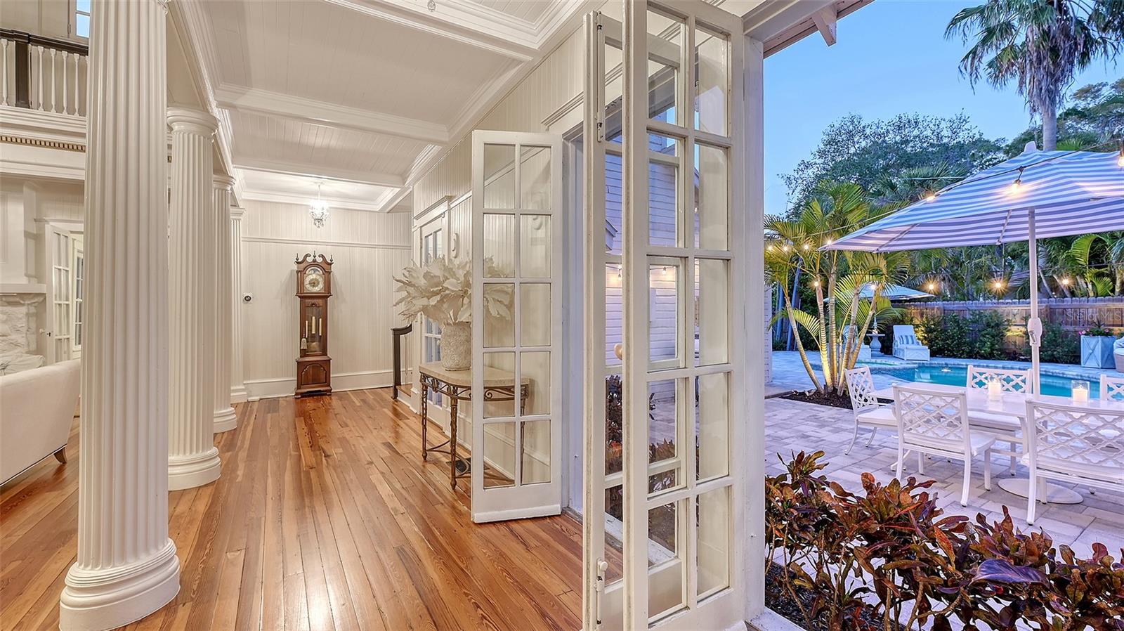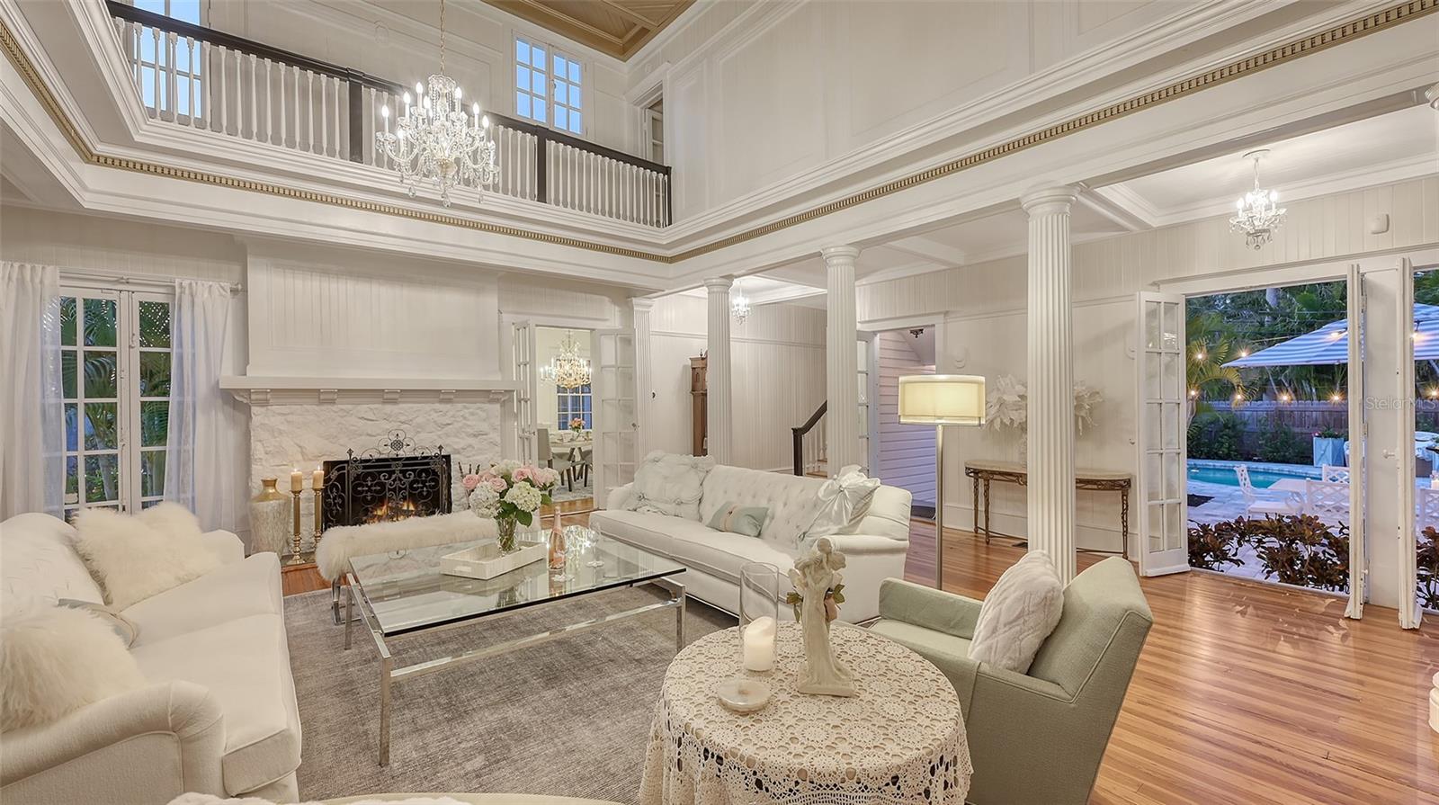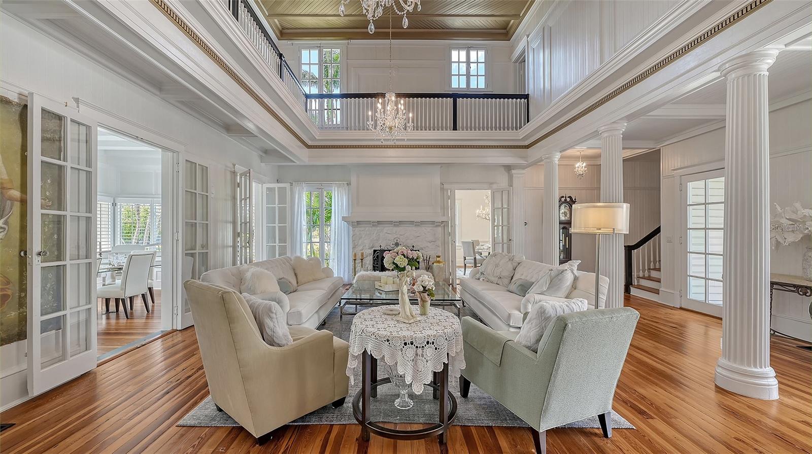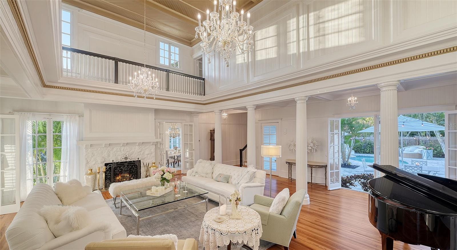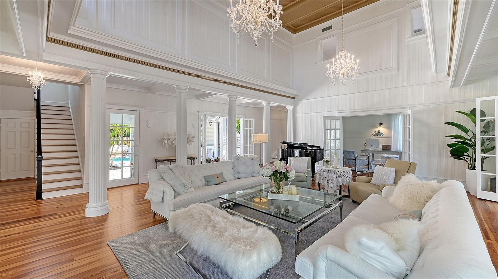 Step into history and timeless elegance at the House of Ringling, a landmark estate in Sarasota's coveted Whitfield Estates, built in 1918 for Alfred Ringling of the legendary Ringling Brothers. Spanning 4,782+/- sq. ft., this 5BR, 4.5BA masterpiece seamlessly marries Gilded Age opulence with modern luxury. A red brick walkway and expansive front lawn welcome you to this architectural treasure, where an oversized Grand Ballroom with a 21-foot ceiling, Venetian columns and a Renaissance-style coffered ceiling create an awe-inspiring focal point. Original pine floors, 12-inch baseboards and hand-poured antique glass in French windows and doors preserve the estate’s rich craftsmanship, as the reimagined chef’s kitchen is a showpiece, featuring Big Chill appliances, an 8-burner gas stove, Quartzite surfaces, a mother-of-pearl backsplash and backlit cabinets. The primary suite on the lower level offers floor-to-ceiling French doors opening to a private porch and the expansive pool deck. Upstairs, 2 ensuite bedrooms feature partial bay views. Hidden details, including a prohibition-era speakeasy/3rd bedroom at the top of the stairs and a secret room, add intrigue and charm. The home’s walls, crafted from Ringling railway car paneling, echo its storied past. Recent updates, including new plumbing, electrical, HVAC (5 units), and a new roof with extra tie-down straps, ensure modern comfort while preserving historic character. A detached 2-car garage and 2 driveways provide ample space, while the expansive Palm Beach-style courtyard invites relaxation. As one of the first Ringling Brothers homes in Sarasota, this estate offers a rare opportunity to own a living piece of history in a prime location near Sarasota Bay and downtown.