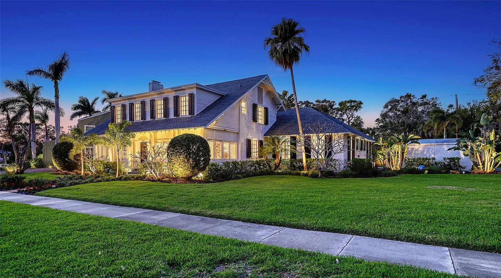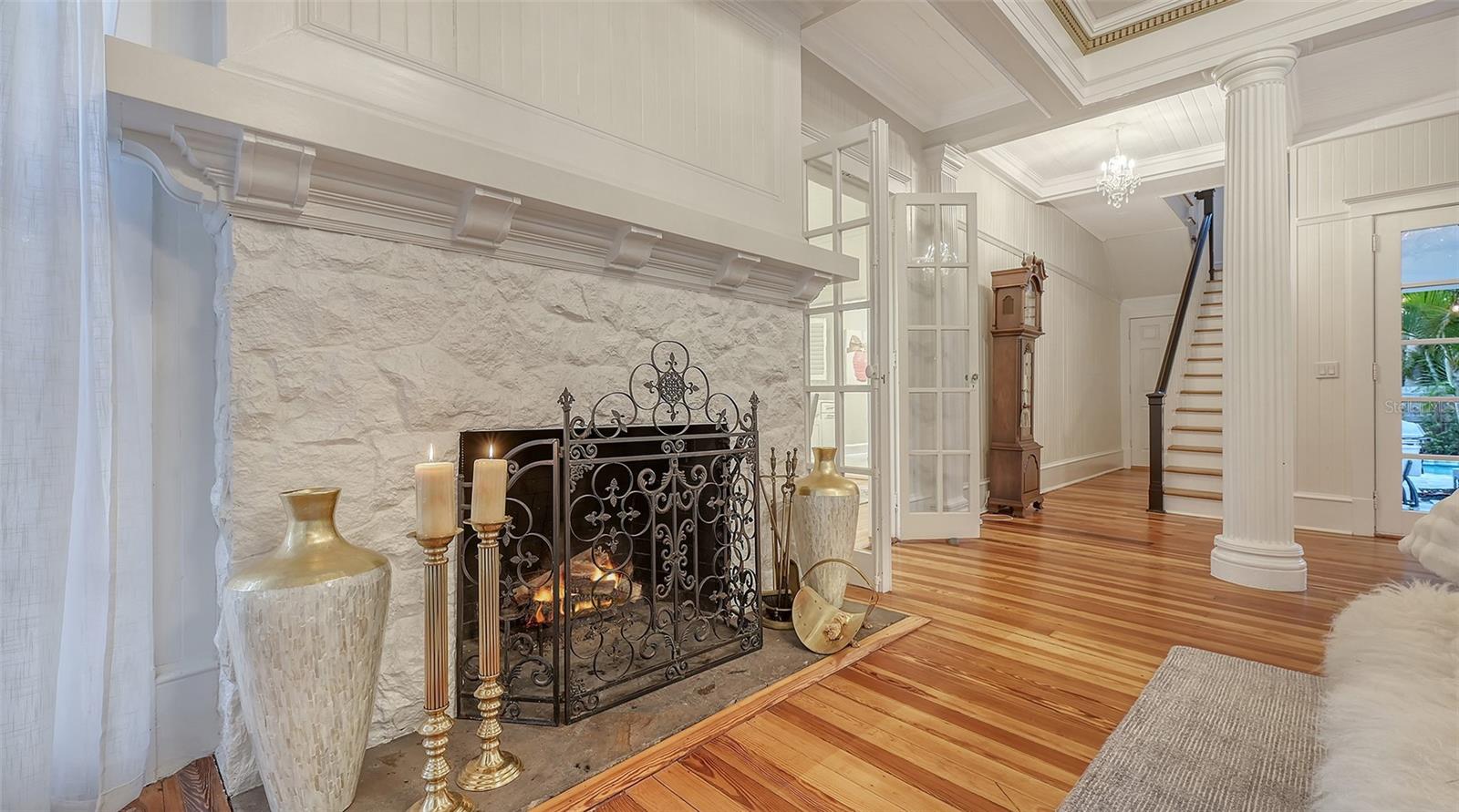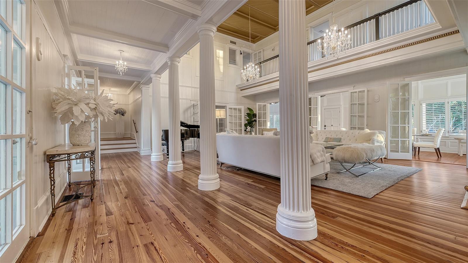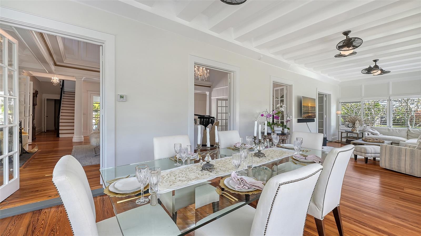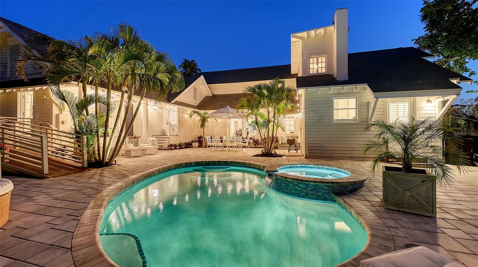 Step into history and timeless elegance at the House of Ringling, a landmark estate in Sarasota's coveted Whitfield Estates, built in 1918 for Alfred Ringling of the legendary Ringling Brothers. Spanning 4,782+/- sq. ft., this 5BR, 4.5BA masterpiece seamlessly marries Gilded Age opulence with modern luxury. A red brick walkway and expansive front lawn welcome you to this architectural treasure, where an oversized Grand Ballroom with a 21-foot ceiling, Venetian columns and a Renaissance-style coffered ceiling create an awe-inspiring focal point. Original pine floors, 12-inch baseboards and hand-poured antique glass in French windows and doors preserve the estate’s rich craftsmanship, as the reimagined chef’s kitchen is a showpiece, featuring Big Chill appliances, an 8-burner gas stove, Quartzite surfaces, a mother-of-pearl backsplash and backlit cabinets. The primary suite on the lower level offers floor-to-ceiling French doors opening to a private porch and the expansive pool deck. Upstairs, 2 ensuite bedrooms feature partial bay views. Hidden details, including a prohibition-era speakeasy/3rd bedroom at the top of the stairs and a secret room, add intrigue and charm. The home’s walls, crafted from Ringling railway car paneling, echo its storied past. Recent updates, including new plumbing, electrical, HVAC (5 units), and a new roof with extra tie-down straps, ensure modern comfort while preserving historic character. A detached 2-car garage and 2 driveways provide ample space, while the expansive Palm Beach-style courtyard invites relaxation. As one of the first Ringling Brothers homes in Sarasota, this estate offers a rare opportunity to own a living piece of history in a prime location near Sarasota Bay and downtown.