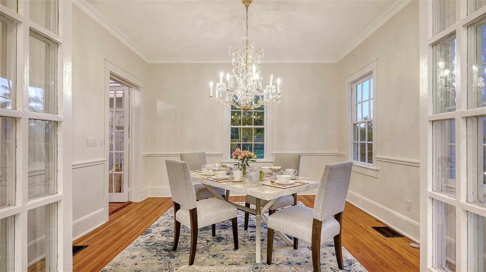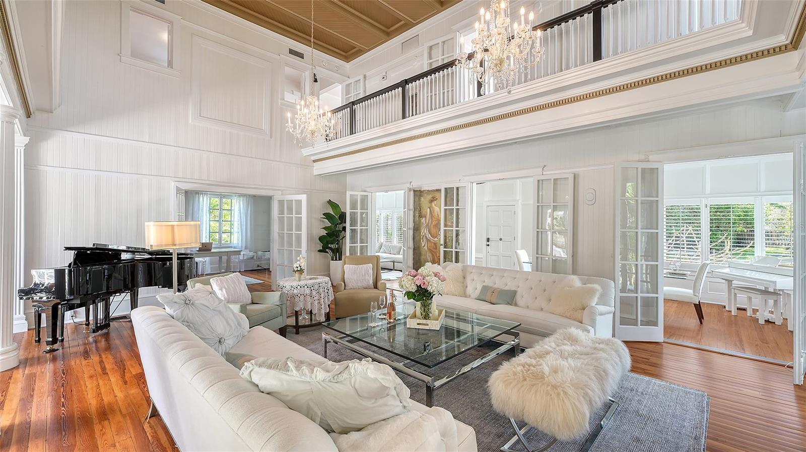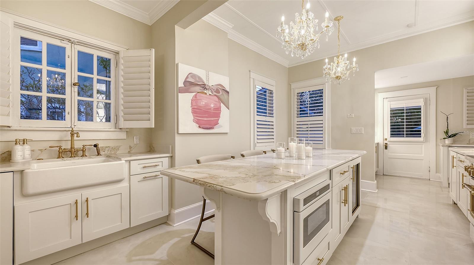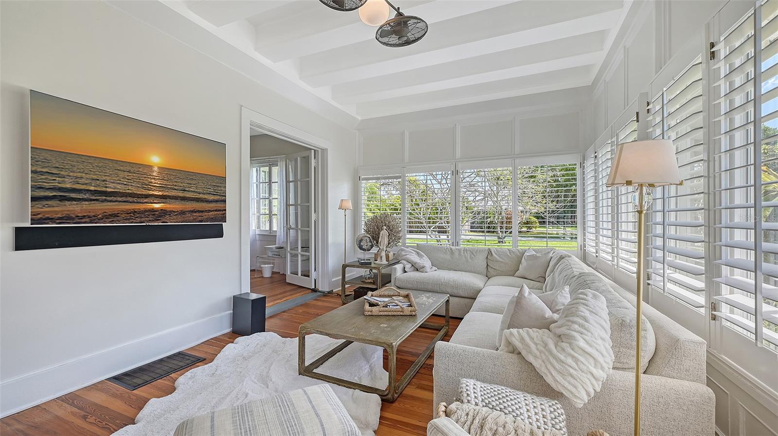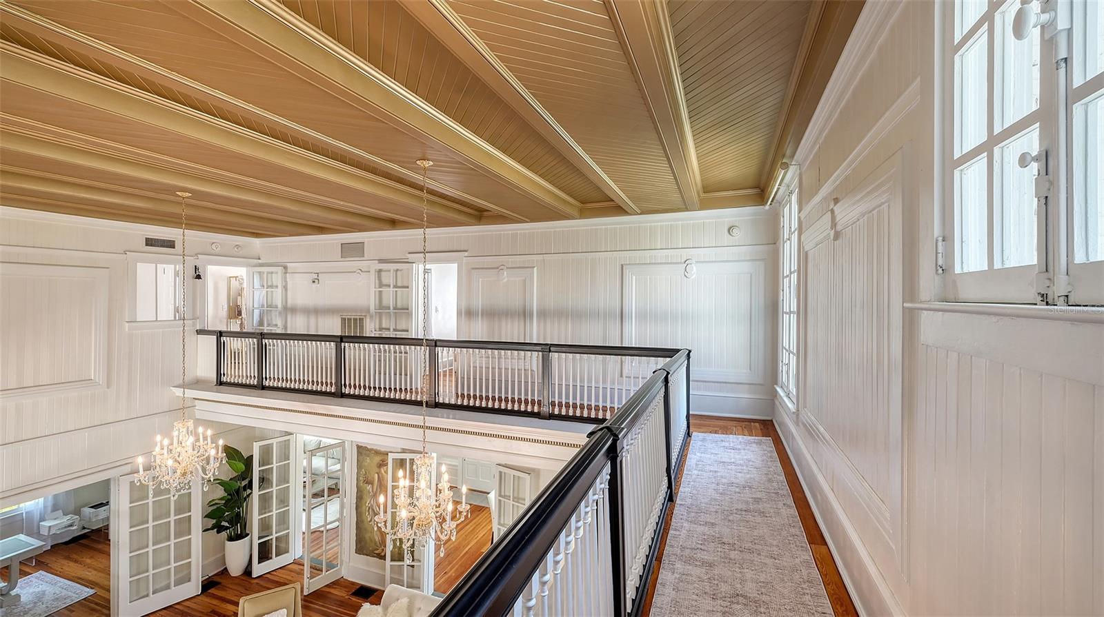 Step into history and timeless elegance at the House of Ringling, a landmark estate in Sarasota's coveted Whitfield Estates, built in 1918 for Alfred Ringling of the legendary Ringling Brothers. Spanning 4,782+/- sq. ft., this 5BR, 4.5BA masterpiece seamlessly marries Gilded Age opulence with modern luxury. A red brick walkway and expansive front lawn welcome you to this architectural treasure, where an oversized Grand Ballroom with a 21-foot ceiling, Venetian columns and a Renaissance-style coffered ceiling create an awe-inspiring focal point. Original pine floors, 12-inch baseboards and hand-poured antique glass in French windows and doors preserve the estate’s rich craftsmanship, as the reimagined chef’s kitchen is a showpiece, featuring Big Chill appliances, an 8-burner gas stove, Quartzite surfaces, a mother-of-pearl backsplash and backlit cabinets. The primary suite on the lower level offers floor-to-ceiling French doors opening to a private porch and the expansive pool deck. Upstairs, 2 ensuite bedrooms feature partial bay views. Hidden details, including a prohibition-era speakeasy/3rd bedroom at the top of the stairs and a secret room, add intrigue and charm. The home’s walls, crafted from Ringling railway car paneling, echo its storied past. Recent updates, including new plumbing, electrical, HVAC (5 units), and a new roof with extra tie-down straps, ensure modern comfort while preserving historic character. A detached 2-car garage and 2 driveways provide ample space, while the expansive Palm Beach-style courtyard invites relaxation. As one of the first Ringling Brothers homes in Sarasota, this estate offers a rare opportunity to own a living piece of history in a prime location near Sarasota Bay and downtown.