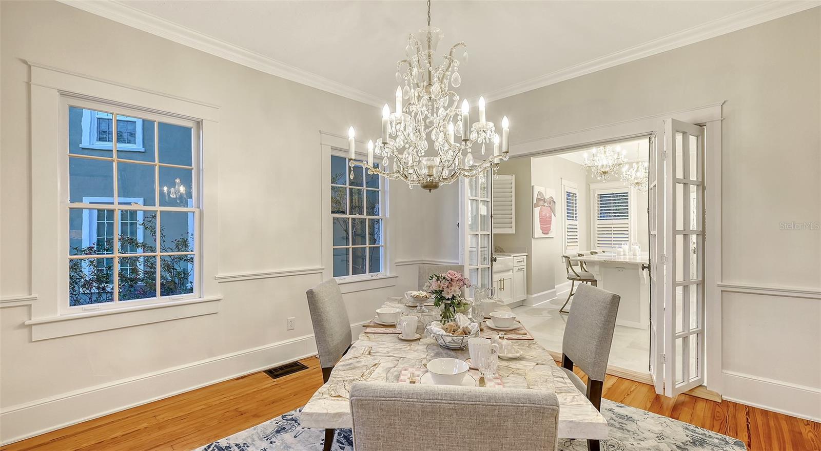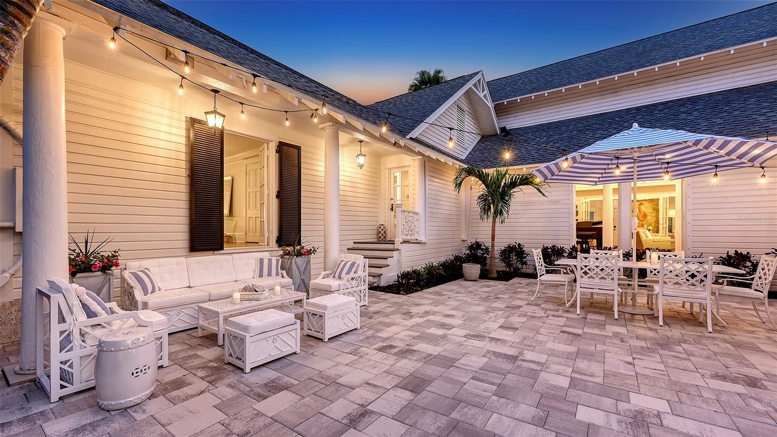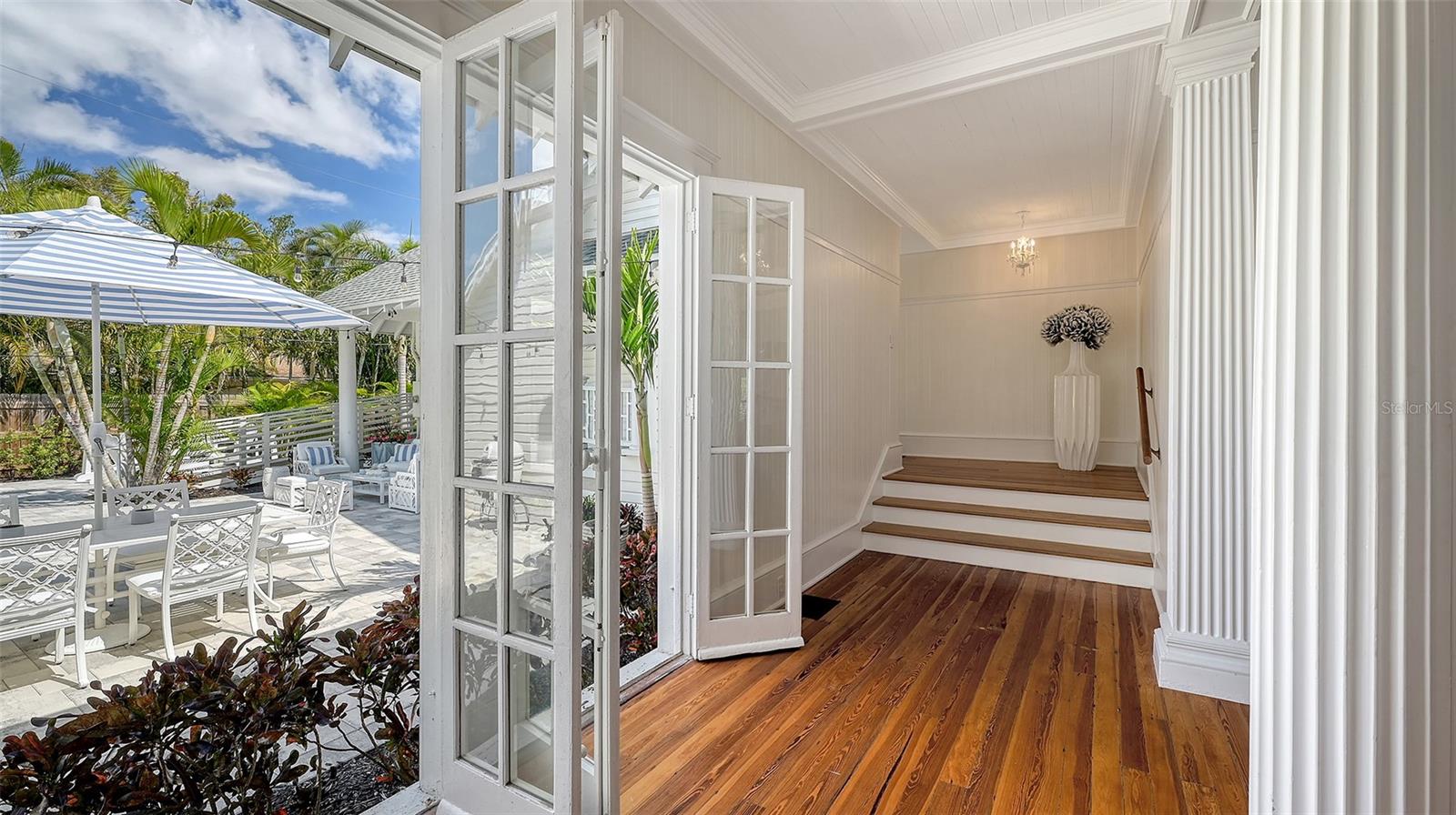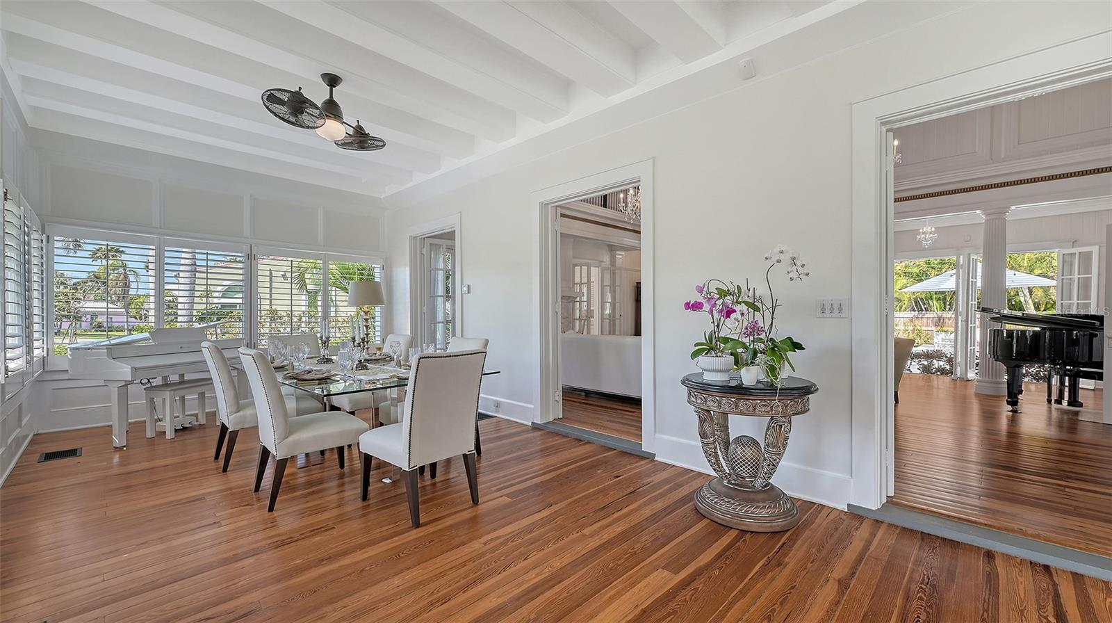 Step into history and timeless elegance at the House of Ringling, a landmark estate in Sarasota's coveted Whitfield Estates, built in 1918 for Alfred Ringling of the legendary Ringling Brothers. Spanning 4,782+/- sq. ft., this 5BR, 4.5BA masterpiece seamlessly marries Gilded Age opulence with modern luxury. A red brick walkway and expansive front lawn welcome you to this architectural treasure, where an oversized Grand Ballroom with a 21-foot ceiling, Venetian columns and a Renaissance-style coffered ceiling create an awe-inspiring focal point. Original pine floors, 12-inch baseboards and hand-poured antique glass in French windows and doors preserve the estate’s rich craftsmanship, as the reimagined chef’s kitchen is a showpiece, featuring Big Chill appliances, an 8-burner gas stove, Quartzite surfaces, a mother-of-pearl backsplash and backlit cabinets. The primary suite on the lower level offers floor-to-ceiling French doors opening to a private porch and the expansive pool deck. Upstairs, 2 ensuite bedrooms feature partial bay views. Hidden details, including a prohibition-era speakeasy/3rd bedroom at the top of the stairs and a secret room, add intrigue and charm. The home’s walls, crafted from Ringling railway car paneling, echo its storied past. Recent updates, including new plumbing, electrical, HVAC (5 units), and a new roof with extra tie-down straps, ensure modern comfort while preserving historic character. A detached 2-car garage and 2 driveways provide ample space, while the expansive Palm Beach-style courtyard invites relaxation. As one of the first Ringling Brothers homes in Sarasota, this estate offers a rare opportunity to own a living piece of history in a prime location near Sarasota Bay and downtown.