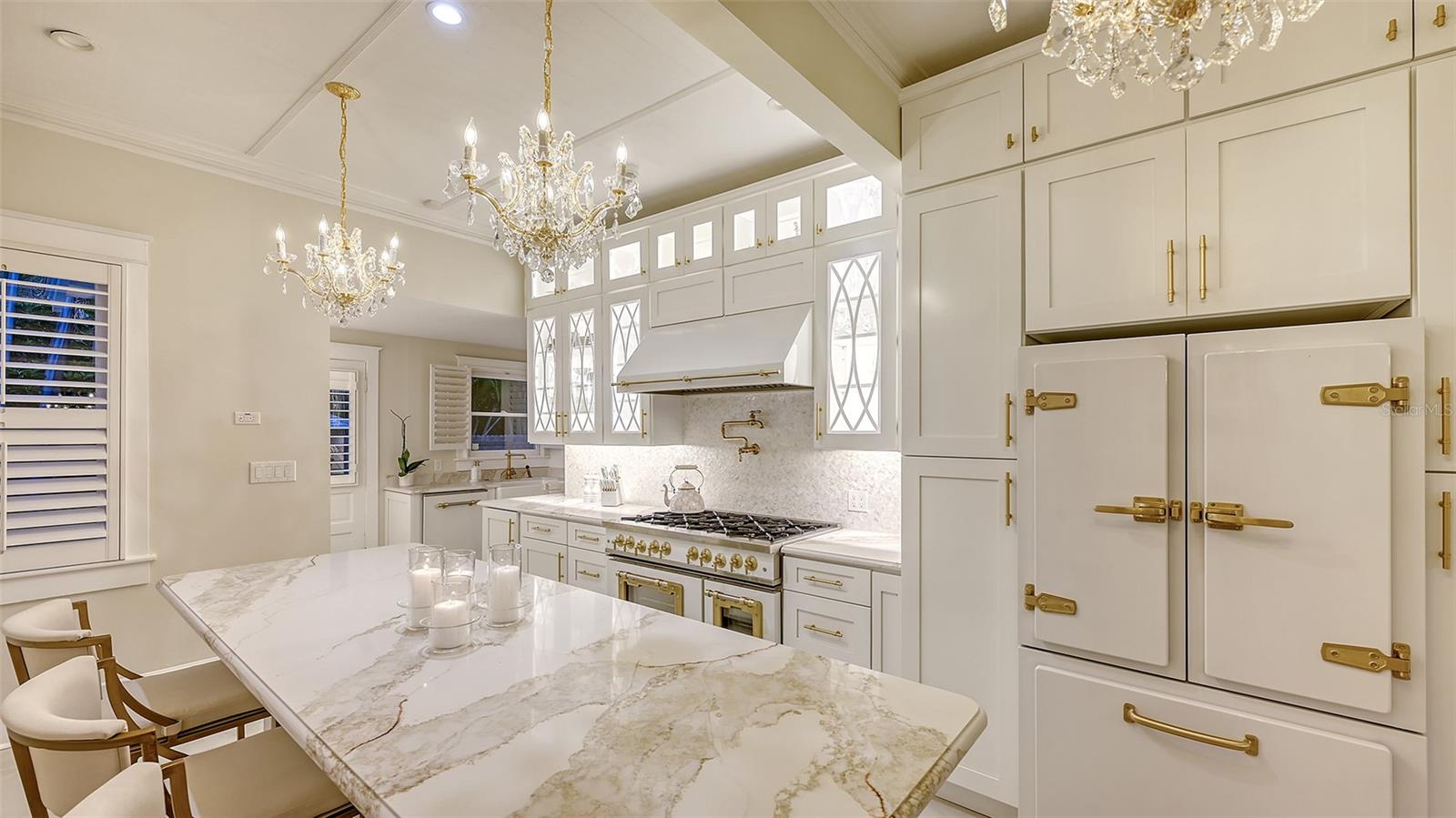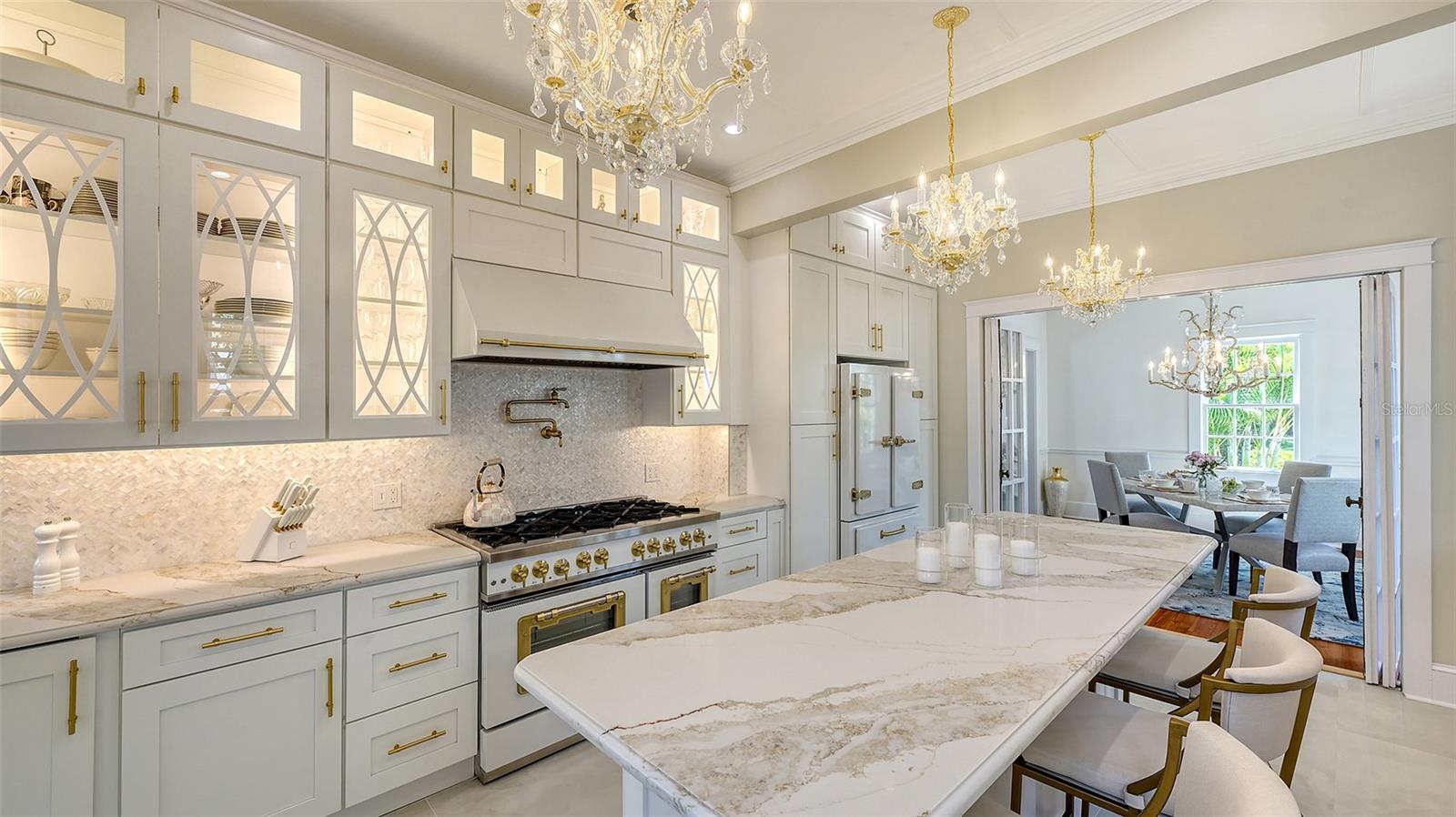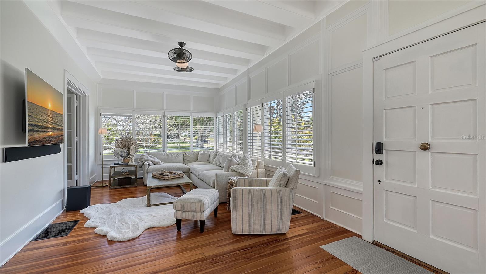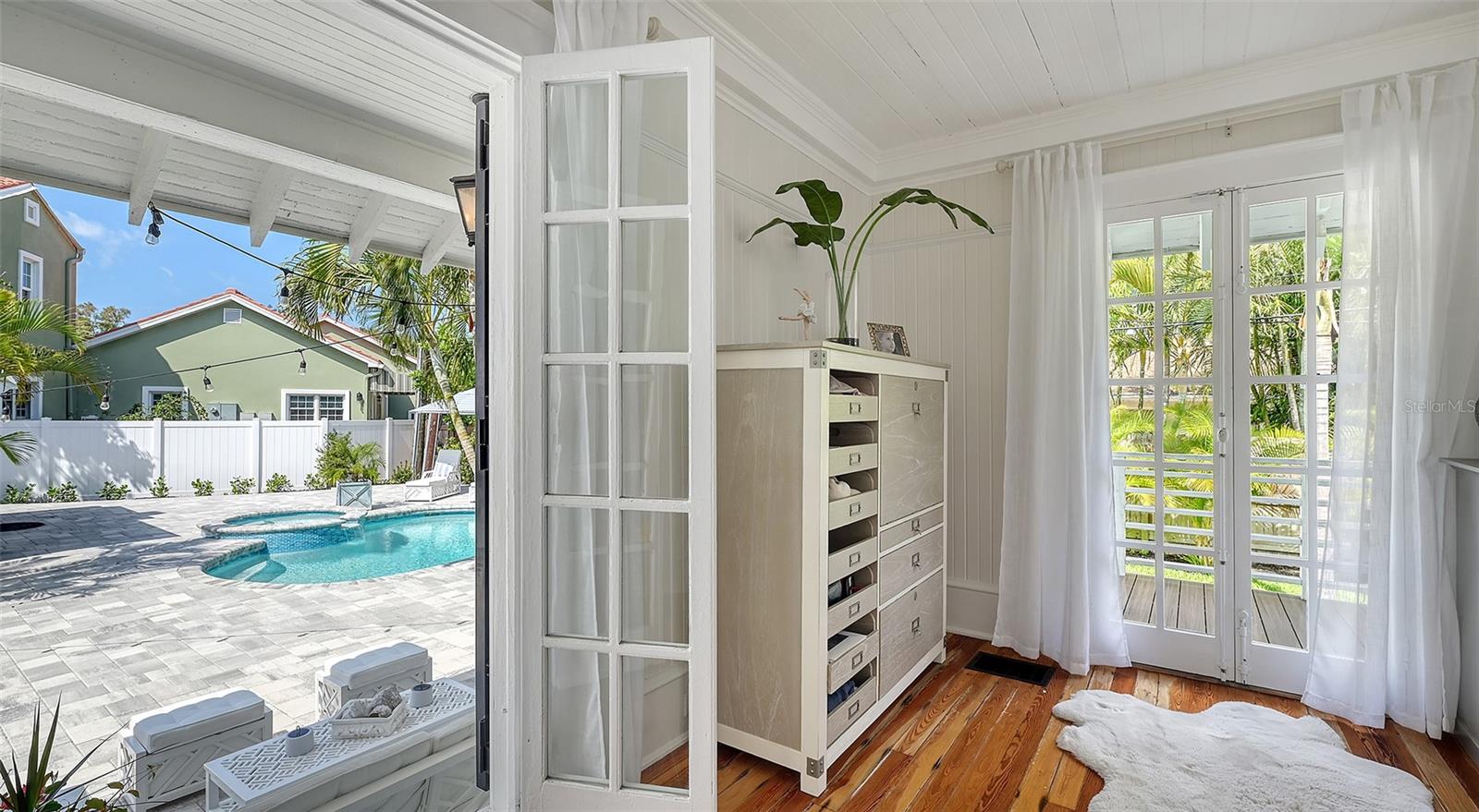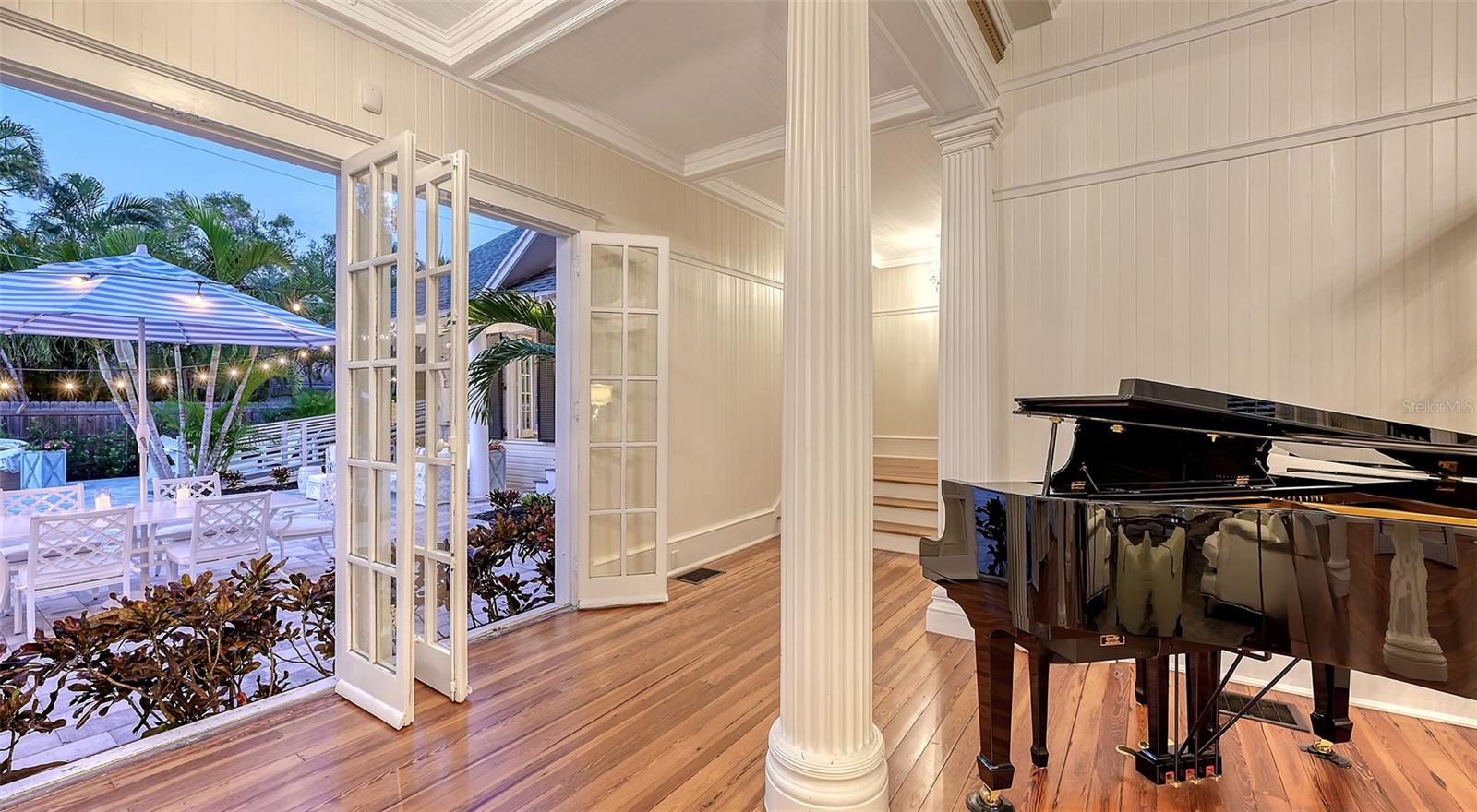 Step into history and timeless elegance at the House of Ringling, a landmark estate in Sarasota's coveted Whitfield Estates, built in 1918 for Alfred Ringling of the legendary Ringling Brothers. Spanning 4,782+/- sq. ft., this 5BR, 4.5BA masterpiece seamlessly marries Gilded Age opulence with modern luxury. A red brick walkway and expansive front lawn welcome you to this architectural treasure, where an oversized Grand Ballroom with a 21-foot ceiling, Venetian columns and a Renaissance-style coffered ceiling create an awe-inspiring focal point. Original pine floors, 12-inch baseboards and hand-poured antique glass in French windows and doors preserve the estate’s rich craftsmanship, as the reimagined chef’s kitchen is a showpiece, featuring Big Chill appliances, an 8-burner gas stove, Quartzite surfaces, a mother-of-pearl backsplash and backlit cabinets. The primary suite on the lower level offers floor-to-ceiling French doors opening to a private porch and the expansive pool deck. Upstairs, 2 ensuite bedrooms feature partial bay views. Hidden details, including a prohibition-era speakeasy/3rd bedroom at the top of the stairs and a secret room, add intrigue and charm. The home’s walls, crafted from Ringling railway car paneling, echo its storied past. Recent updates, including new plumbing, electrical, HVAC (5 units), and a new roof with extra tie-down straps, ensure modern comfort while preserving historic character. A detached 2-car garage and 2 driveways provide ample space, while the expansive Palm Beach-style courtyard invites relaxation. As one of the first Ringling Brothers homes in Sarasota, this estate offers a rare opportunity to own a living piece of history in a prime location near Sarasota Bay and downtown.