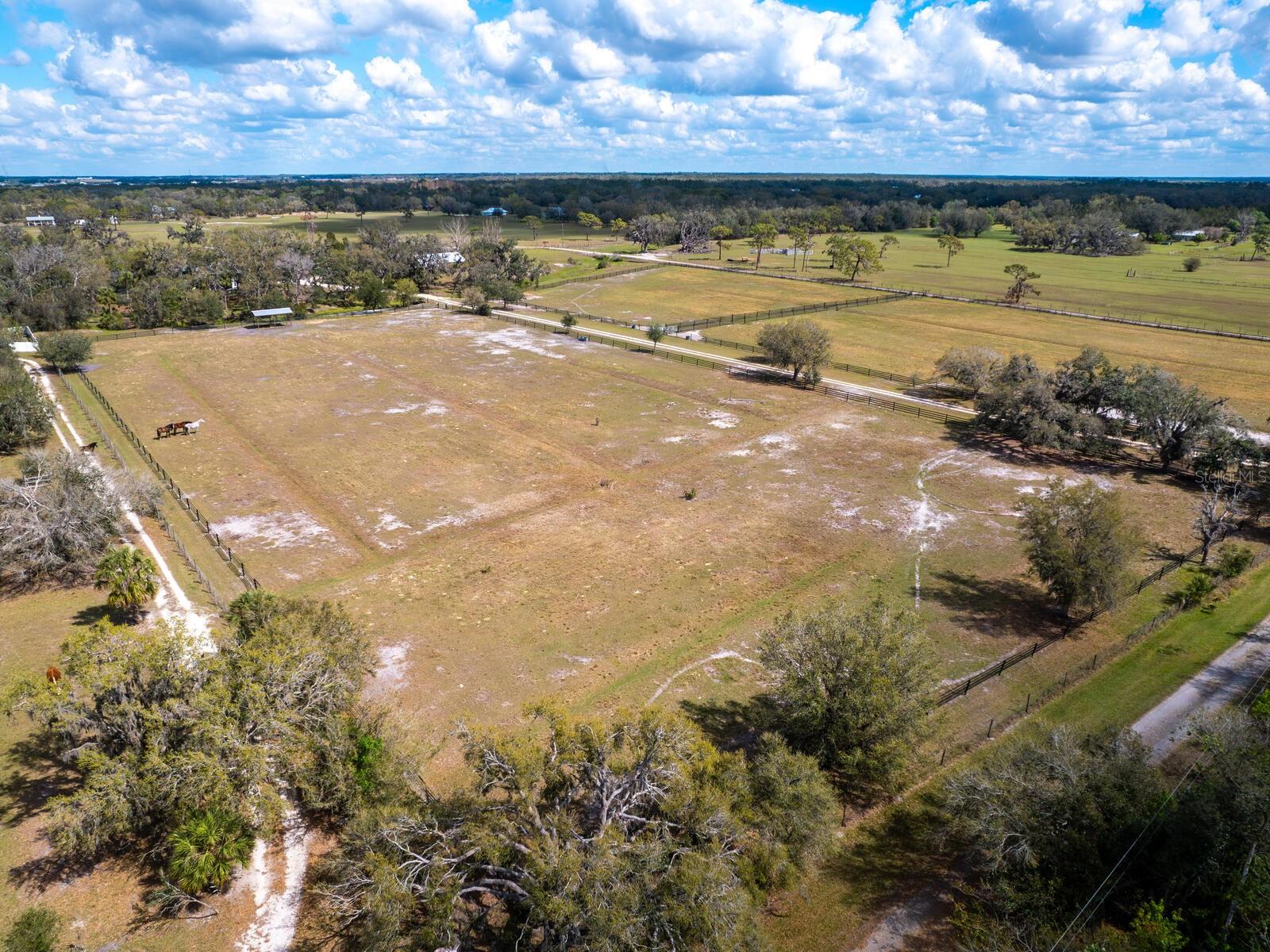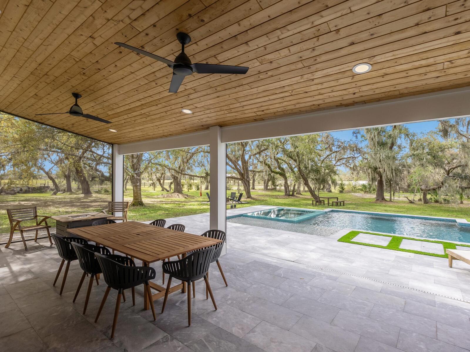 Minutes from the Fruitville Road corridor, take a short scenic drive down canopy roads and arrive at a once-in-a-lifetime farmhouse estate. This country home is among century-old oaks and sits on 18 breathtaking acres. The newly renovated three-bedroom, three-bath, three-car garage home, provides open-concept living with vaulted ceilings, hardwood floors throughout, a wood-burning fireplace featuring a whitewashed stone wall. The crisp and beautifully designed kitchen has a simple aesthetic and boasts newer Café appliances, a center island and composite stone counters and backsplash. Connected to the beautiful kitchen is a spacious walk-in pantry and around the corner, herringbone-laid brick floors enhance the laundry room and side entry door foyer. Cable rail lines the staircase to the second-floor loft, utilized as a home office, but flexible options could be a den, home gym or enclosed for a fourth bedroom. The primary suite is a retreat all on its own, spacious and inviting with two walls of windows overlooking wooded privacy, a generous walk-in dressing room and closet with custom built-ins and glass door cabinetry. The primary bath is a luxurious, inviting space with soaking tub, dual sinks, glass enclosed linen closet and separate shower with marbled porcelain tile. Outside, the best of a country lifestyle continues. In 2023, an inviting new pool and spa was built, surrounded by marble decking and sited next to the lanai with retractable screening. A covered, partially enclosed grill and smokehouse room, makes barbecuing easy come rain or shine. This home is a horse lovers dream. Ramm Flex Fencing around six acres and three pastures was installed 2021, and with a 30-year warranty, it’s practically maintenance free. Two pole barns, one just built in 2022, provide covered storage for equipment and gear, plus two oversized stalls could easily be converted into four stalls and the nearby RV hookup has water and electricity. At the end of a long day, whether you’ve been working the land or working in the office, you will love kicking back here. It’s hard not to fall in love with all this amazing home and land has to offer!