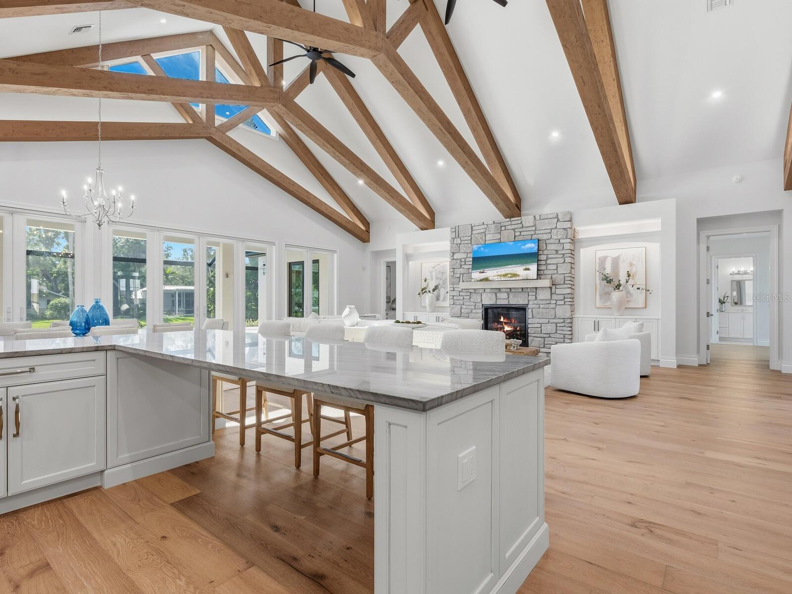 Construction and staging have been completed in this stunning new home by award-winning Trinity Custom Homes. Discover luxury and innovation in this remarkable four-bedroom-plus-den, 5.5-bath, West-of-the-Trail home. This custom-designed residence showcases superior craftsmanship, offering a sophisticated blend of modern design and top-tier functionality. Every detail has been meticulously planned, from the gourmet kitchen, which features Thermador appliances, a 42-inch refrigerator, a five-burner gas cooktop, double ovens, and abundant pantry storage, to the great room plan with a soaring, vaulted ceiling, wood trusses with LED uplighting and fireplace, ideal for fabulous entertaining and everyday living. The dining area features an entertainment center that includes a U-Line wine cooler and ice maker, as well as an Elkay water bottle filler and chiller. No detail was overlooked, from the Level 5 drywall finishes on walls and ceilings to the custom cabinetry in the great room, office, and bedroom closets. The outdoor space offers a resort-style retreat overlooking a serene, spring-fed lake, featuring a PebbleTec surfaced pool and spa, a lanai cage with a Clearview enclosure, and a motorized sunshade screen. The outdoor kitchen, complete with a gas grill, elevates the alfresco dining experience. Advanced technology includes a whole-house alarm system with seven-camera surveillance, a Sonos multiple-zone audio system, and motorized shades. Dual Navien tankless water heaters, equipped with a circulation loop and open-cell foam insulation, ensure optimal energy efficiency. Two Trane variable-speed HVAC systems provide zoned climate control for enhanced comfort. Built for resilience and convenience, the home includes Anderson windows and doors, a 26-kilowatt Kohler generator, and a 1,000-gallon propane tank to support the entire house. The 400-amp electrical system, featuring two 200-amp panels, ensures reliable performance. Additional upgrades include custom-built-ins, wireless internet access points, and energy-efficient features such as advanced insulation and zoned HVAC. The split three-plus-car garages and a circular paver driveway provide ample space for vehicles and storage. Ideally located in the private community of Kentwood Estates, this home offers privacy and tranquility while being minutes from Siesta Key’s renowned beaches and downtown Sarasota’s vibrant entertainment, cultural attractions, shopping, and fine dining. This exceptional property presents a rare opportunity to experience unparalleled luxury and thoughtful design in one of Sarasota’s sought-after neighborhoods. Schedule your private showing today to envision your future in this extraordinary residence.