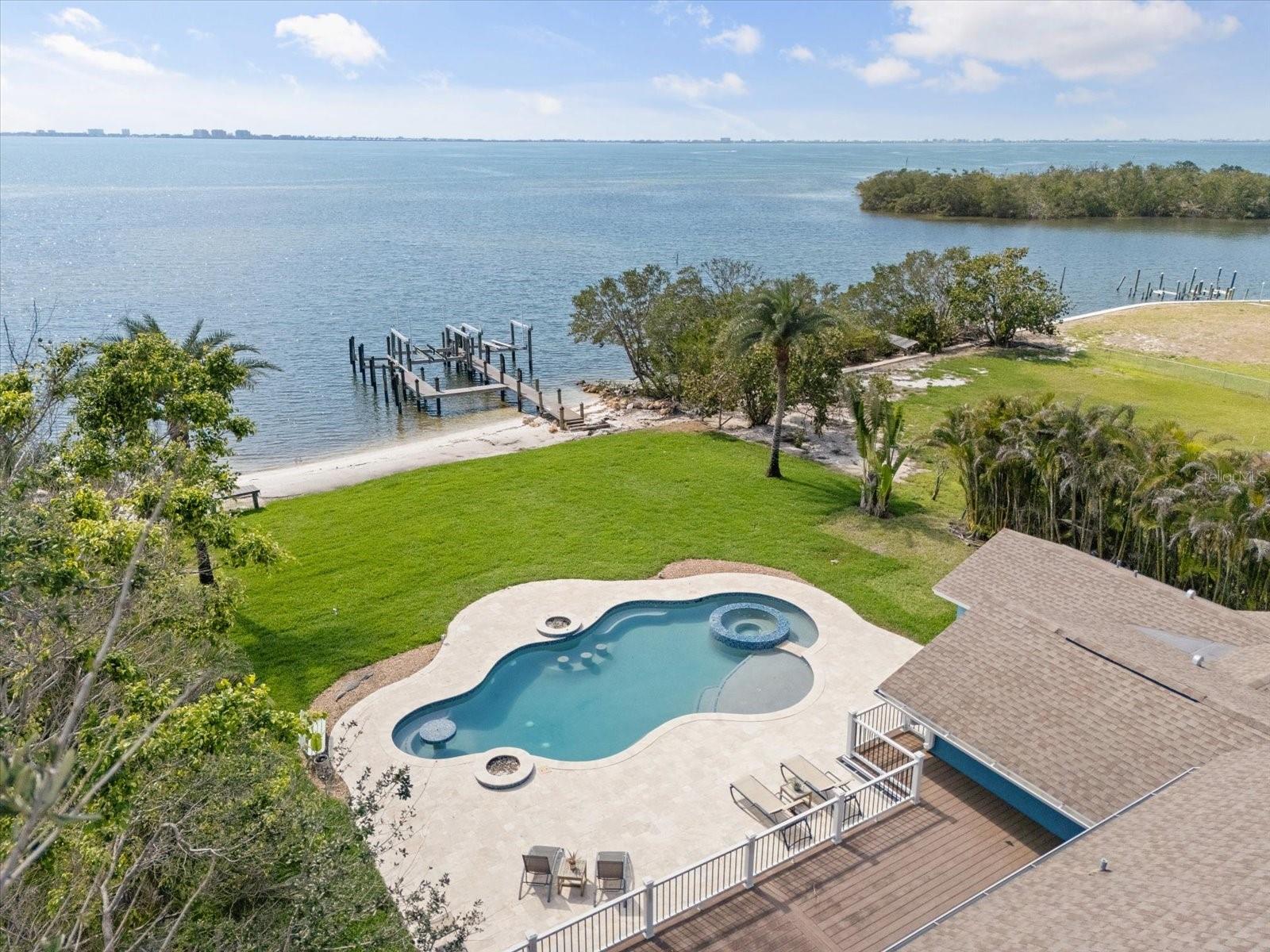 Discover Your Sarasota Waterfront Paradise! Imagine waking up to the gentle sounds of Sarasota Bay, where your private beach meets 100 feet of pristine shoreline. This enchanting 5-bedroom, 4-full, and 2-half-bath residence masterfully combines timeless charm with modern comforts, creating the ultimate waterfront haven. For those who cherish life on the water, this property is unparalleled. Nestled on nearly an acre, it boasts an expansive dock equipped with two boat lifts (24,000 lbs and 14,000 lbs capacities), ensuring your vessels are always ready for sun-soaked adventures on Sarasota Bay and beyond. Step inside to be greeted by vaulted Cypress ceilings and panoramic windows that bathe the home in natural light, offering uninterrupted bay vistas. The first-floor primary suite is a serene retreat, allowing you to awaken to mesmerizing water views. It features a spacious walk-in closet and a luxurious bath with an infinity soaking tub. An additional guest suite and full bath on the main level ensure comfort and privacy for visitors. Whether hosting intimate dinners or lively celebrations, the home’s thoughtfully designed layout caters to every occasion. Enjoy meals in the formal dining area, relax in the cozy family room, or prepare culinary delights in the well-appointed kitchen with a breakfast bar. The separate living room offers sweeping Sarasota Bay views, perfect for unwinding as boats drift by. The expansive travertine pool deck invites you to indulge in Florida’s perpetual sunshine. An open-air pool and spa set the stage for memorable day-to-night entertainment. Upstairs, three additional bedrooms, a loft area, two full baths, and a half bath provide generous space for family and guests, ensuring everyone has their own private sanctuary. Located in the Whitfield Estates neighborhood, residents have the unique opportunity to enjoy dining at the nearby Sara Bay Country Club. For an optional annual HOA fee of just $35, you can enjoy a culinary membership that grants full access to the clubhouse for dining and social events (golf privileges not included). Combining classic Florida allure with contemporary updates, this property invites you to experience the relaxed waterfront lifestyle that defines Sarasota. Don’t miss the chance to make this exceptional residence your own.