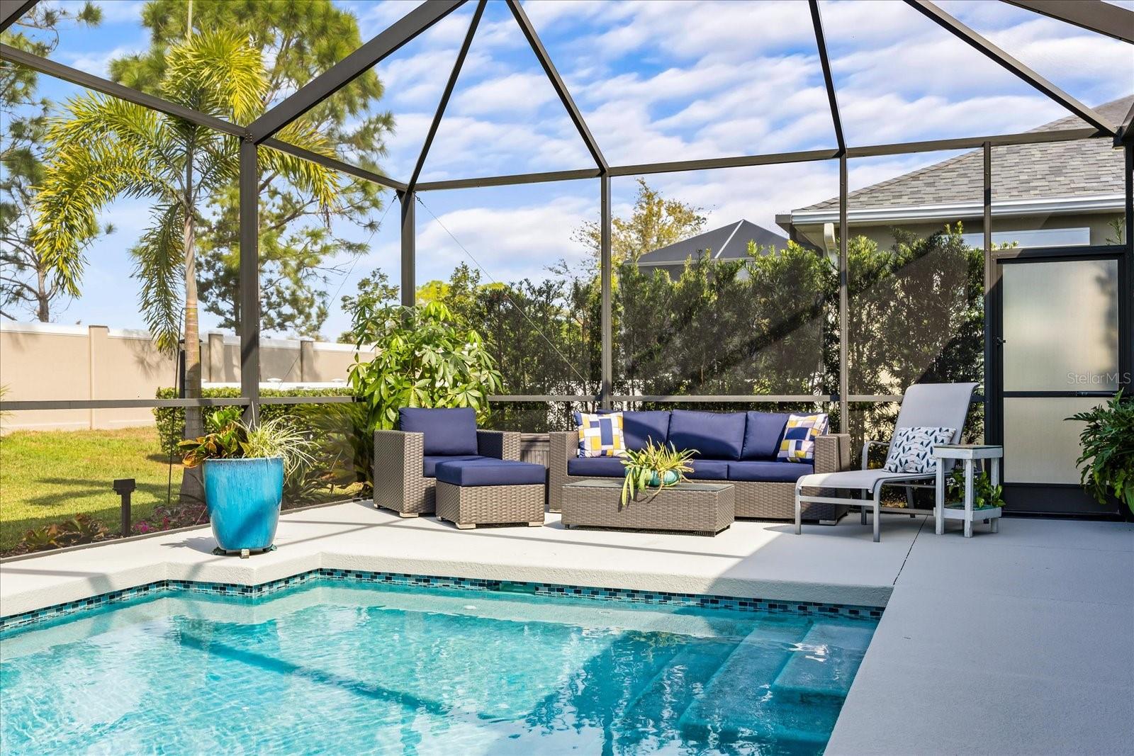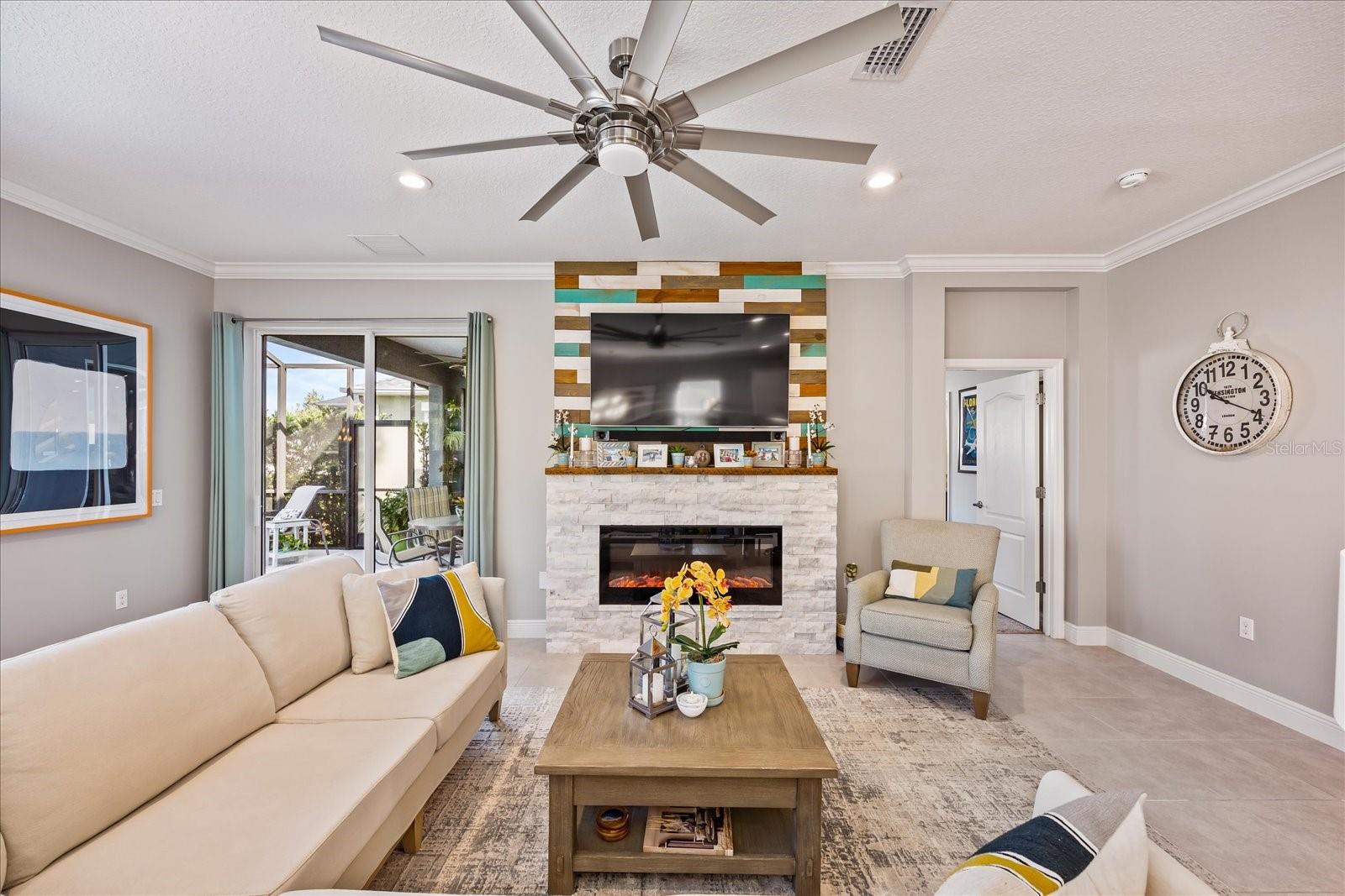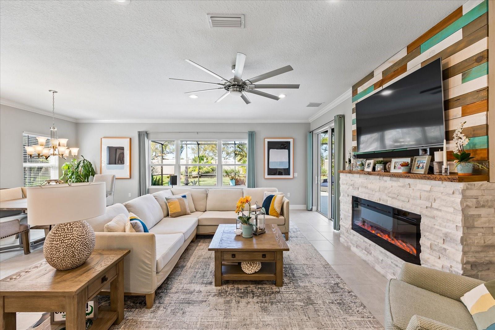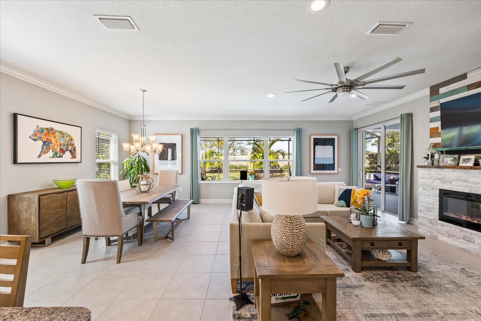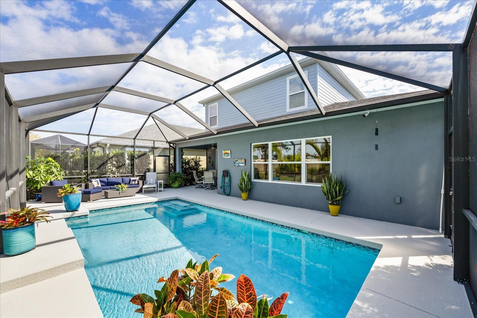This stunning 2017 Tribute Model by Neal Communities offers an opportunity to own a home that is beautifully designed and immaculately kept. The open floor plan welcomes you as soon as you walk through the door, offering a versatile layout perfect for entertaining or simply relaxing by the electric fireplace with family and loved ones. The well-appointed kitchen is a chef’s dream, featuring a spacious island, ample countertop space, abundant cabinetry, and a built-in butler’s pantry/bar. The primary suite is located on the ground floor. Efficiency is a key highlight of this home, equipped with a tankless water heater, natural gas, central vacuum, UV light HVAC system, gas pool heater (2021), pool pump (2023), and a freshly painted pool deck (2025), insulated concrete block, hurricane shutters, not in a flood zone, high and dry during the hurricane(s) in 2024, extra deep garage (large enough for a full size pick up. truck), landscape lighting. The high ceilings and elegant crown molding add to the upscale feel, complemented by neutral tones and abundant natural light that create a warm and inviting atmosphere. Step outside to a private pool area, where the perfectly sized saltwater pool and efficient heating system make for a refreshing morning swim or a relaxing evening dip. The gated community offers added security and a sense of exclusivity. This home truly embodies luxury, efficiency, and comfort—schedule a showing today to see it for yourself!