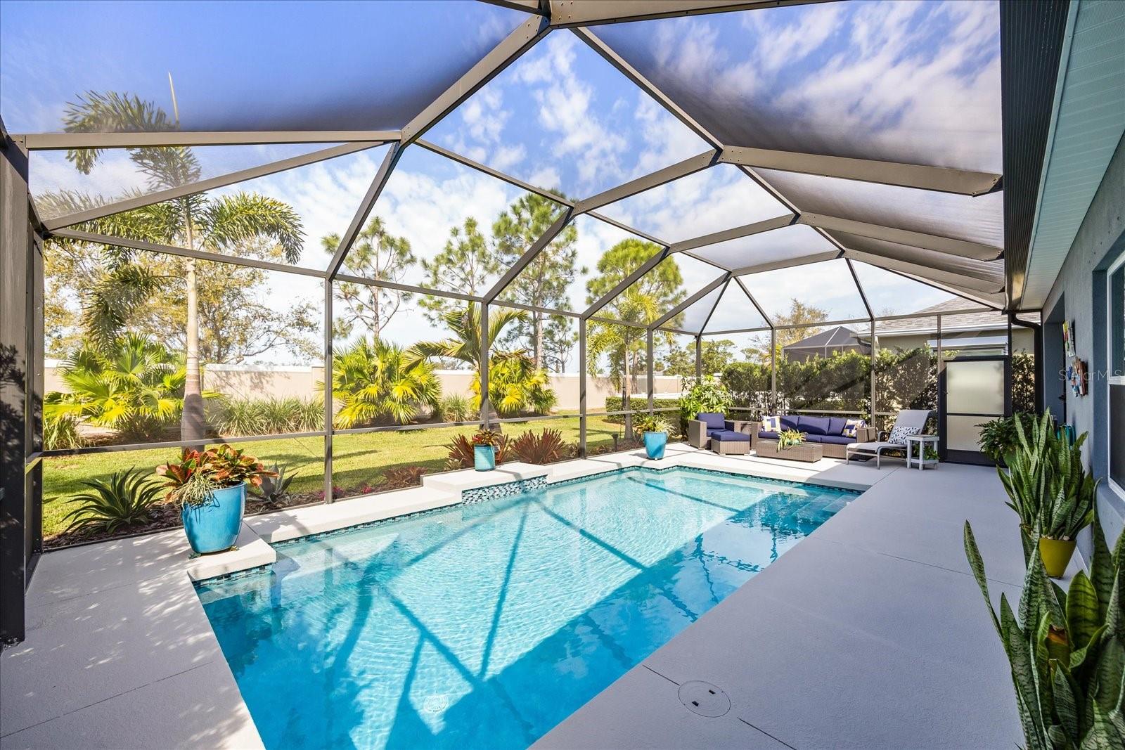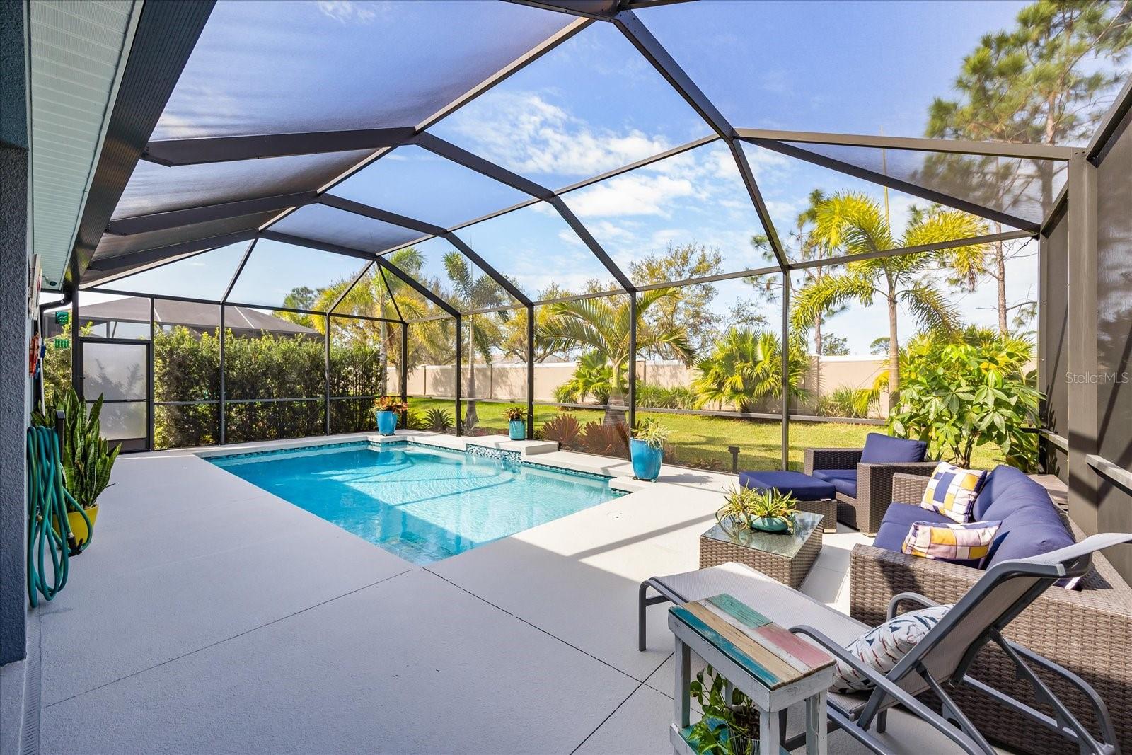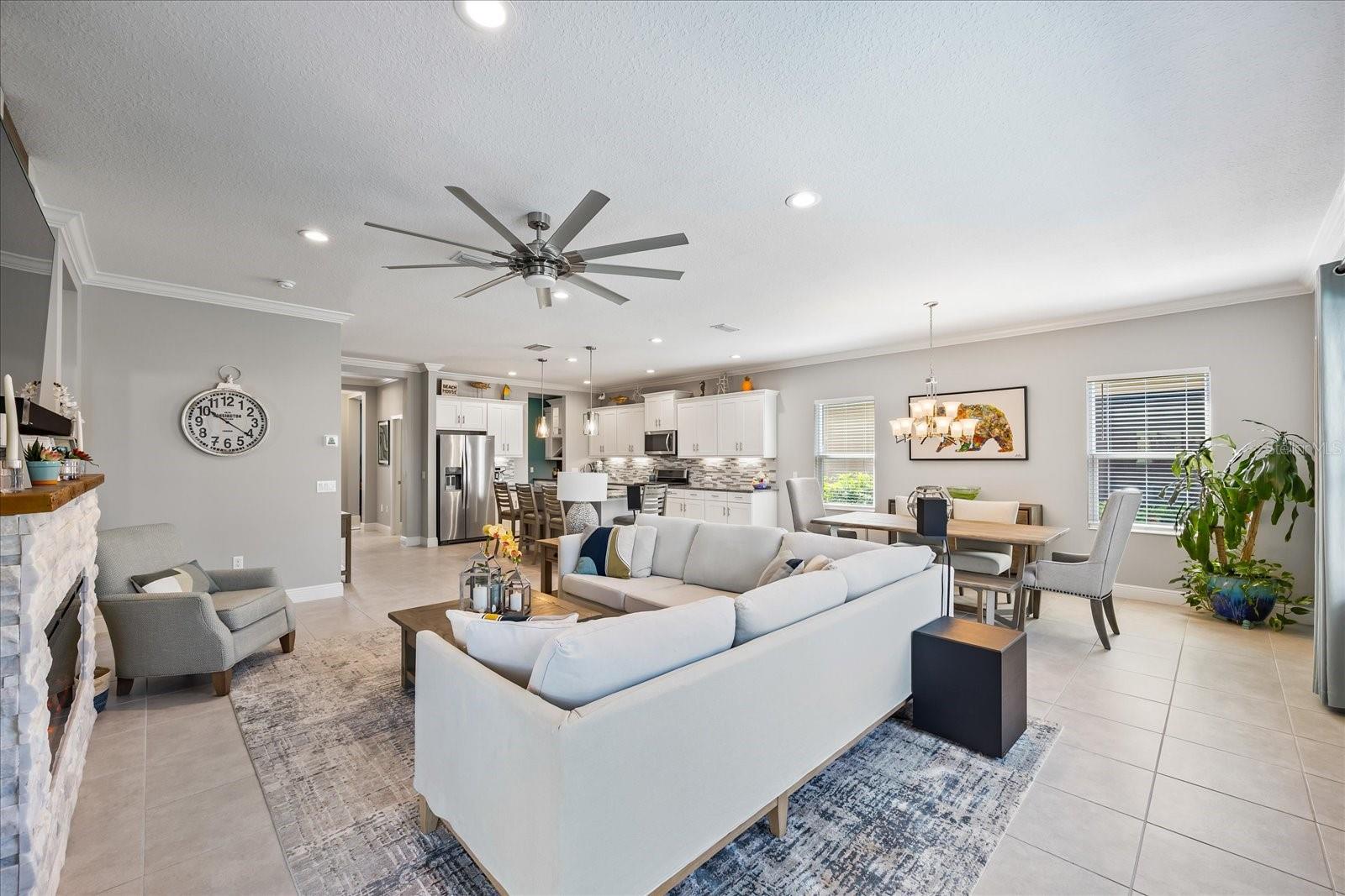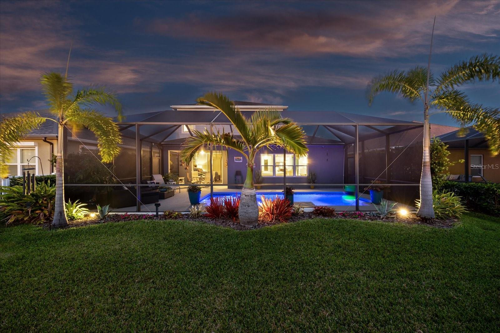 This stunning 2017 Tribute Model by Neal Communities offers an opportunity to own a home that is beautifully designed and immaculately kept. The open floor plan welcomes you as soon as you walk through the door, offering a versatile layout perfect for entertaining or simply relaxing by the electric fireplace with family and loved ones. The well-appointed kitchen is a chef’s dream, featuring a spacious island, ample countertop space, abundant cabinetry, and a built-in butler’s pantry/bar. The primary suite is located on the ground floor. Efficiency is a key highlight of this home, equipped with a tankless water heater, natural gas, central vacuum, UV light HVAC system, gas pool heater (2021), pool pump (2023), and a freshly painted pool deck (2025), insulated concrete block, hurricane shutters, not in a flood zone, high and dry during the hurricane(s) in 2024, extra deep garage (large enough for a full size pick up. truck), landscape lighting. The high ceilings and elegant crown molding add to the upscale feel, complemented by neutral tones and abundant natural light that create a warm and inviting atmosphere. Step outside to a private pool area, where the perfectly sized saltwater pool and efficient heating system make for a refreshing morning swim or a relaxing evening dip. The gated community offers added security and a sense of exclusivity. This home truly embodies luxury, efficiency, and comfort—schedule a showing today to see it for yourself!