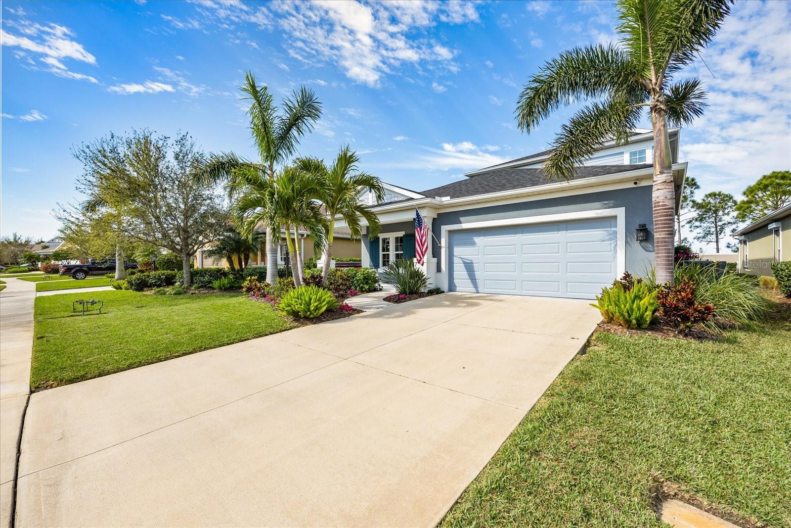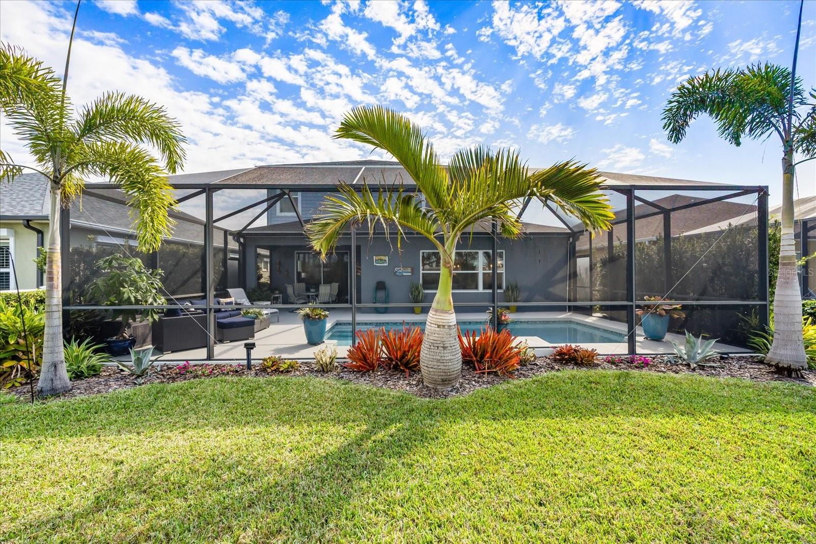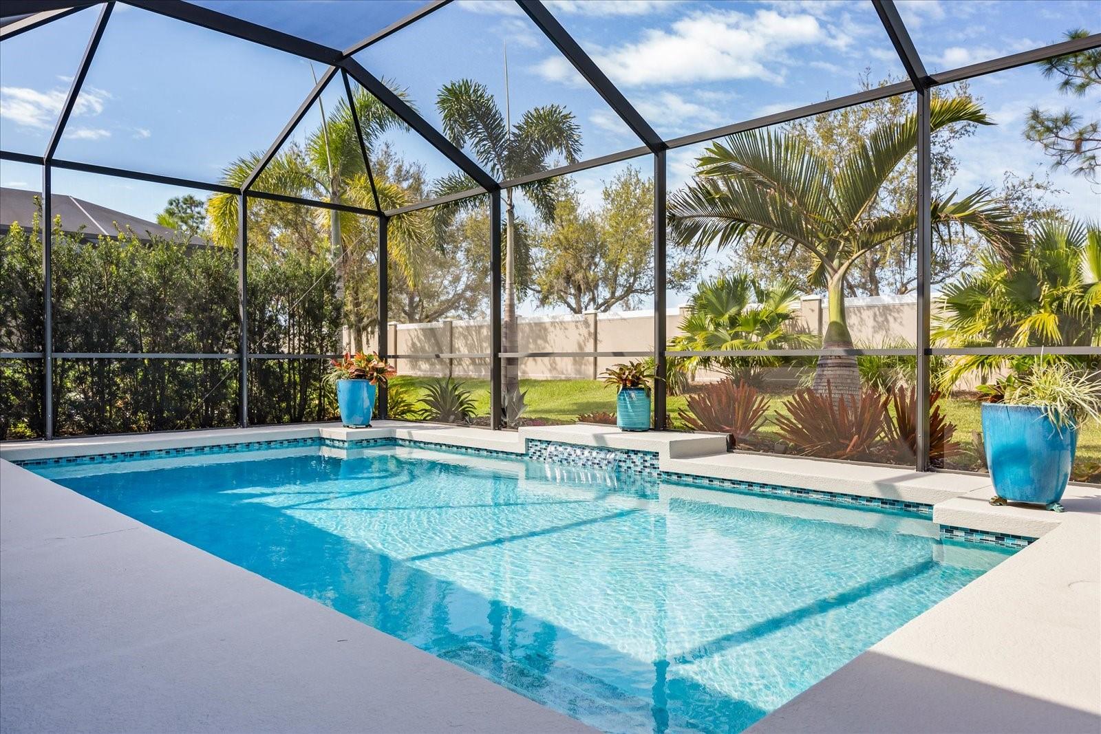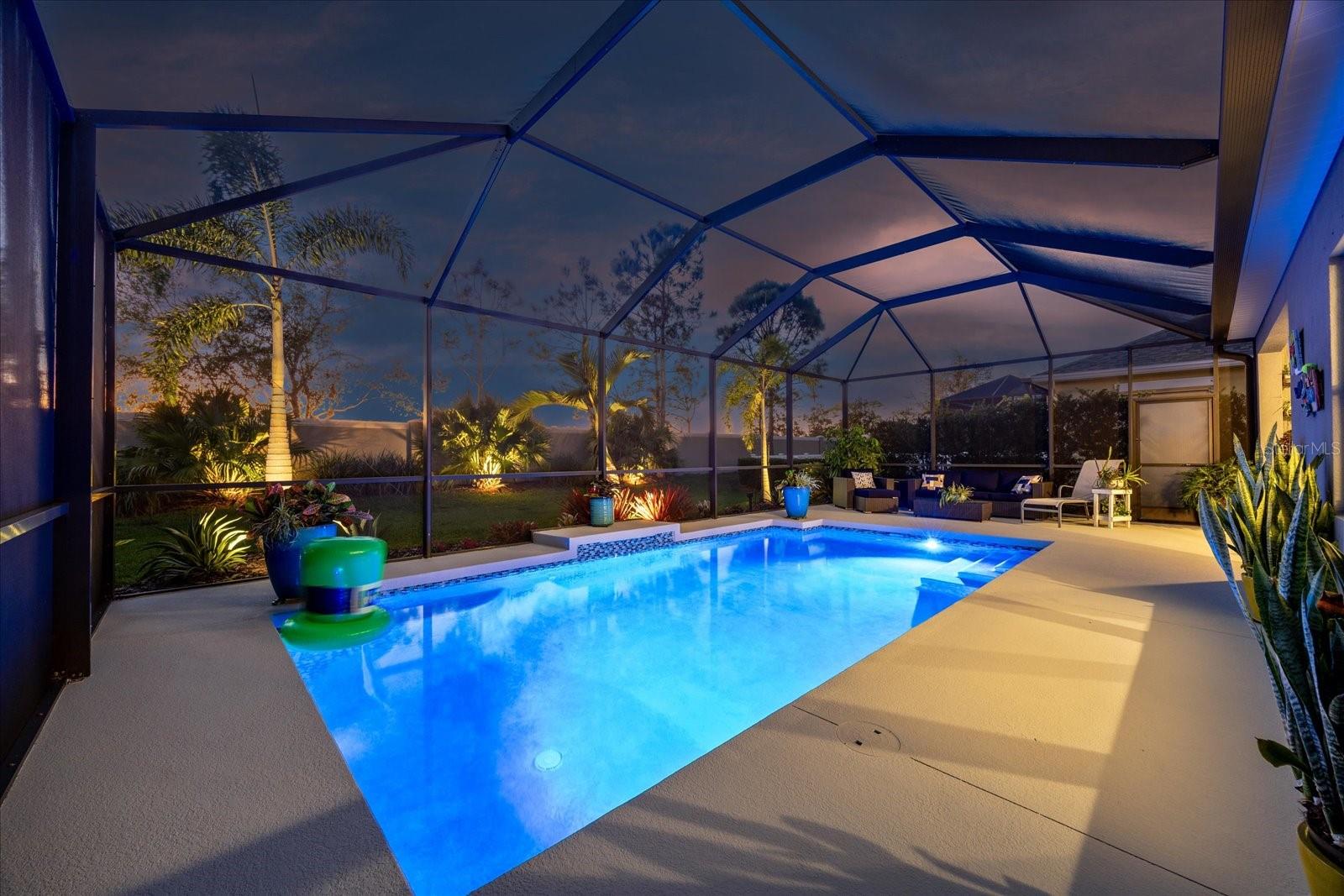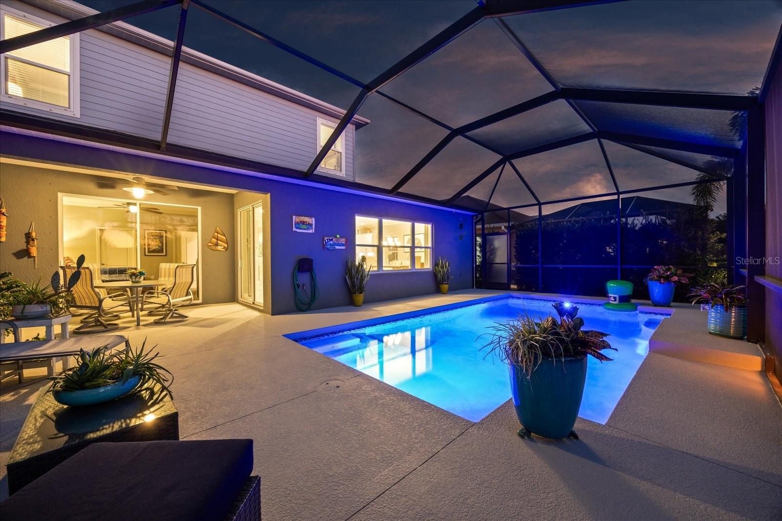 This stunning 2017 Tribute Model by Neal Communities offers an opportunity to own a home that is beautifully designed and immaculately kept. The open floor plan welcomes you as soon as you walk through the door, offering a versatile layout perfect for entertaining or simply relaxing by the electric fireplace with family and loved ones. The well-appointed kitchen is a chef’s dream, featuring a spacious island, ample countertop space, abundant cabinetry, and a built-in butler’s pantry/bar. The primary suite is located on the ground floor. Efficiency is a key highlight of this home, equipped with a tankless water heater, natural gas, central vacuum, UV light HVAC system, gas pool heater (2021), pool pump (2023), and a freshly painted pool deck (2025), insulated concrete block, hurricane shutters, not in a flood zone, high and dry during the hurricane(s) in 2024, extra deep garage (large enough for a full size pick up. truck), landscape lighting. The high ceilings and elegant crown molding add to the upscale feel, complemented by neutral tones and abundant natural light that create a warm and inviting atmosphere. Step outside to a private pool area, where the perfectly sized saltwater pool and efficient heating system make for a refreshing morning swim or a relaxing evening dip. The gated community offers added security and a sense of exclusivity. This home truly embodies luxury, efficiency, and comfort—schedule a showing today to see it for yourself!