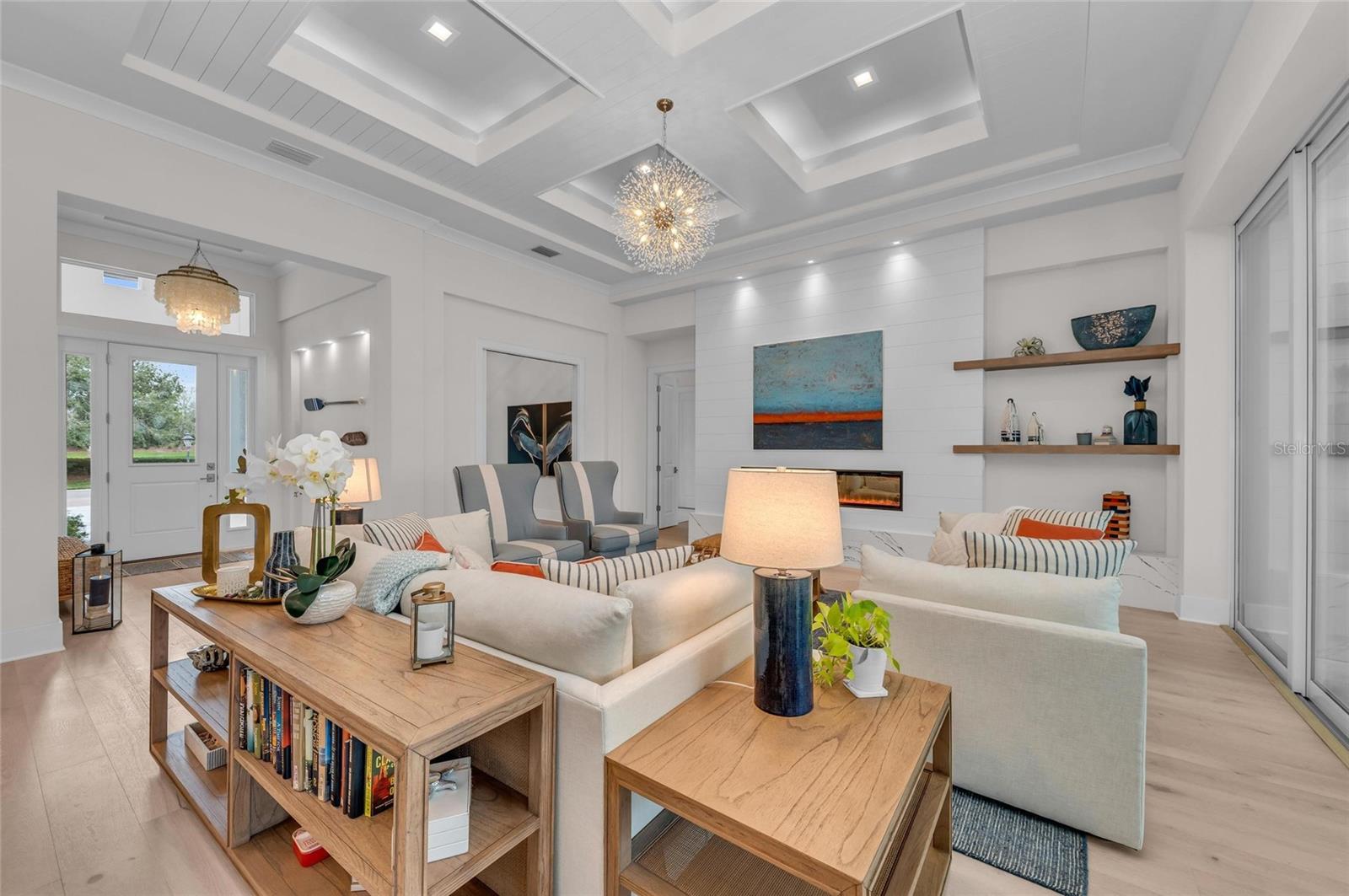 Come home to this magnificent custom coastal contemporary Lee Wetherington residence with sweeping golf course views. Tucked behind the gates of the Founders Club, a stunning neighborhood of only 262 homes nestled amidst nature and one of the region's best golf courses. Built on a premium golf-view site with easy access to the clubhouse, this home offers an idyllic setting and lifestyle. A quiet, tree-lined street leads to a picturesque home that must be experienced to be fully appreciated. Set against the serene backdrop of a rolling fairway studded with ancient oaks and across from a protected preserve, this home provides privacy and tranquility. Inside, glorious soft natural sunlight, a cheerful ambiance, and lovely views are experienced throughout. Tall ceilings are emphasized with beautiful trim detail, and the grand great room flows effortlessly through the 10’ sliding glass doors to the stunning outdoor living. With over 4,000 square feet of air-conditioned space, you’ll have plenty of room for gathering and privacy. In addition to the 4 bedrooms, you'll find a study, a bonus room, and a loft. The outdoor oasis offers more incredible space with a saltwater heated pool and spa, outdoor kitchen, and panoramic screen. The designer kitchen features quality wood cabinetry with soft close doors, a hidden pantry, Thermador appliances including a natural gas range, furniture-wrapped column refrigerator and freezer, double ovens, a tall wine cooler, and gleaming Cambria quartz countertops. Beautiful designer touches include European white oak floors in main living areas and primary bedroom, a lovely Dimplex 72” linear fireplace built in, classic trim and millwork details, elegant lighting, plantation shutters, remote blinds, and Sonos sound system. The well-appointed owner’s retreat features a spa-inspired bath with floating tub, frameless shower, built-in coffee bar, and double walk-in closets. This green-energy-certified home is quality built and offers peace of mind from the storms. Impact windows and doors. Landscape lighting and lush professional landscaping enhance the home in the day and evening. Optional social and golf memberships. Clubhouse offers gourmet restaurant with fine and casual dining, 24-hour fitness center, social activities, and holiday events. An on-site fitness center offers Pilates and yoga classes, and Har Tru tennis courts are available for residents. Founders Club is 9 miles from downtown Sarasota with easy access to cultural venues and world-class beaches. Enjoy the best of Sarasota living with convenience to various grocers, medical facilities, farmers markets, shops, polo fields, and many restaurants. This immaculate home is ideal for those who desire new construction without the wait!