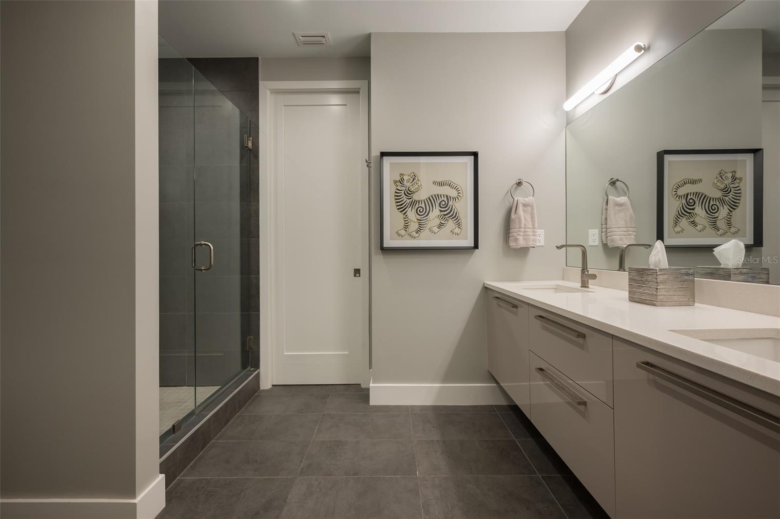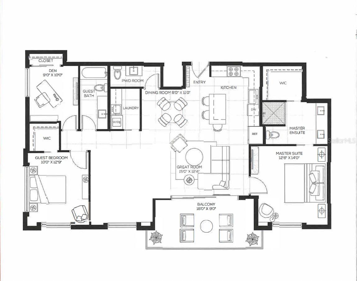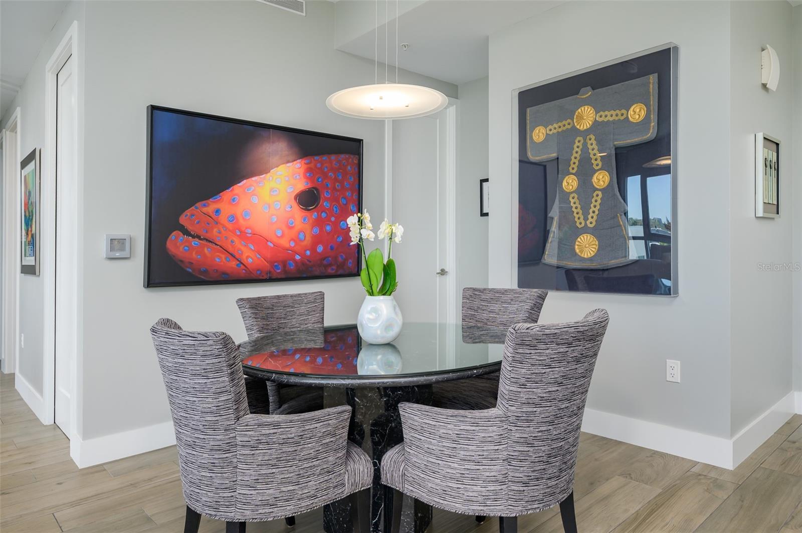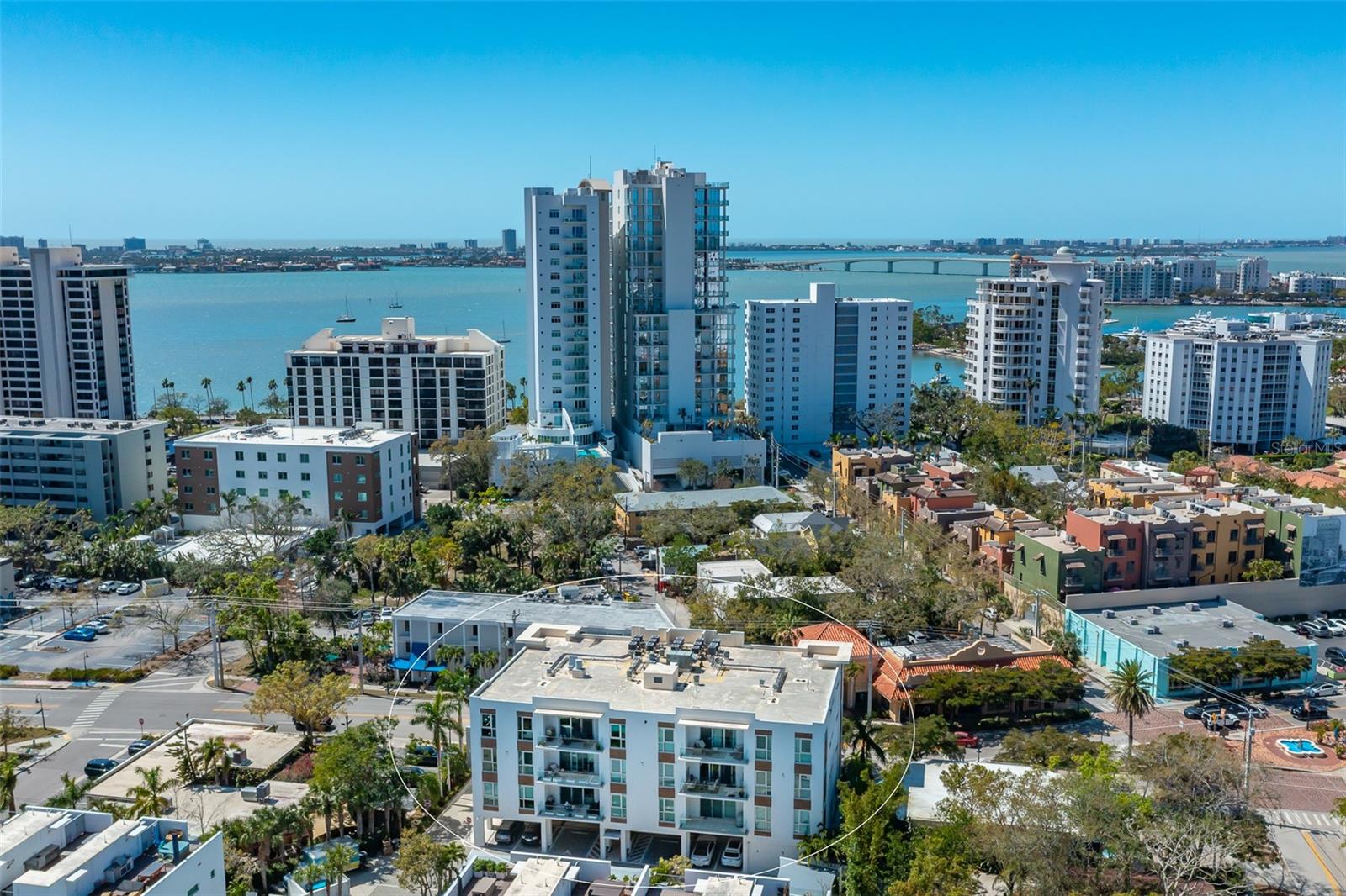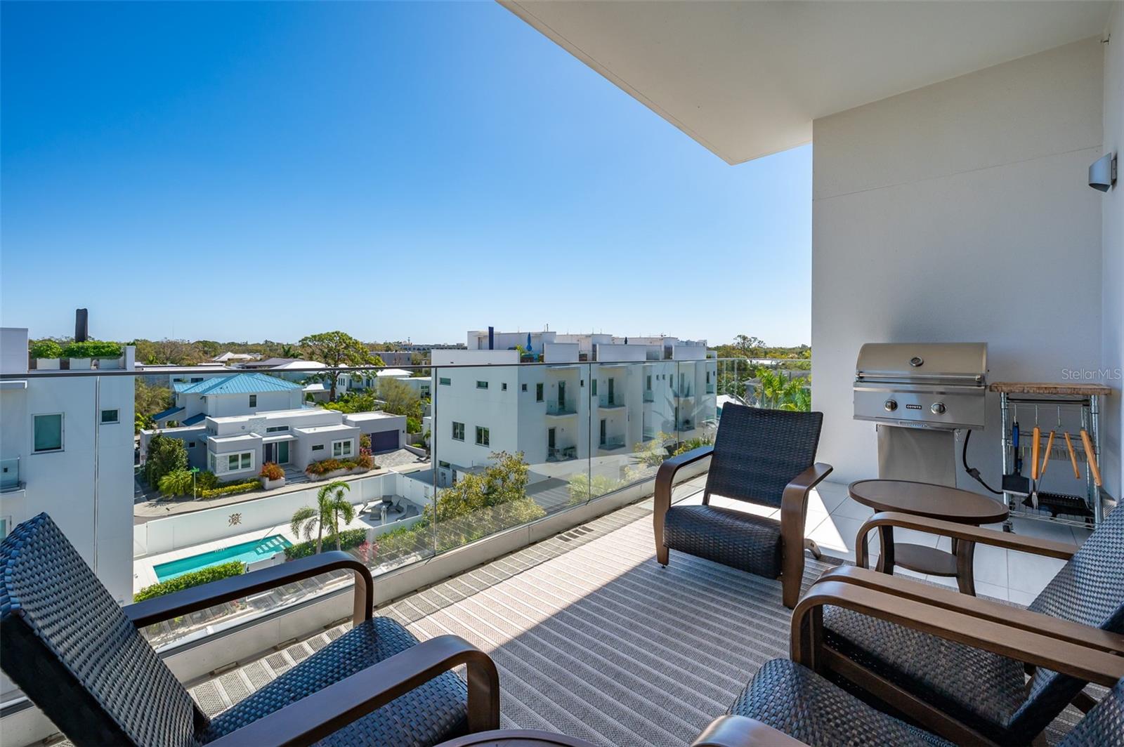 This desirable top-floor residence in the exclusive Orange Club community seamlessly blends modern design with everyday comfort. In a prime downtown location within a boutique building of only 15 residences, this sought-after Sunrise floor plan offers over 1,500 square feet of open and airy living space. The main living areas feature elegant wood-look porcelain tile flooring, complementing the home’s contemporary aesthetic. An open-concept layout enhances the flow of natural light, with floor-to-ceiling sliders leading to an expansive private balcony. Designed for relaxation and entertaining, the balcony includes an overhead fan, a natural gas grill with ample room for outdoor dining and lounging. The chef-inspired kitchen is stylish and functional, featuring a natural gas cooktop, premium dark wood-grain cabinetry, stainless steel appliances, and a large island that provides additional workspace and seating. The adjacent dining area is open and spacious, seamlessly integrating with the kitchen and living area for effortless entertaining. The primary suite spans the width of the residence, offering a tranquil retreat with abundant natural light, a spa-inspired en-suite bath and a generous walk-in closet. The primary bath is thoughtfully designed with a glass-enclosed walk-in shower, an extra-long floating double vanity and built-in storage, all complemented by large-format porcelain tiles. One of the additional bedrooms serves as a dedicated study with a closet, making it easily adaptable as a guest space or private media den. Positioned for privacy, the additional bedrooms are on the opposite side of the home, separated from the primary suite by the main living areas. High-end features throughout include shades, premium fixtures and wood-look porcelain tile flooring in the main living spaces. This residence also includes a deeded, assigned covered parking space, climate-controlled ground-level storage, and access to ample guest parking. Residents of Orange Club enjoy a heated pool and patio area, ideal for year-round relaxation. Furniture is available for purchase under a separate bill of sale. In the heart of Sarasota, near the historic Burns Court neighborhood, this exceptional residence offers the blend of urban convenience, privacy and tranquility, all within steps of downtown Sarasota and Sarasota Bay.
